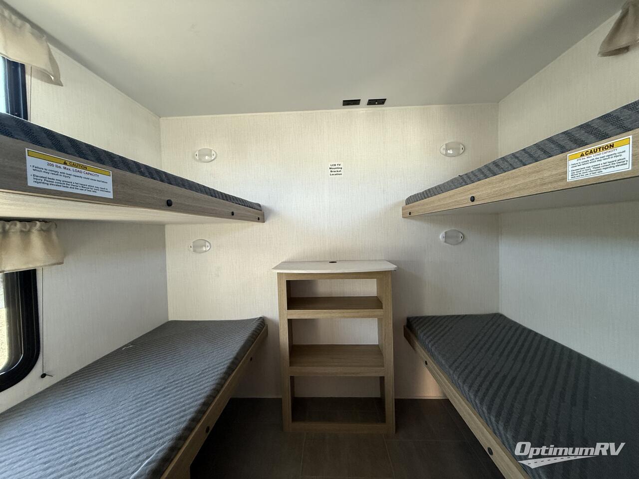 The littles ones will love camping in this travel trailer since there is a rear private bunkhouse with four bunks, a wardrobe, plus shelves to keep their things tidy. A full kitchen, complete with a cooktop, microwave, and 12V refrigerator will let you cook and store food, and a booth dinette provides a place to dine together. There is also a sofa where you can relax in the evenings if you're not outdoors under the 17' power awning. And when it's time to call it a night, you can head to the front private bedroom for a great night's rest on the queen bed!