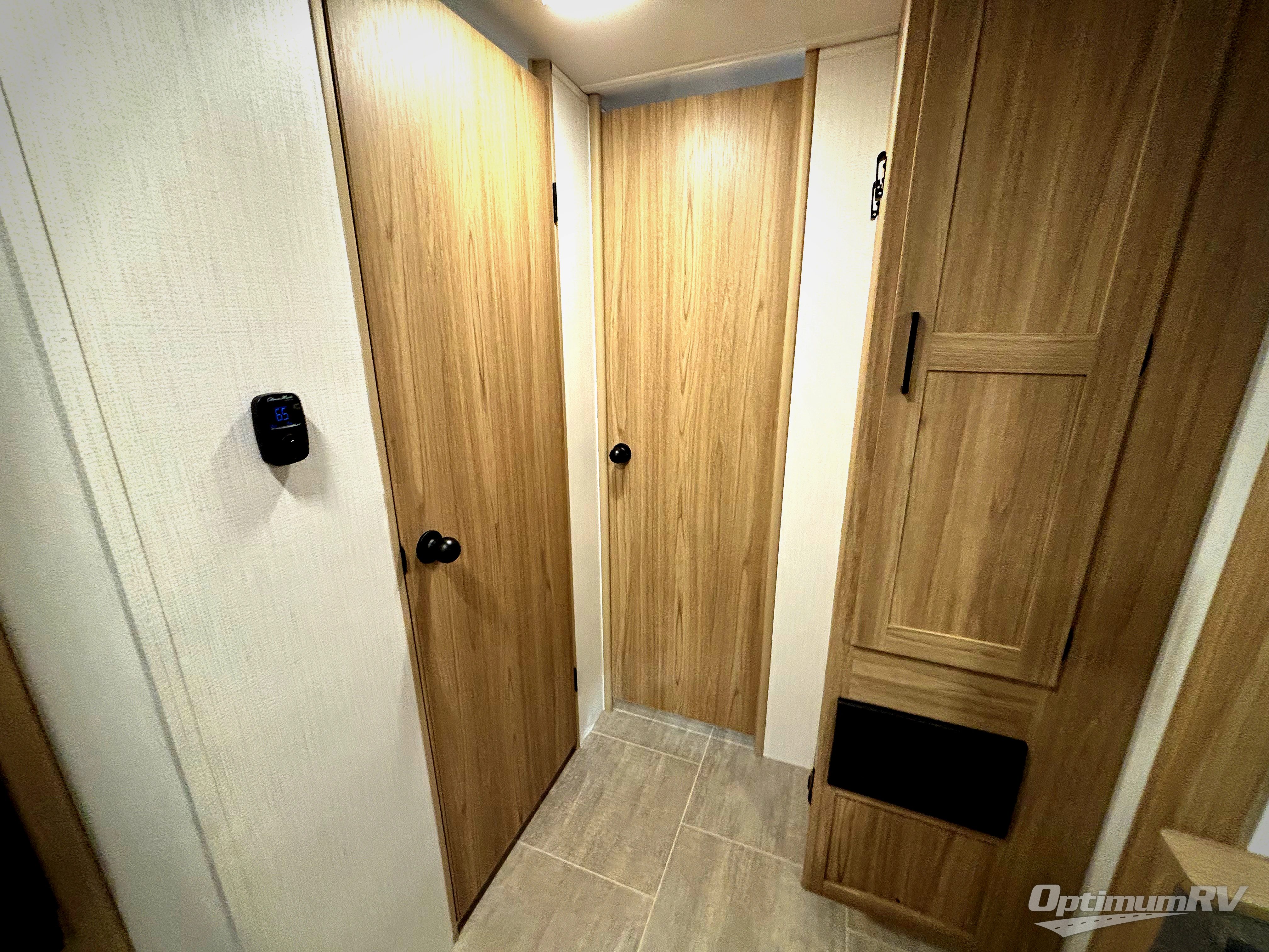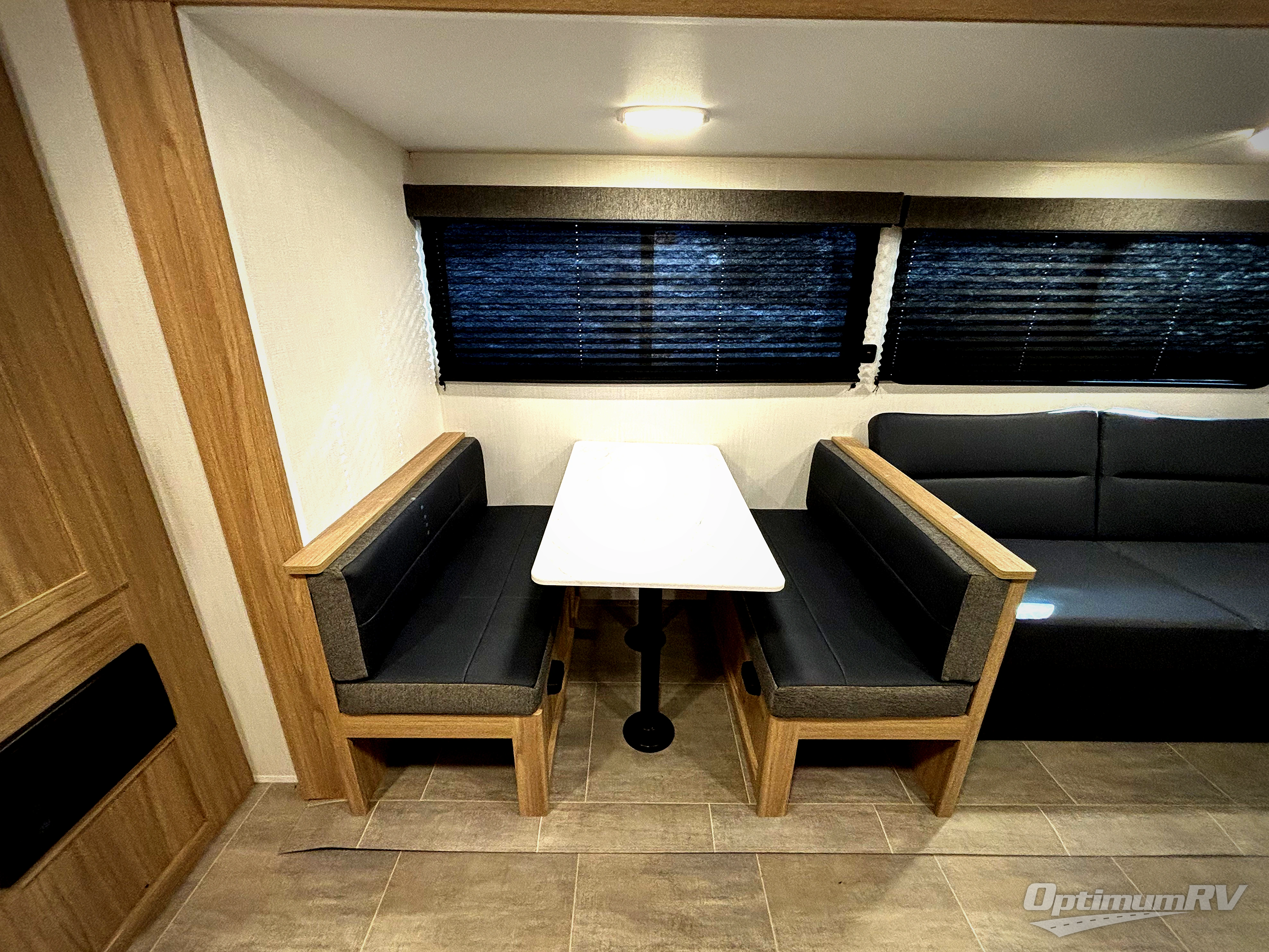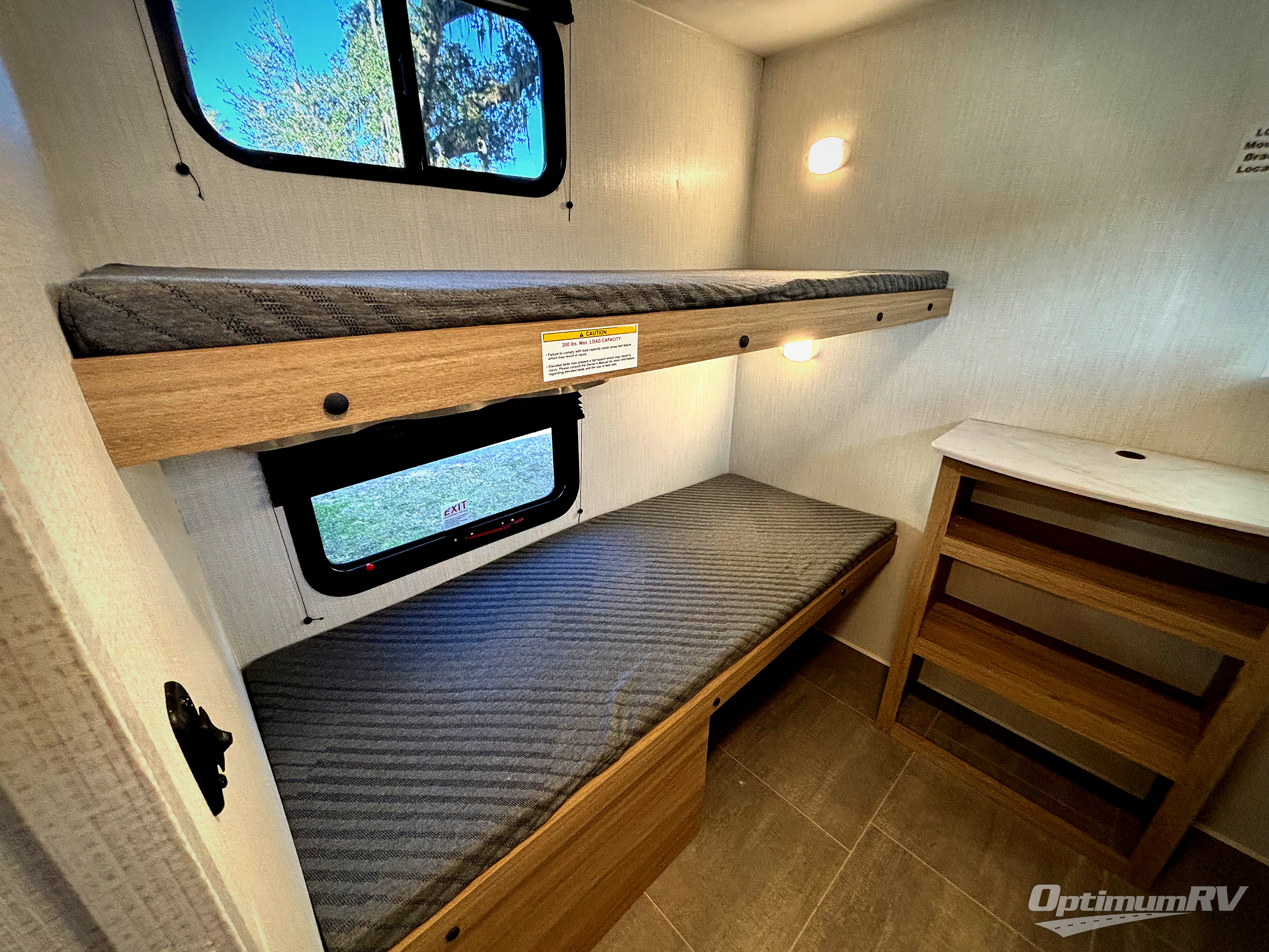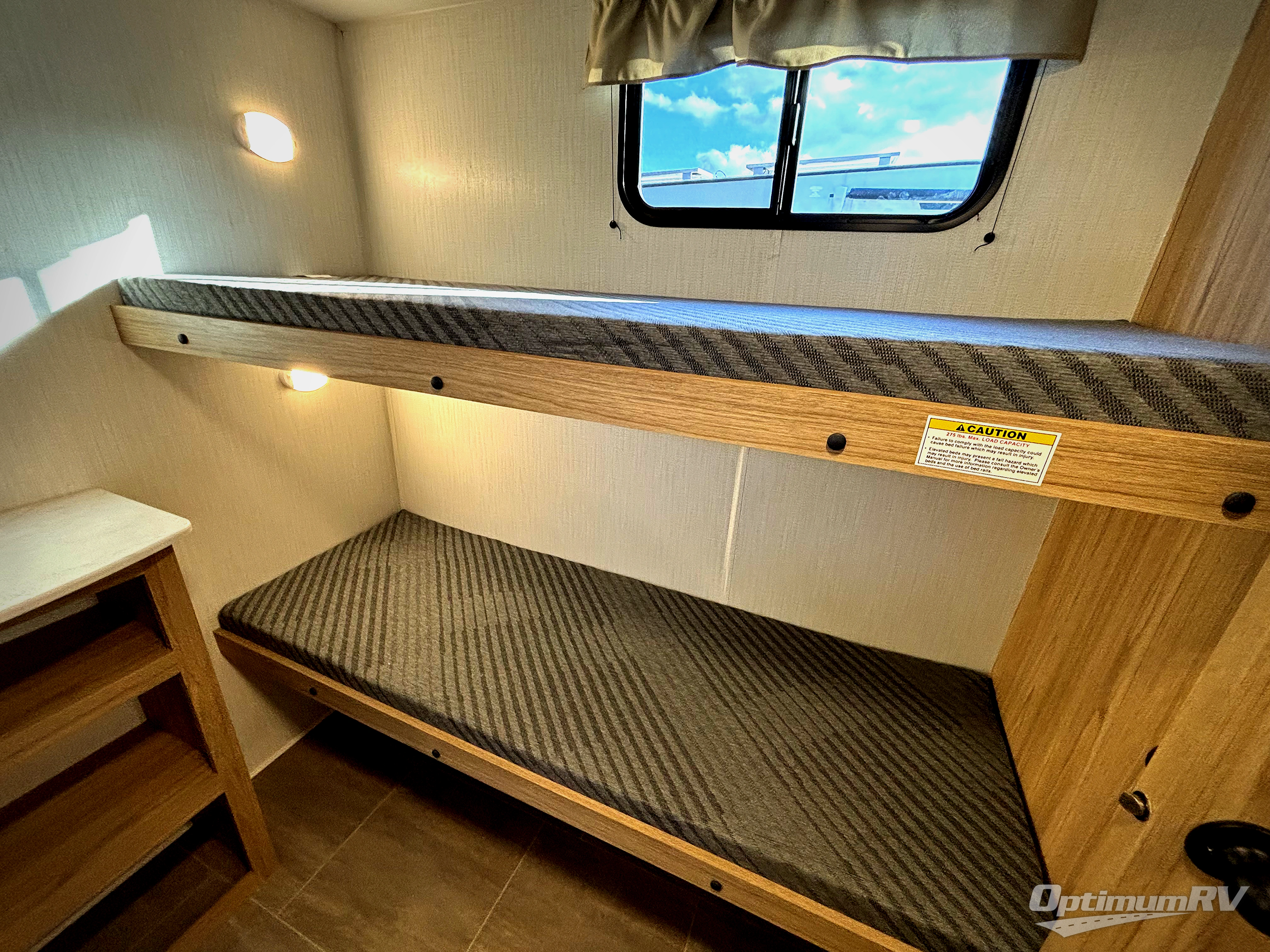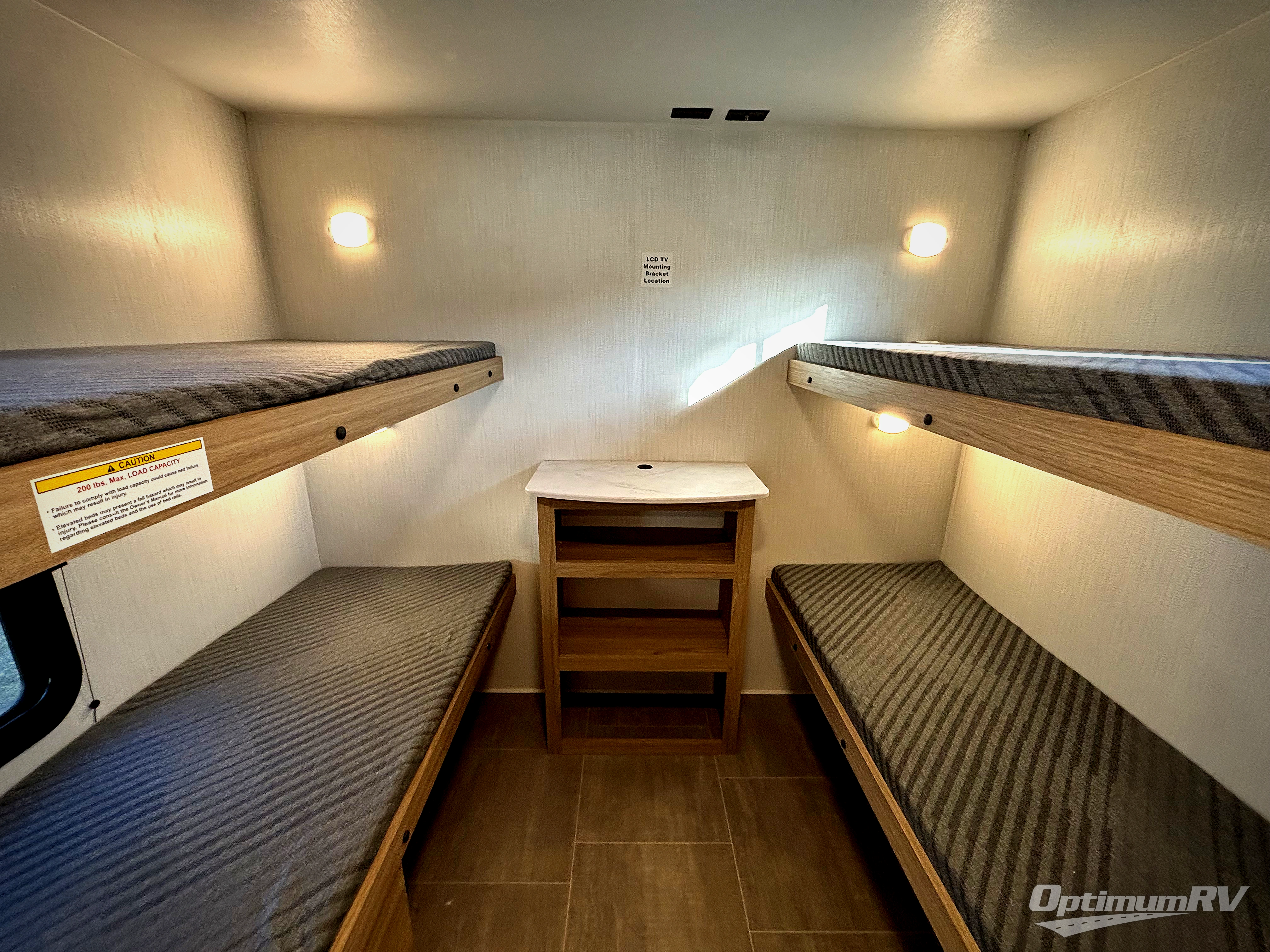 The littles ones will love camping in this travel trailer since there is a rear private bunkhouse with four bunks, a wardrobe, plus shelves to keep their things tidy. A full kitchen, complete with a cooktop, microwave, and 12V refrigerator will let you cook and store food, and a booth dinette provides a place to dine together. There is also a sofa where you can relax in the evenings if you're not outdoors under the 17' power awning. And when it's time to call it a night, you can head to the front private bedroom for a great night's rest on the queen bed!