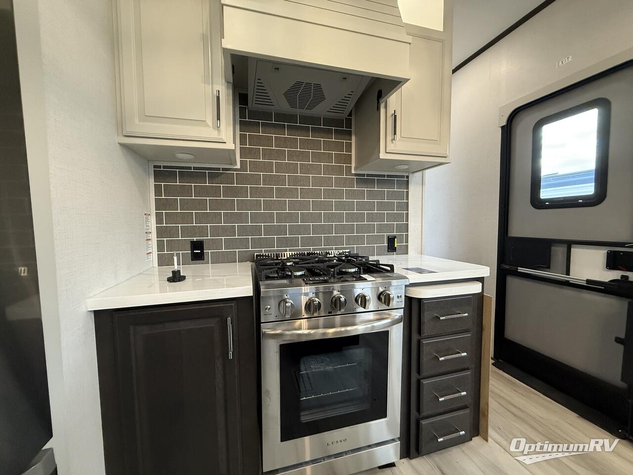 A great coach for an adventurous couple that loves to travel. This Alpine fifth wheel features wide open spaces thanks to triple slides with dual opposing slides in the main combined living and kitchen area. A center island with a sink is great for prep work, and you can easily entertain and have overnight guests with a hide-a-bed sofa sleeper. There is an entertainment center with a fireplace to enjoy when inside, and theater seating opposite for movie night. The chef will appreciate the full kitchen with an 18 cu. ft. residential refrigerator, a range hood, plus a convection microwave and a pull-out countertop to prep meals. Head up to the master suite which features a dual entry bath including a linen cabinet and large shower, plus a king bed that slides out and includes storage space underneath for extra blankets. There is also a master closet, a dresser with a Smart HDTV, and stackable washer and dryer prep if you plan to go full-time!