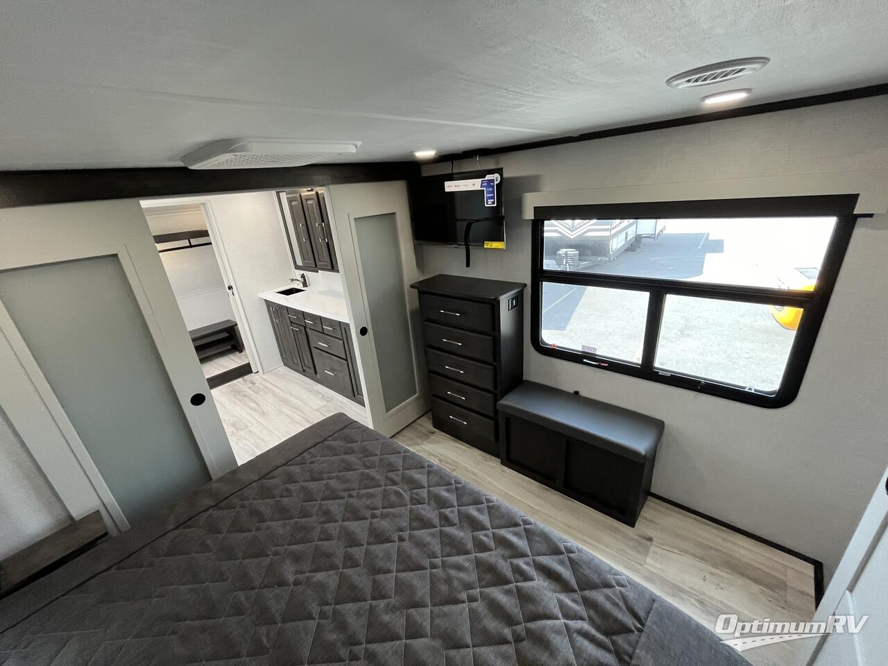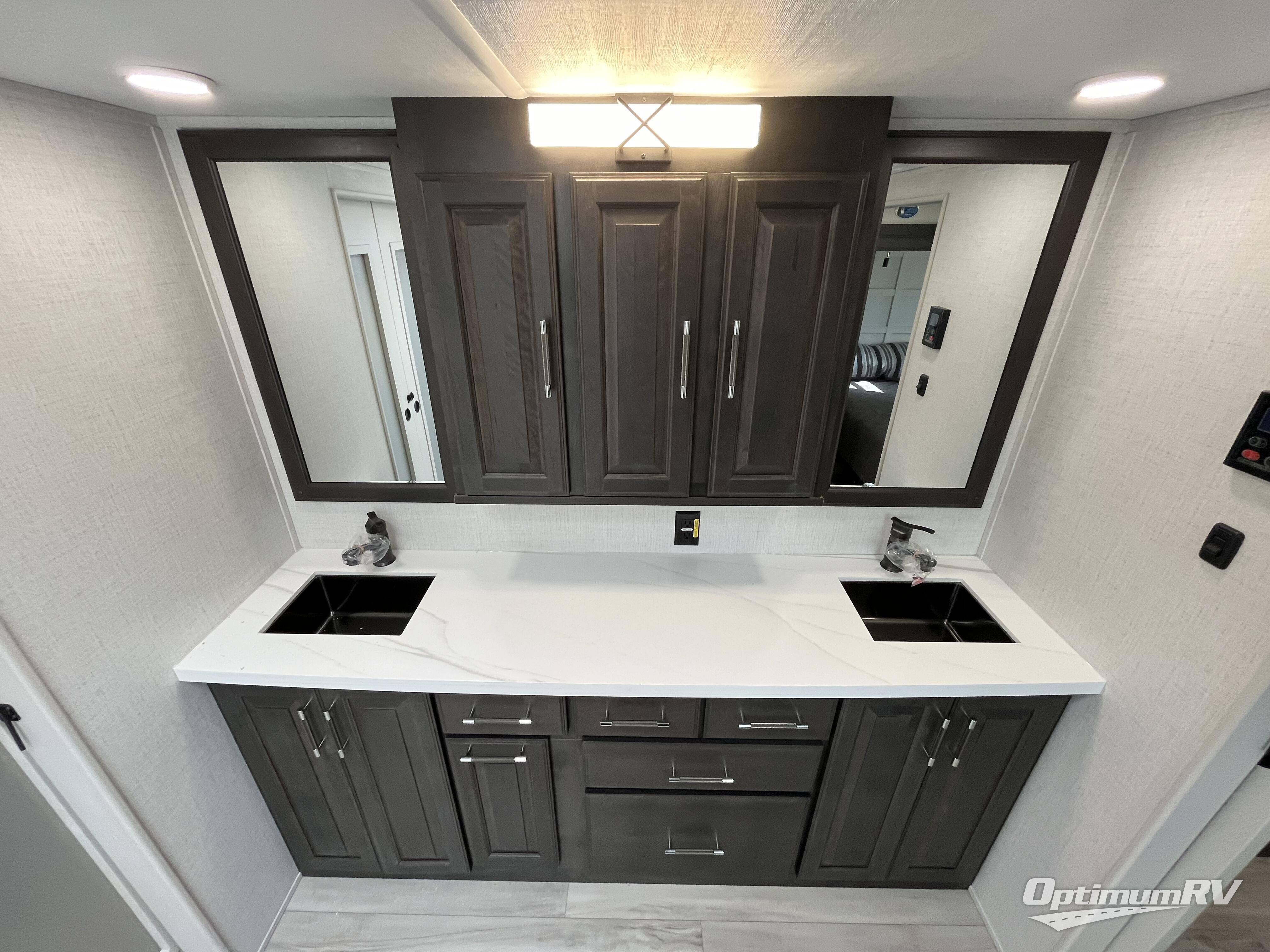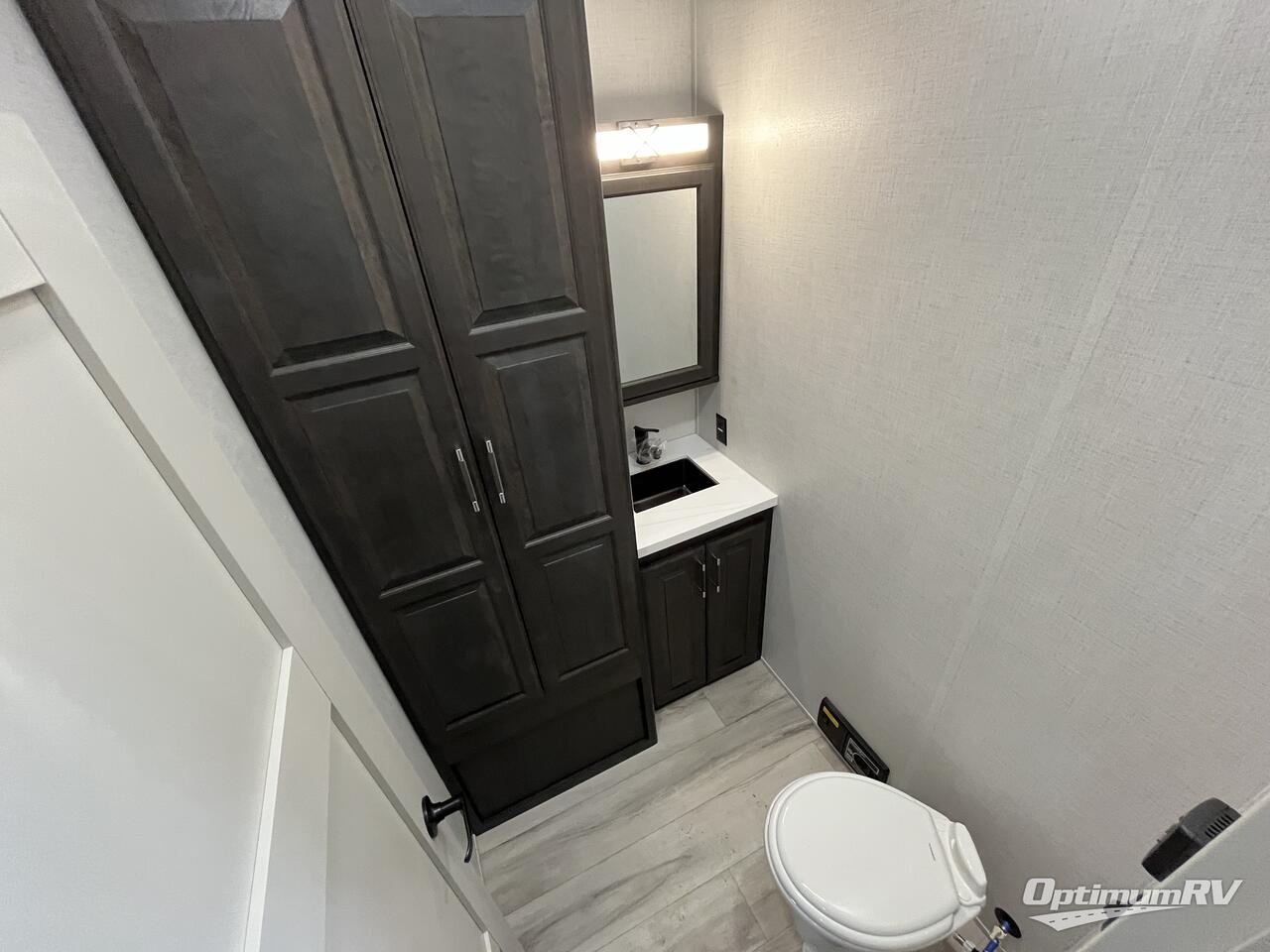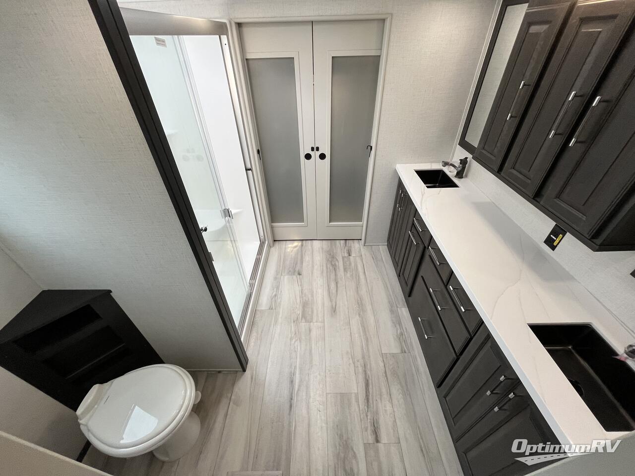 With a bath and a half, it's a clean decision to take this fifth wheel with you on your next camping trip! One of the dual entry doors leads directly into the rear kitchen which has a large pantry and an 18 cu. ft. residential refrigerator to store your food items. The free standing dinette and tri-fold sofa sleeper slide and opposing tri-fold sofa sleeper slide opens up the middle living area for more interior space. The half bathroom is conveniently located straight in through the main entry and features washer and dryer prep for clean clothes throughout your entire trip. The master suite not only has a king bed slide with storage underneath and a bench next to a dresser, but also access into the front full bathroom which has a dual sink vanity, a shower with a seat, and a toilet with privacy walls!