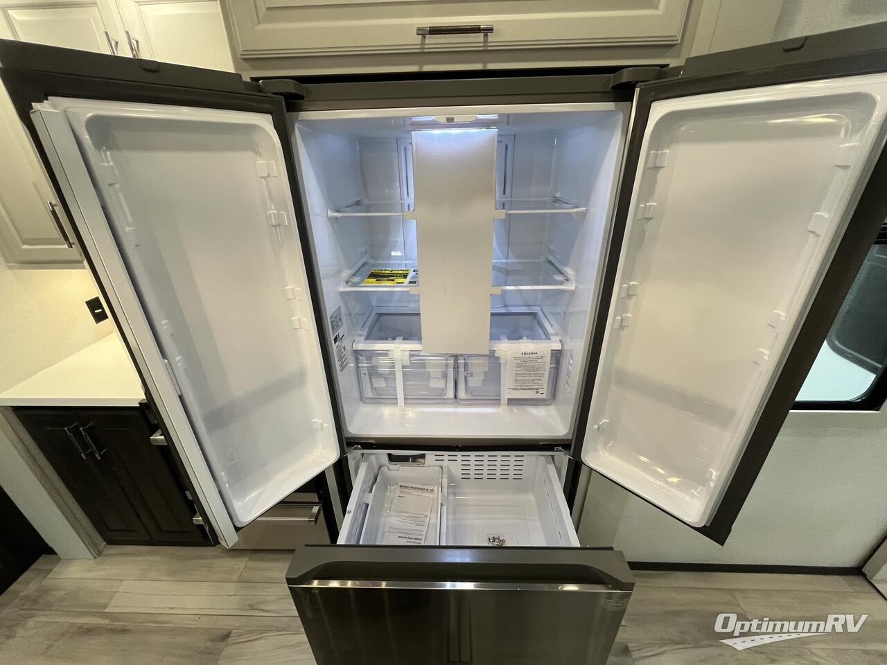 This rear kitchen fifth wheel makes extended stays or weekend trips to the lake enjoyable! The chef of your group will find plenty of counter space with the included kitchen island, plus there is a pantry and 18 cu. ft. residential refrigerator for food storage. A free-standing dinette provides a place to dine together, and the largest L-shaped sofa with recliners will be the perfect spot to relax with a movie. If you have guests, they could sleep here or on the hide-a-bed sofa sleeper. The dual entry bath includes a shower with a seat for added comfort, and the front master bedroom will feel just like home with its king bed slide out and master closet. There is also a dresser and stackable washer and dryer prep if you want to add those appliances!