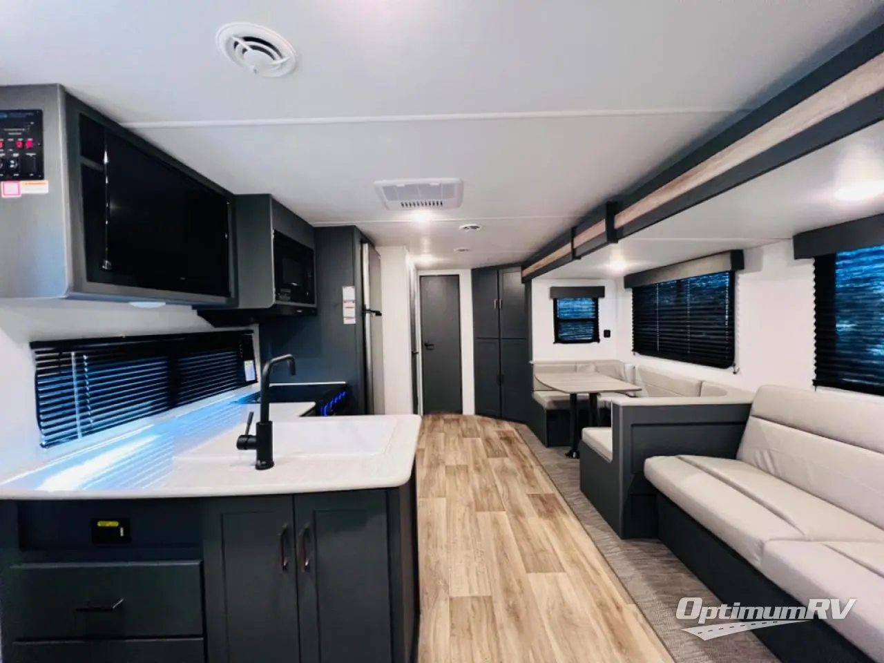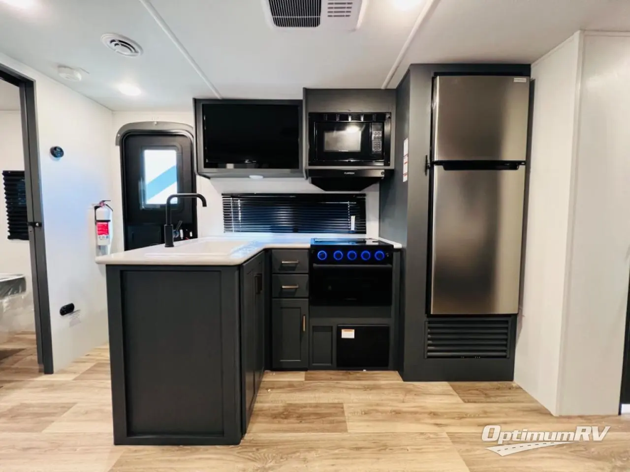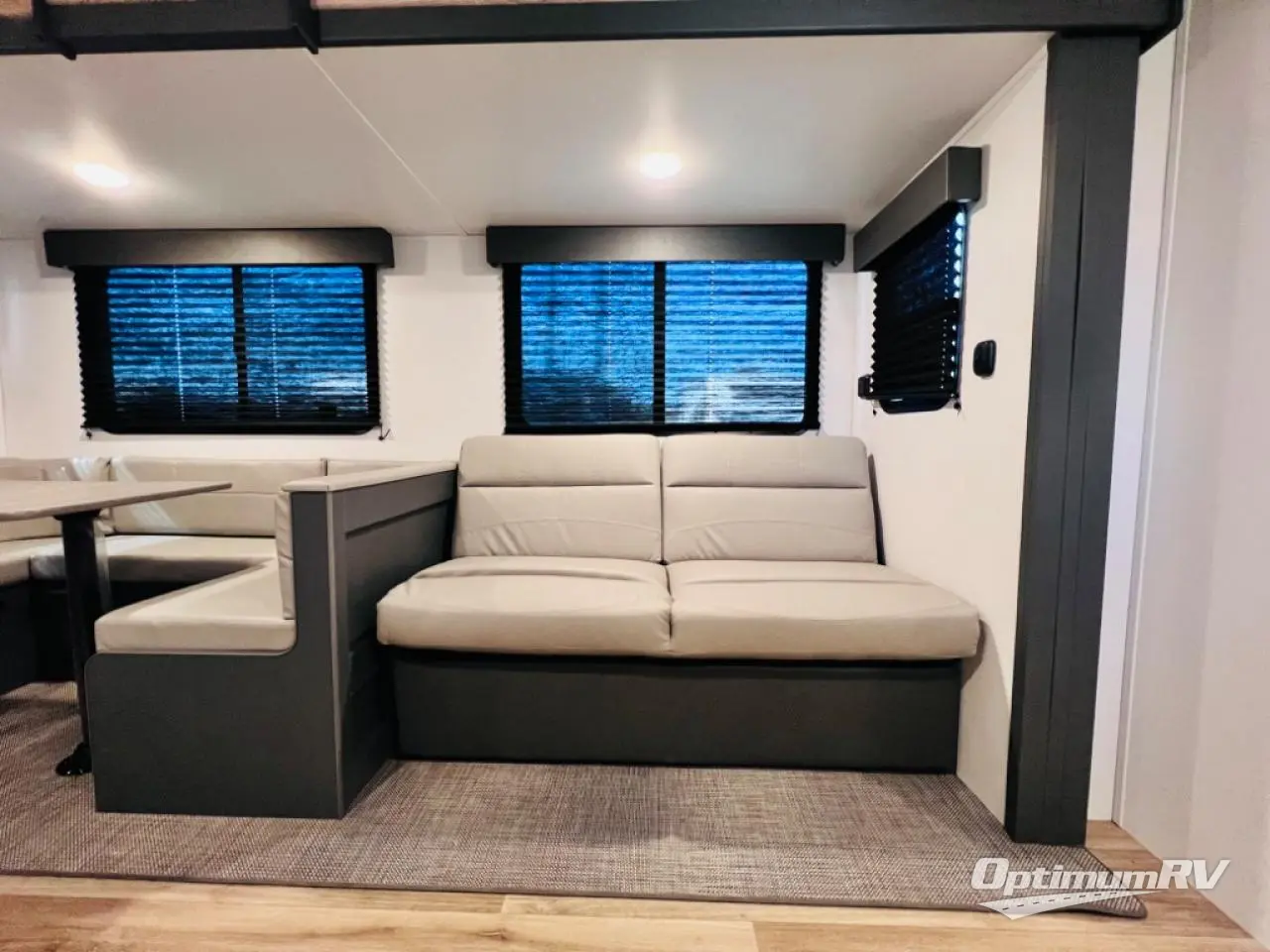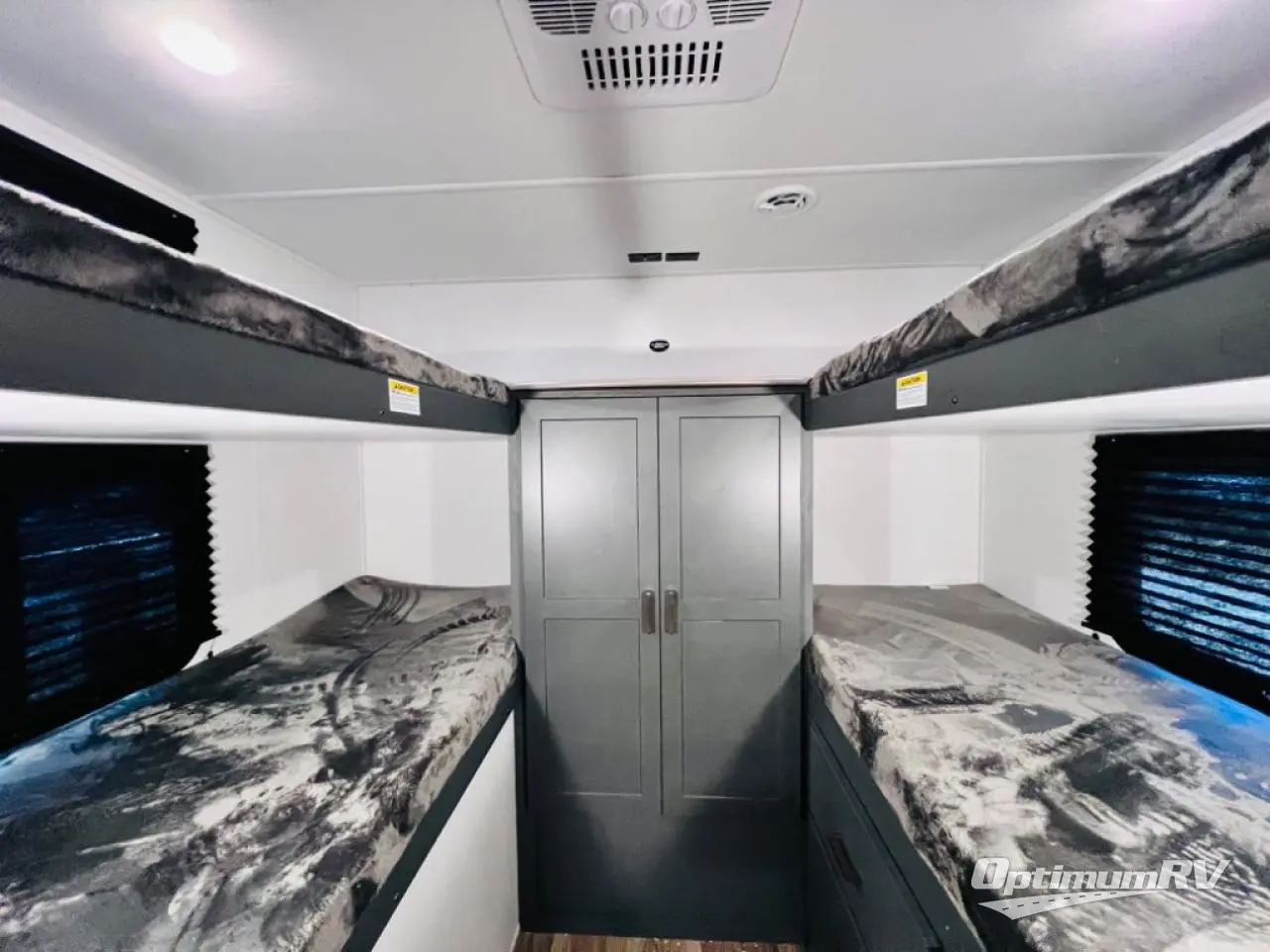 You're going to love this travel trailer with a front private bedroom for you and a rear private bunkhouse for your guests. There are four bunk beds, plus a wardrobe and additional storage to keep this space tidy. And the front bedroom includes a queen bed, dual wardrobes and dual nightstands to keep your phone and books on. Everyone can meet in the main living area that is made spacious by the large slide out. When your crew has worked up an appetite, you can make lunch on the two burner range or use the microwave oven. There is also a large 12V refrigerator to keep cold drinks stocked. Outside, you'll appreciate multiple pass-through storage compartments and a power awning to provide shade!