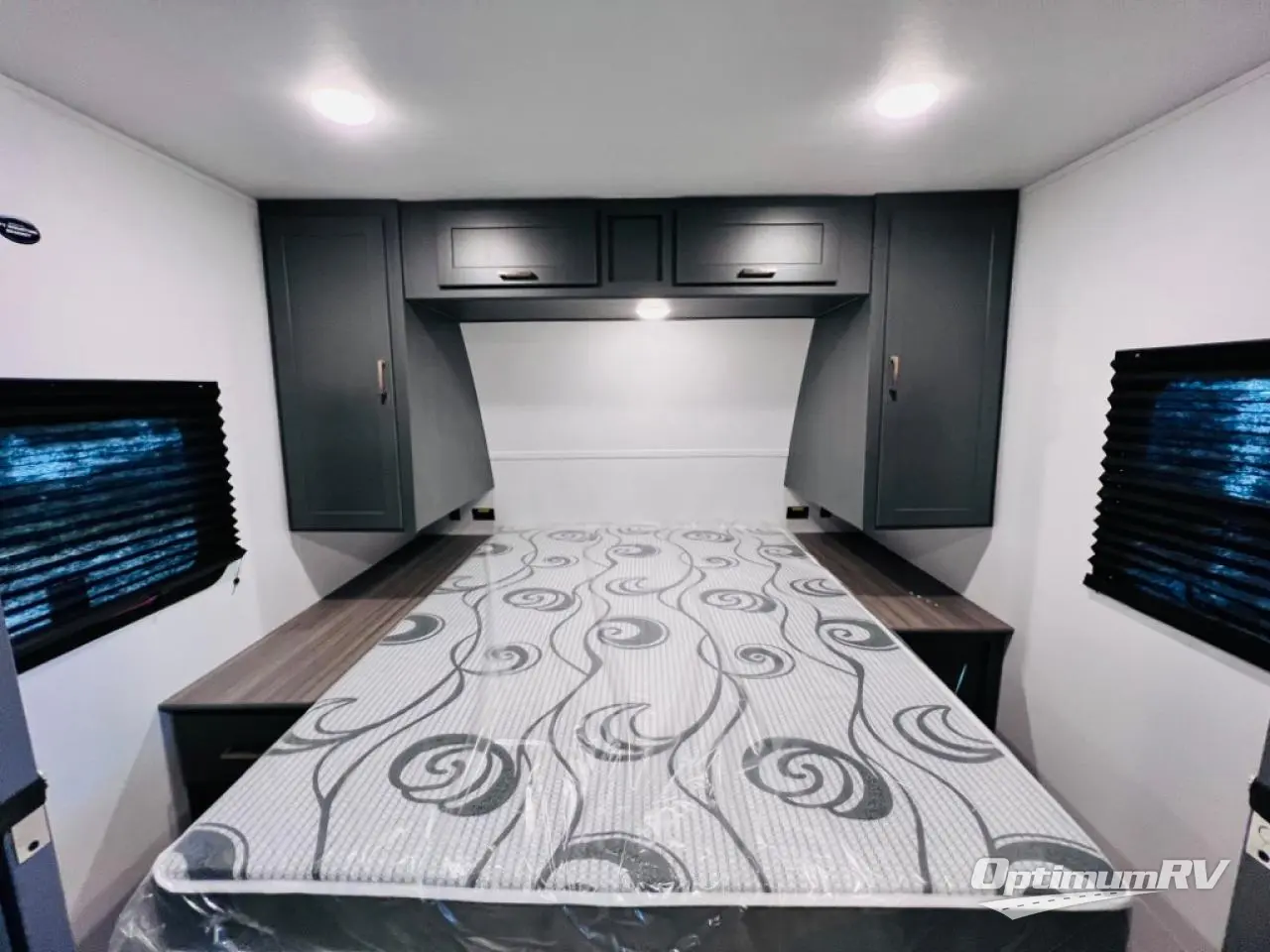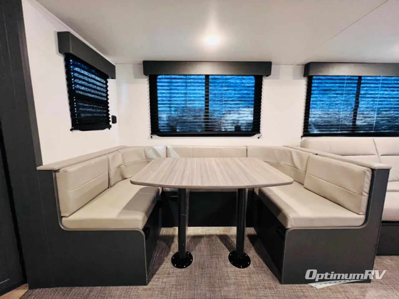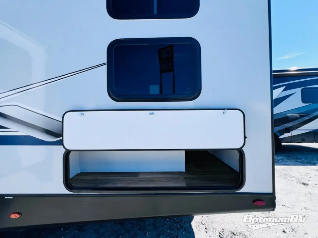 You're going to love this travel trailer with a front private bedroom for you and a rear private bunkhouse for your guests. There are four bunk beds, plus a wardrobe and additional storage to keep this space tidy. And the front bedroom includes a queen bed, dual wardrobes and dual nightstands to keep your phone and books on. Everyone can meet in the main living area that is made spacious by the large slide out. When your crew has worked up an appetite, you can make lunch on the two burner range or use the microwave oven. There is also a large 12V refrigerator to keep cold drinks stocked. Outside, you'll appreciate multiple pass-through storage compartments and a power awning to provide shade!