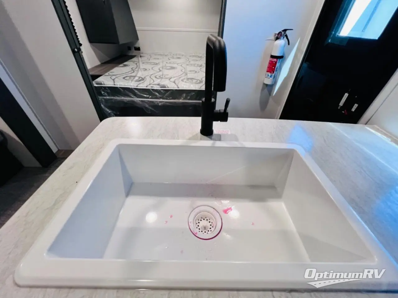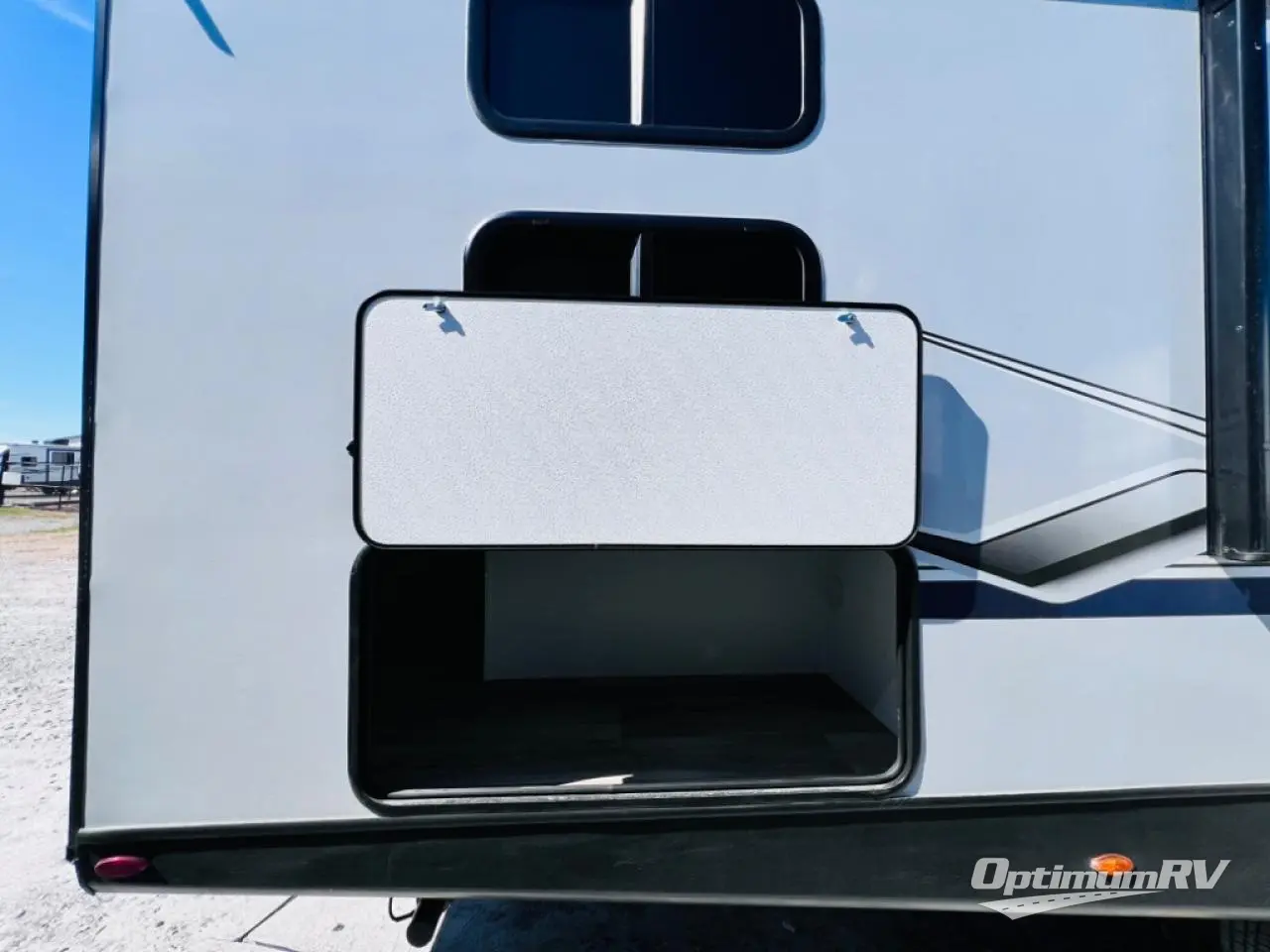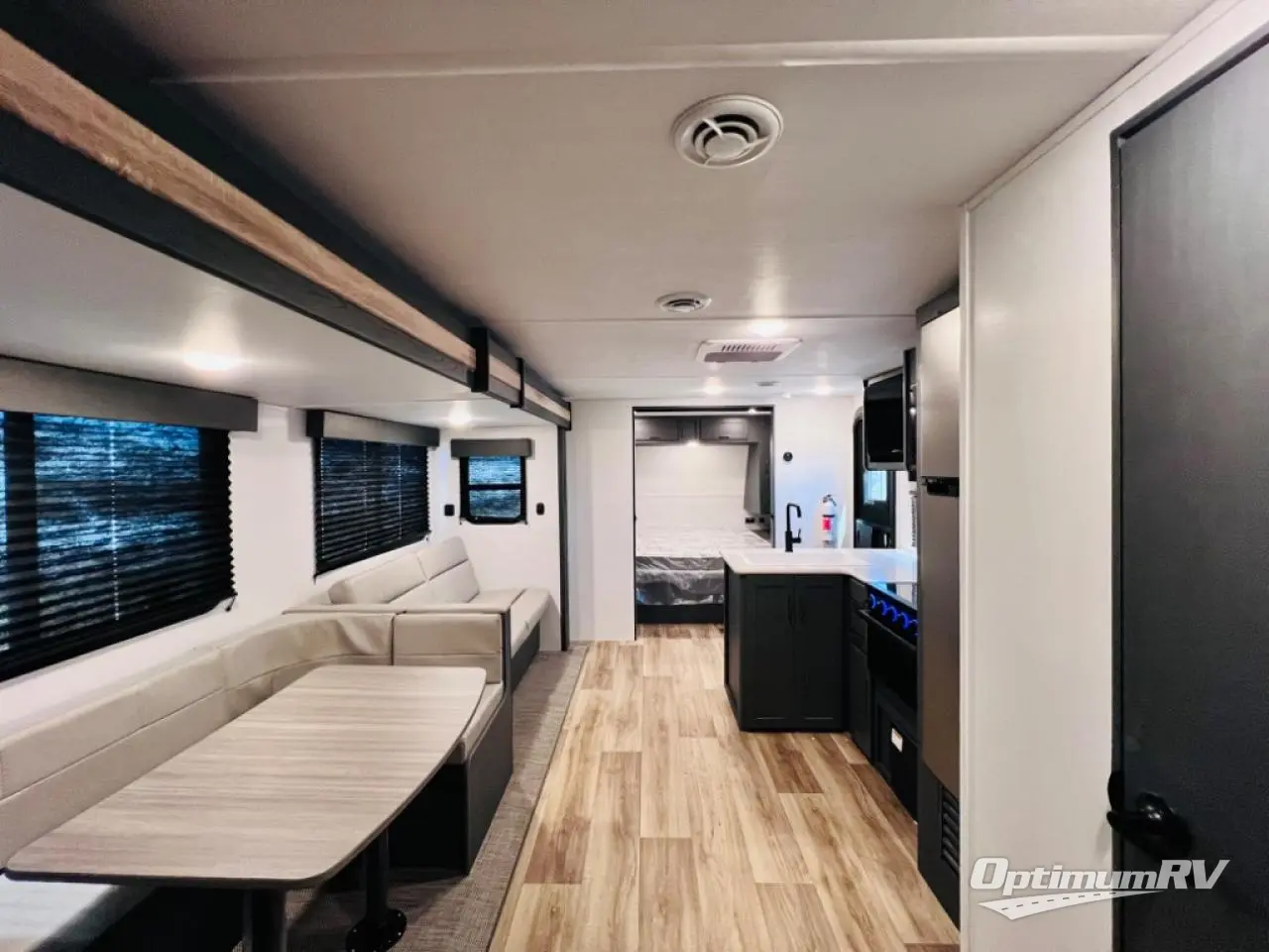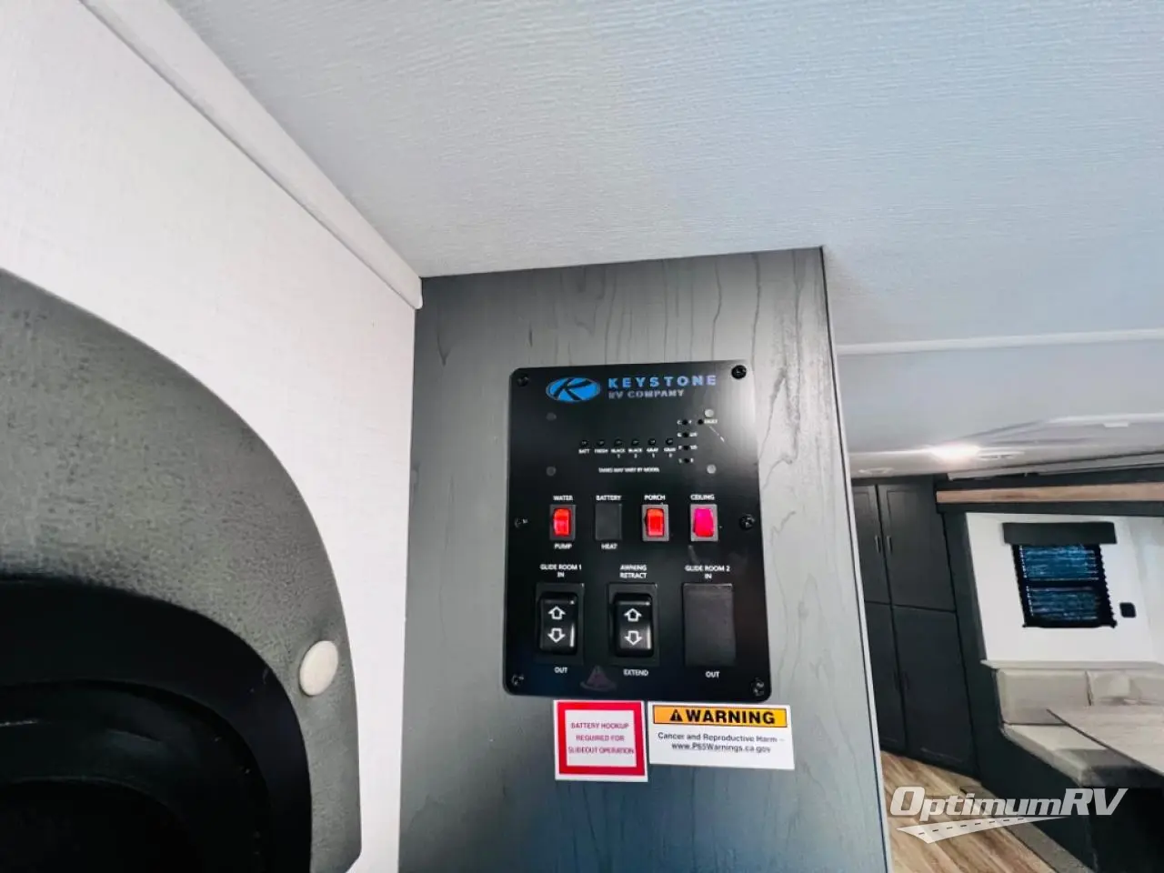 You're going to love this travel trailer with a front private bedroom for you and a rear private bunkhouse for your guests. There are four bunk beds, plus a wardrobe and additional storage to keep this space tidy. And the front bedroom includes a queen bed, dual wardrobes and dual nightstands to keep your phone and books on. Everyone can meet in the main living area that is made spacious by the large slide out. When your crew has worked up an appetite, you can make lunch on the two burner range or use the microwave oven. There is also a large 12V refrigerator to keep cold drinks stocked. Outside, you'll appreciate multiple pass-through storage compartments and a power awning to provide shade!