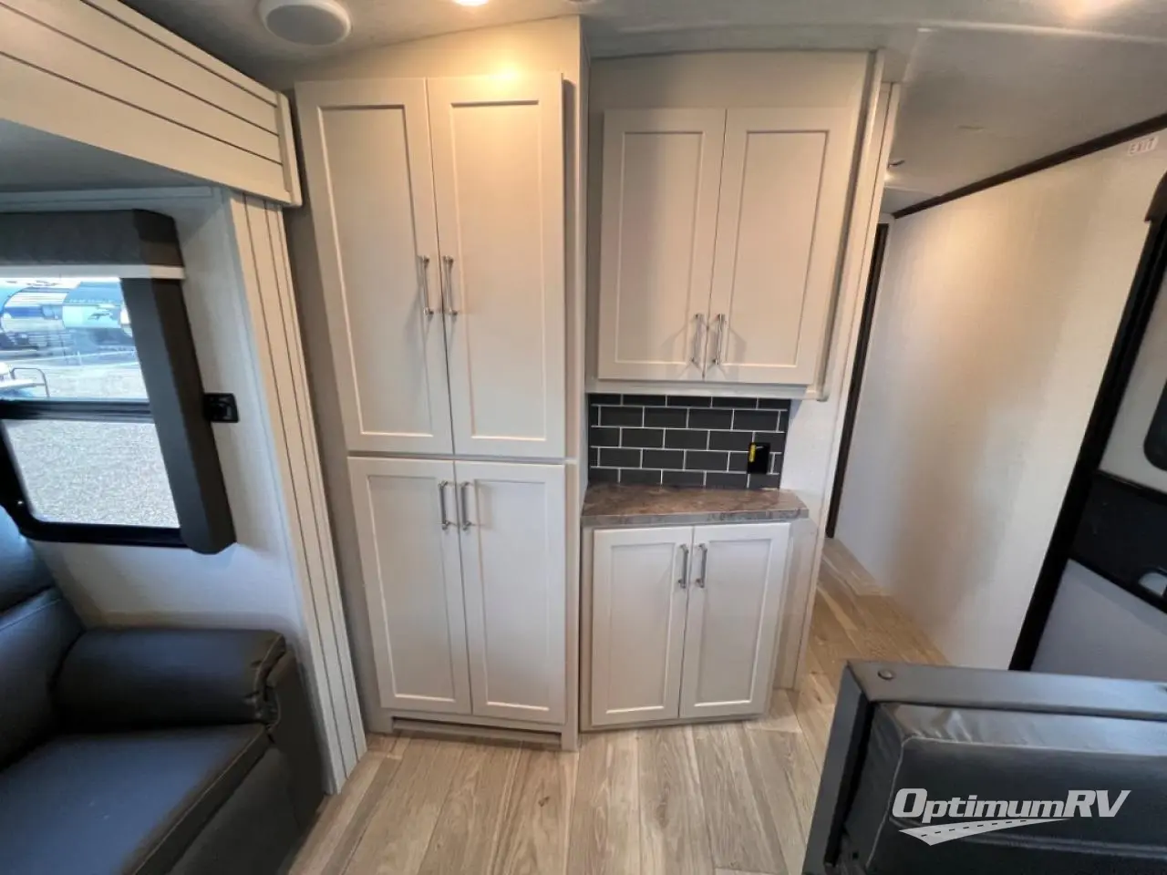 If you're ready for fun summers at the lake, make your adventures complete with this travel trailer in tow. The rear kitchen includes ample counter space to prep burgers, and you can take your preparations outside to cook on the outdoor kitchen! If the weather is nice, you might just want to eat outside too under the 18' power awning, or dine inside at the booth dinette. There is also a tri-fold sleeper sofa within the large slide out and an LED HDTV for movie nights. You'll find plenty of storage throughout, including a kitchen pantry, overhead cabinets, plus dual bedroom wardrobes on either side of the king bed!
