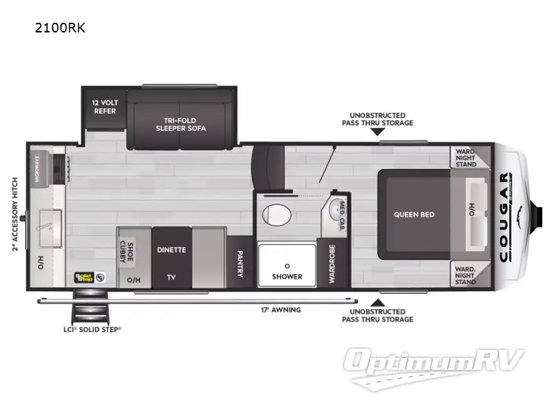 Your family of five or six will love traveling in this Cougar Sport lightweight fifth wheel! Enter to find a convenient rear kitchen layout just steps inside the door. Drop your shoes off in the shoe cubby to your right at the door, and relax on either the tri-fold sleeper sofa or at the booth dinette. The sofa and a 12 volt refrigerator are situated within the slide for added roominess. Head up the steps to a complete bath and private front bedroom featuring a queen size bed with dual shirt wardrobes and nightstands on both sides of the bed. There is also a wardrobe off the foot of the bed along the inside wall with two convenient drawers as well. The bathroom offers a shower with a skylight for added headroom and natural lighting. You will also appreciate the medicine cabinet over the sink for your personal items. Back down to the main living and kitchen area, a nice size pantry will hold all of your dry goods and snacks, and there is ample storage in the overhead cabinets above the dinette on either side of the TV, plus in the kitchen area all along the rear wall. Here you can cook your family their camp favorites using either the three burner range with oven, or overhead microwave. Outside, a 17' awning provides added living space protected from the elements!