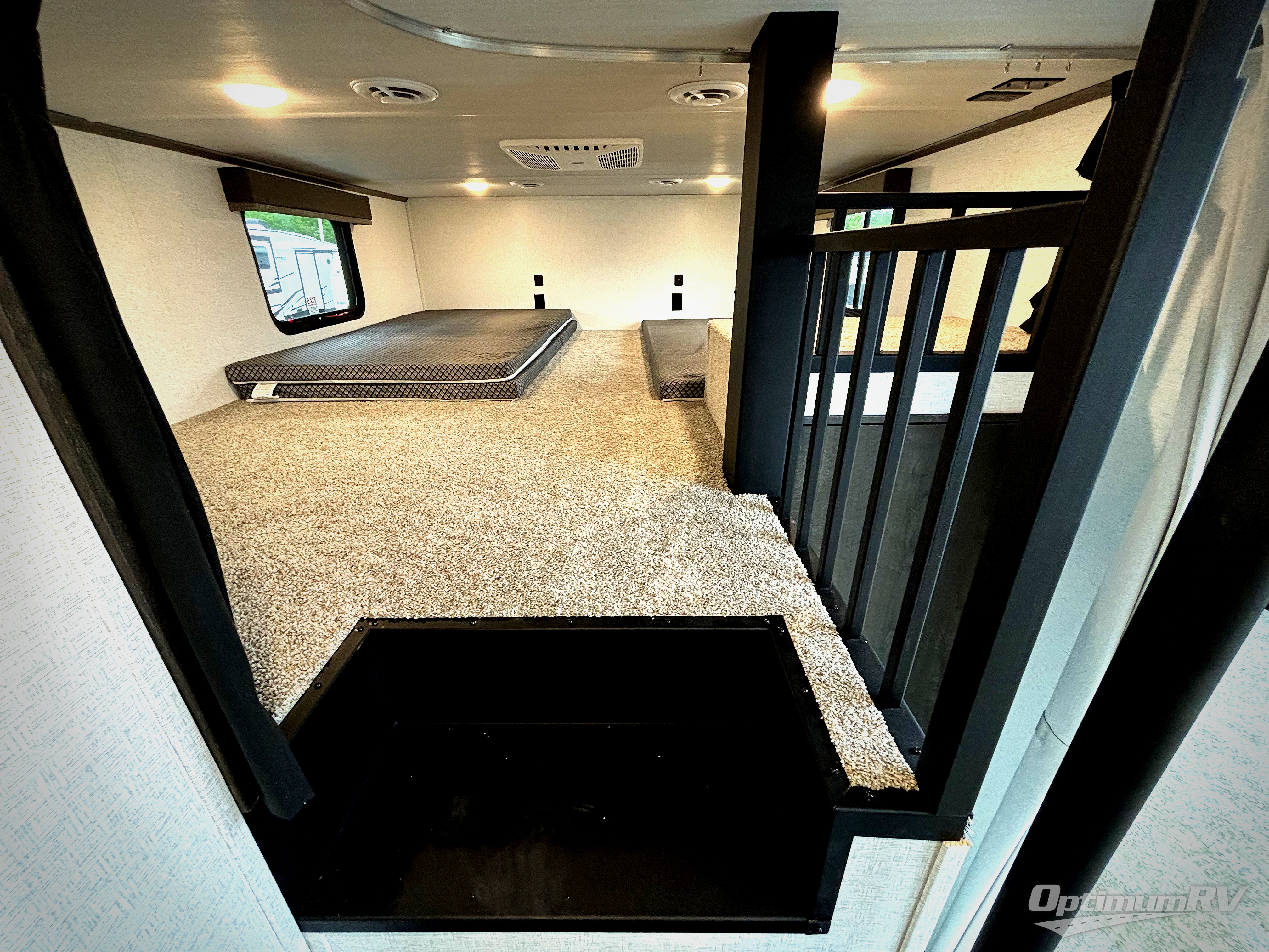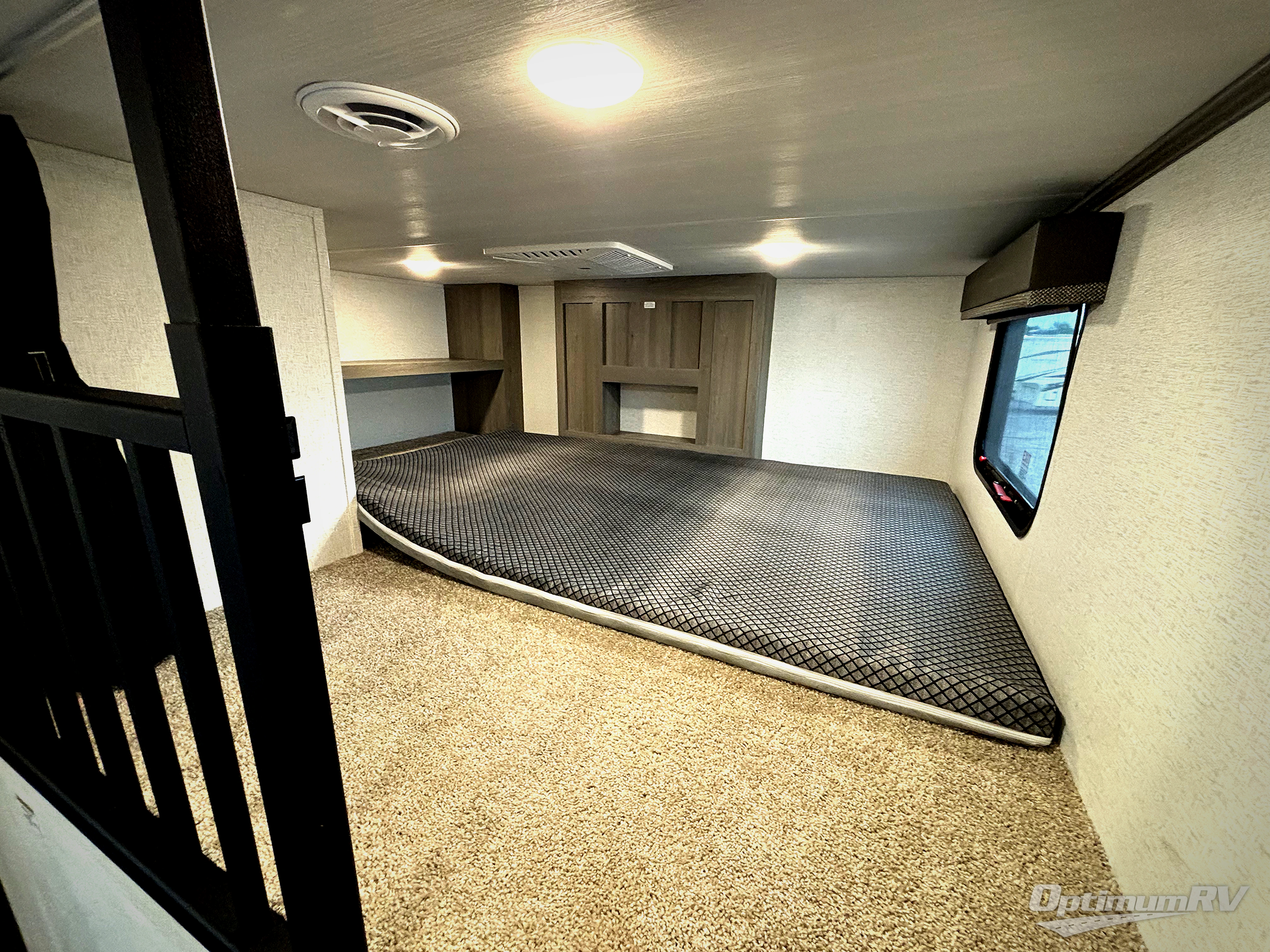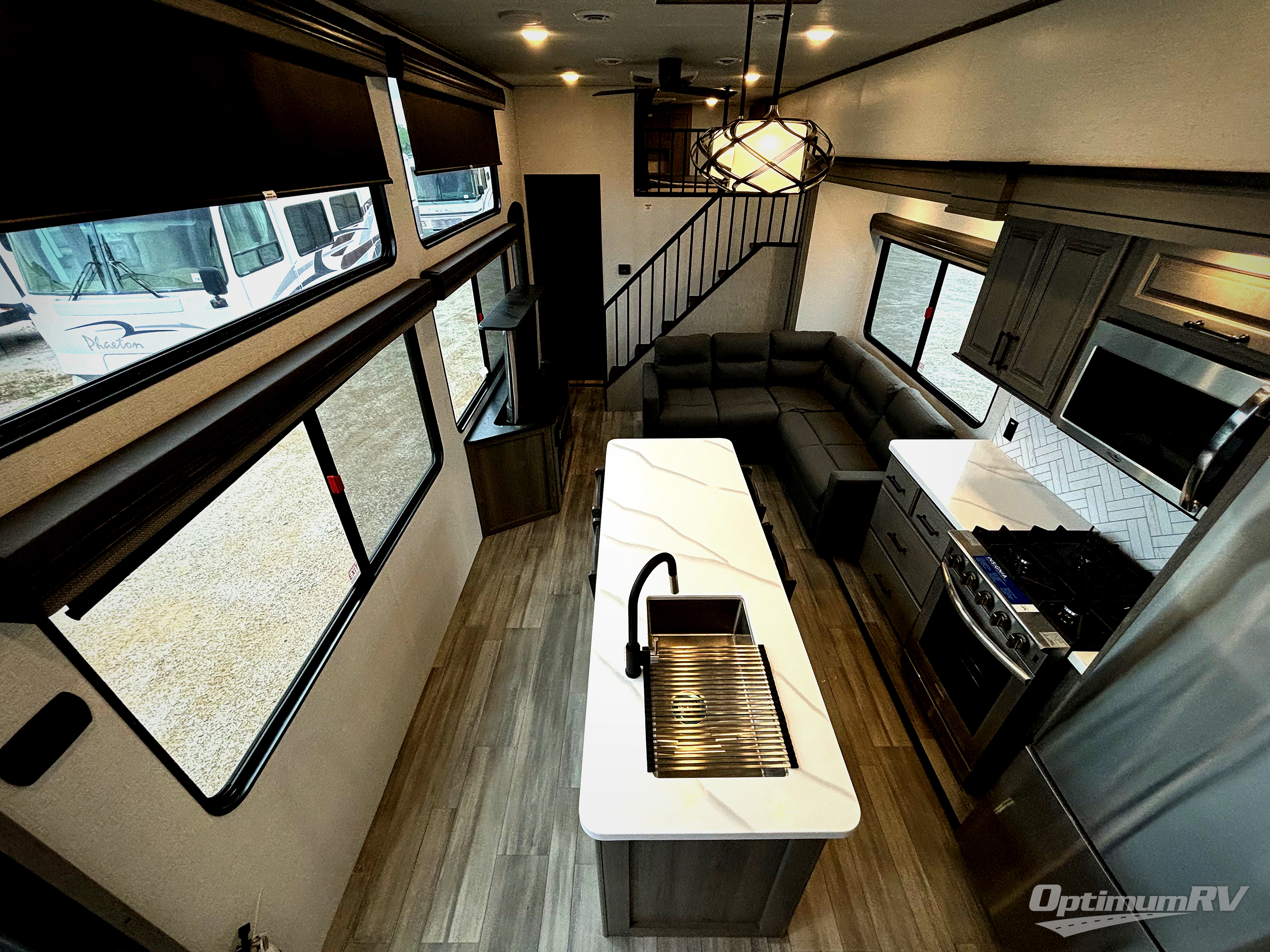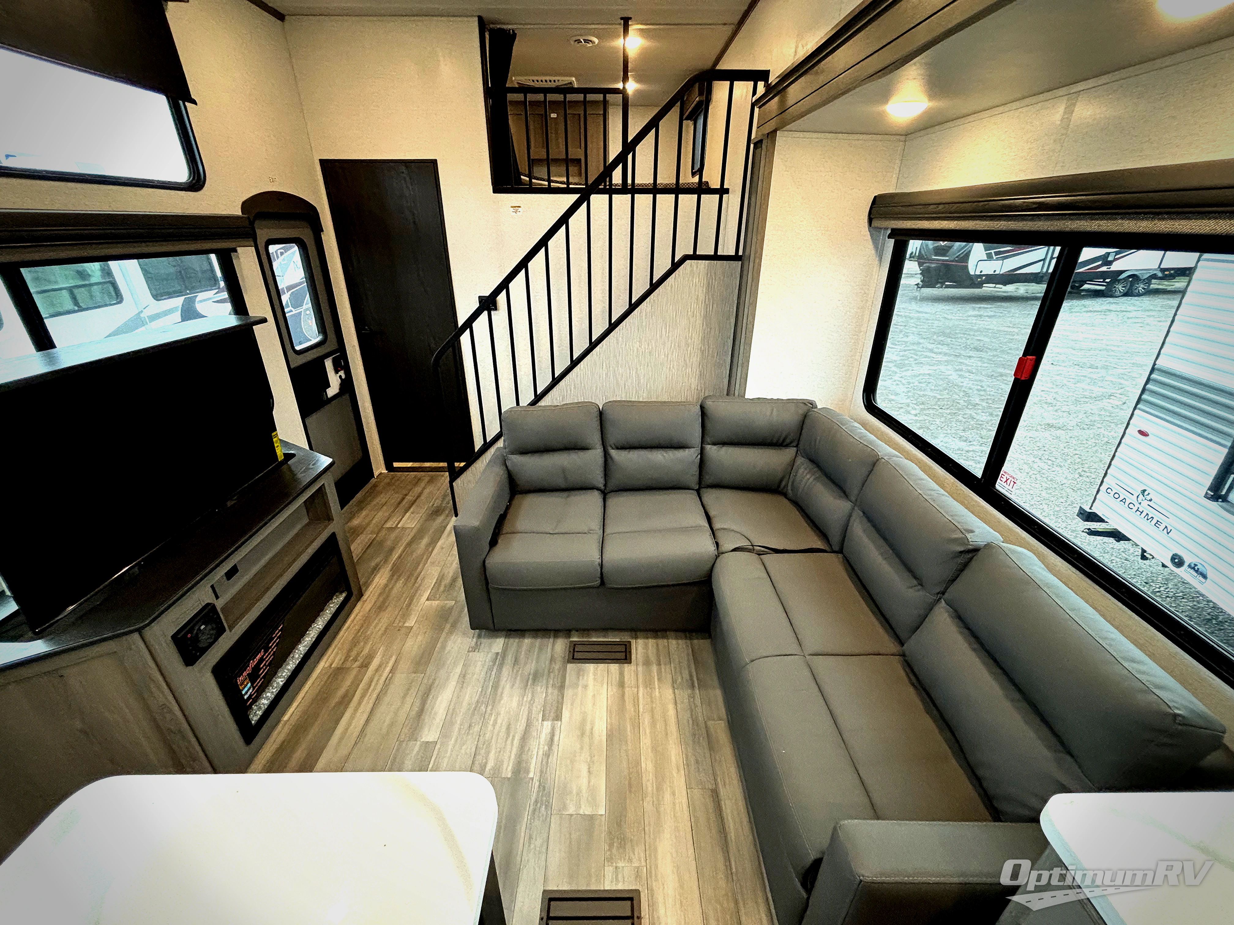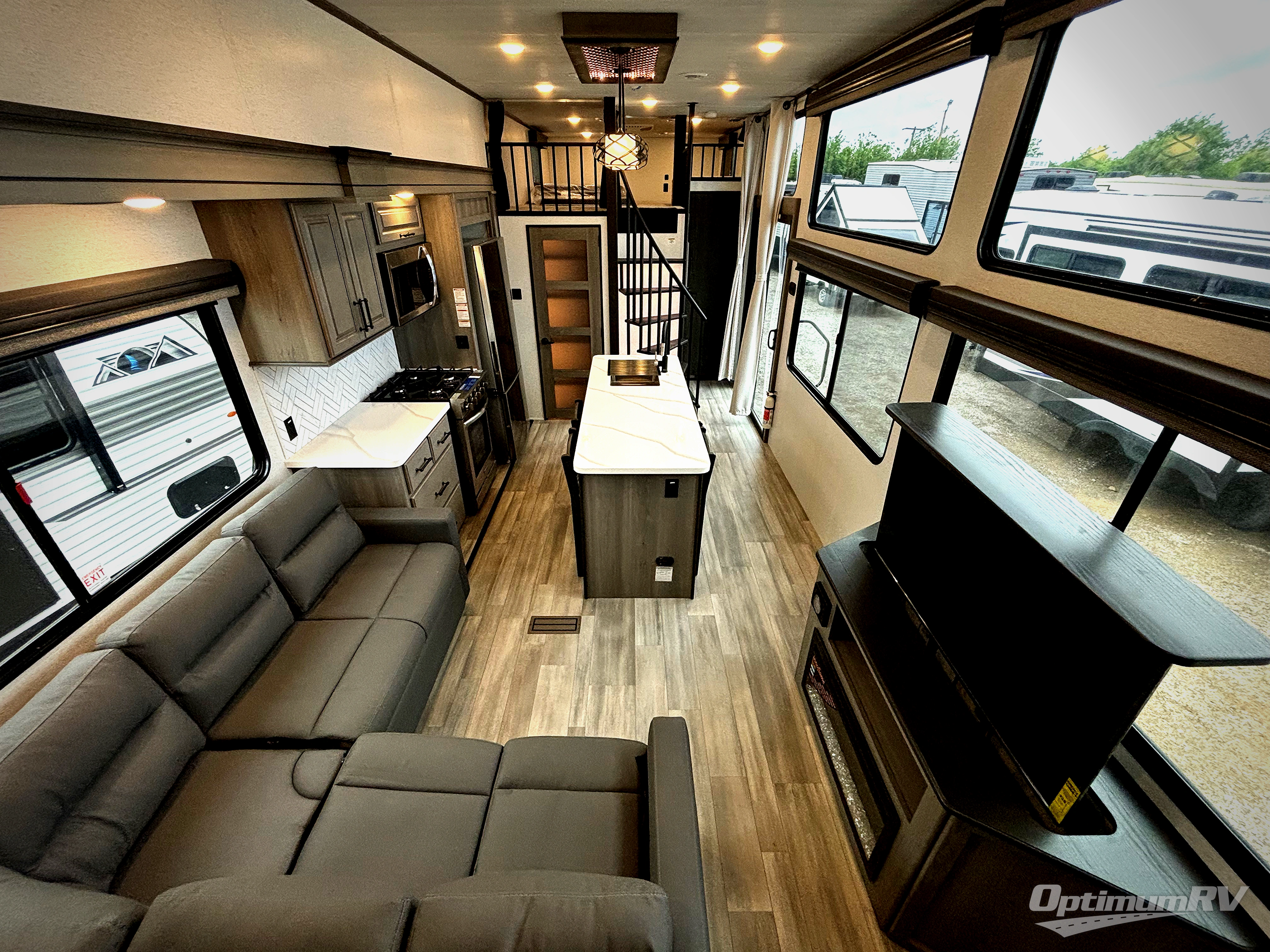 This destination trailer is so accommodating, you may just want to camp all year long! The owners will have the front bedroom all to themselves with a king bed slide out, dresser, and master closet so everything has a place. Above this room is the front loft with stairs that includes three 39" x 74" beds/sleeping spaces and storage shelves, making it perfect for little ones! The spacious full rear bath includes dual bath sinks, a large shower with a seat, and a closet with washer/dryer prep if you want to add these appliances. And just outside the bath, you'll find the second set of stairs that leads to the rear loft with a 54" x 81" bed, an entertainment center, and storage shelves for your guests. During the day, everyone can meet in the combined living area and kitchen that features a large slide for more space, a sectional sofa, a kitchen island with four barstools, plus an entertainment center with a fireplace!