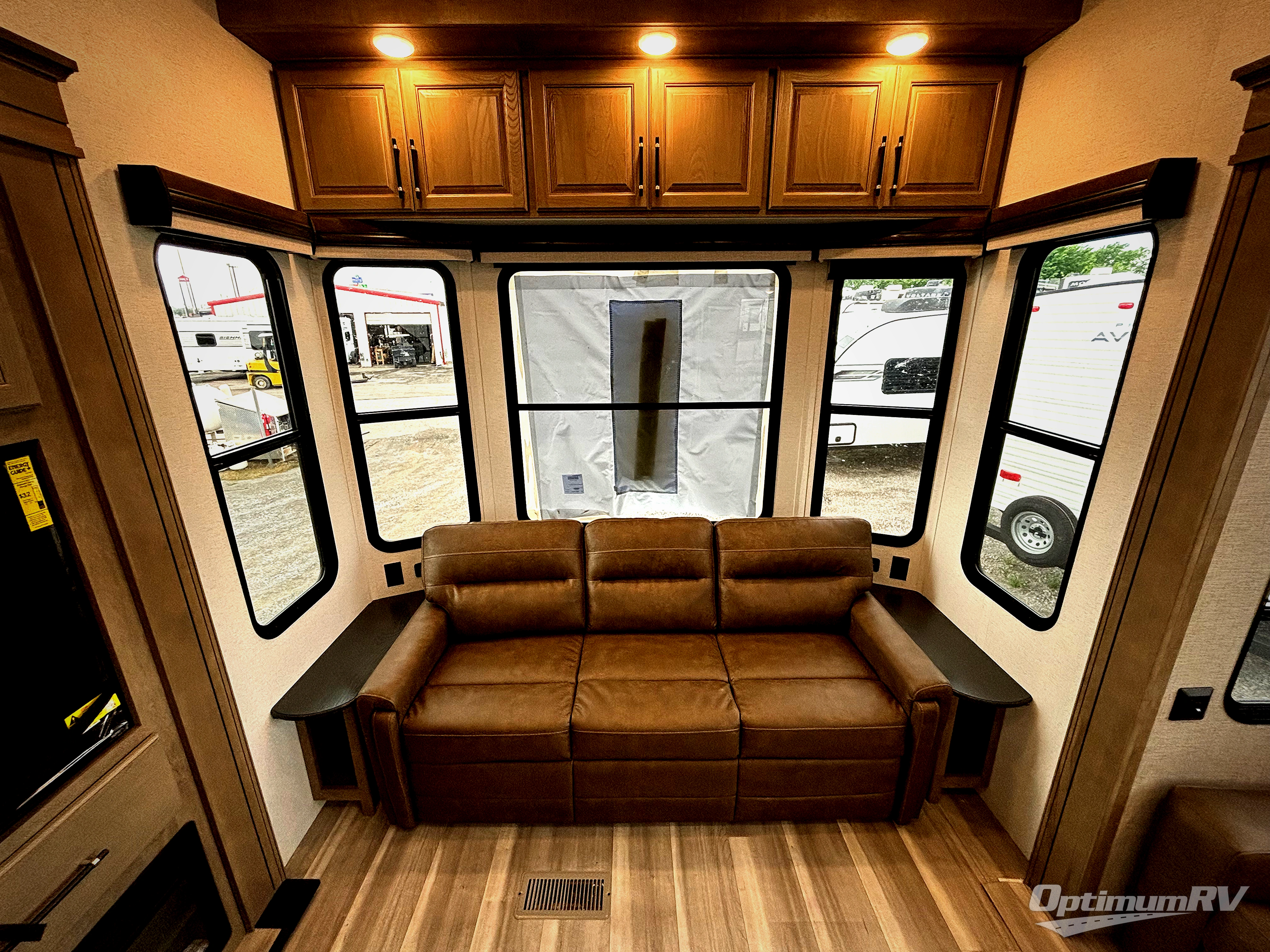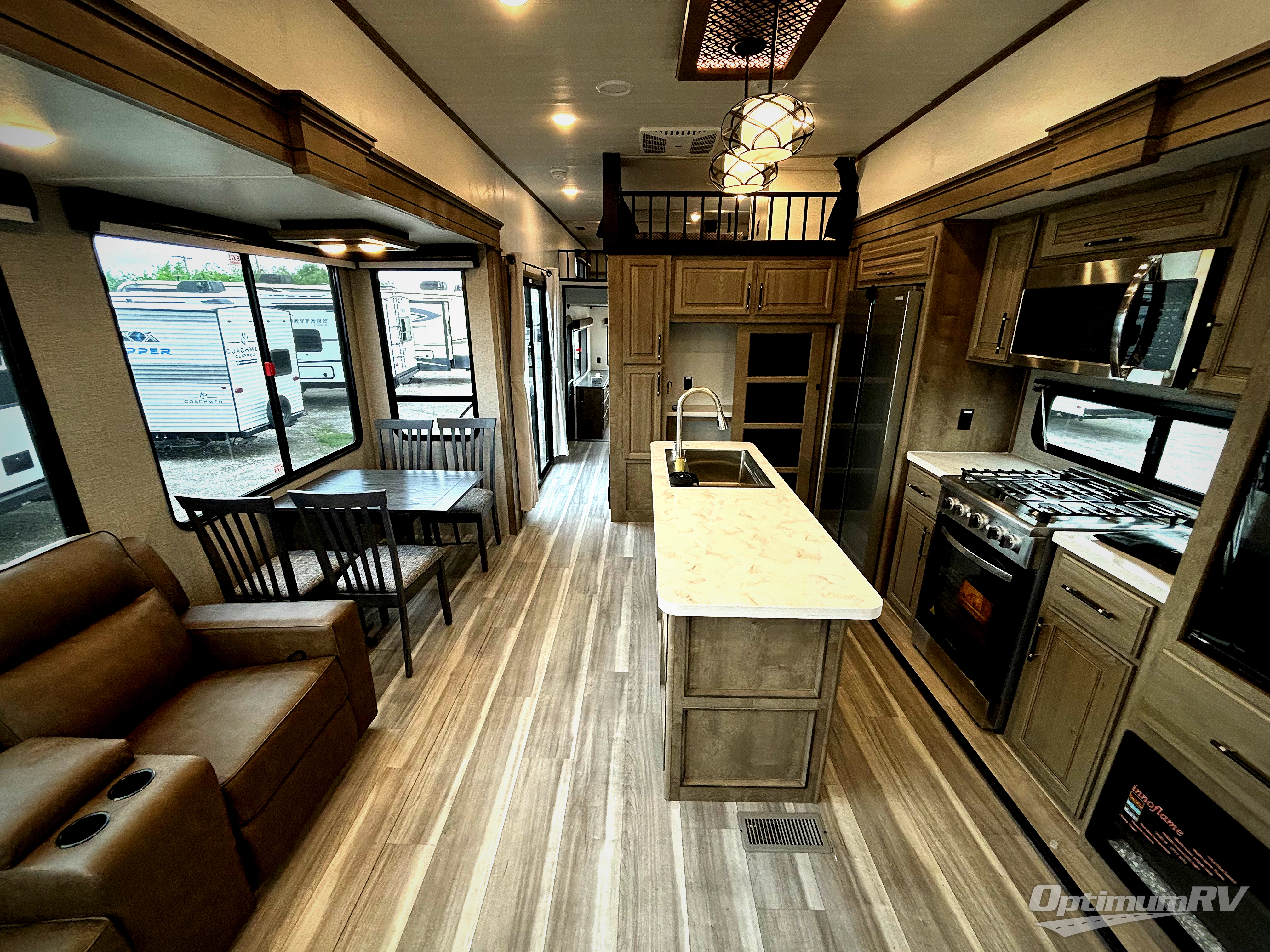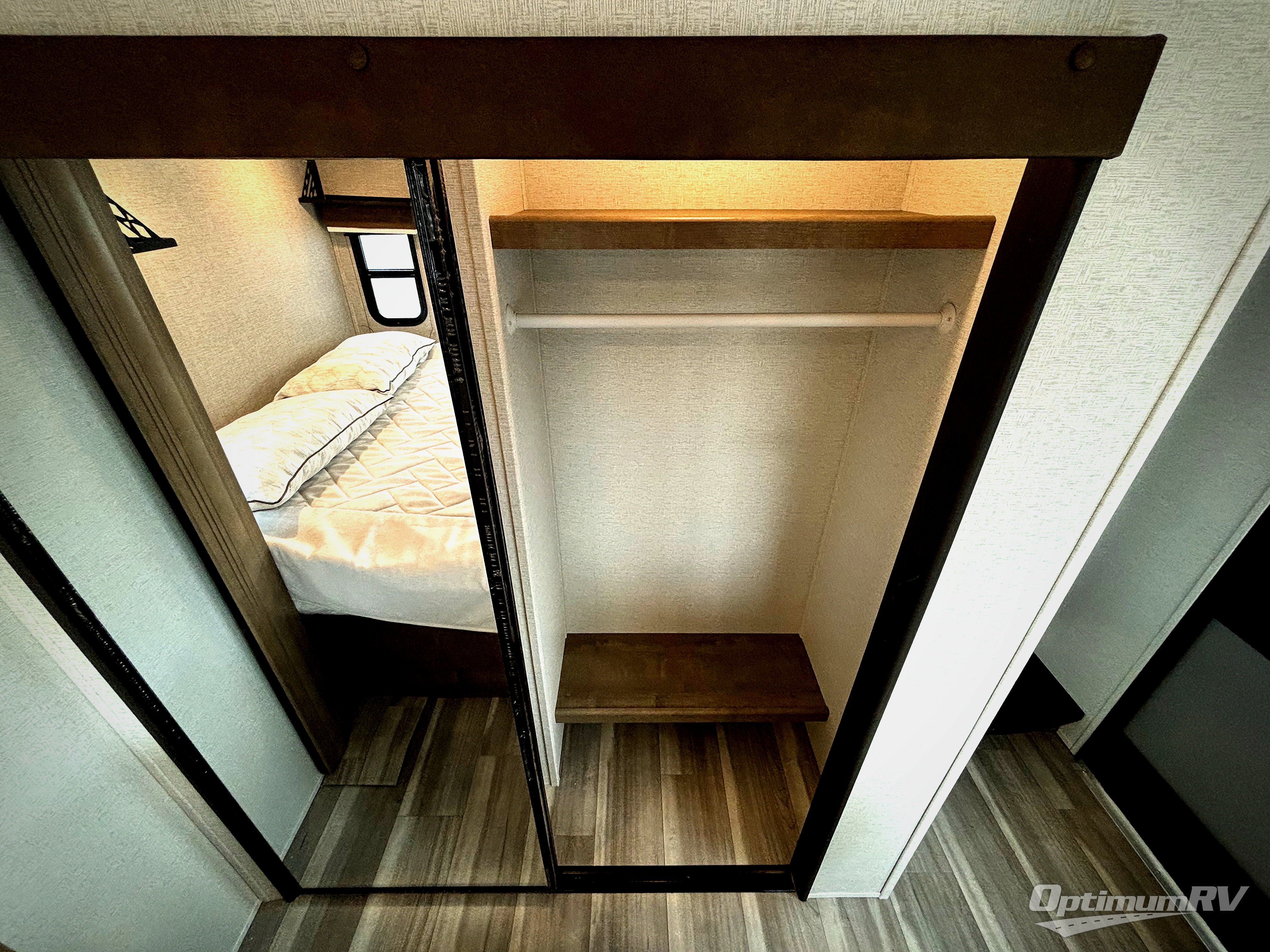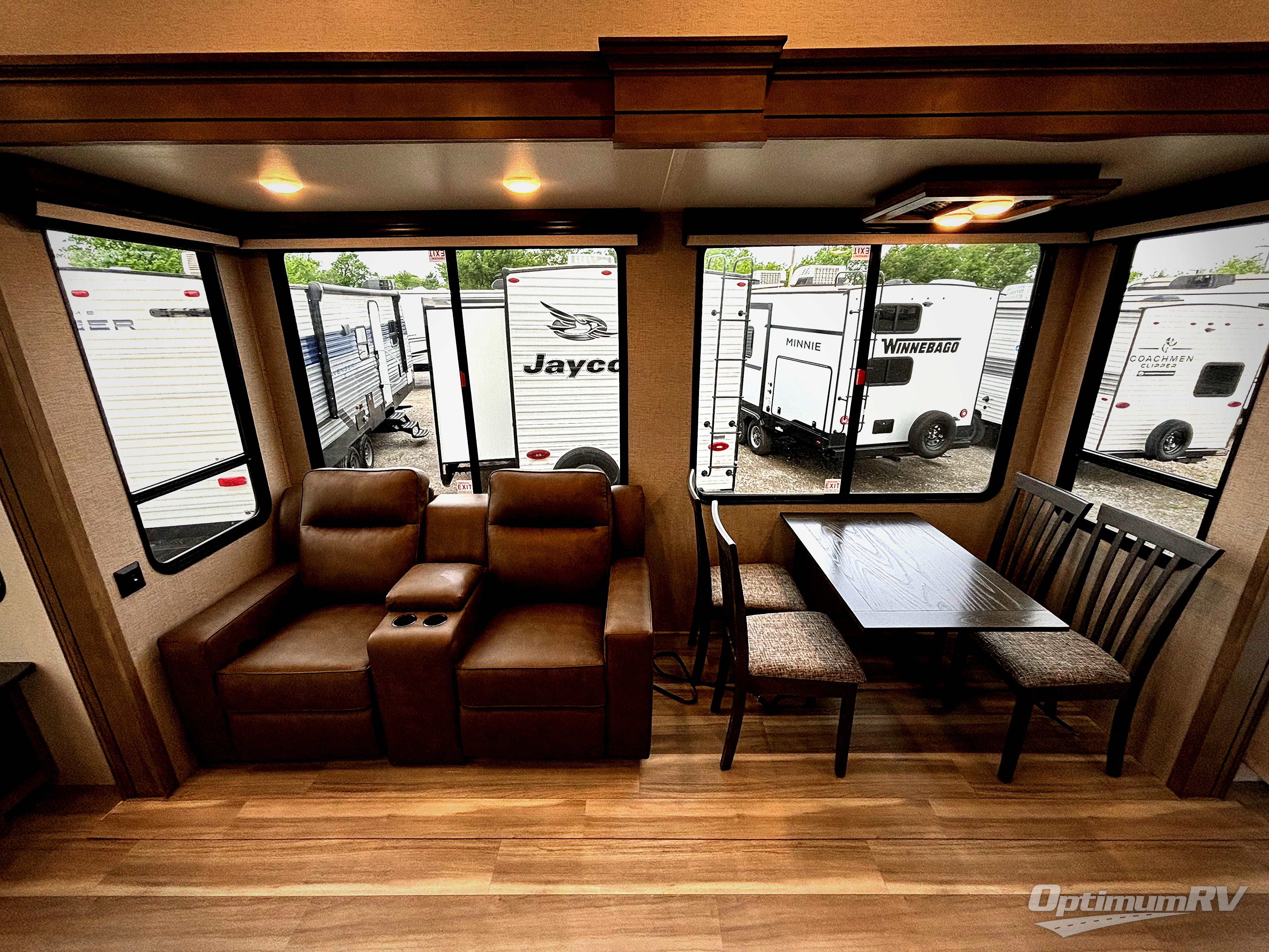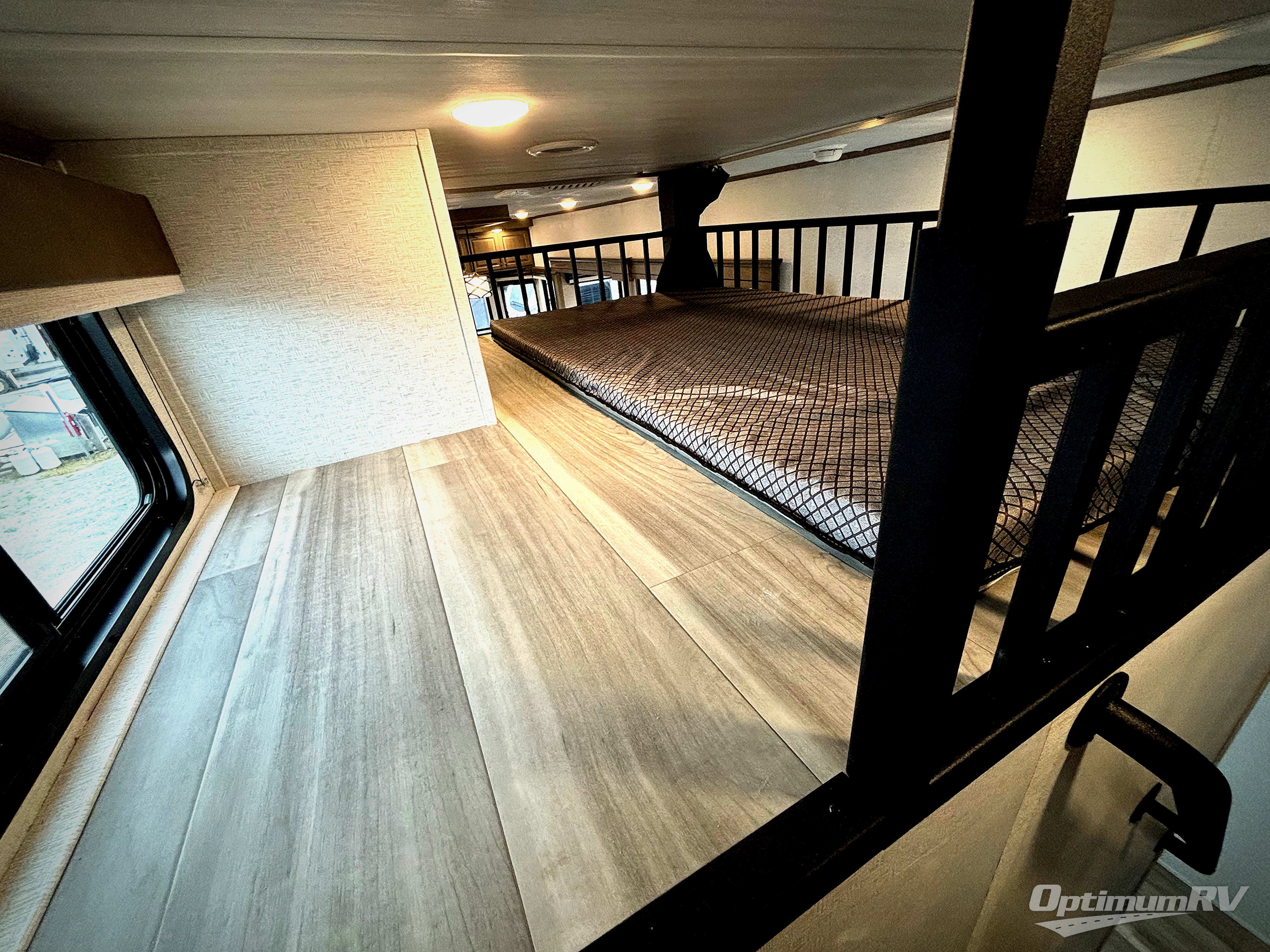 This destination trailer is the ultimate retreat for those who crave luxury and tranquility. The rear loft area is a cozy haven, featuring two plush bunk mats and ample storage for your favorite hobbies and pastimes. The rear bedroom is a serene oasis, complete with king-sized bed, washer and dryer prep, and a spacious closet. The kitchen boasts two spacious pantries, refrigerator, a three-burner cooktop, an entertainment center, kitchen island, and a free-standing dinette. Perfect for whipping up culinary masterpieces or enjoying quiet moments with loved ones. The front living area is designed for relaxation and entertainment, featuring an entertainment center, warm fireplace, pull-out sleeper sofa with convenient tables, and comfortable theater seating. And with two generous awnings - 20' and 11' - you'll enjoy shade and protection in all your activities outside.