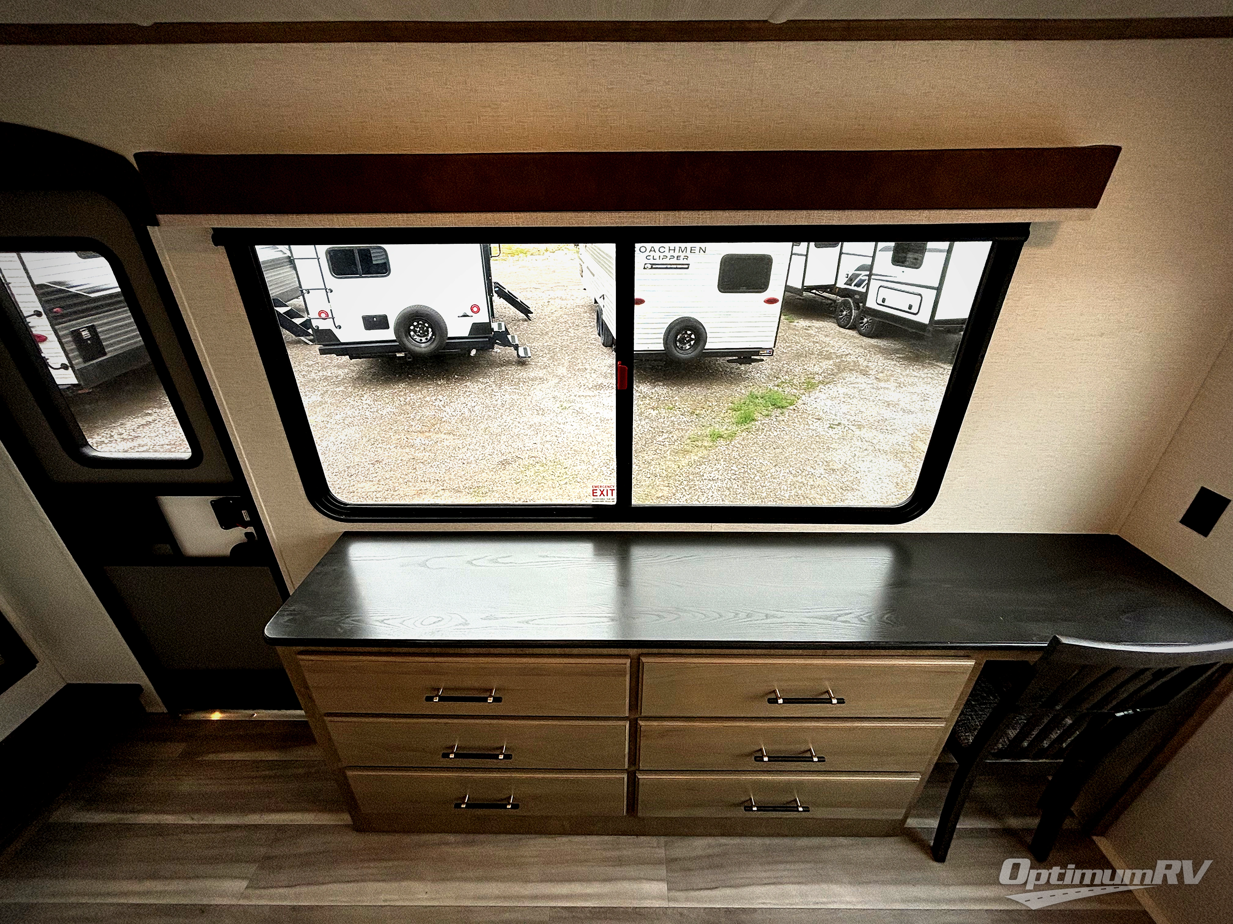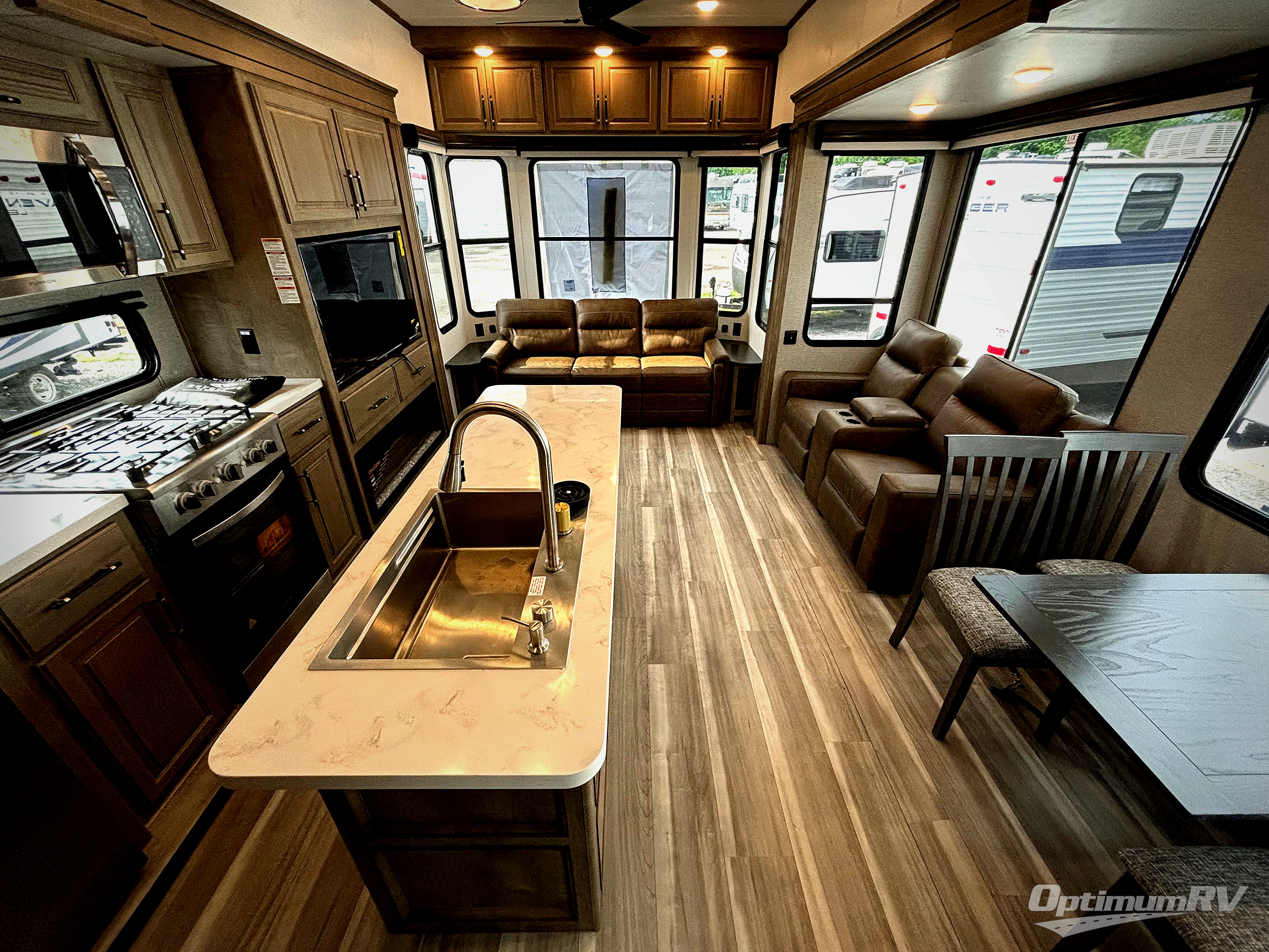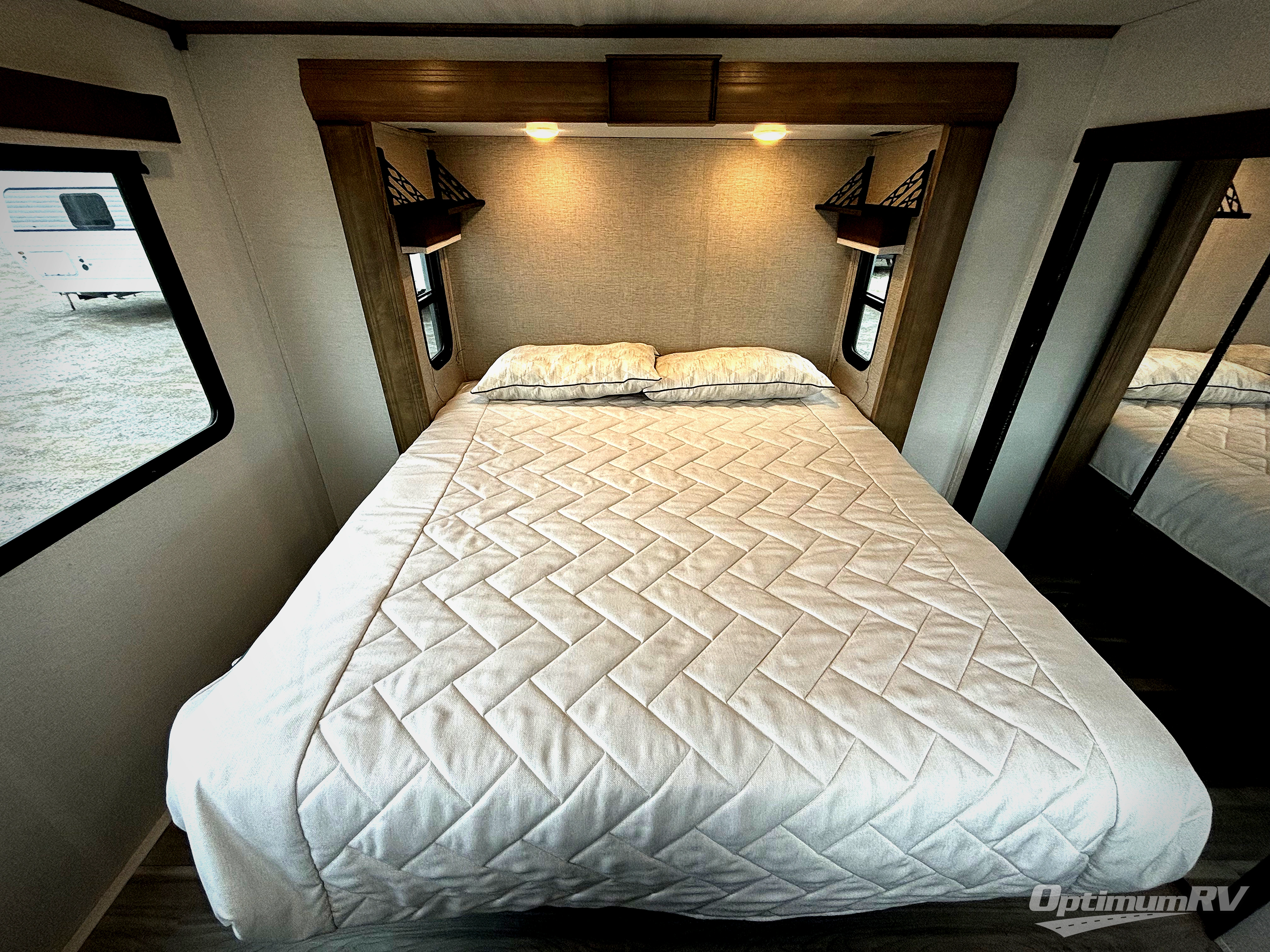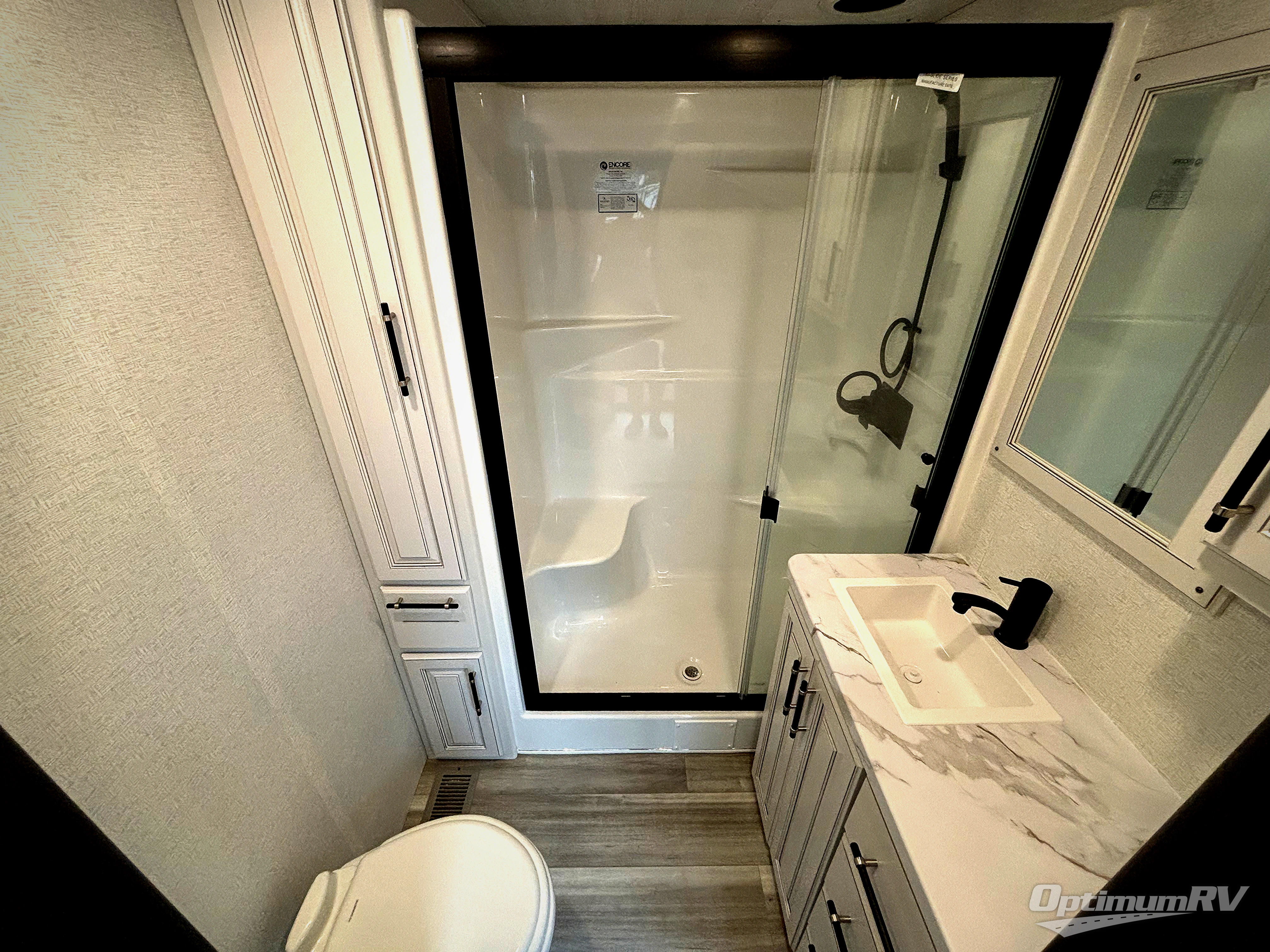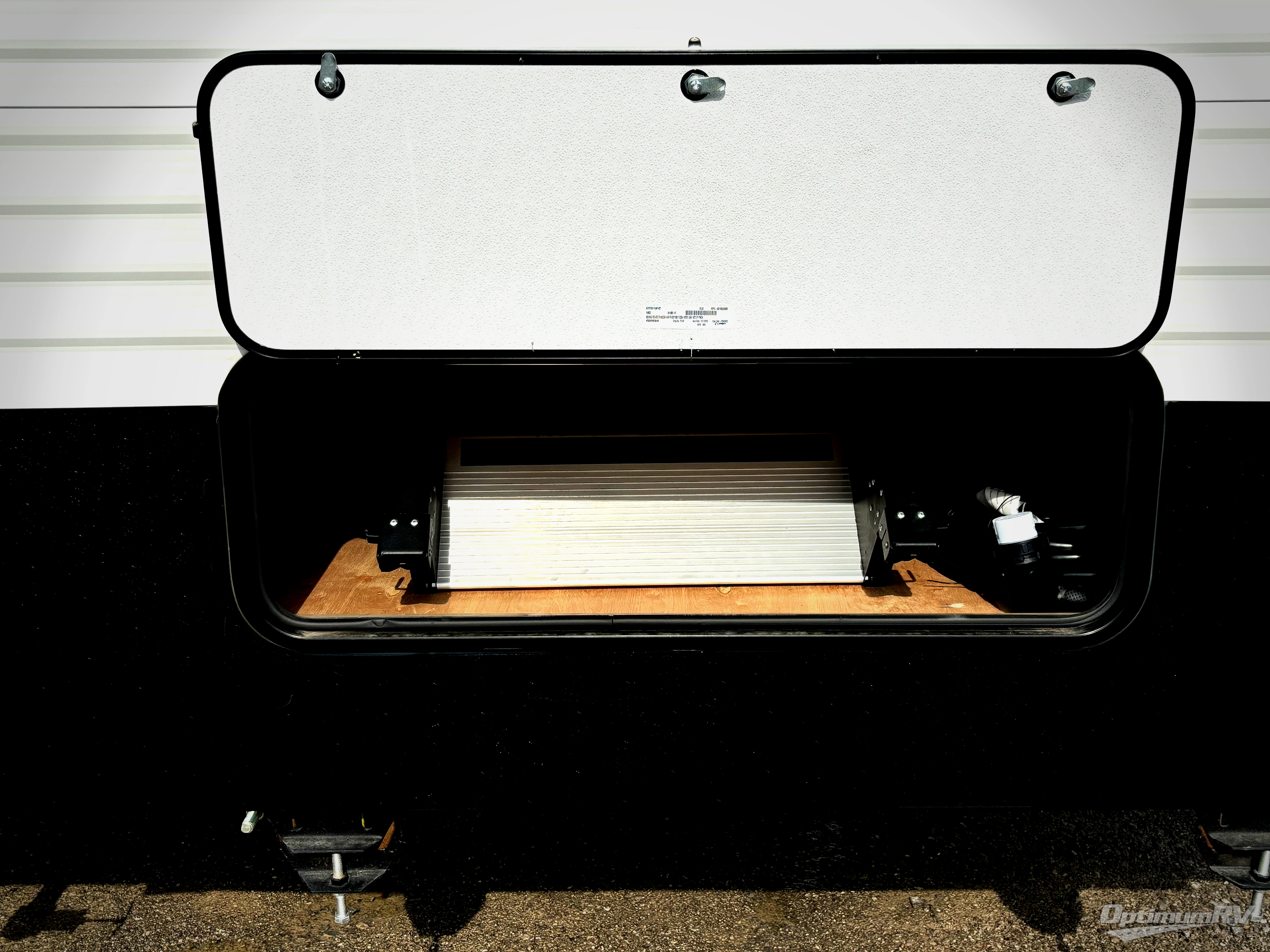 This destination trailer is the ultimate retreat for those who crave luxury and tranquility. The rear loft area is a cozy haven, featuring two plush bunk mats and ample storage for your favorite hobbies and pastimes. The rear bedroom is a serene oasis, complete with king-sized bed, washer and dryer prep, and a spacious closet. The kitchen boasts two spacious pantries, refrigerator, a three-burner cooktop, an entertainment center, kitchen island, and a free-standing dinette. Perfect for whipping up culinary masterpieces or enjoying quiet moments with loved ones. The front living area is designed for relaxation and entertainment, featuring an entertainment center, warm fireplace, pull-out sleeper sofa with convenient tables, and comfortable theater seating. And with two generous awnings - 20' and 11' - you'll enjoy shade and protection in all your activities outside.