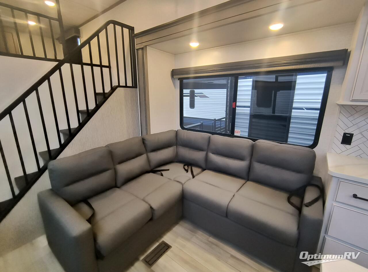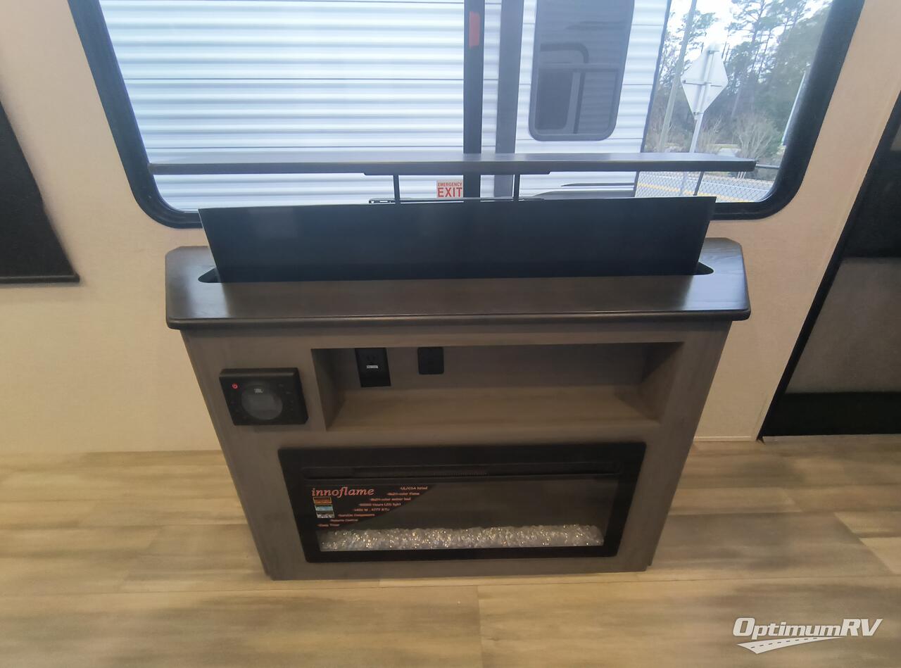 This destination trailer is so accommodating, you may just want to camp all year long! The owners will have the front bedroom all to themselves with a king bed slide out, dresser, and master closet so everything has a place. Above this room is the front loft with stairs that includes three 39" x 74" beds/sleeping spaces and storage shelves, making it perfect for little ones! The spacious full rear bath includes dual bath sinks, a large 48" x 30" shower with a seat, and a closet with washer/dryer prep if you want to add these appliances. And just outside the bath, you'll find the second set of stairs that leads to the rear loft with a 54" x 81" bed, an entertainment center, and storage shelves for your guests. During the day, everyone can meet in the combined living area and kitchen that features a large slide for more space, a sectional sofa, a kitchen island with four barstools, plus an entertainment center with a fireplace!