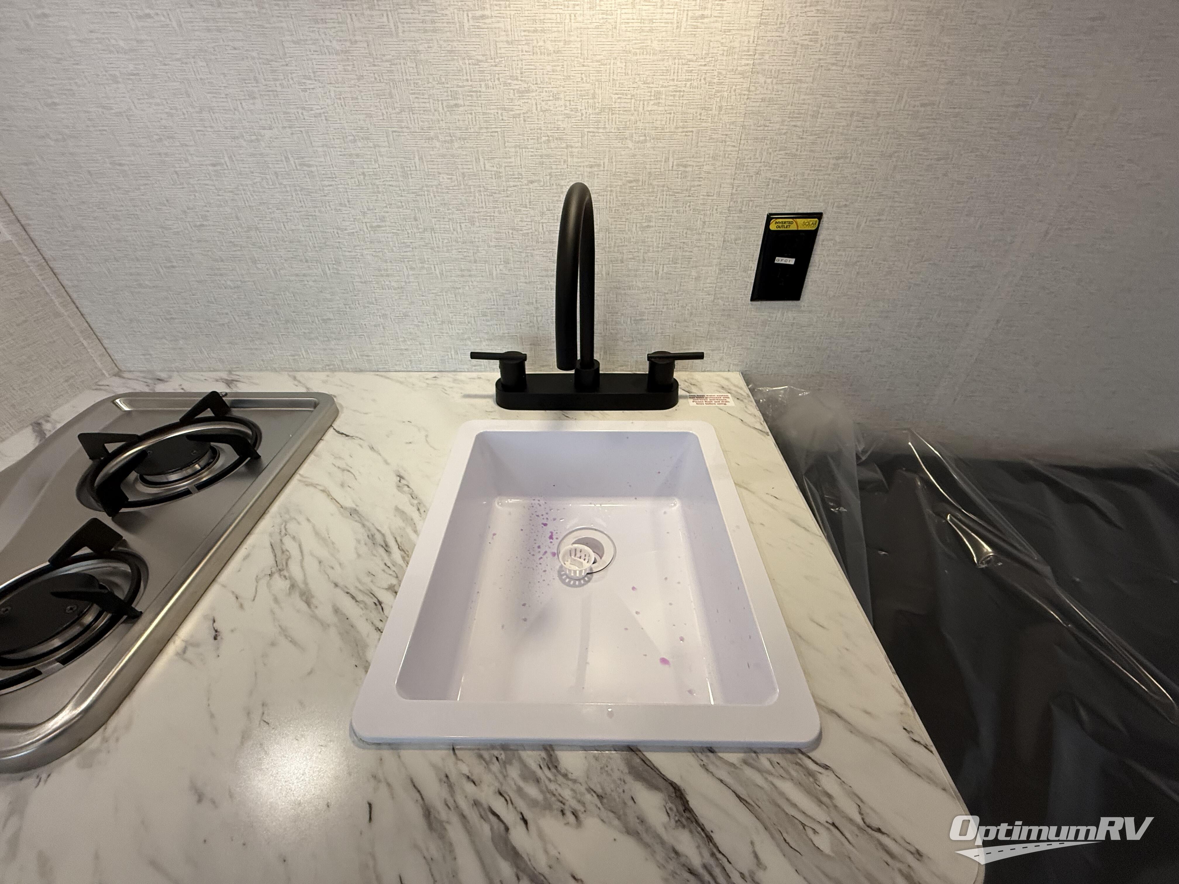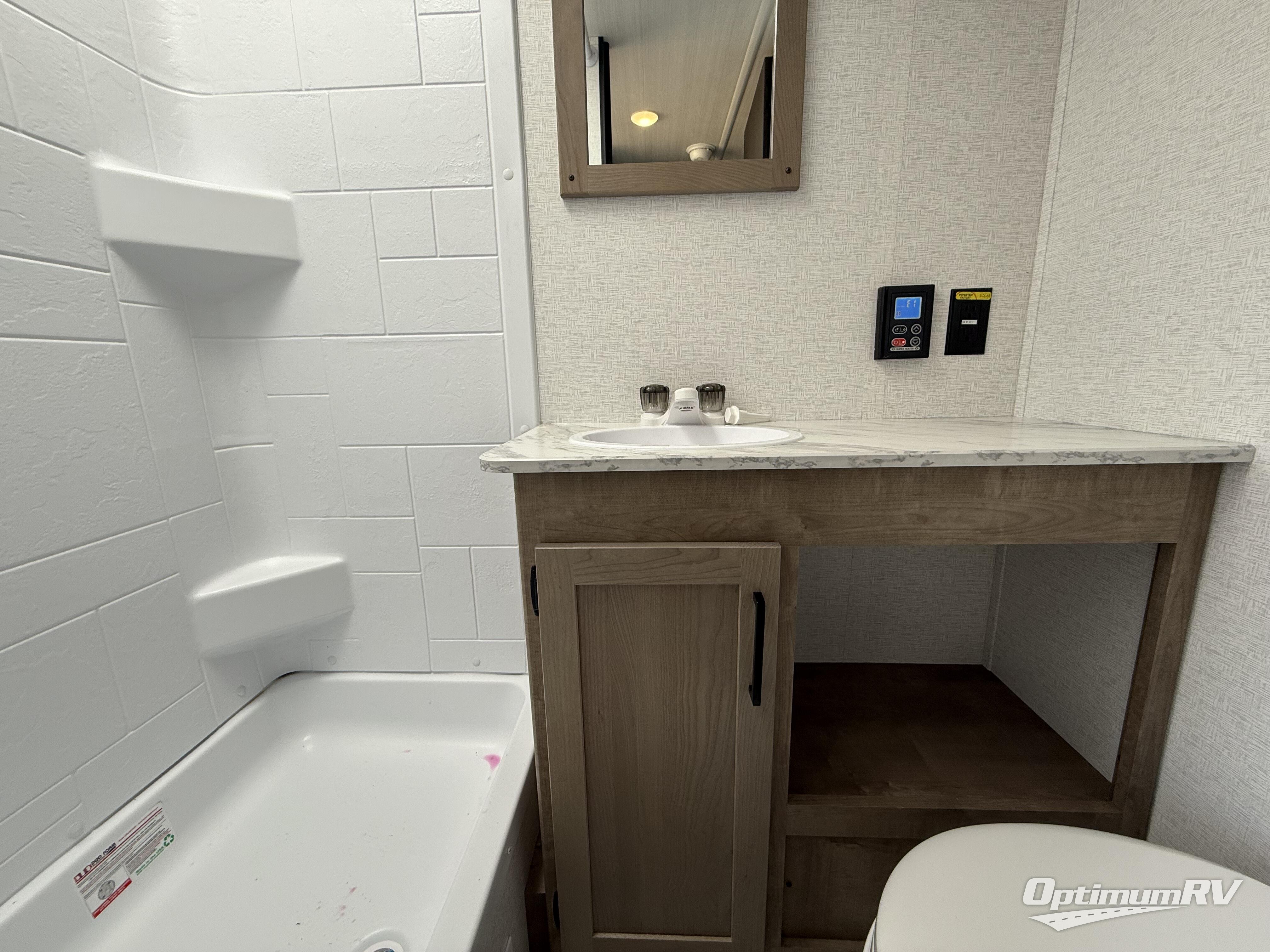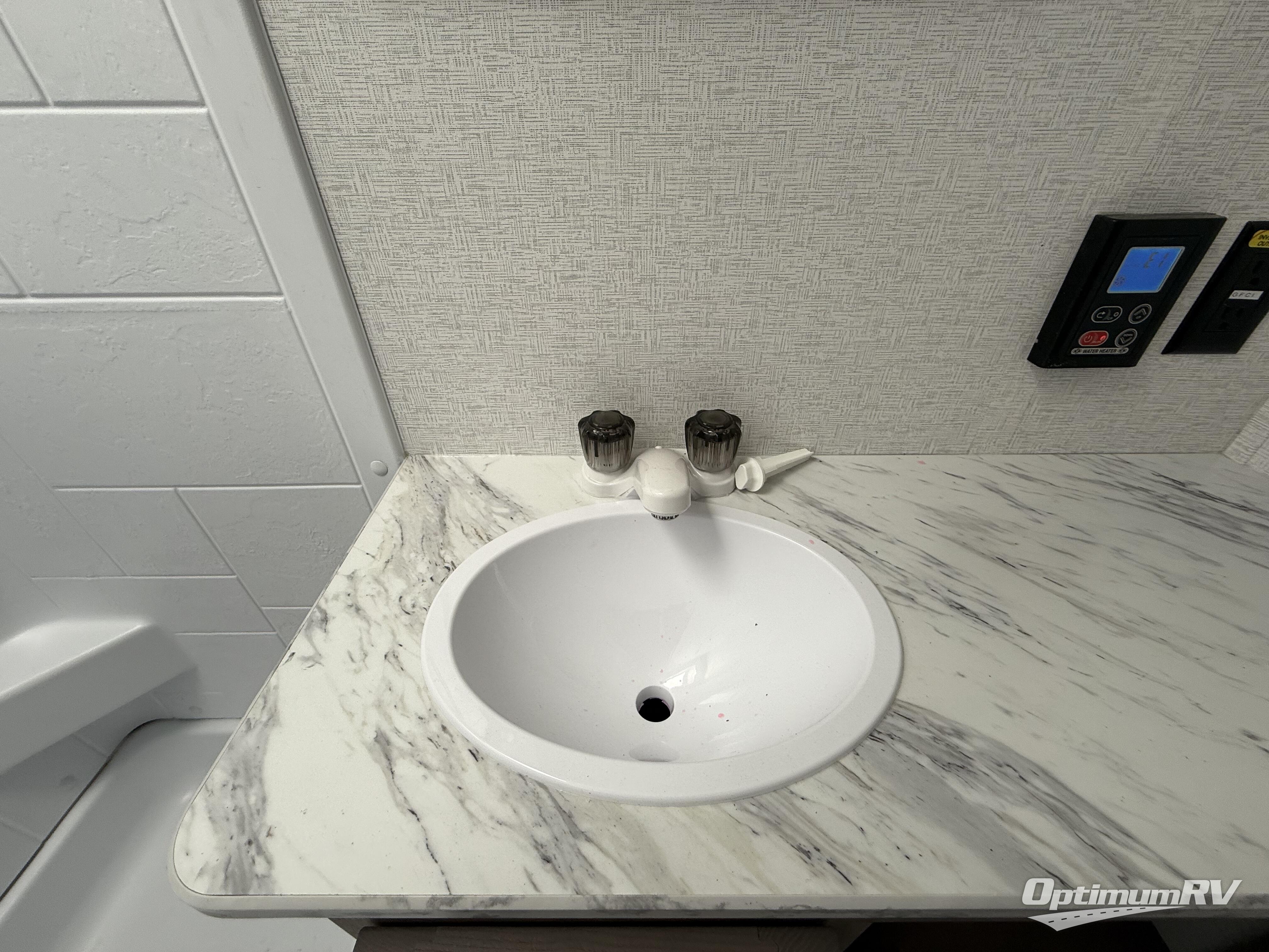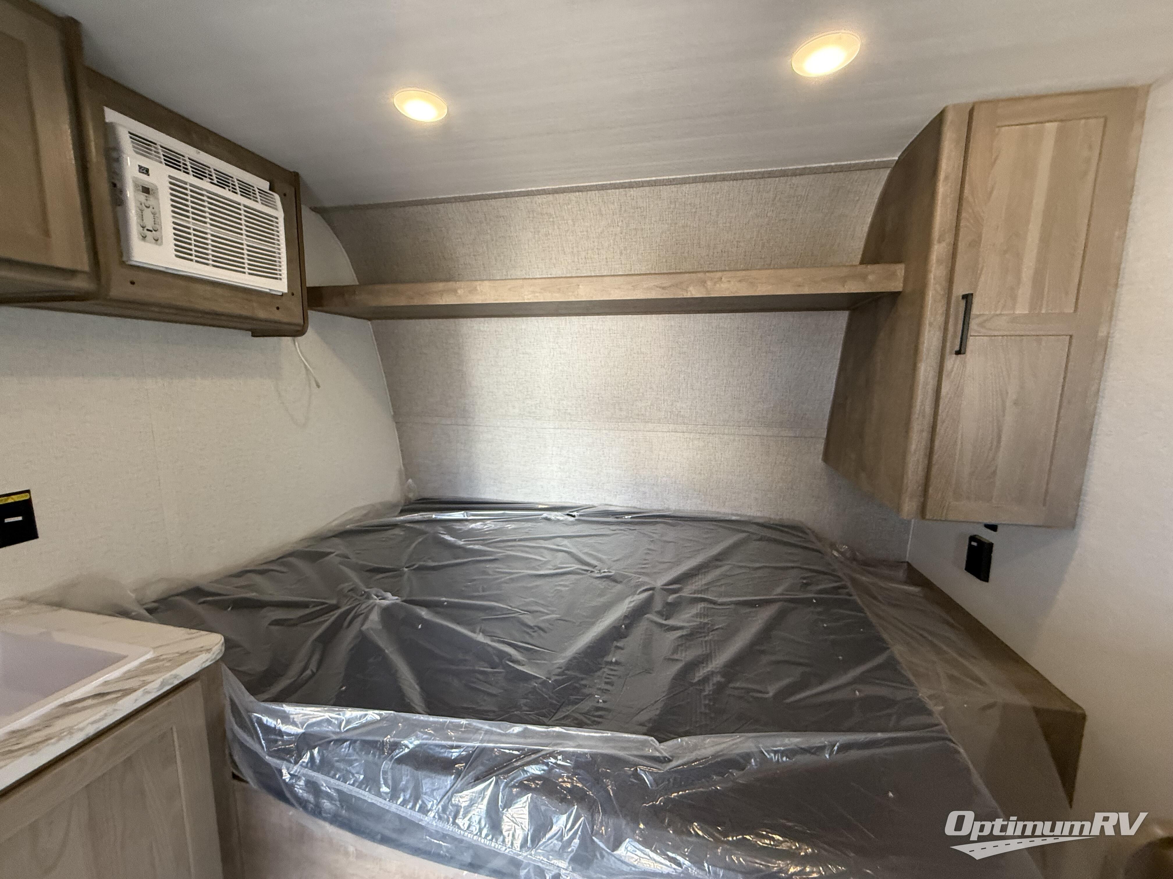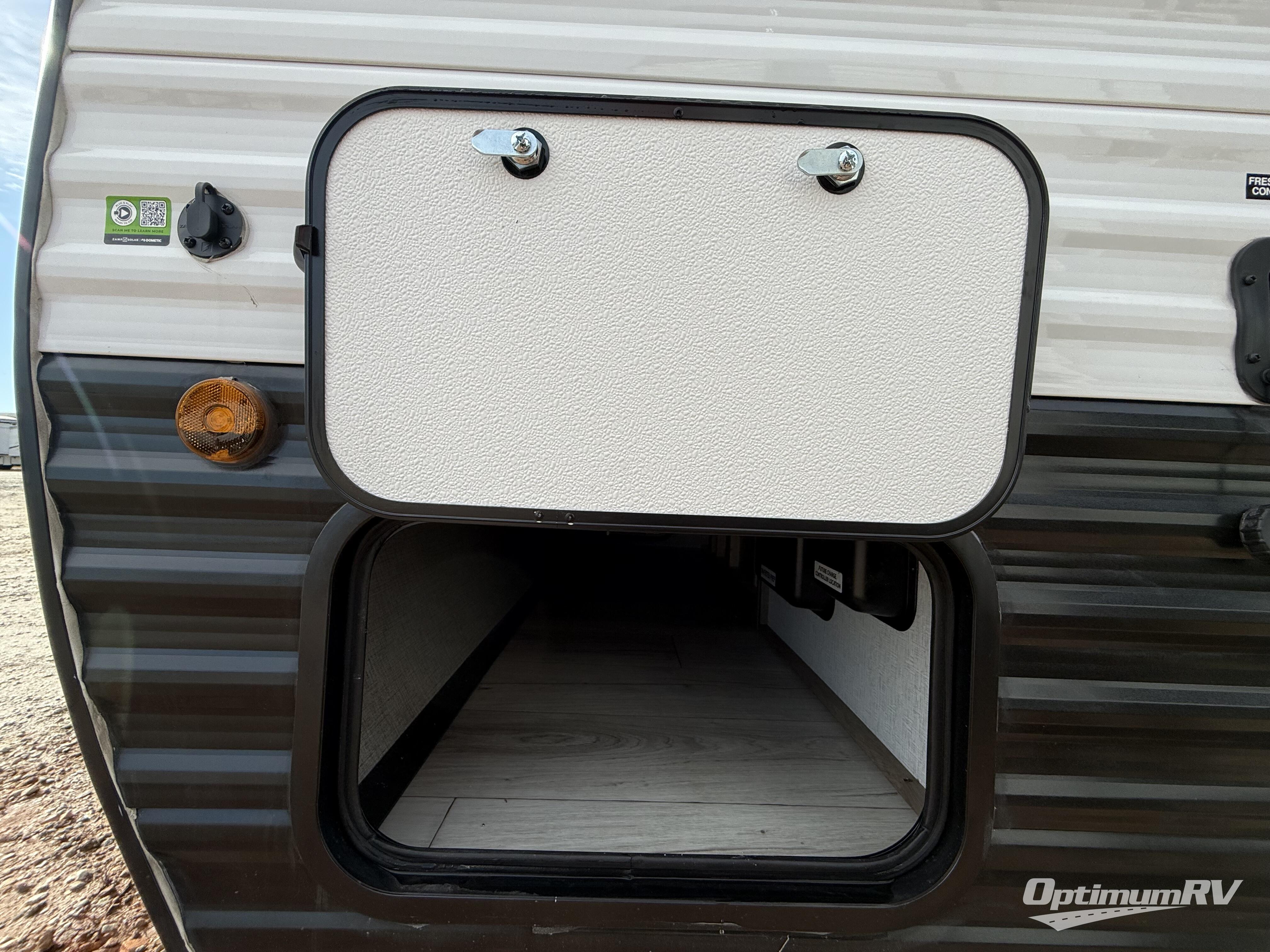 This is the perfect easy-to-tow travel trailer for three campers! The front queen bed includes a shelf above for books plus a closet and nightstand at the foot of the bed for even more storage. You can make meals each day on the two burner gas cooktop and store food in the 3.3 cu. ft. 12V refrigerator. A full bath onboard means you won't have to use the camp's facilities, and the exterior pass-thru storage will be perfect for hiking gear, camp chairs, and more!