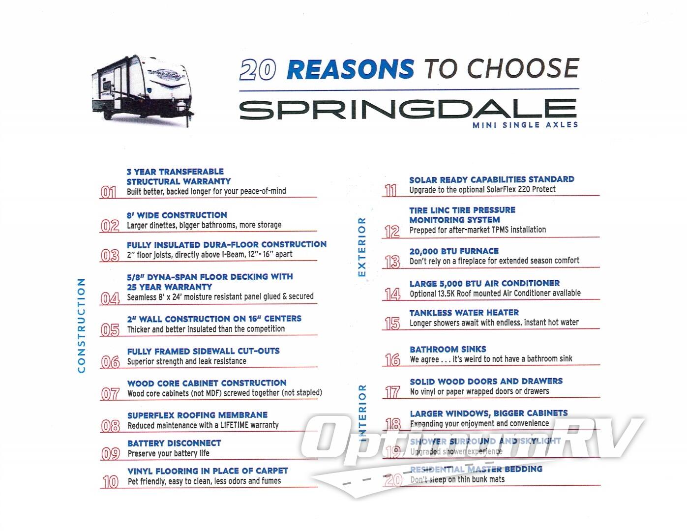 With any Springdale Classic Mini travel trailer by Keystone, you will enjoy lightweight towing thanks to their single-axle! You'll find the XL entry assist handle will make entering and exiting your unit easier than ever, and the power awning will provide protection from the sun as you relax in your camp chairs outside. Each model includes blackout night shades, solid wood cabinet doors and drawers, a shower skylight for more standing room, plus many more interior comforts. There is also a 5,000 BTU sidewall A/C and 20K BTU furnace to keep you comfortable, plus a Girard tankless water heater for endless hot showers!