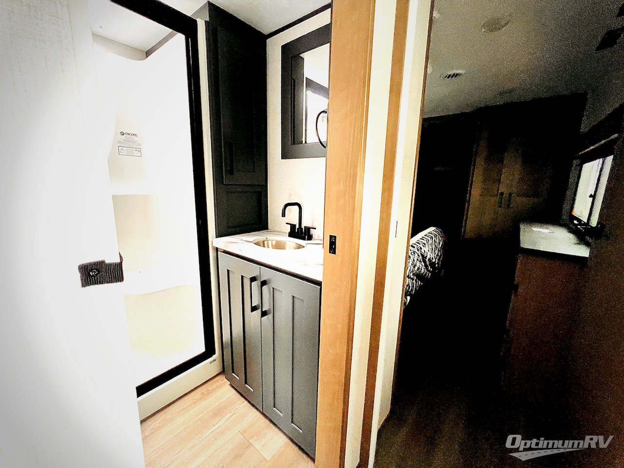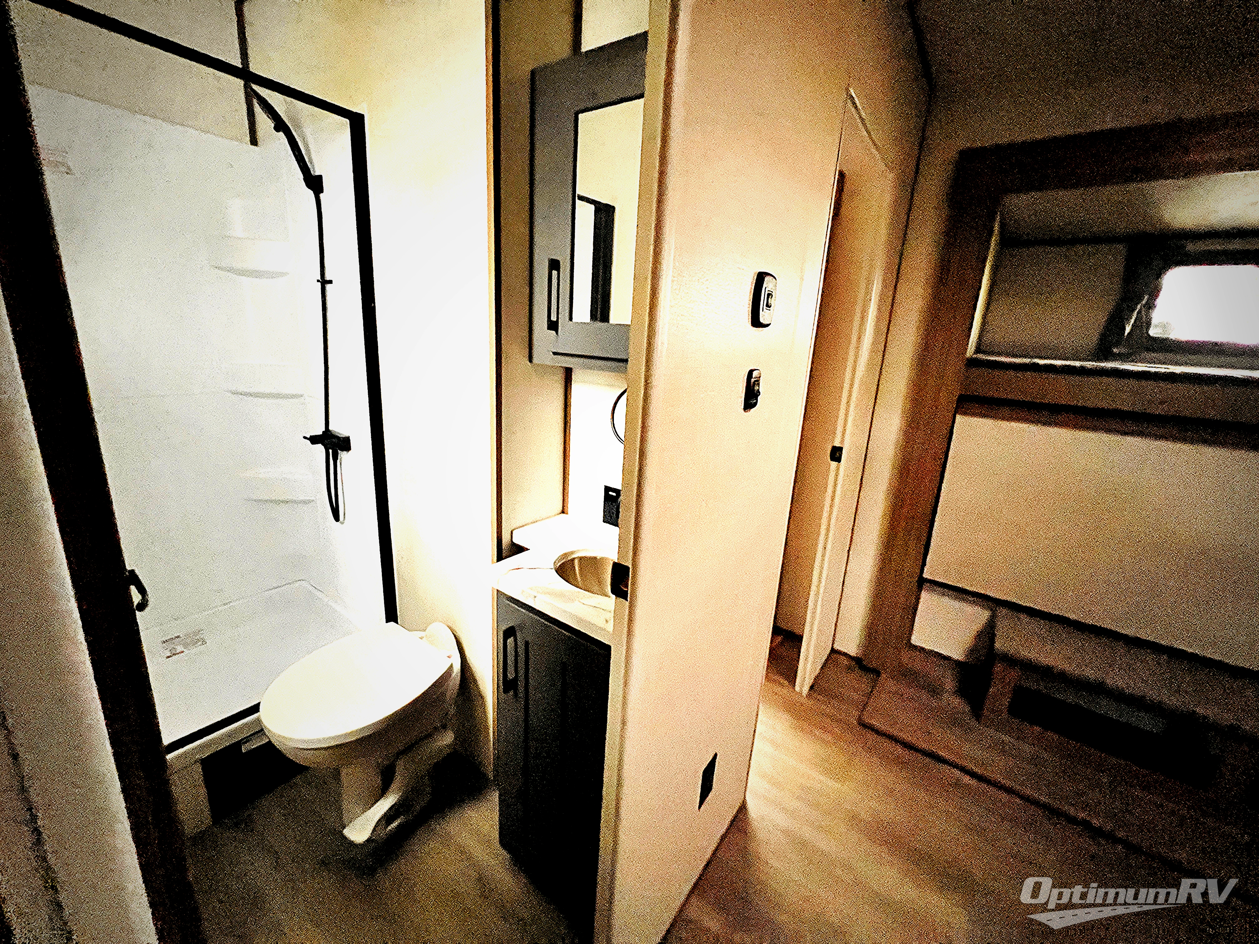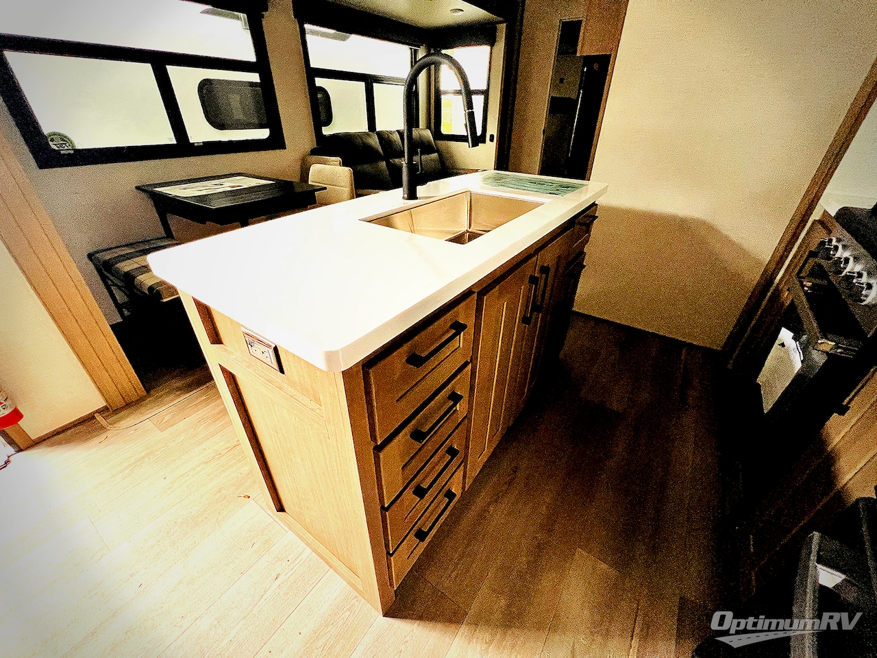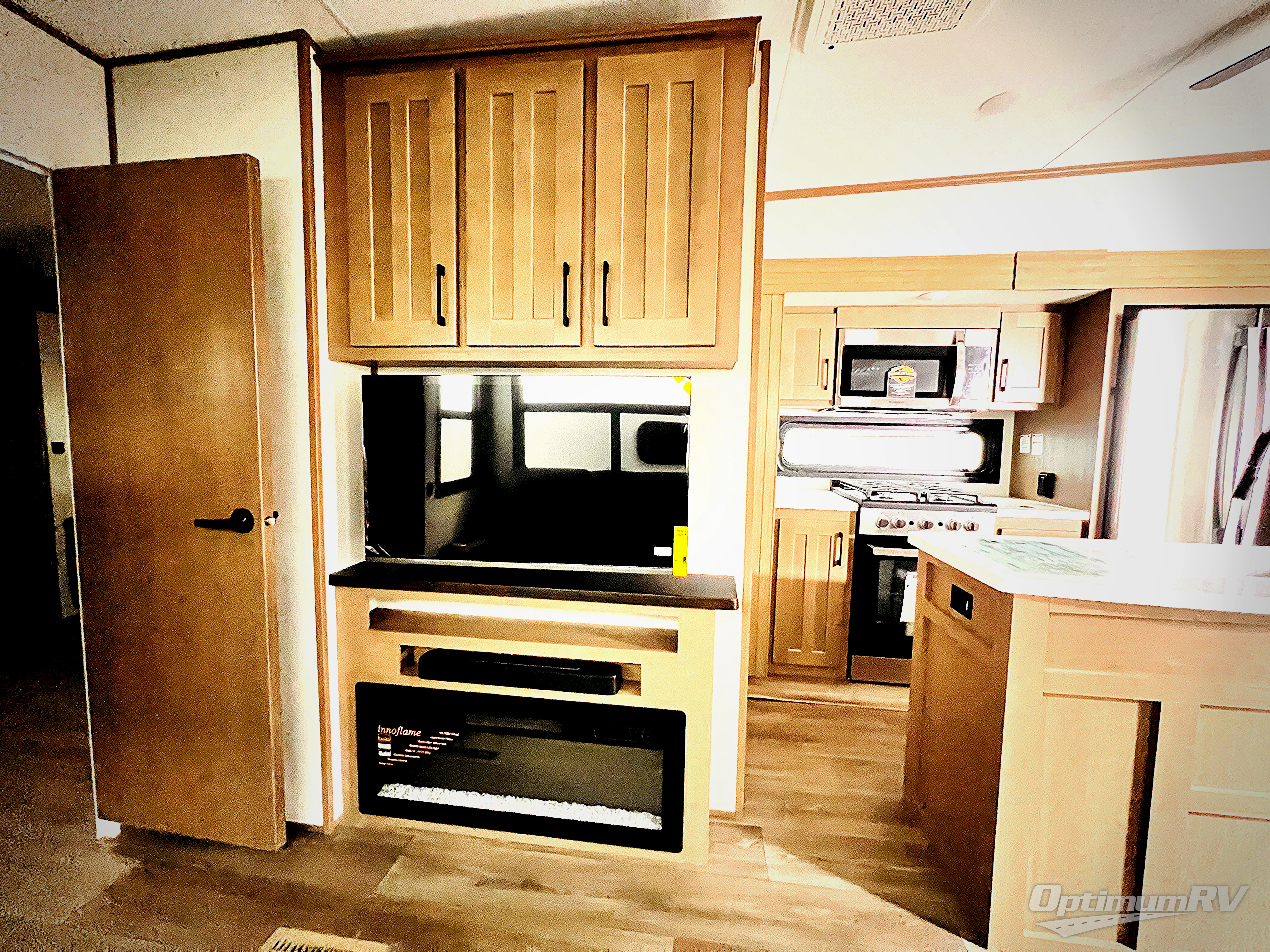 All of your friends and family can camp together in this fifth wheel! It features a rear private bunkhouse with a bunk above a hide-a-bed sofa, a full bathroom with a 30" x 36" shower, and an entertainment center with wardrobes on either side. There is also a folding bunk and a bunk over the outside kitchen. Across from the hide-a-bed sofa is an entertainment center with a 40" fireplace and a 43" smart TV to watch your favorite movies at night. The kitchen island comes with two bar stools and you can prepare your best meals with the four burner range with a 24" oven. The second bathroom has a 48" x 30" residential shower with a seat and a linen closet to keep your towel close. Enjoy a good night's rest on the king bed slide in the front private bedroom which also has a dresser with a built-in hamper and a front wardrobe with washer and dryer prep!