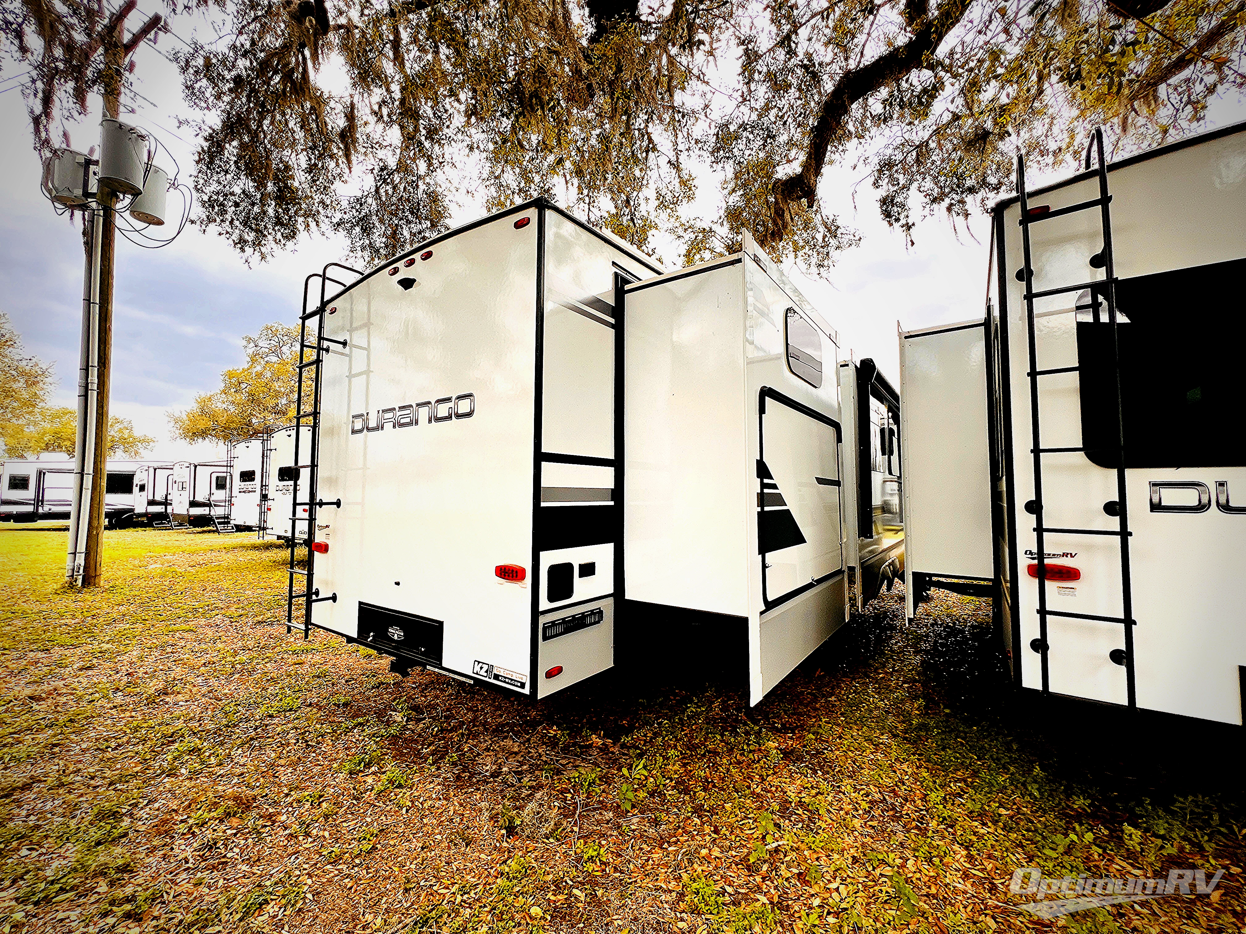 Enjoy full time living, an affordable price, and a wide body construction for more living space with every one of these KZ Durango light high-profile fifth wheels! These luxury units can be used all year round with the all-weather insulation package, the 3" x 14" foam-core in-floor straight-line heating system with a 35,000 BTU furnace, and the 15,000 BTU ducted roof A/C which optimizes the airflow by an average of 40% for better performance, cooling time, and reduction of noise. A few other construction features you will appreciate include a one piece, seamless walk-on Tufflex roofing material, Pex® in-floor heated waterlines, a Lamilux® gelcoat fiberglass exterior, and Dexter® axles with self adjusting brakes and height adjusting hangers. You can even venture off the beaten path with the now standard Off-The-Grid Solar Package that comes with two 220W solar panels. Inside, modern farmhouse cabinetry, a king size bed, and smart TVs will have you feeling like you never left home!