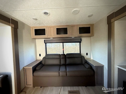 Wow! Check out the space you will have in this travel trailer with dual opposing slides in the rear living area, plus a slide out queen bed in the bedroom! The kitchen island will provide more counter space, along with the hutch/pantry that includes a microwave above. Your crew can relax on the theater seating, booth dinette, or 70" sofa after dinner is cleaned up, plus you have a 30" fireplace for a more at-home feel. This model also includes a 12' power awning so relax under during day!