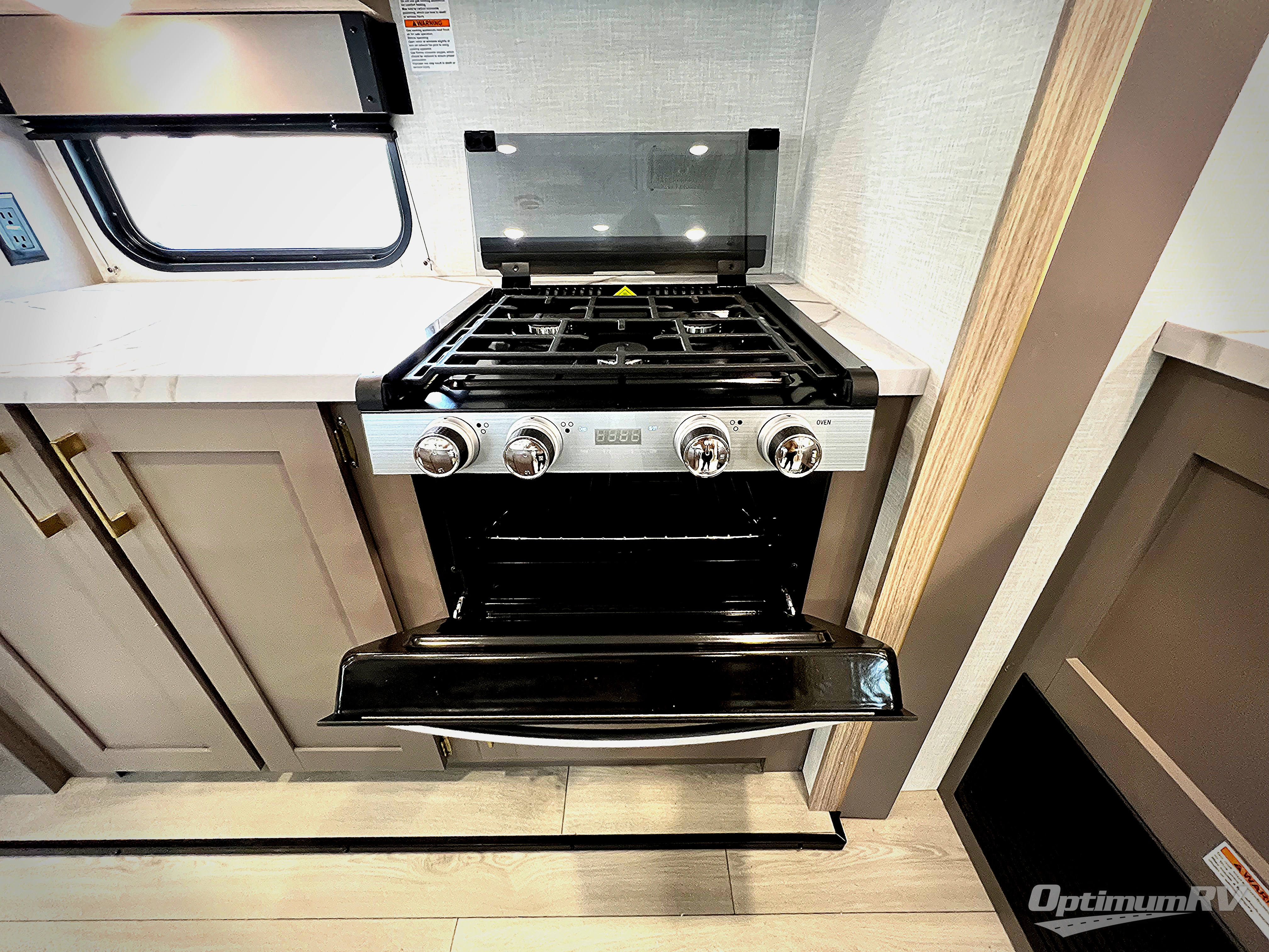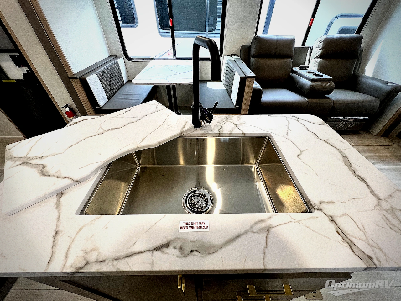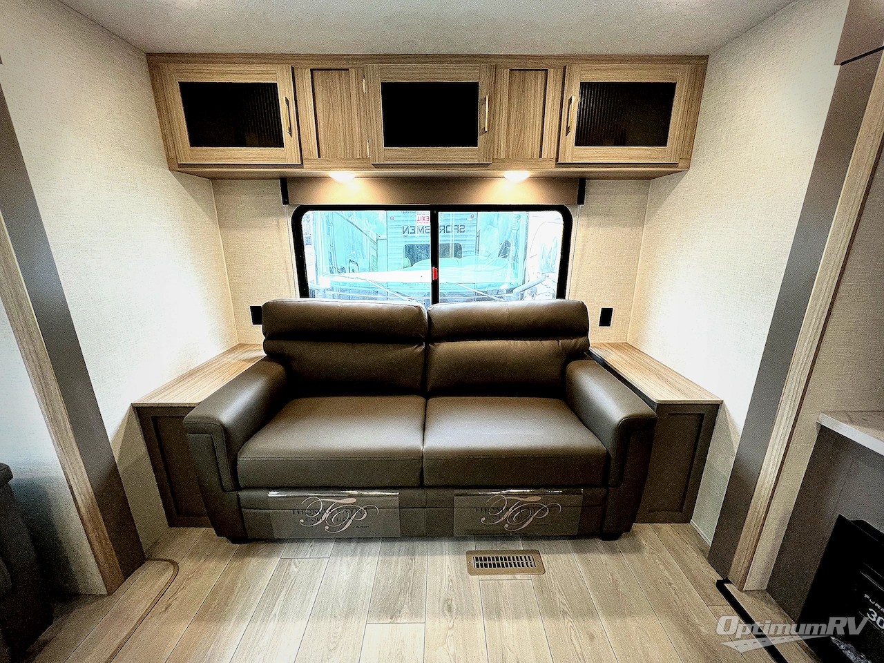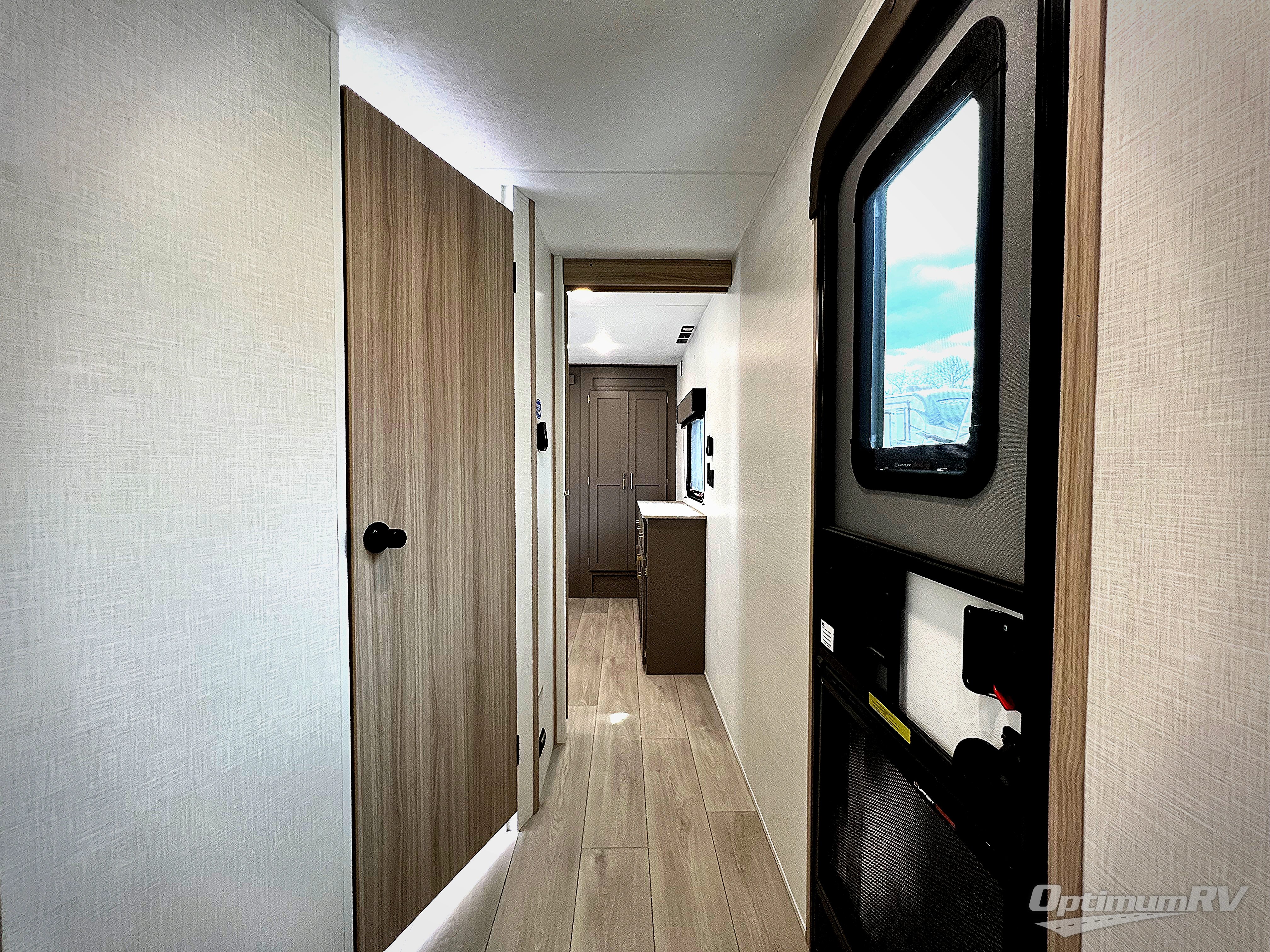 Wow! Check out the space you will have in this travel trailer with dual opposing slides in the rear living area, plus a slide out queen bed in the bedroom! The kitchen island will provide more counter space, along with the hutch/pantry that includes a microwave above. Your crew can relax on the theater seating, booth dinette, or 70" sofa after dinner is cleaned up, plus you have a 30" fireplace for a more at-home feel. This model also includes a 12' power awning so relax under during day!