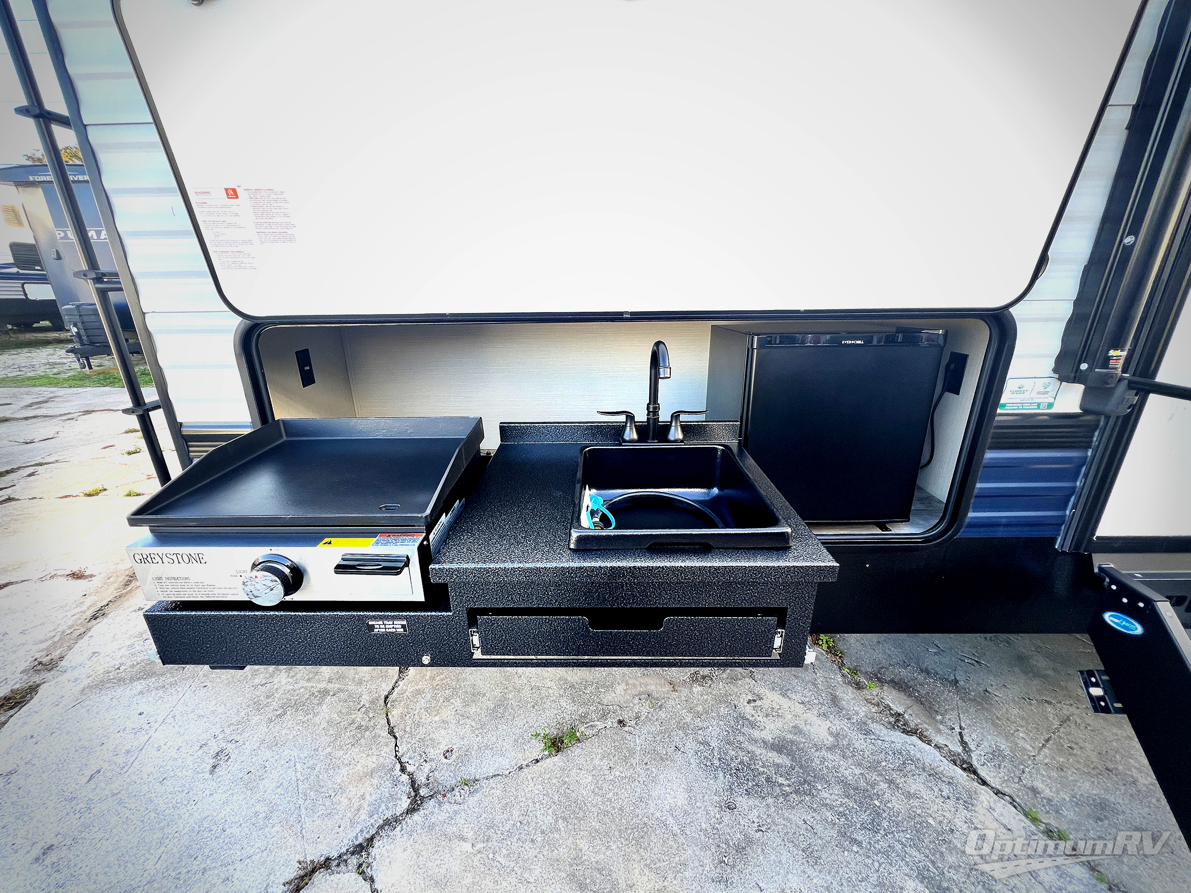 There's a comfortable place to sleep for the whole family in this travel trailer! The rear private bunkhouse has a set of 28" x 76" bunk beds, a 28" x 65" bunk above a sofa, and a wardrobe with an entertainment center above it so they can bring a cousin or two to join in on the fun. You will have your own privacy with the front private bedroom which has a queen bed with shirt closets on either side of it. The spacious full bathroom has a 34" x 34" radius shower for everyone to freshen up and one of the entrances leads directly outside so you can get back to having fun fast. Prepare your best home cooked meals indoors with the walk-in pantry, the three burner cooktop, and the 12V refrigerator. Plus, there is a U-shaped dinette to enjoy your meals and even transform into an extra sleeping space! Choose the optional mini outside kitchen for even more convenience!