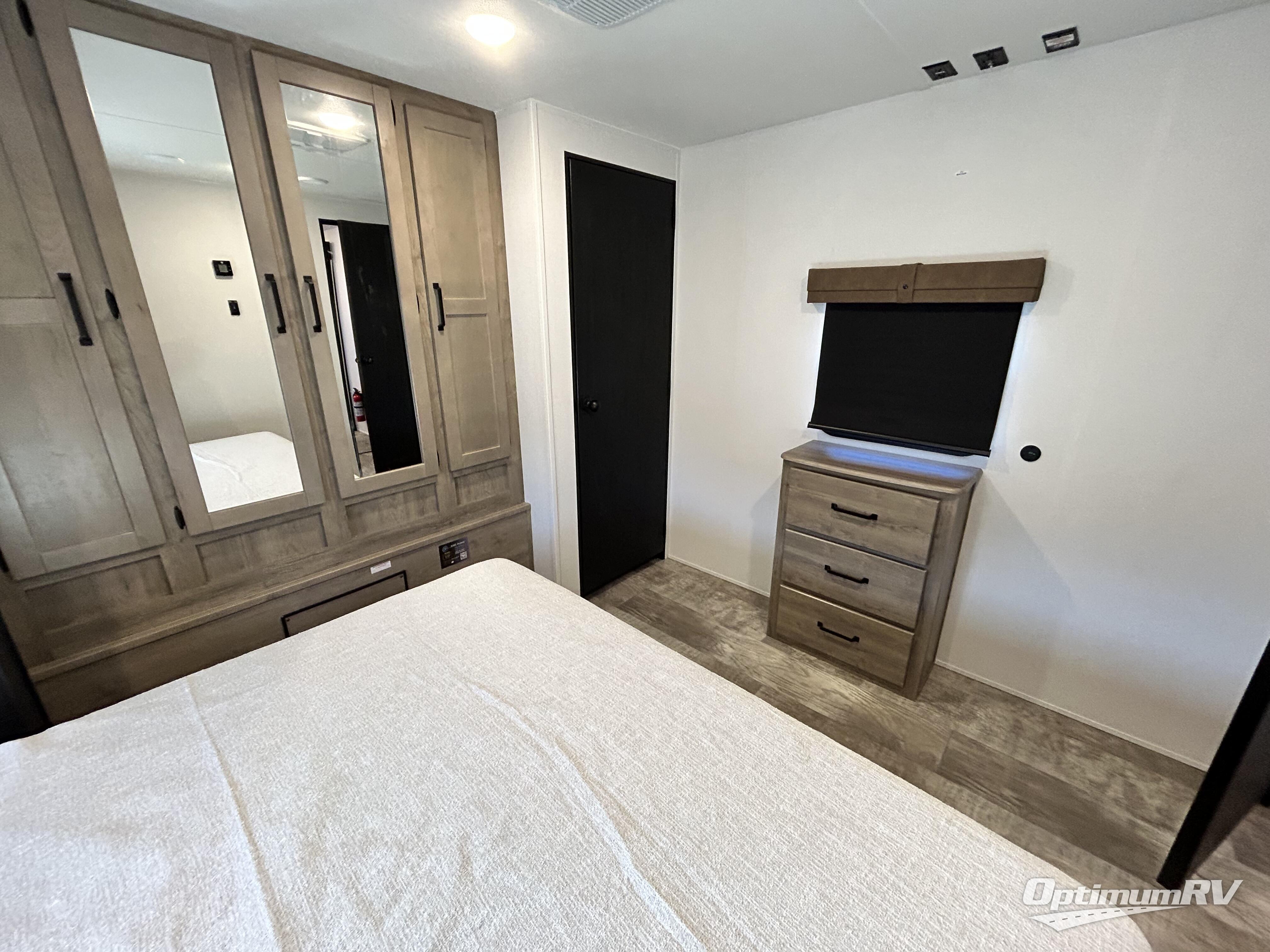 You're going to feel right at home in this travel trailer! The front private bedroom has a queen bed slide for a good night's rest, a dresser and front closet for your clothes, and another closet with washer and dryer prep. Freshen up each morning in the full bathroom with the 32" x 40" shower with a seat and then head to the kitchen to fry up some eggs on the stainless steel oven and range. You will also appreciate having a kitchen island for easier meal prep and a walk-in pantry to easily see your canned goods and snacks. The booth dinette offers a comfortable place to dine, play, and even sleep once converted. What better way to wind down your nights than to relax on either the rear sofa or in one of the two recliners across from the entertainment center with a fireplace!