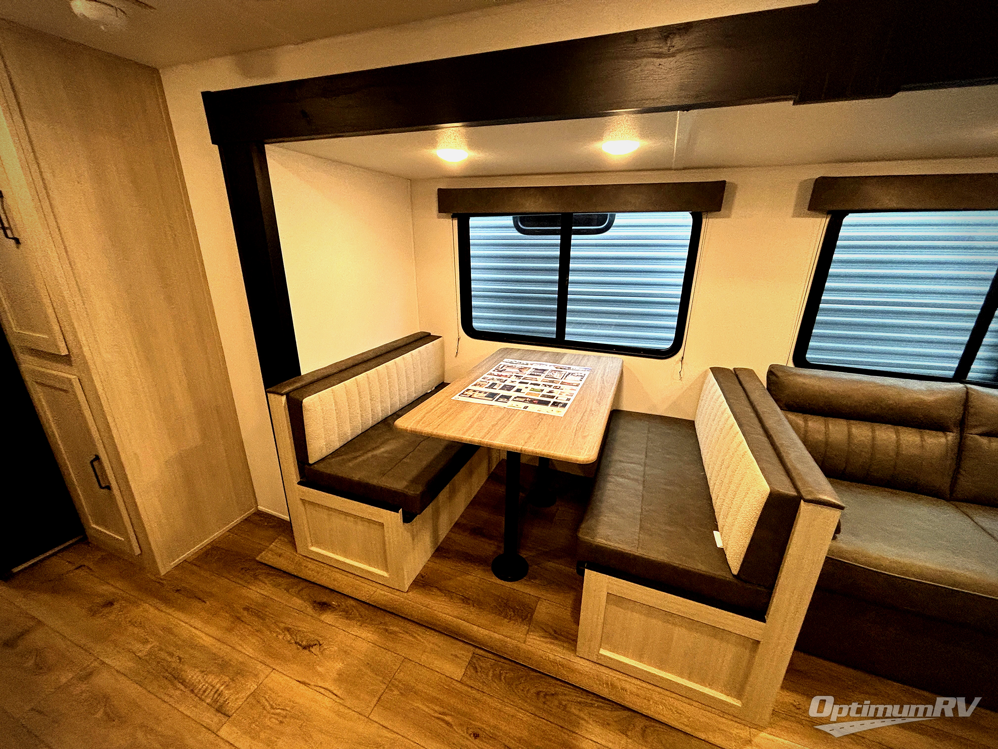 If you're looking for more space, this double axle unit features a large slide so you can walk about freely. Here, you'll find the booth dinette and sofa, which sit across from the optional TV if you want to enjoy movie nights. The full kitchen includes a stainless microwave and three burner cooktop to make meals, plus a pantry and 12V refrigerator for food storage. And an optional outside kitchen with a griddle can be added if you enjoy cooking outdoors! Your guests or littles are sure to enjoy the rear private bunkhouse with four bunk beds and a wardrobe for their things!