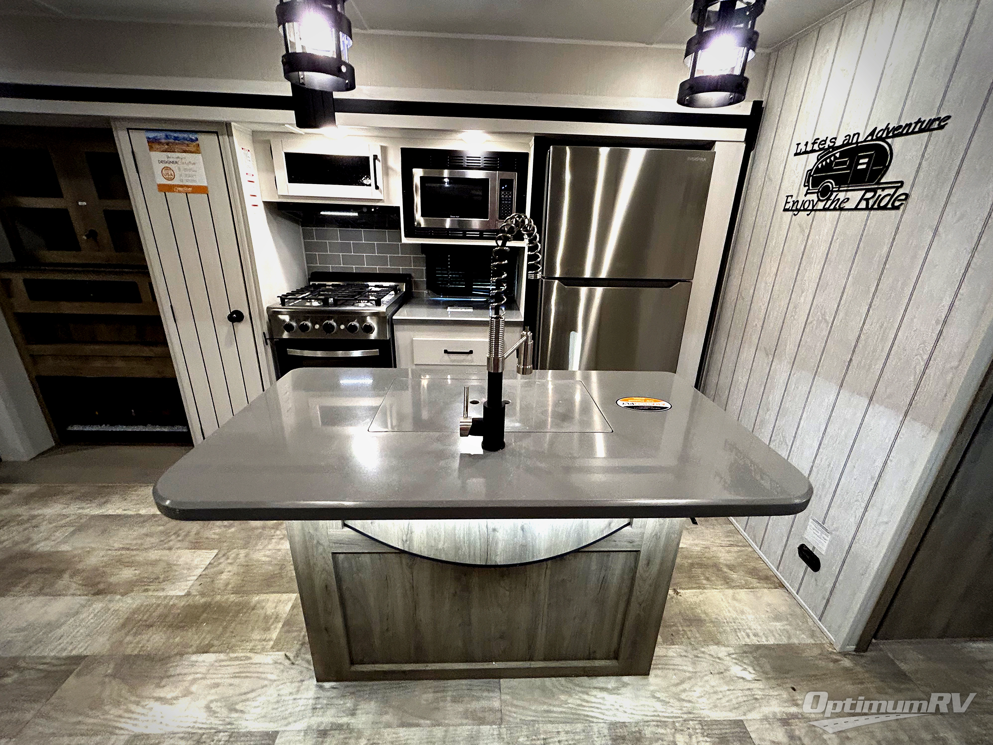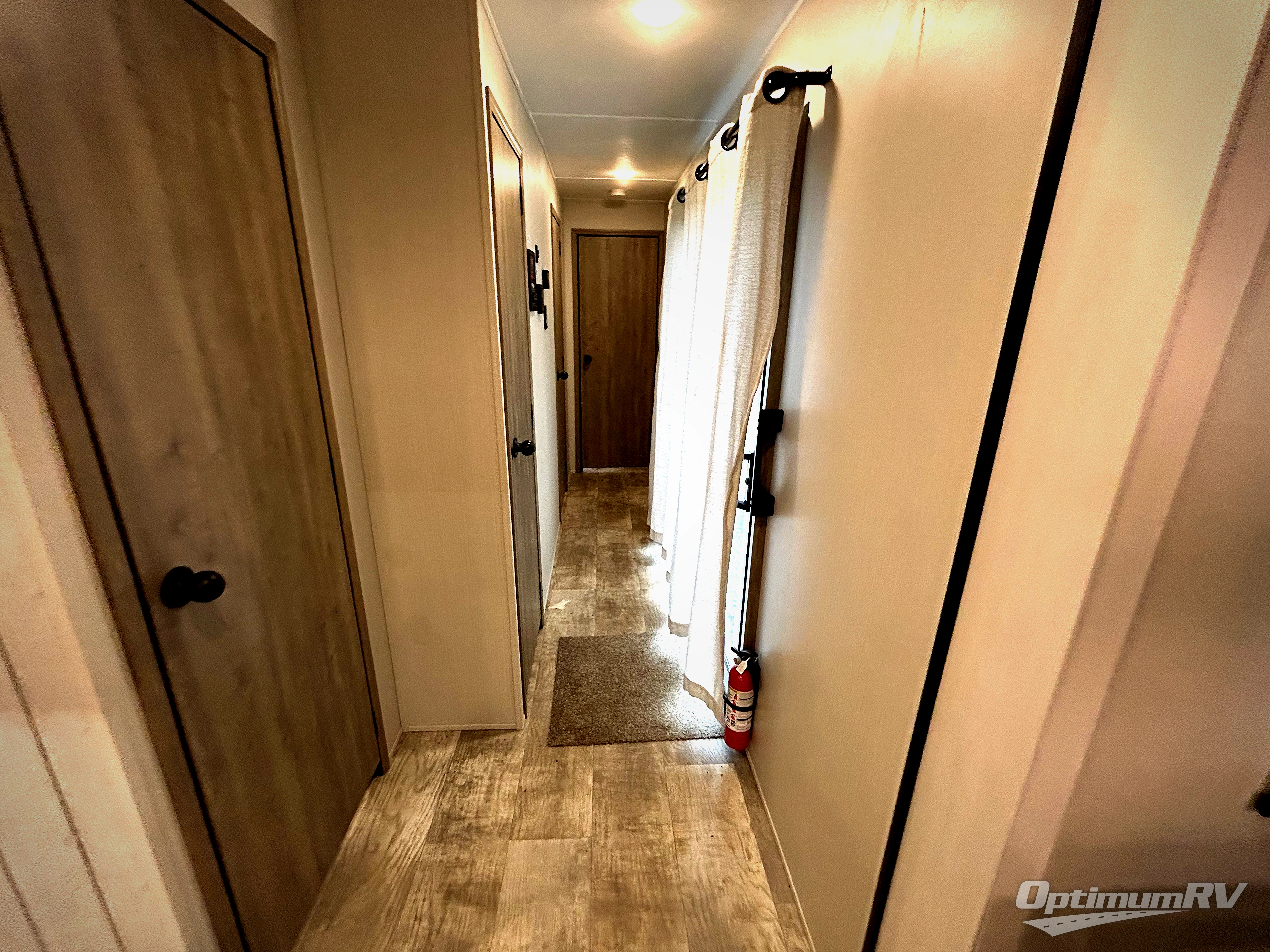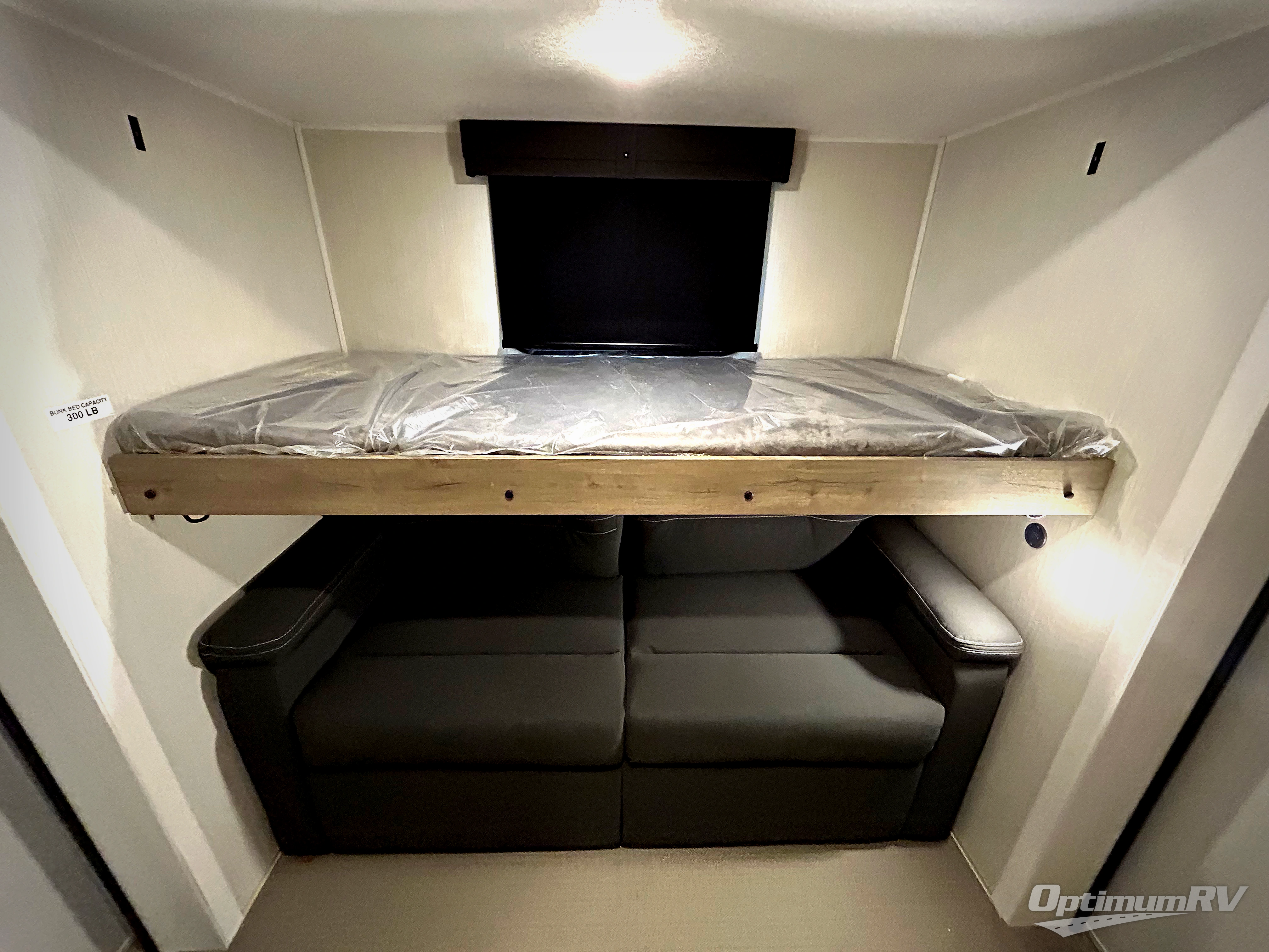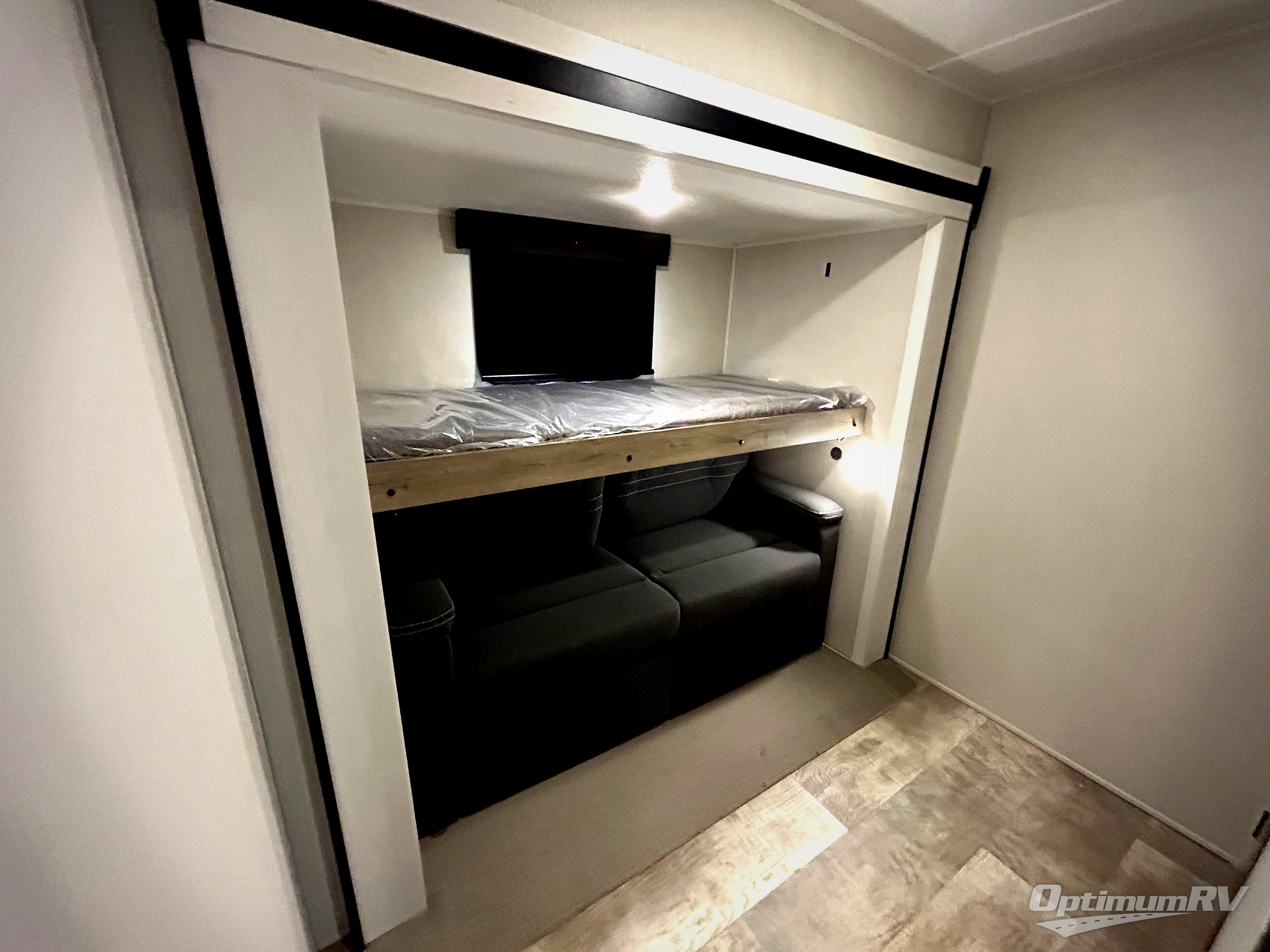 Everyone will want to join you when you head back out to the lake to stay in this trailer! With the middle bunkhouse that includes a bunk above a jiffy sofa and a closet, this can be your kids room or guests headquarters. You will have your own privacy when needed in the front bedroom which includes a queen bed slide and two closets. There is also a dresser and a space within a closet for a washer/dryer prep option. The full bathroom is conveniently located between the two rooms, and the rear of the destination trailer offers a combined living and kitchen area. The dual slides give you lots of floor space around the kitchen island to relax on the booth dinette or sofa, and the cook will have full kitchen amenities including a residential style refrigerator.