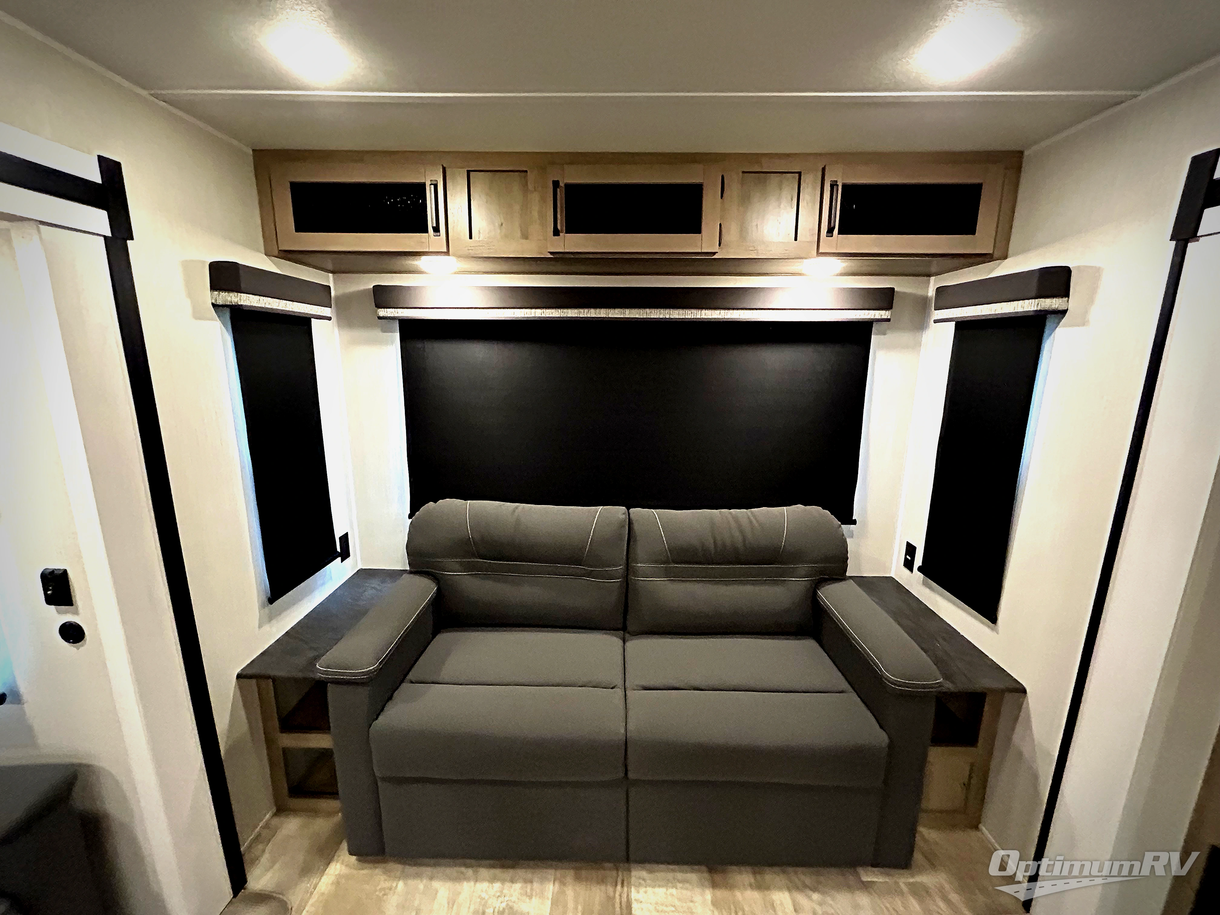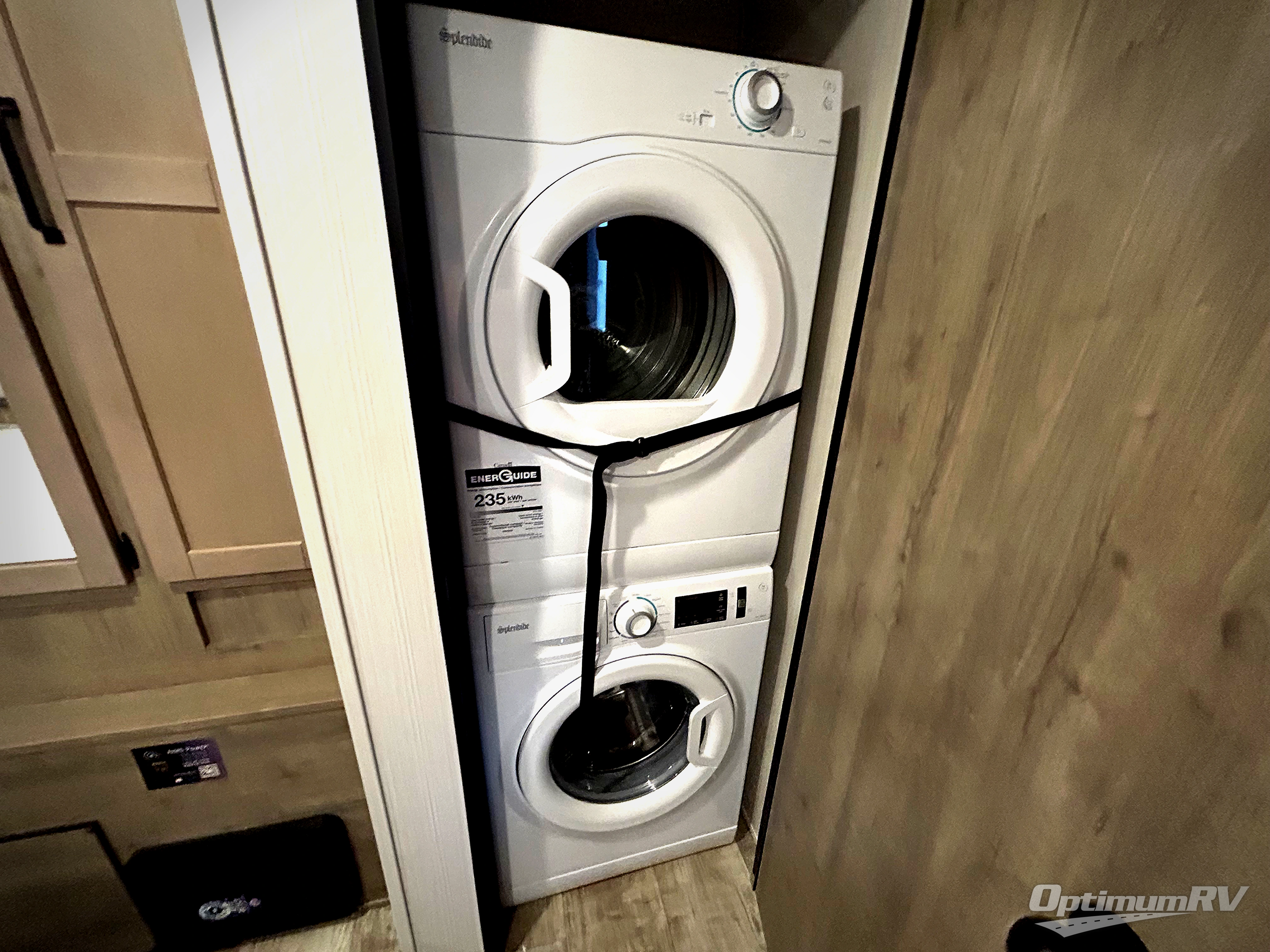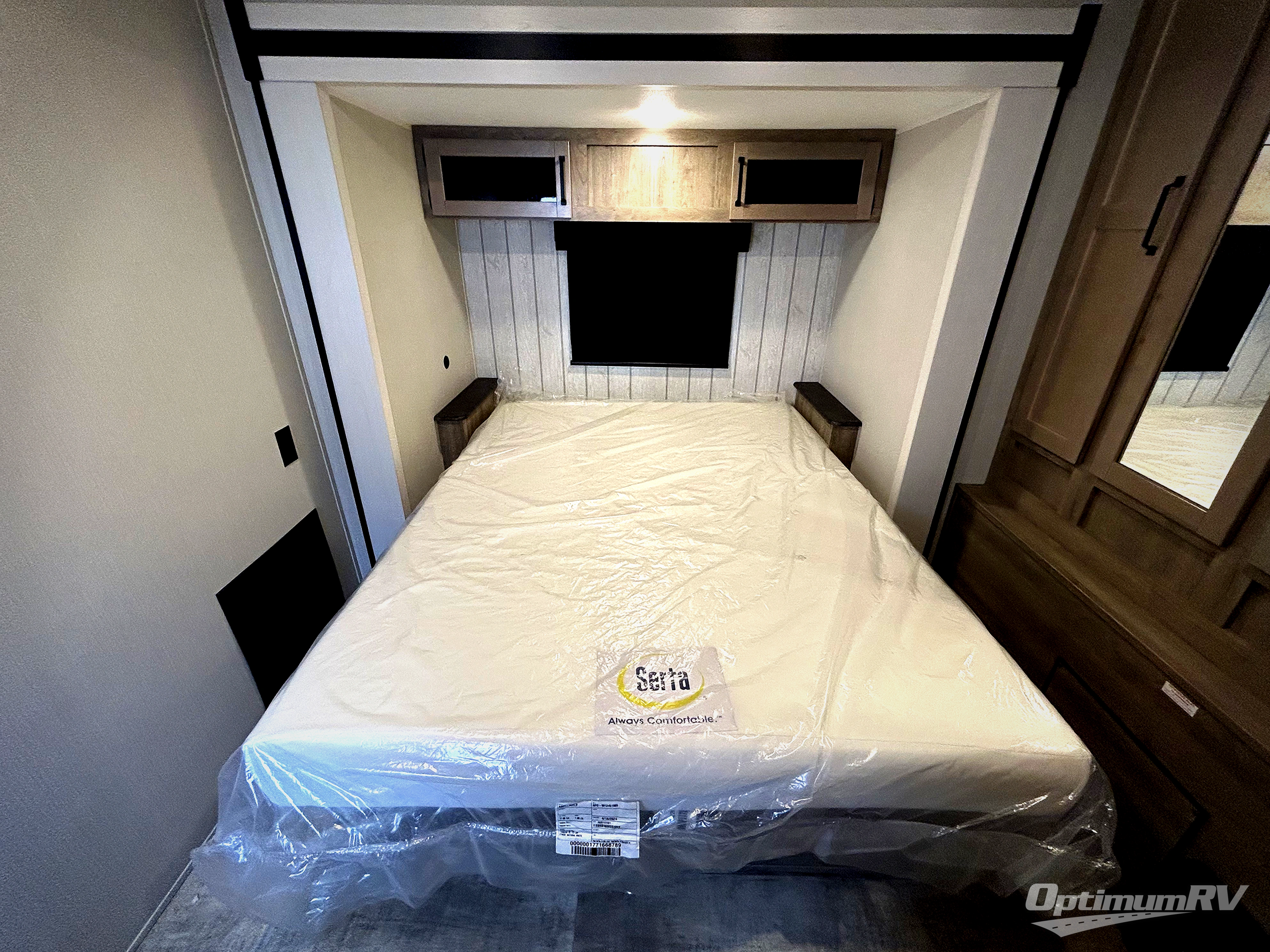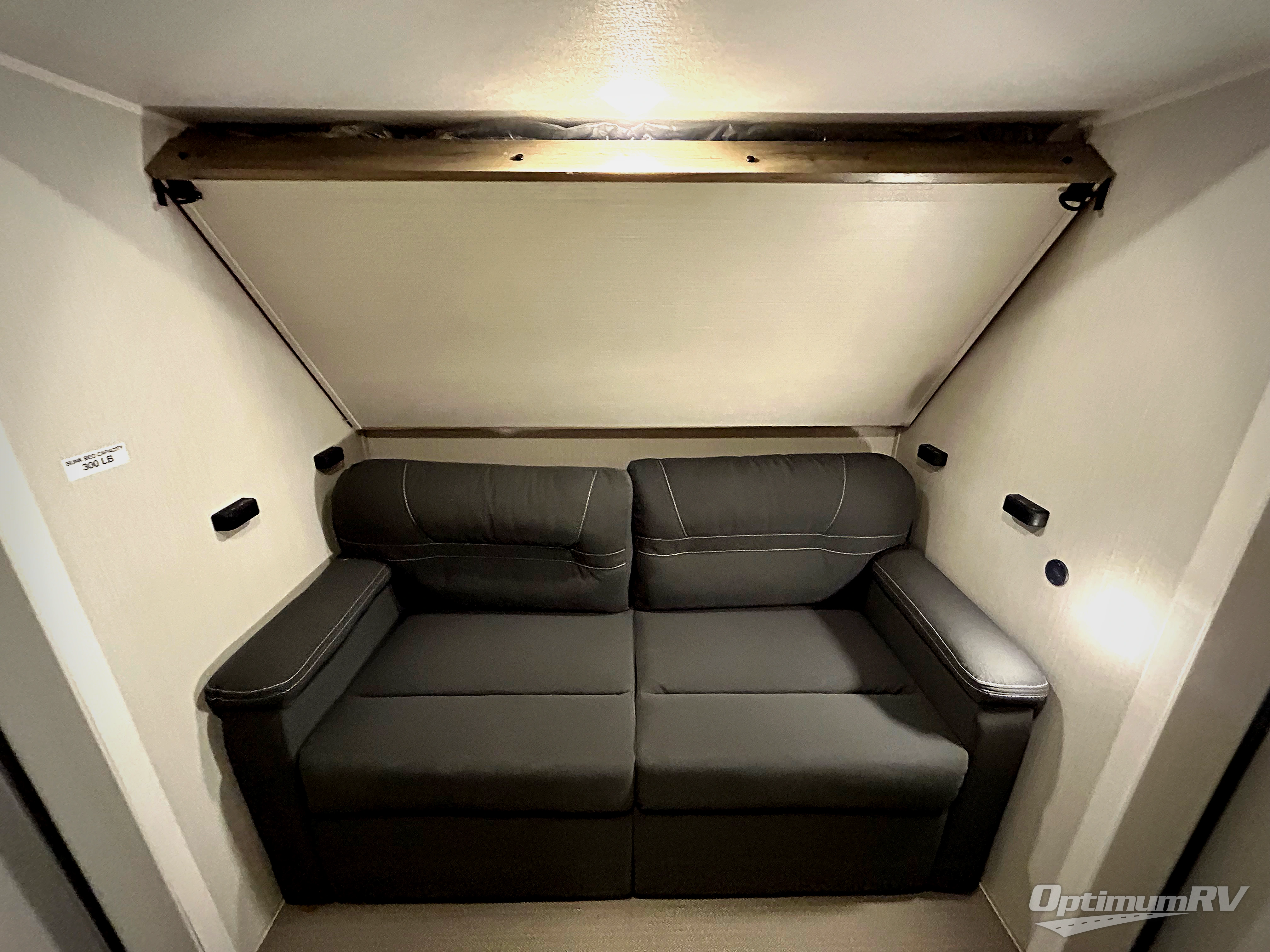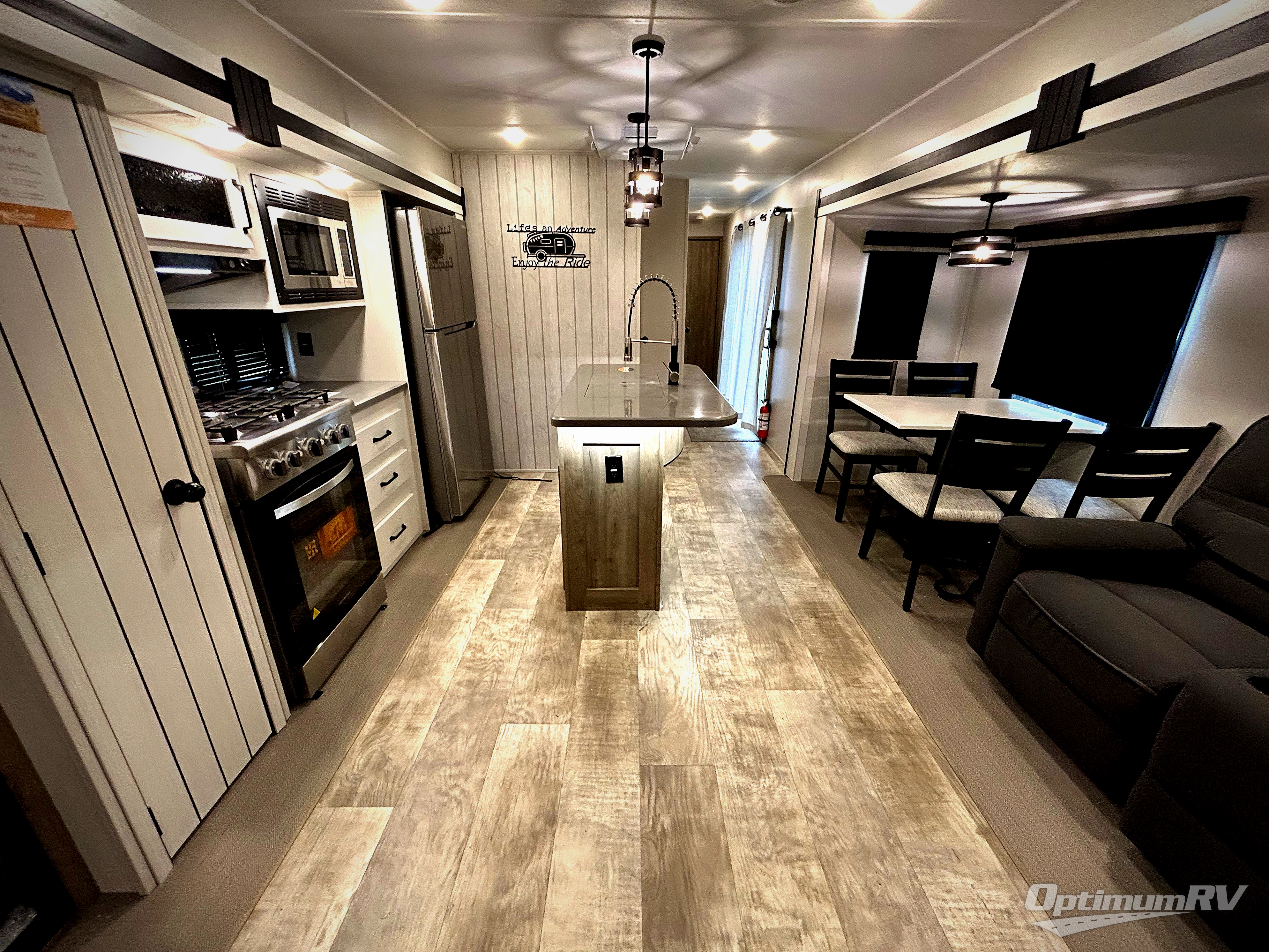 Everyone will want to join you when you head back out to the lake to stay in this trailer! With the middle bunkhouse that includes a bunk above a jiffy sofa and a closet, this can be your kids room or guests headquarters. You will have your own privacy when needed in the front bedroom which includes a queen bed slide and two closets. There is also a dresser and a space within a closet for a washer/dryer prep option. The full bathroom is conveniently located between the two rooms, and the rear of the destination trailer offers a combined living and kitchen area. The dual slides give you lots of floor space around the kitchen island to relax on the booth dinette or sofa, and the cook will have full kitchen amenities including a residential style refrigerator.