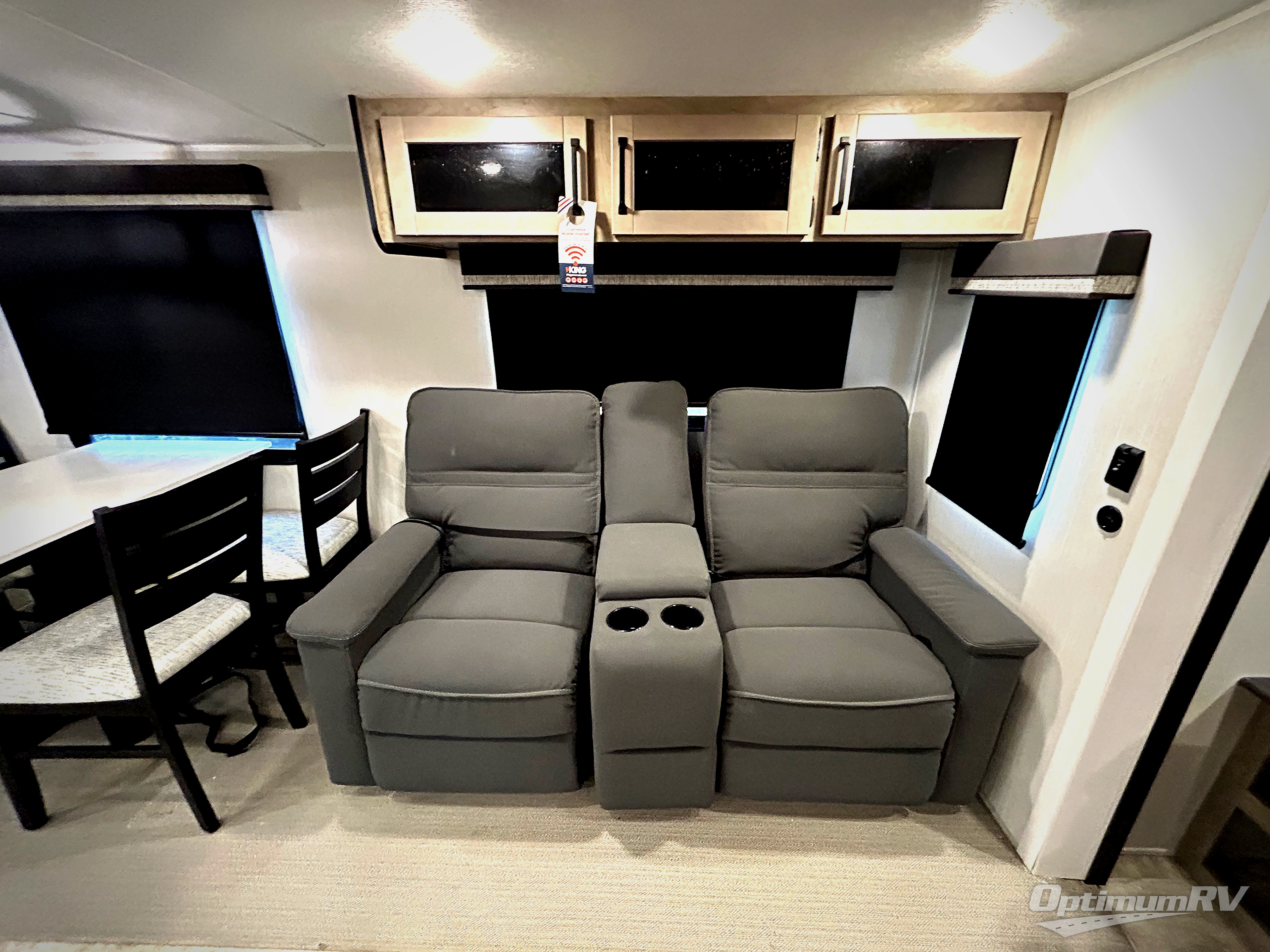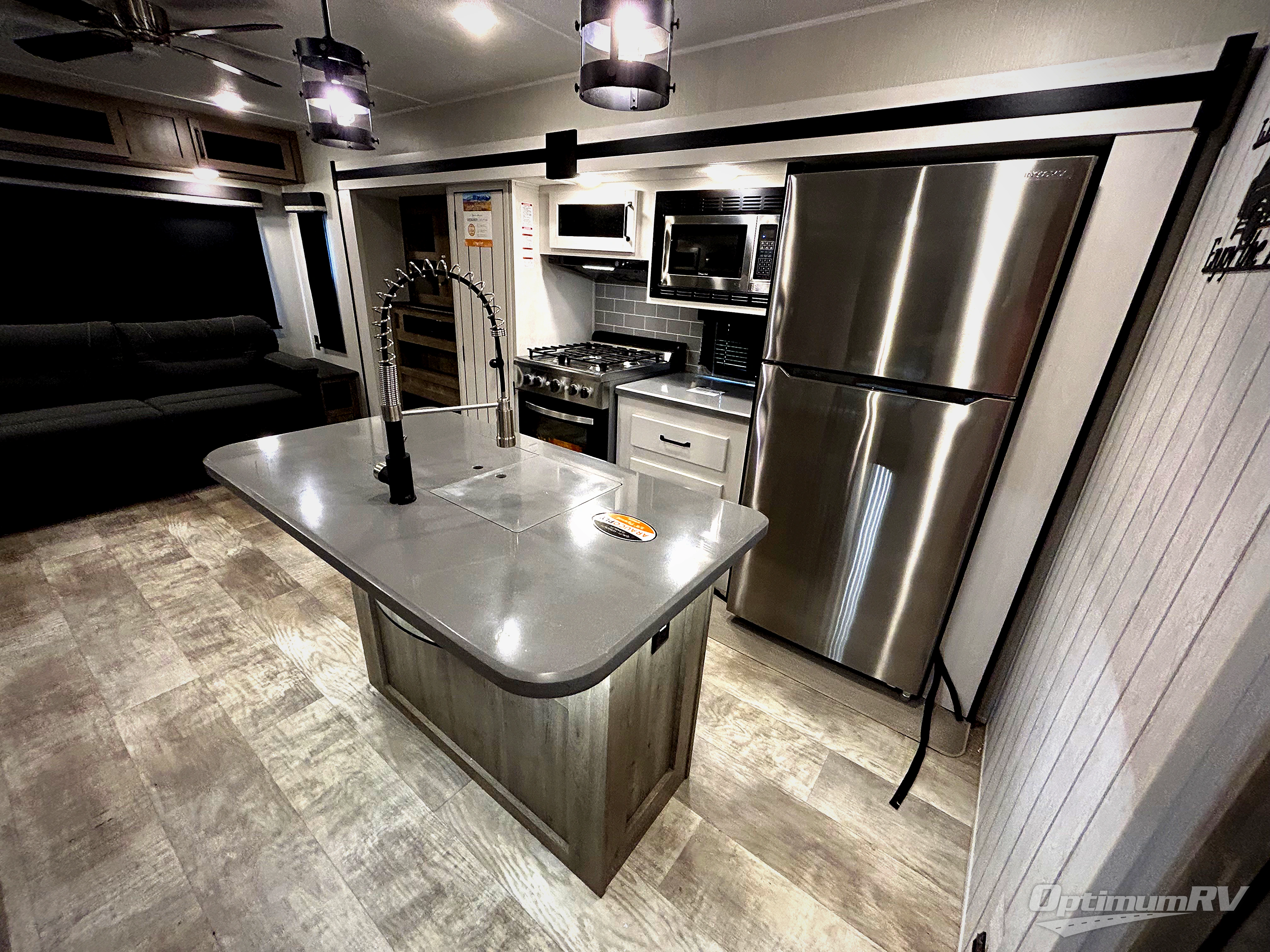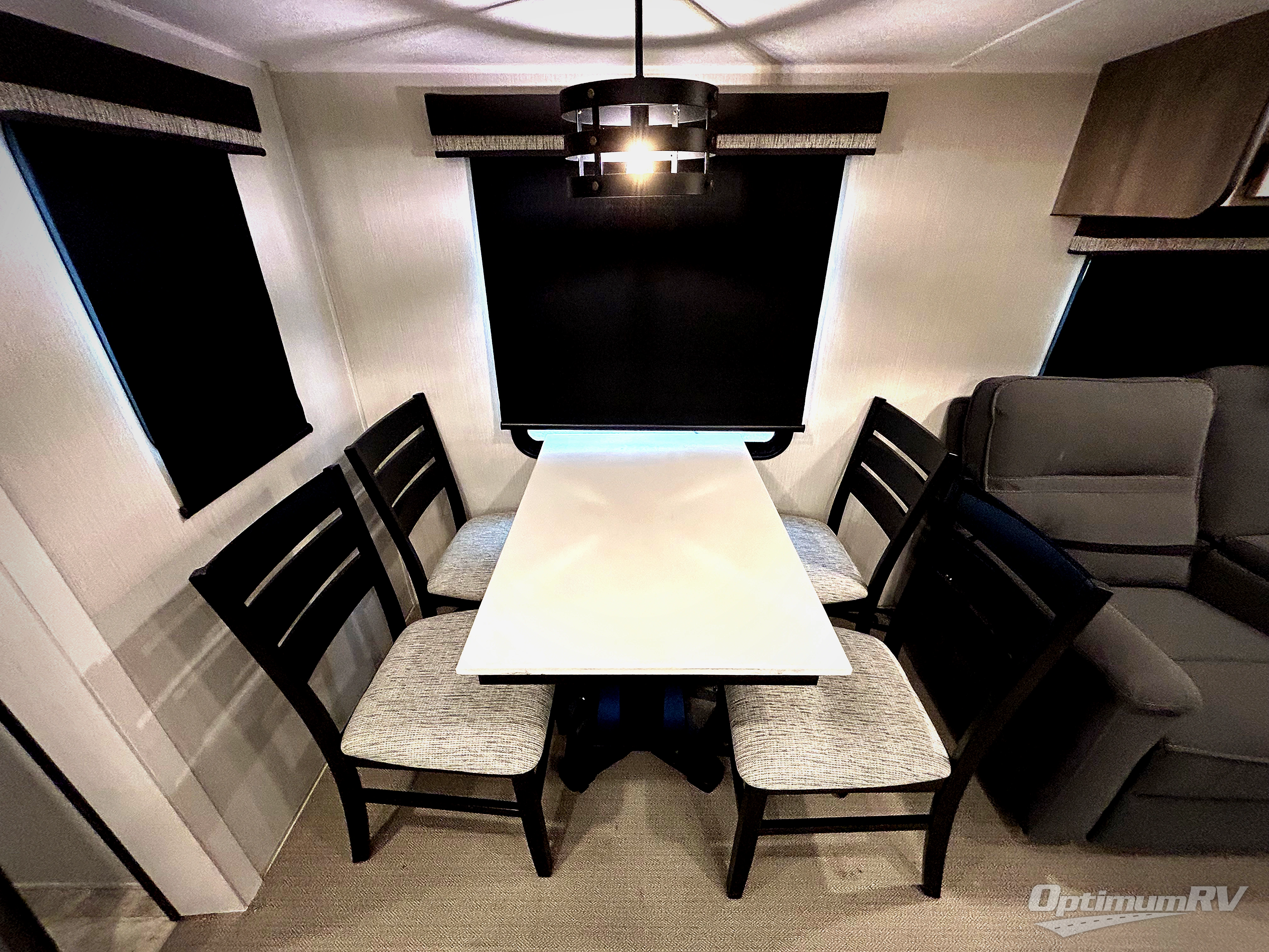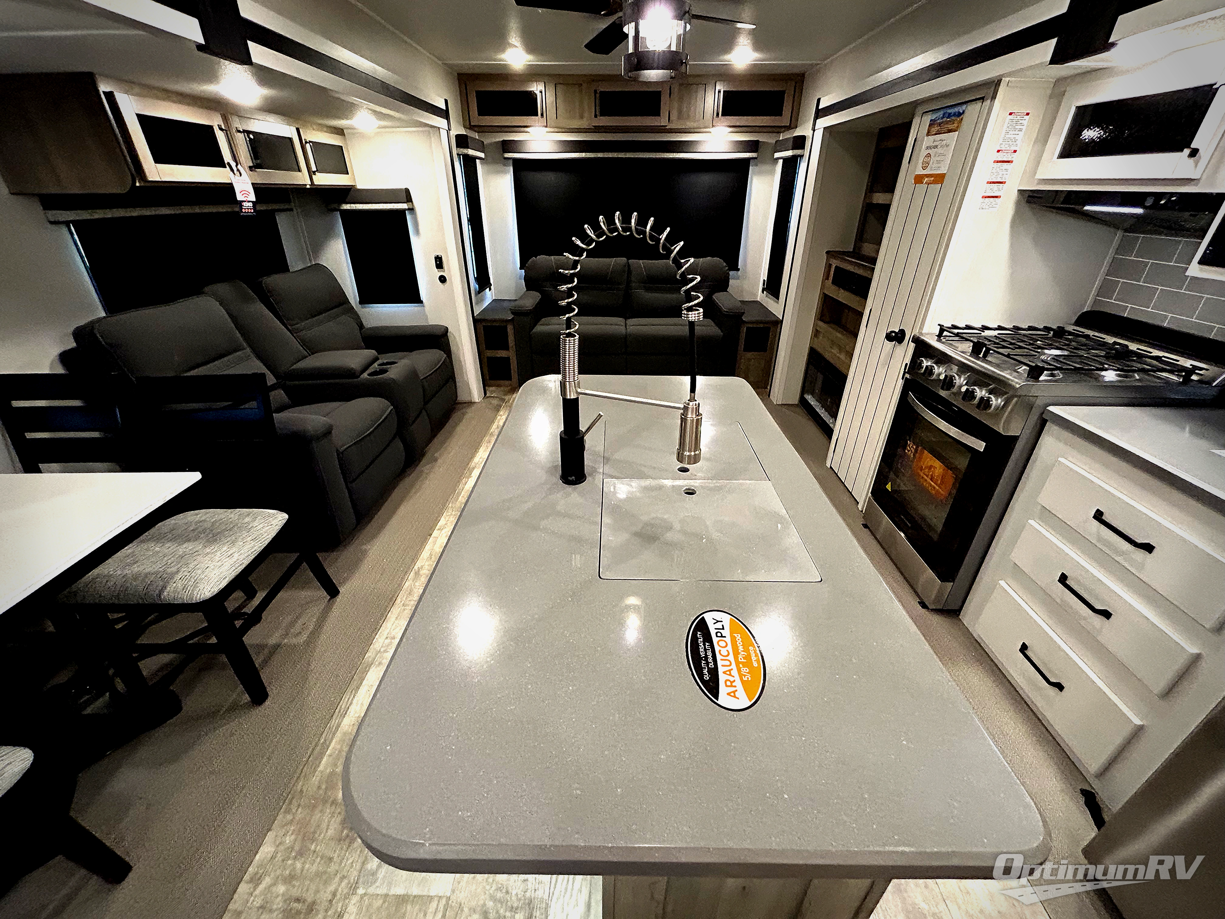 Everyone will want to join you when you head back out to the lake to stay in this trailer! With the middle bunkhouse that includes a bunk above a jiffy sofa and a closet, this can be your kids room or guests headquarters. You will have your own privacy when needed in the front bedroom which includes a queen bed slide and two closets. There is also a dresser and a space within a closet for a washer/dryer prep option. The full bathroom is conveniently located between the two rooms, and the rear of the destination trailer offers a combined living and kitchen area. The dual slides give you lots of floor space around the kitchen island to relax on the booth dinette or sofa, and the cook will have full kitchen amenities including a residential style refrigerator.