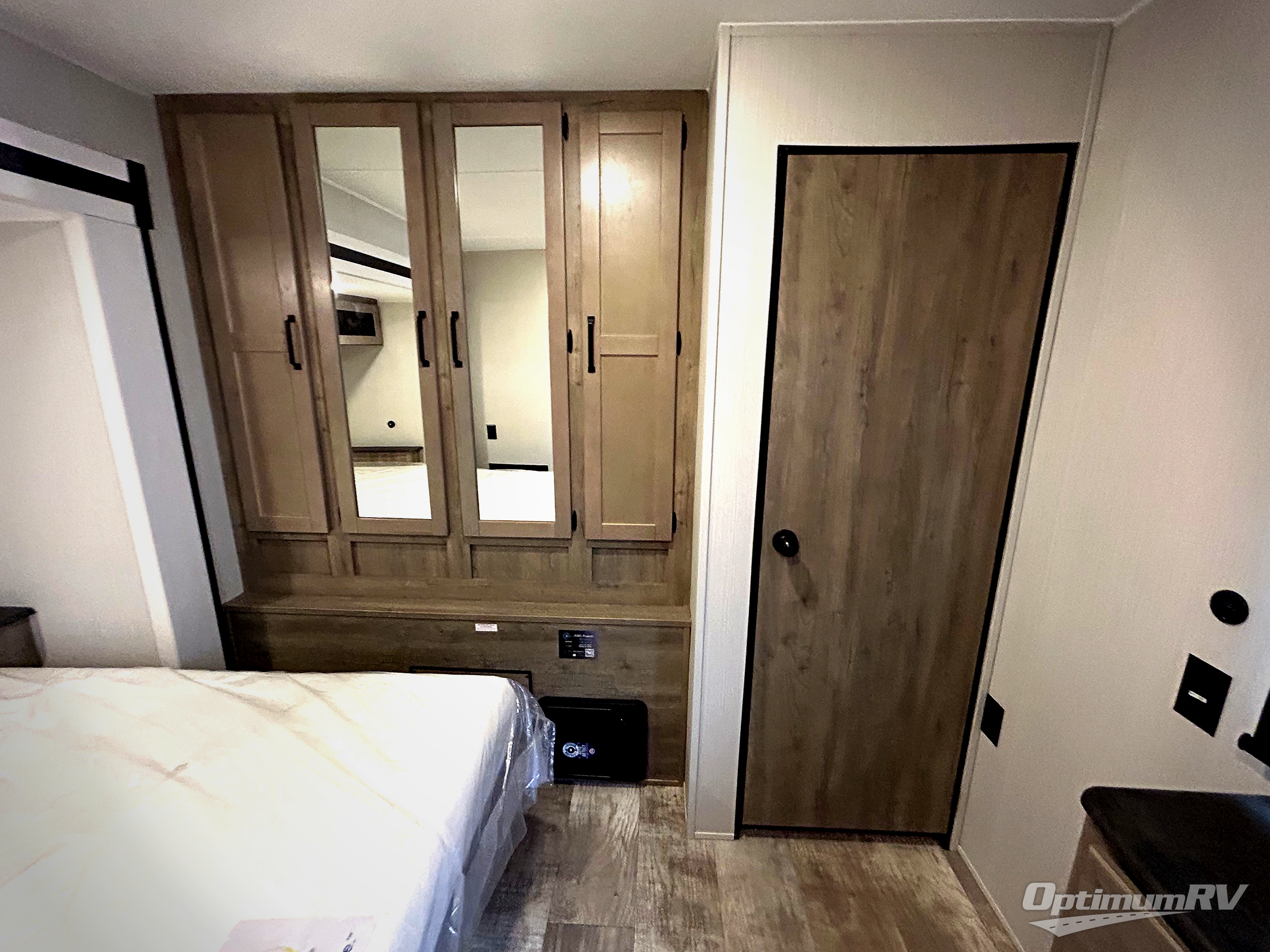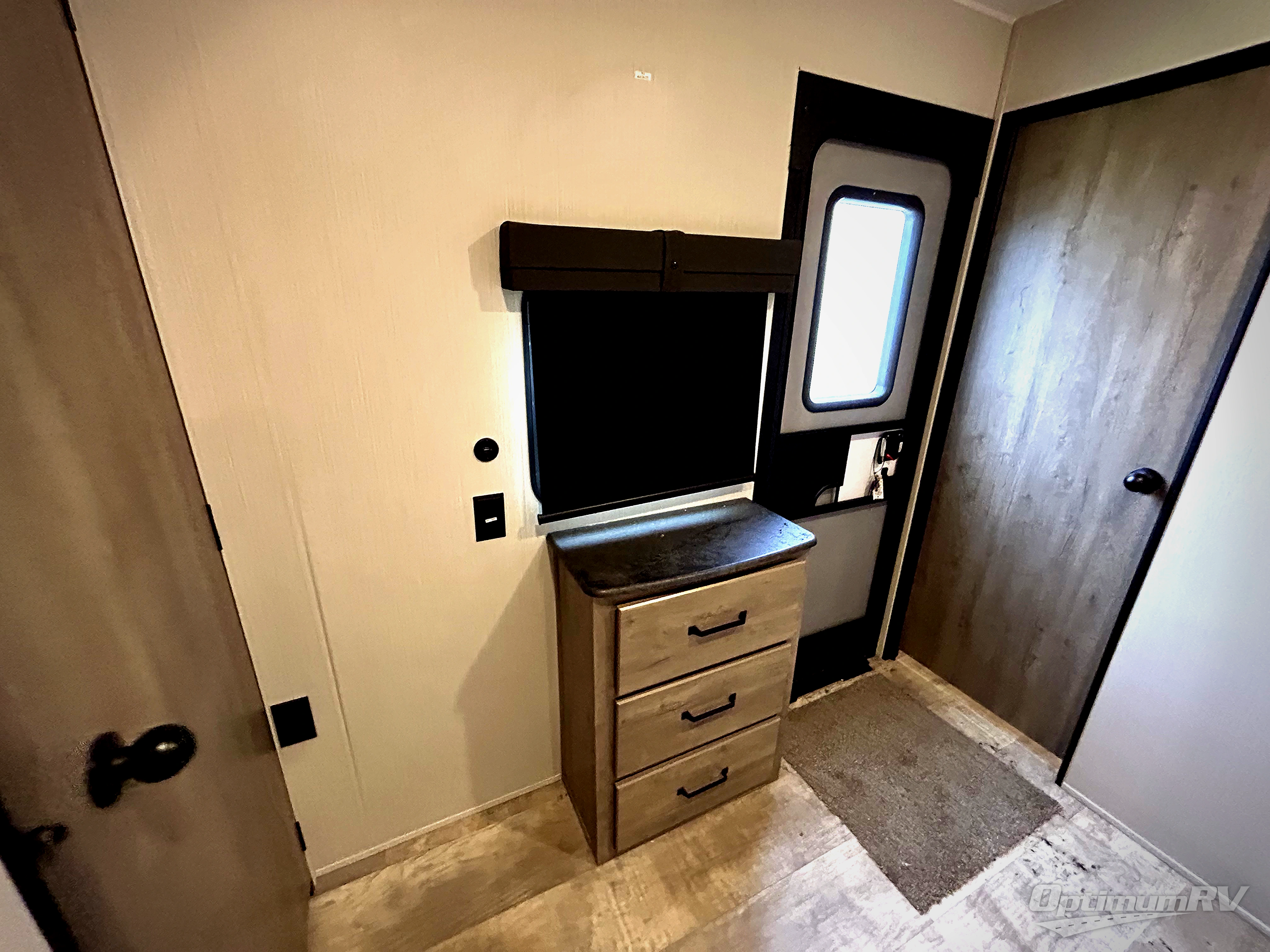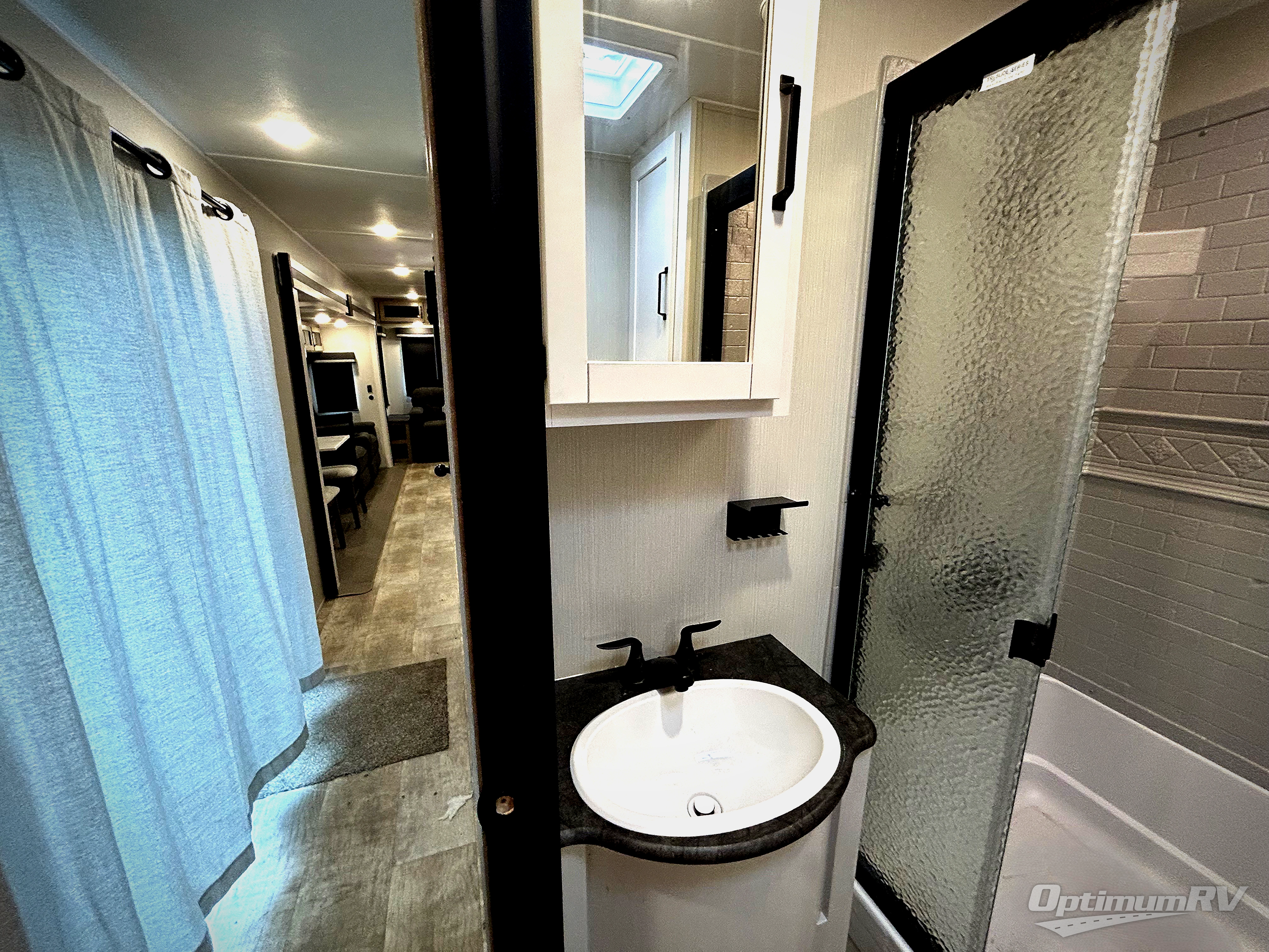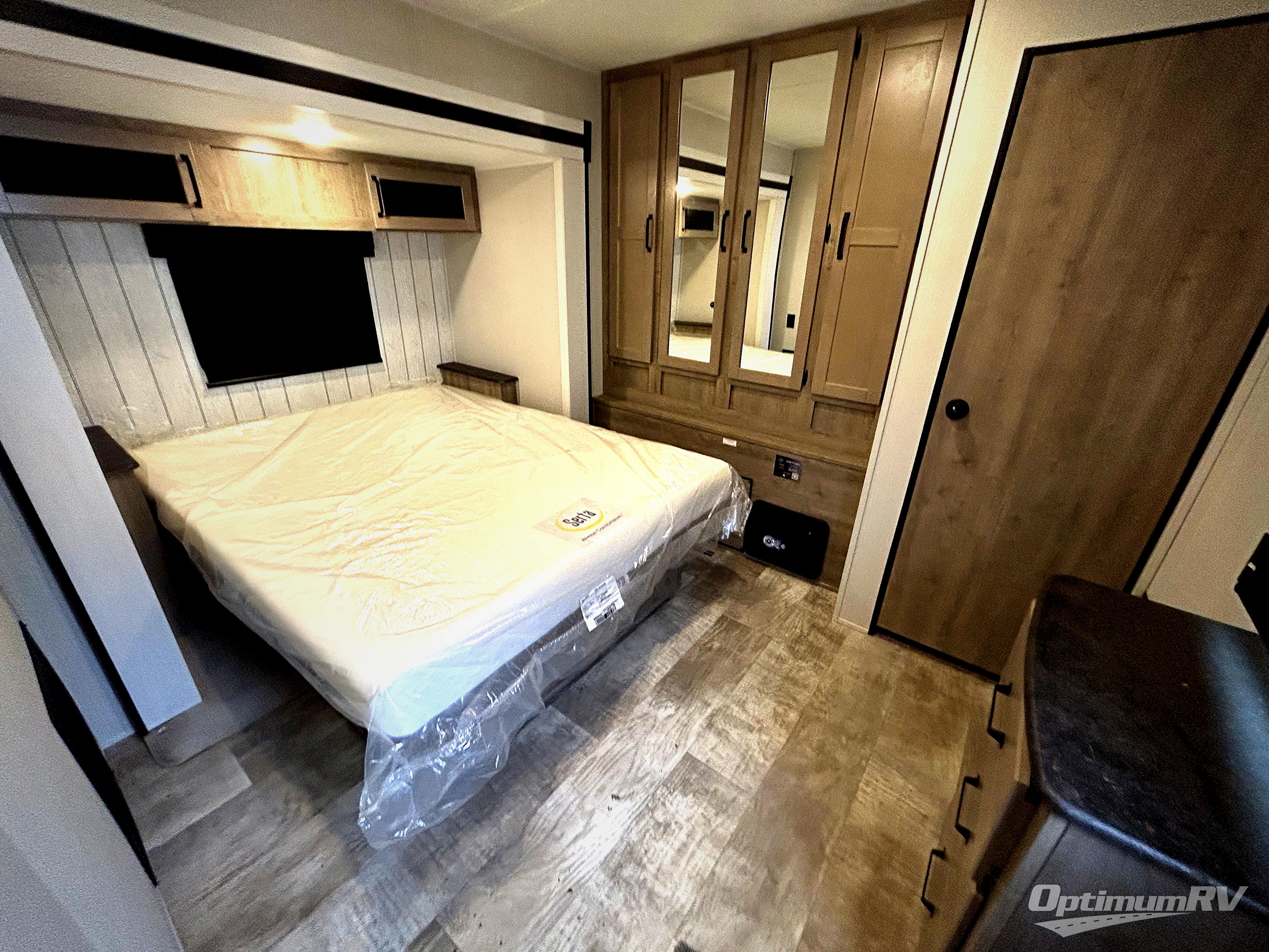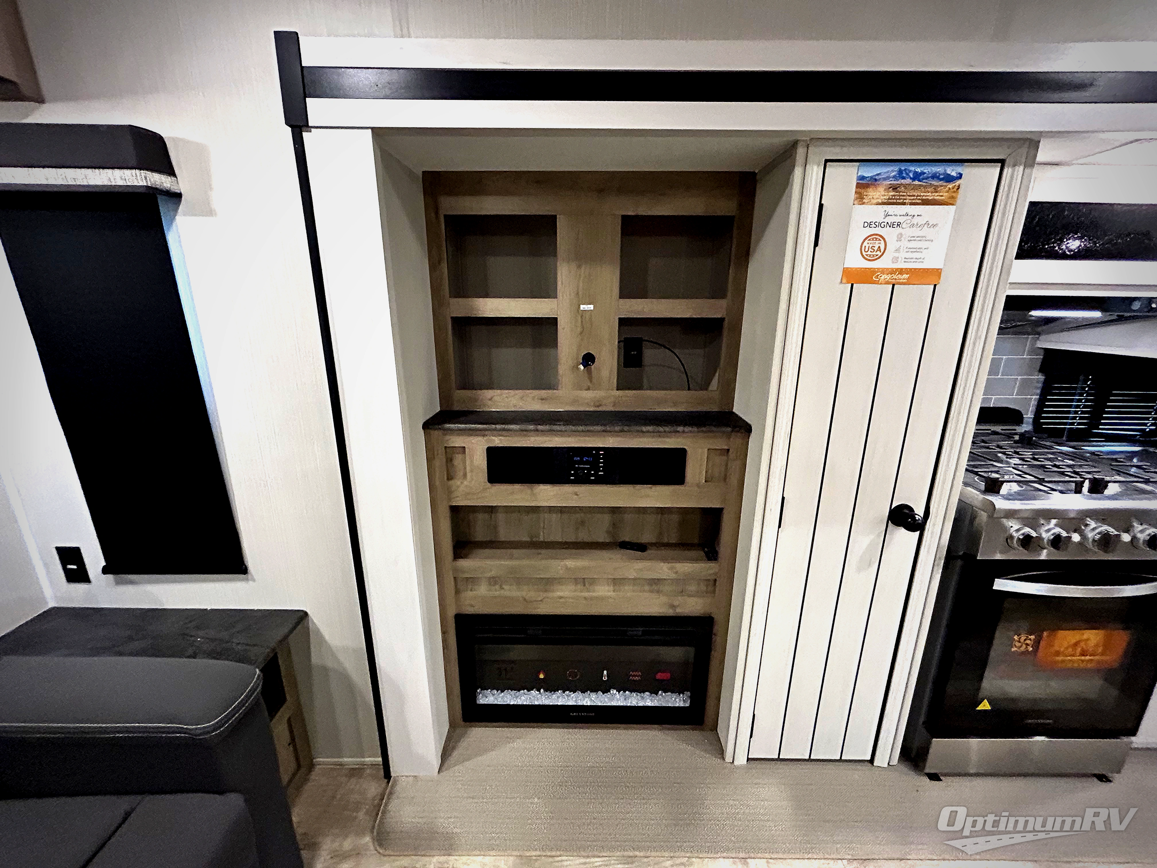 Everyone will want to join you when you head back out to the lake to stay in this trailer! With the middle bunkhouse that includes a bunk above a jiffy sofa and a closet, this can be your kids room or guests headquarters. You will have your own privacy when needed in the front bedroom which includes a queen bed slide and two closets. There is also a dresser and a space within a closet for a washer/dryer prep option. The full bathroom is conveniently located between the two rooms, and the rear of the destination trailer offers a combined living and kitchen area. The dual slides give you lots of floor space around the kitchen island to relax on the booth dinette or sofa, and the cook will have full kitchen amenities including a residential style refrigerator.