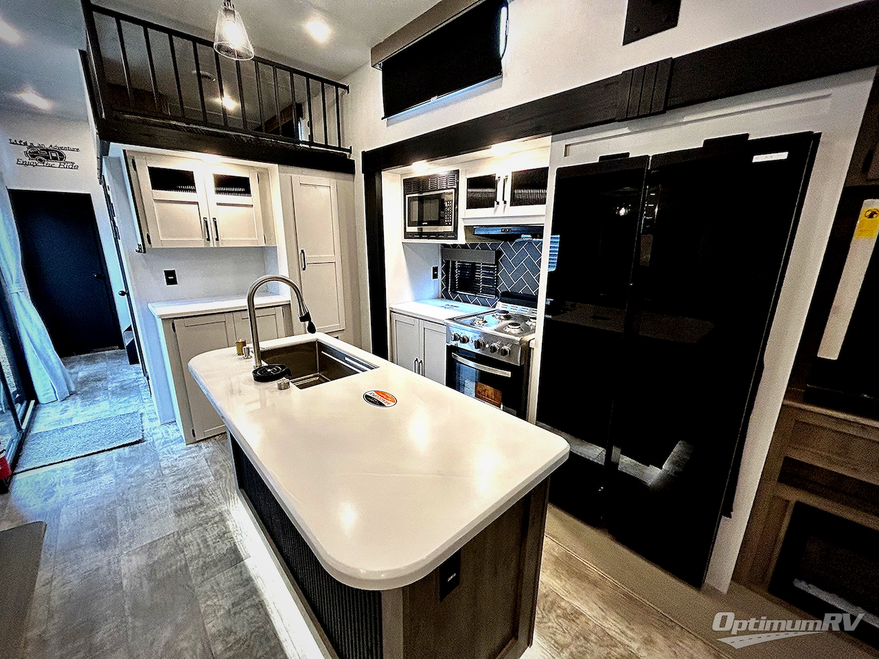 Wherever your destination may be, you can be sure to enjoy it to the fullest with this trailer in tow! With two entry doors, you can enter in through the rear private bedroom or the main living area. The bedroom includes a king bed slide out, a wardrobe/closet to keep your clothes organized, plus a closet with the option to add washer and dryer prep. Just outside this room are steps that lead to the large loft area with a 58" x 58" bunk mat and a cabinet on one side, plus two 32" x 69" bunk mats on the other. There is also a cabinet and a wardrobe/closet for plenty of storage space. Once you've headed back downstairs, you can relax on the dual recliners, front sofa, or free-standing table with a bench and two seats. And the chef of your group will love the kitchen with its residential style refrigerator and pantry, kitchen island, and four burner cooktop!