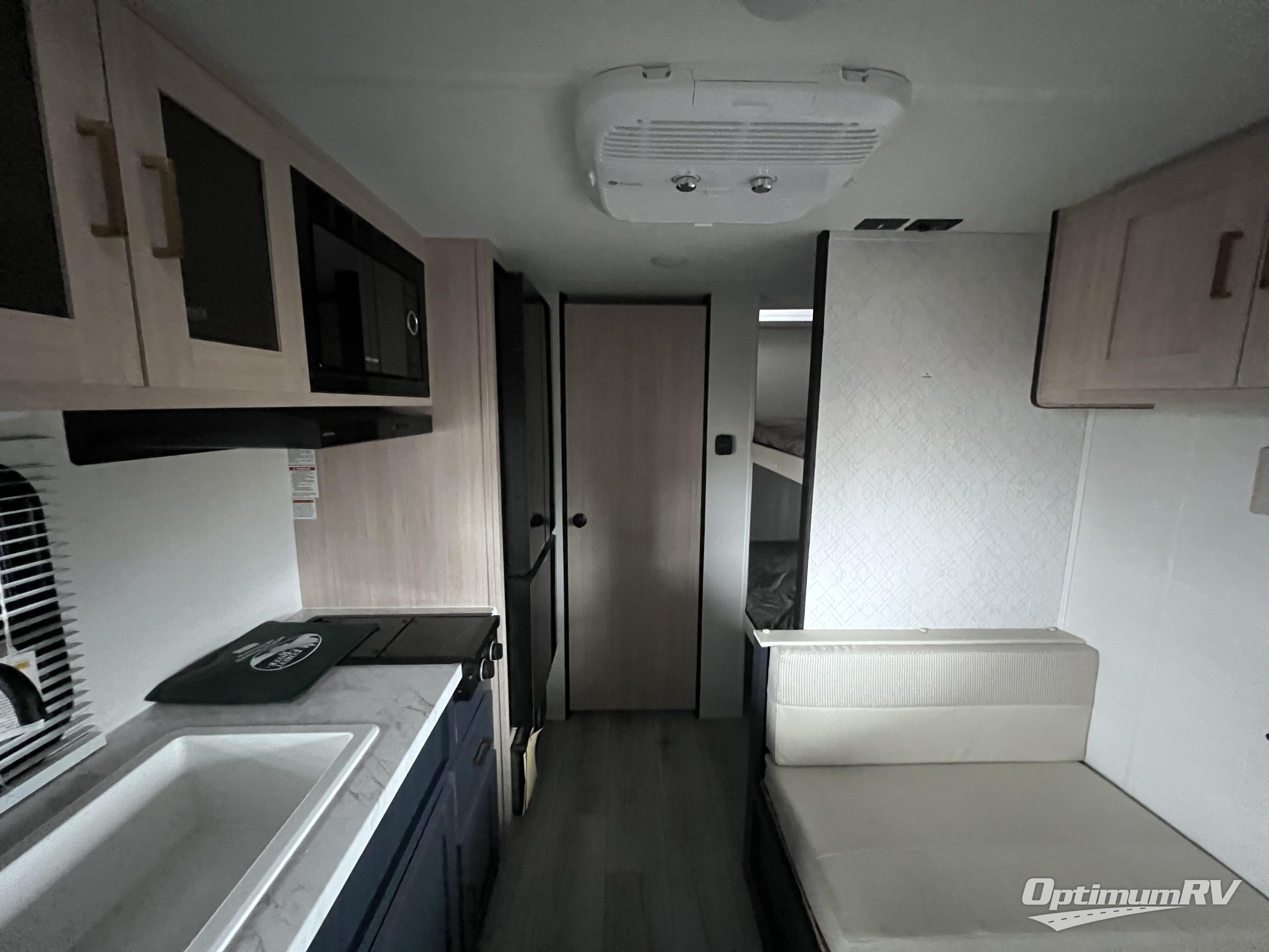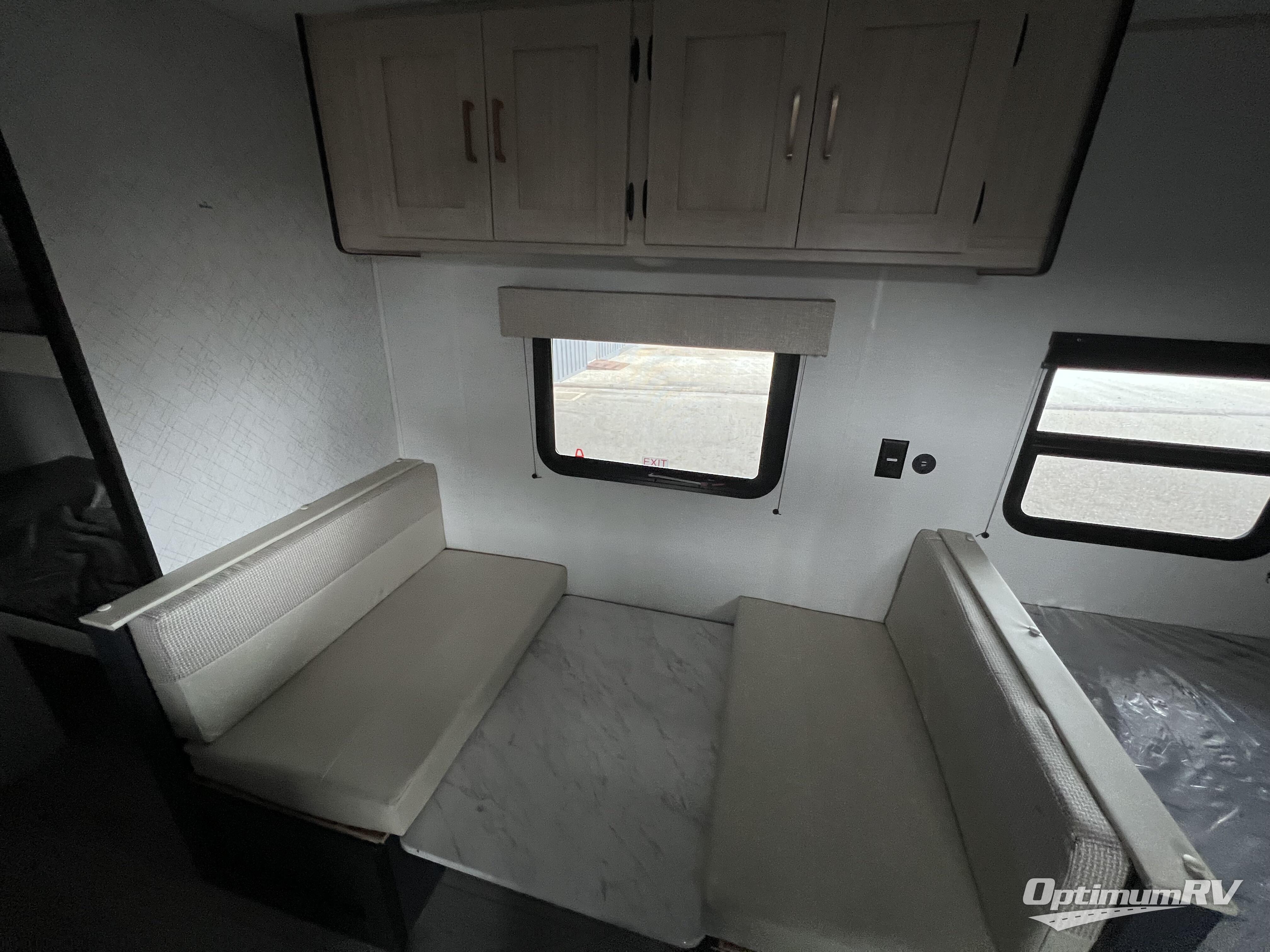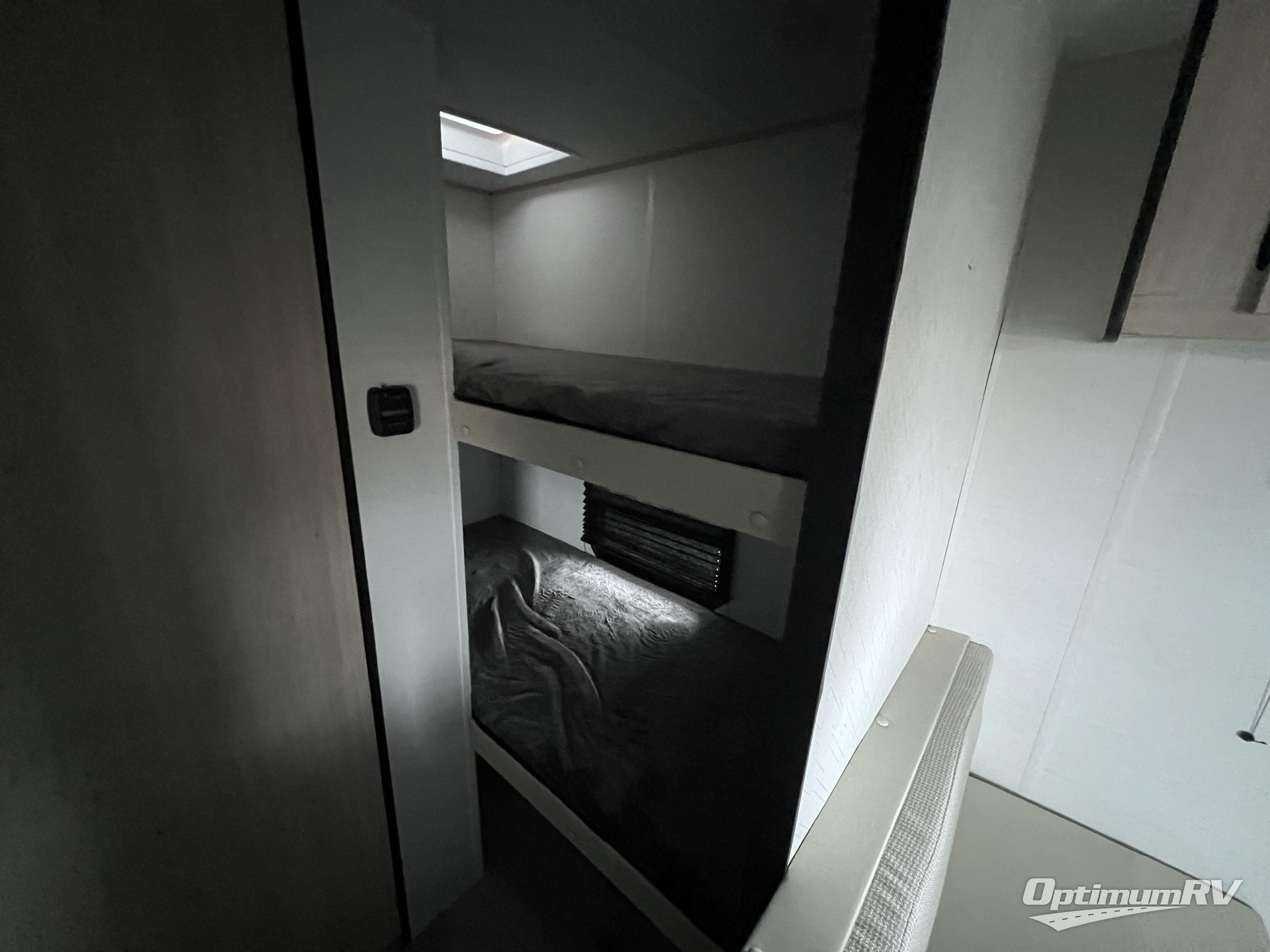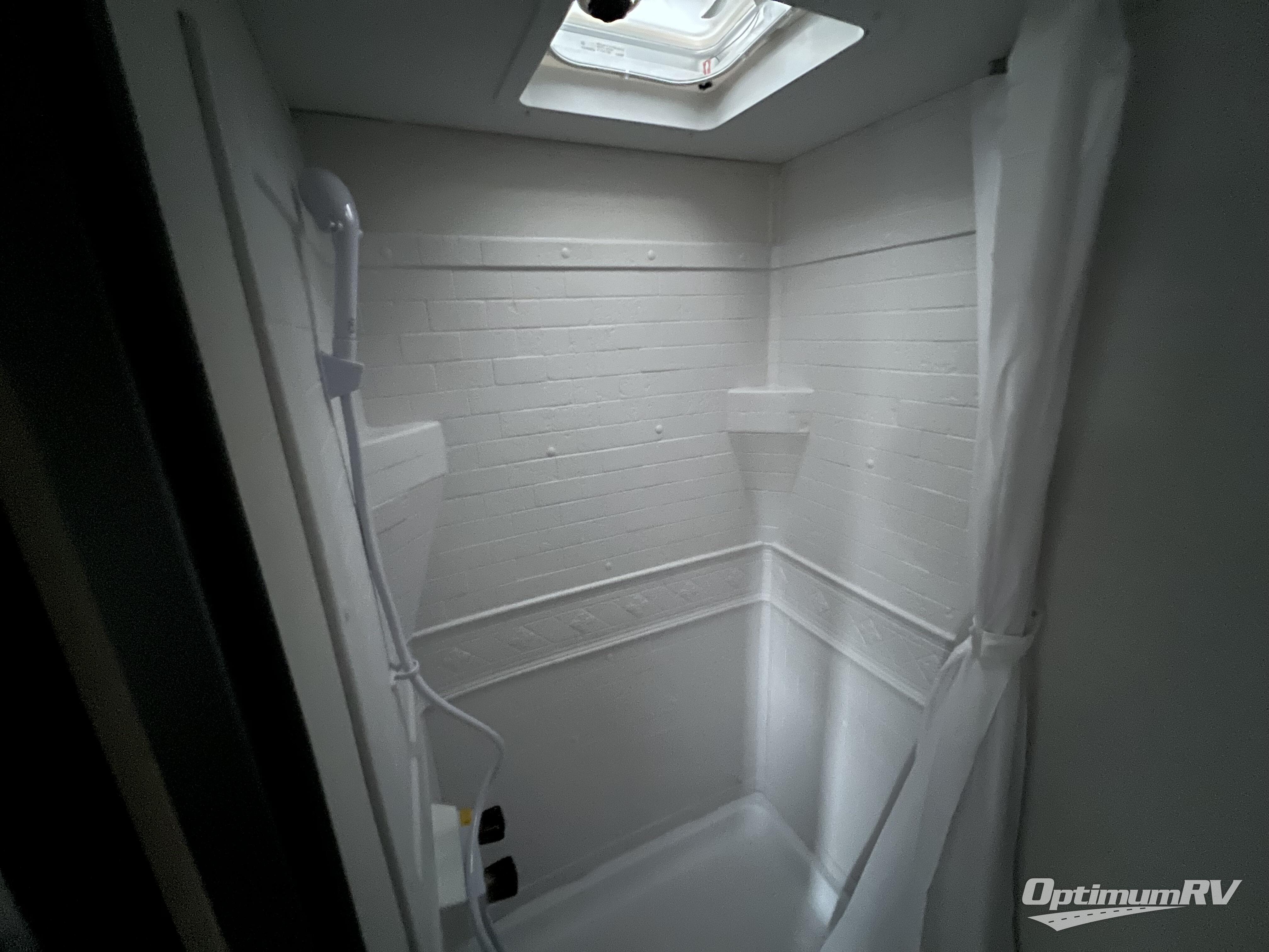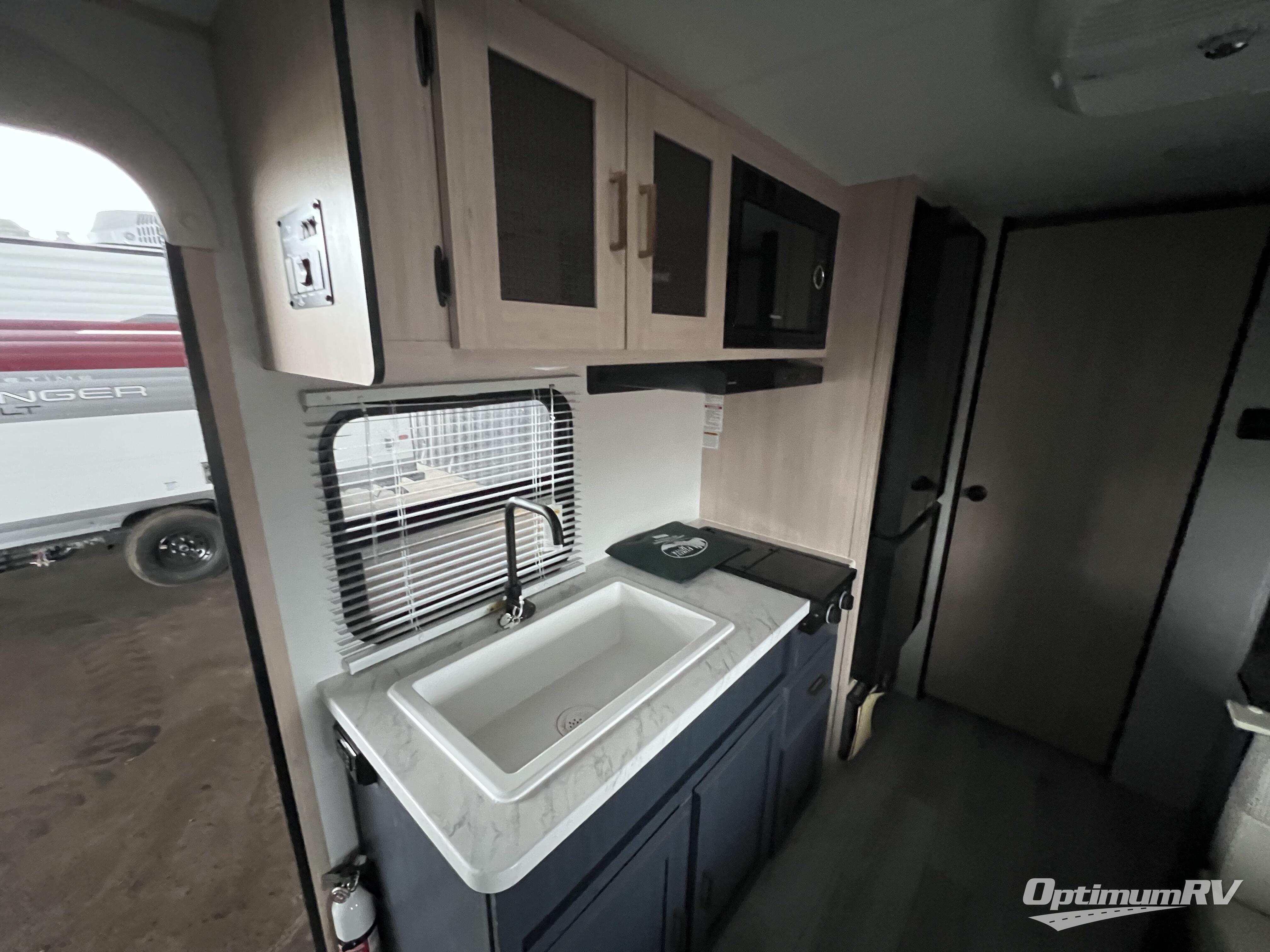 With any Avenger LT travel trailer by Prime Time, the exterior includes an aerodynamic smooth front metal, a front diamond plate for protection on the road, and two stabilizer jacks. There is also exclusive Everlast construction, a PVC roof membrane, and solar prep for the option to go off-grid. The interior offers seamless Carefree Congoleum flooring for easy cleanup and durability, pleated night shades throughout for privacy, a bottle opener, and residential extended ball bearing drawer guides.