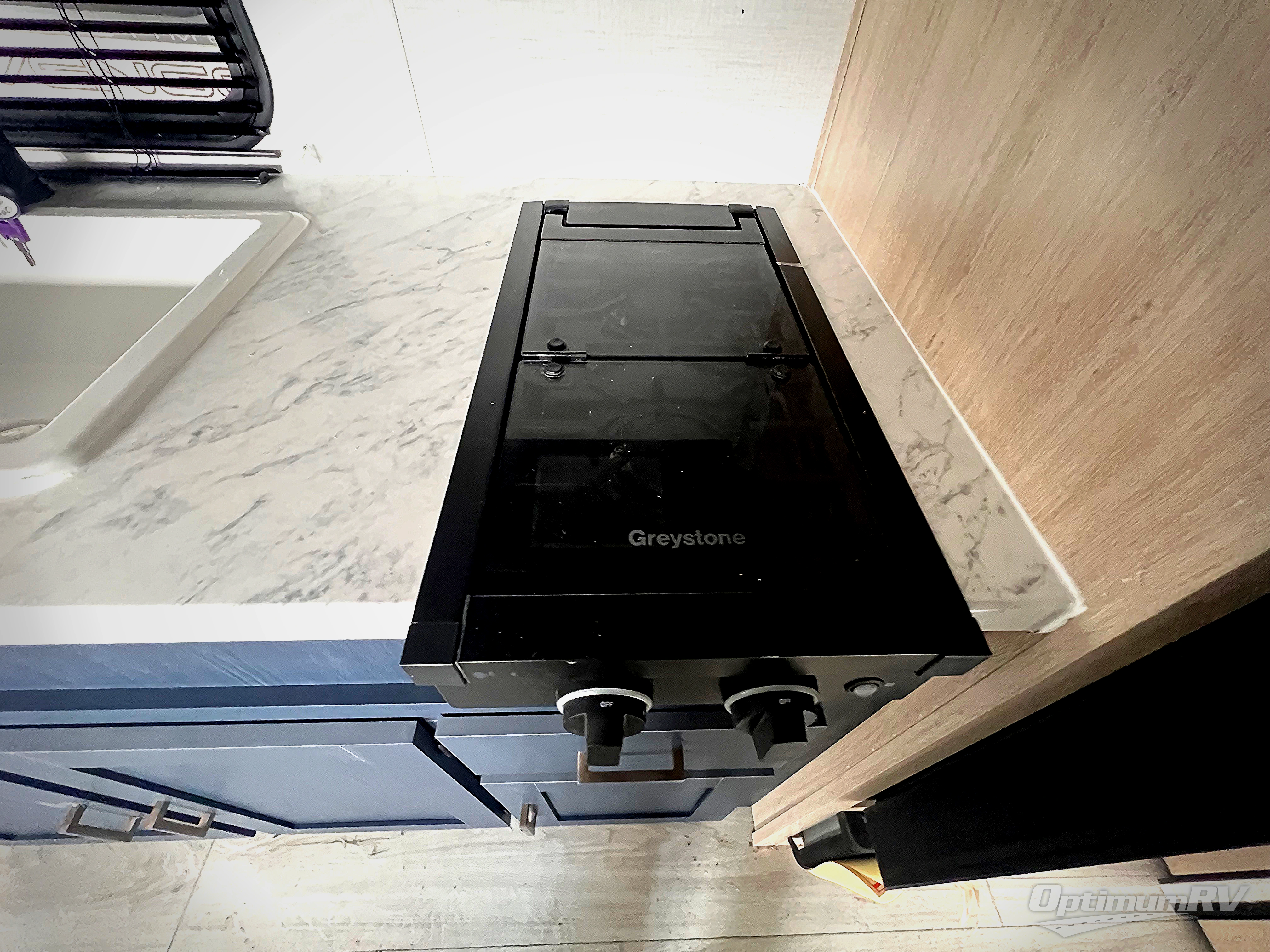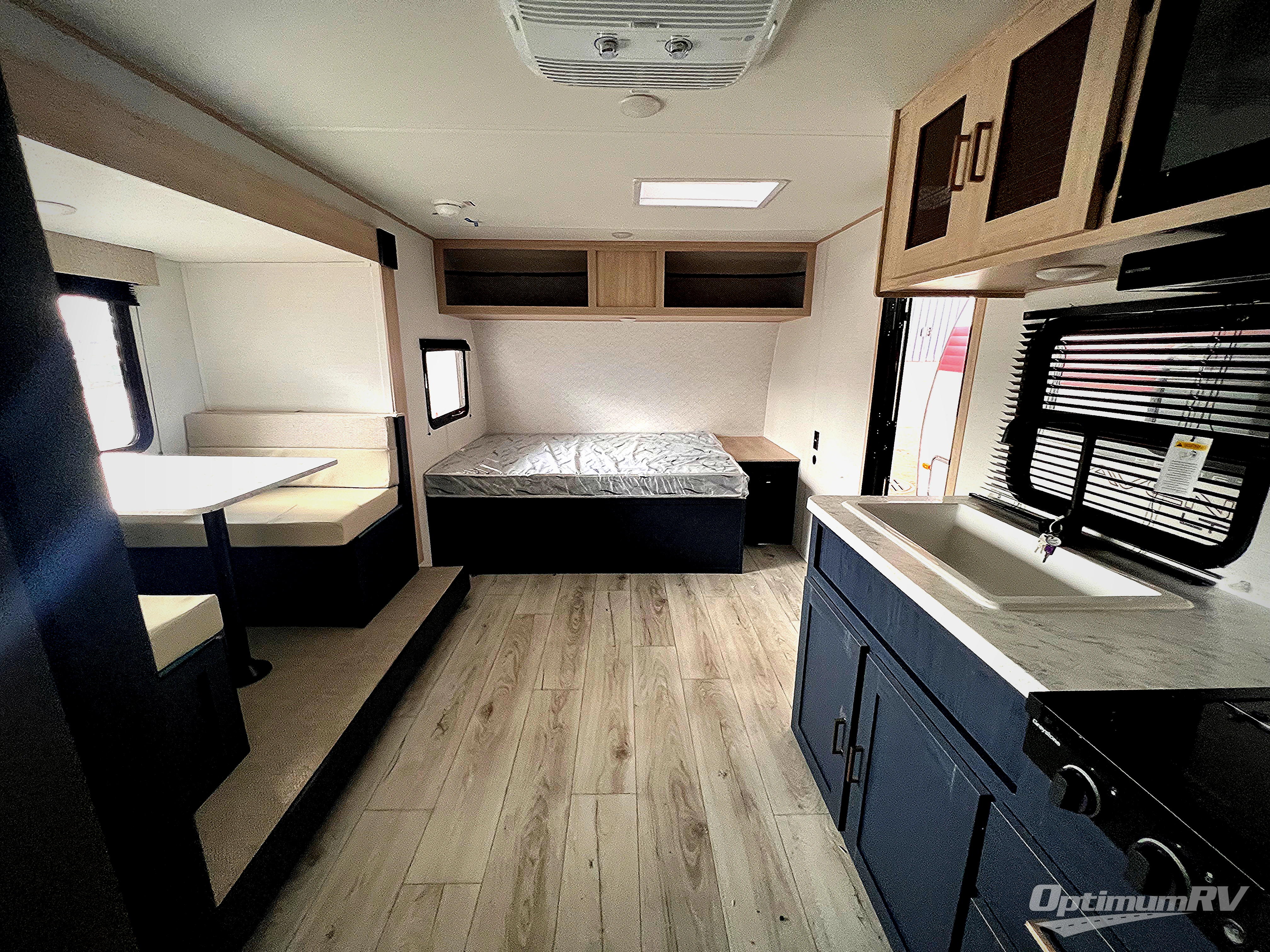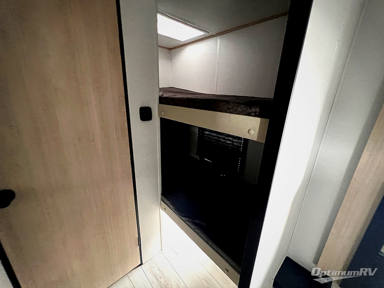 Go hiking, biking or exploring for new places when you have this trailer at the campgrounds! You will find sleeping for five between the rear corner bunk beds, and the front bed with a nightstand for your cellphones and such. And one more can sleep on the dinette slide. You'll be delighted with the kitchen skylight that gives natural lighting as you cook a meal. The LED-lit power awning provides a protected outdoor living area as you visit or make s'mores around the campfire.