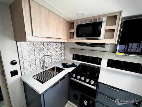 If you're looking for more comfort and a larger sleeping capacity in your next RV, this travel trailer is the one! There are double-size bunks in the rear corner, along with a ladder to easily hop into bed, and the full bath is in the other rear corner for easy nighttime use. You'll enjoy the front private bedroom with its queen bed and dual wardrobes for your things. In the morning, you can make breakfast in the full kitchen, then dine at the bartop with three stools. Or head outdoors to cook on the camp kitchen and eat under the awning! There is also a theater seat within the slide out for more comfort and space, plus the pantry and refrigerator are here so you can easily grab a snack!