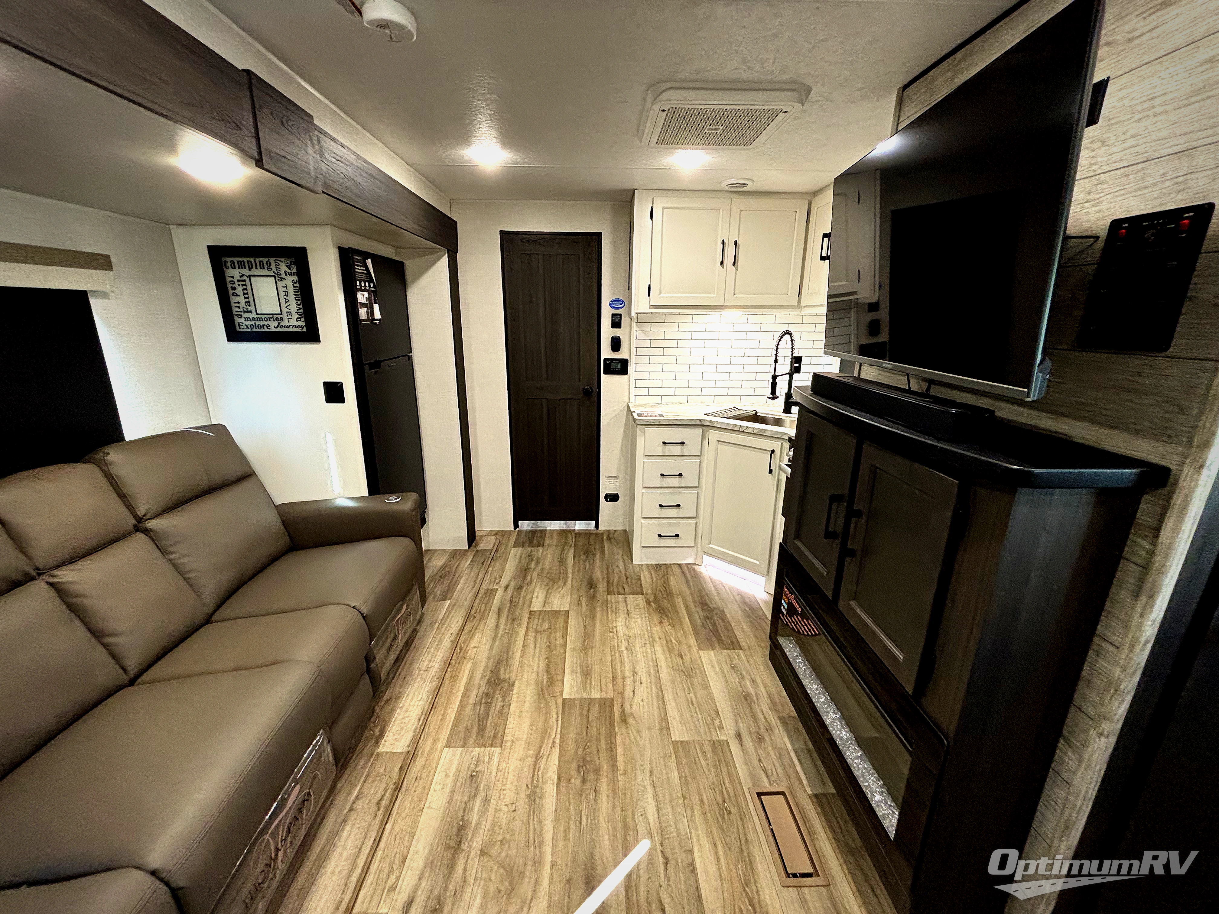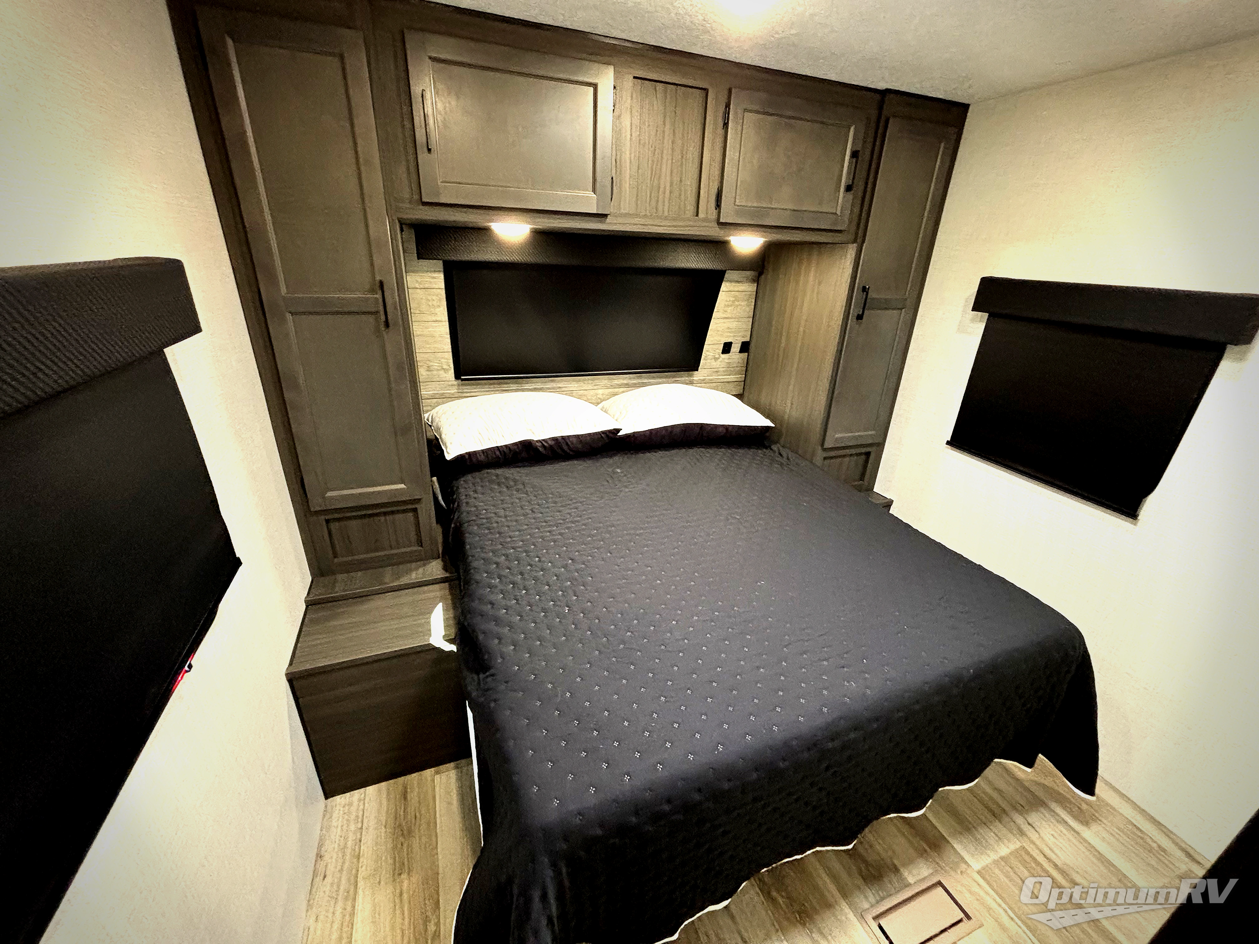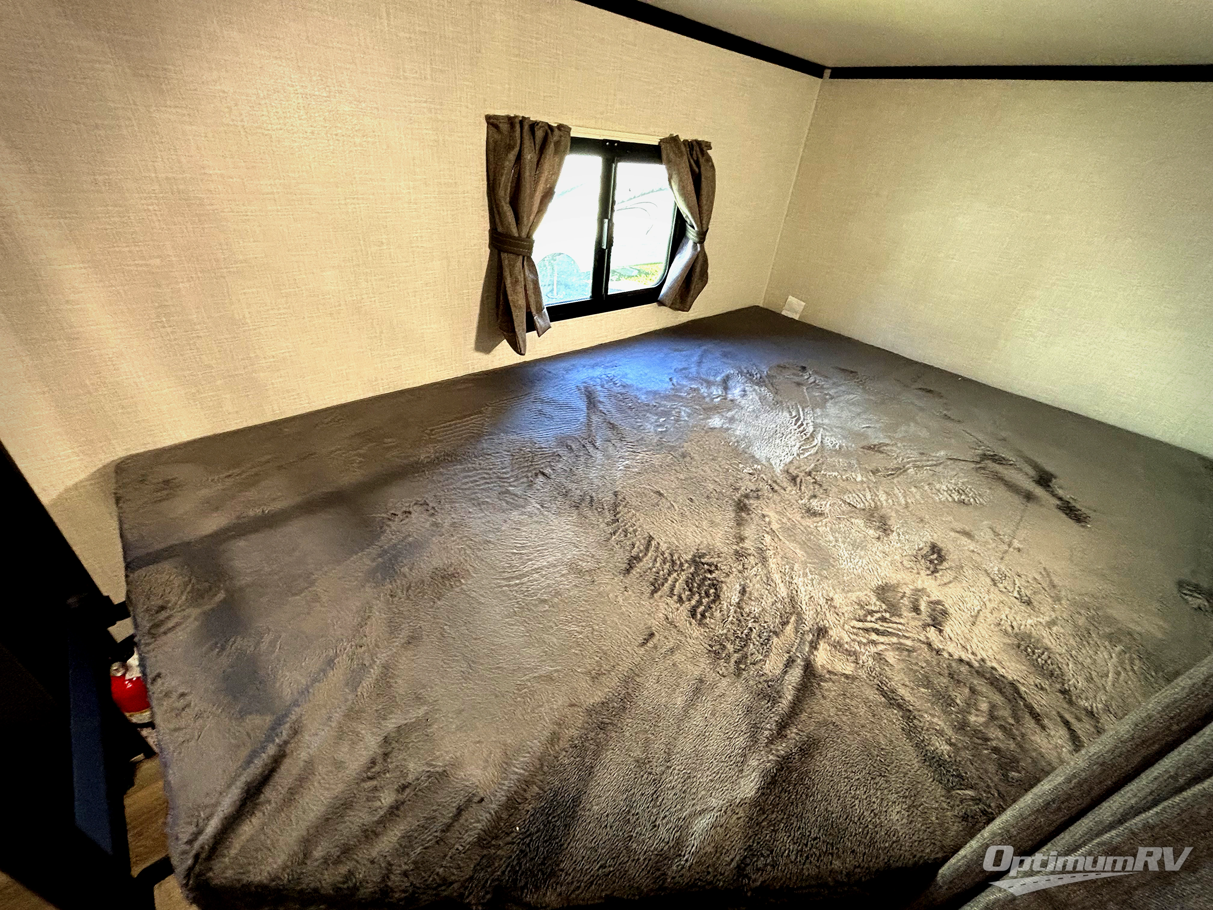 A front private bedroom with a Sleep Tight queen bed is sure to make you feel at home, while your guests take the double-size bunks in the back. There is a full bath right next to the bunks for easy nighttime use, and any other guests can sleep on the U-shaped dinette with flipside reversible cushions. There is plenty of storage space, including a walk-in pantry with coat hooks, dual bedside closets to keep clothes wrinkle-free, and an exterior pass-thru storage for camp gear! A full kitchen inside will let you cook in comfort when the weather isn't cooperating, and an exterior campfire cafe includes an outdoor refrigerator, sink, and griddle for a sunrise breakfast!