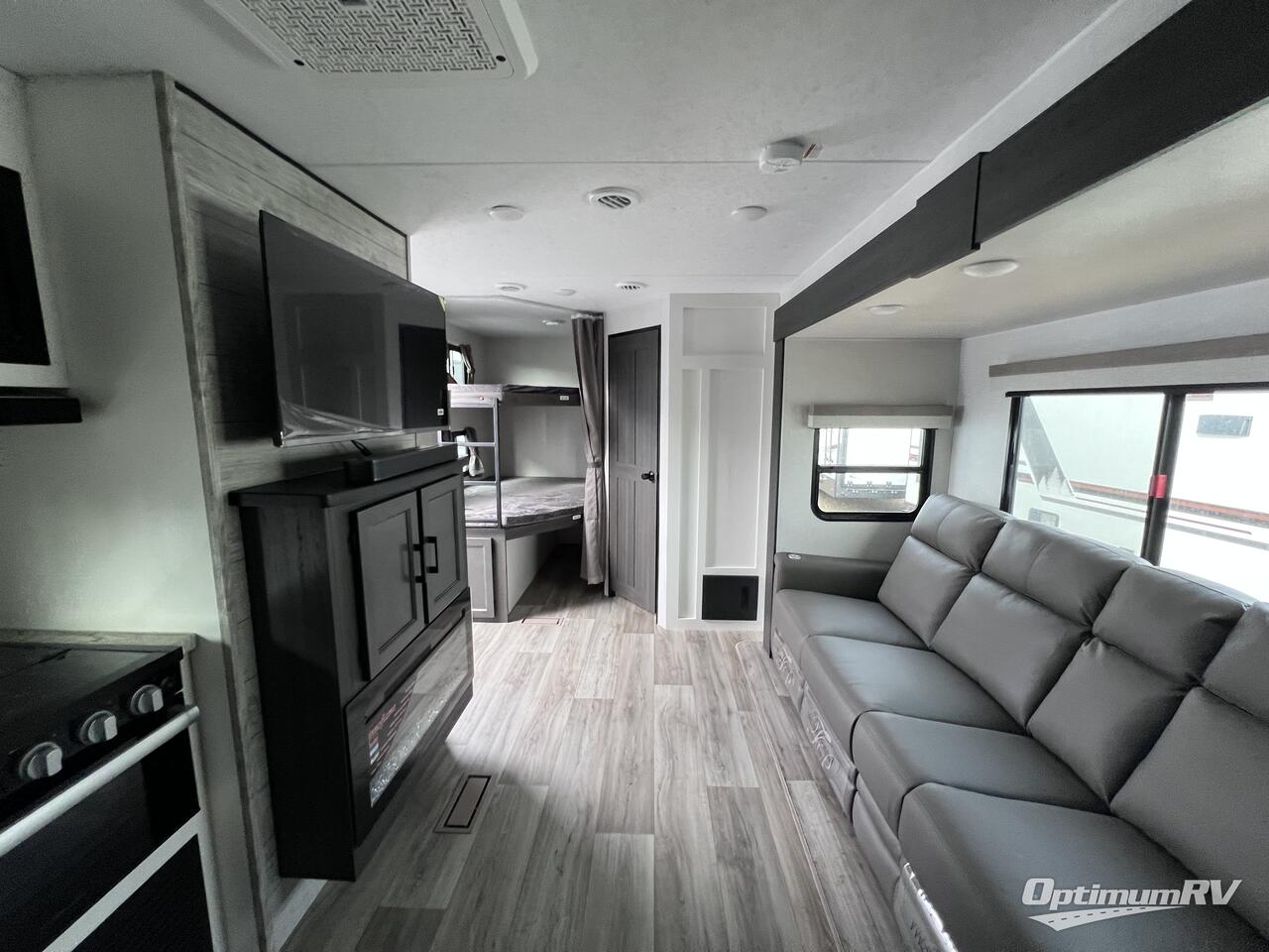 A front private bedroom with a Sleep Tight queen bed is sure to make you feel at home, while your guests take the double-size bunks in the back. There is a full bath right next to the bunks for easy nighttime use, and any other guests can sleep on the U-shaped dinette with flipside reversible cushions. There is plenty of storage space, including a walk-in pantry with coat hooks, dual bedside closets to keep clothes wrinkle-free, and an exterior pass-thru storage for camp gear! A full kitchen inside will let you cook in comfort when the weather isn't cooperating, and an exterior campfire cafe includes an outdoor refrigerator, sink, and griddle for a sunrise breakfast!