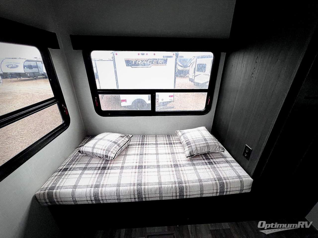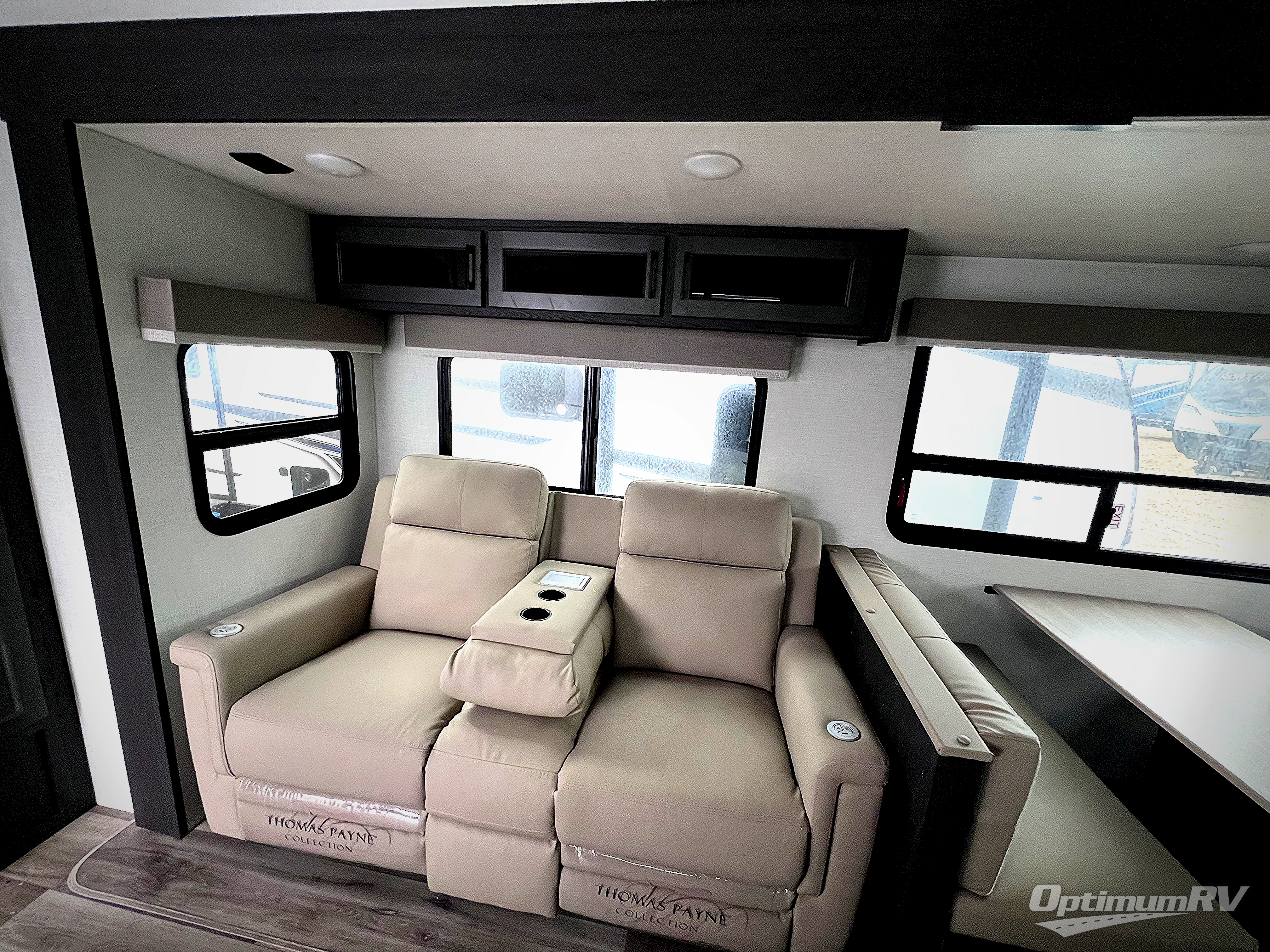 A front kitchen in this travel trailer provides more interior space! Once you have prepared your best meals with the Furrion oven and three burner cooktop, you can head to the Sit N' Slide table with flipside reversible cushions to dine. The 70" sofa also offers a comfortable place to take an afternoon nap or sit while enjoying the entertainment center with a frameless electric fireplace and 40" TV on a swing arm. A walk-thru bath makes it easy for all to enter and has a 30" x 36" shower to freshen up in each morning. The rear private bedroom has a Sleep Tight queen bed slide for a good night's rest, a dresser, two wardrobes, and a bench seat where you sit to put your hiking boots on. You'll also find one of the dual entry doors here for added convenience!