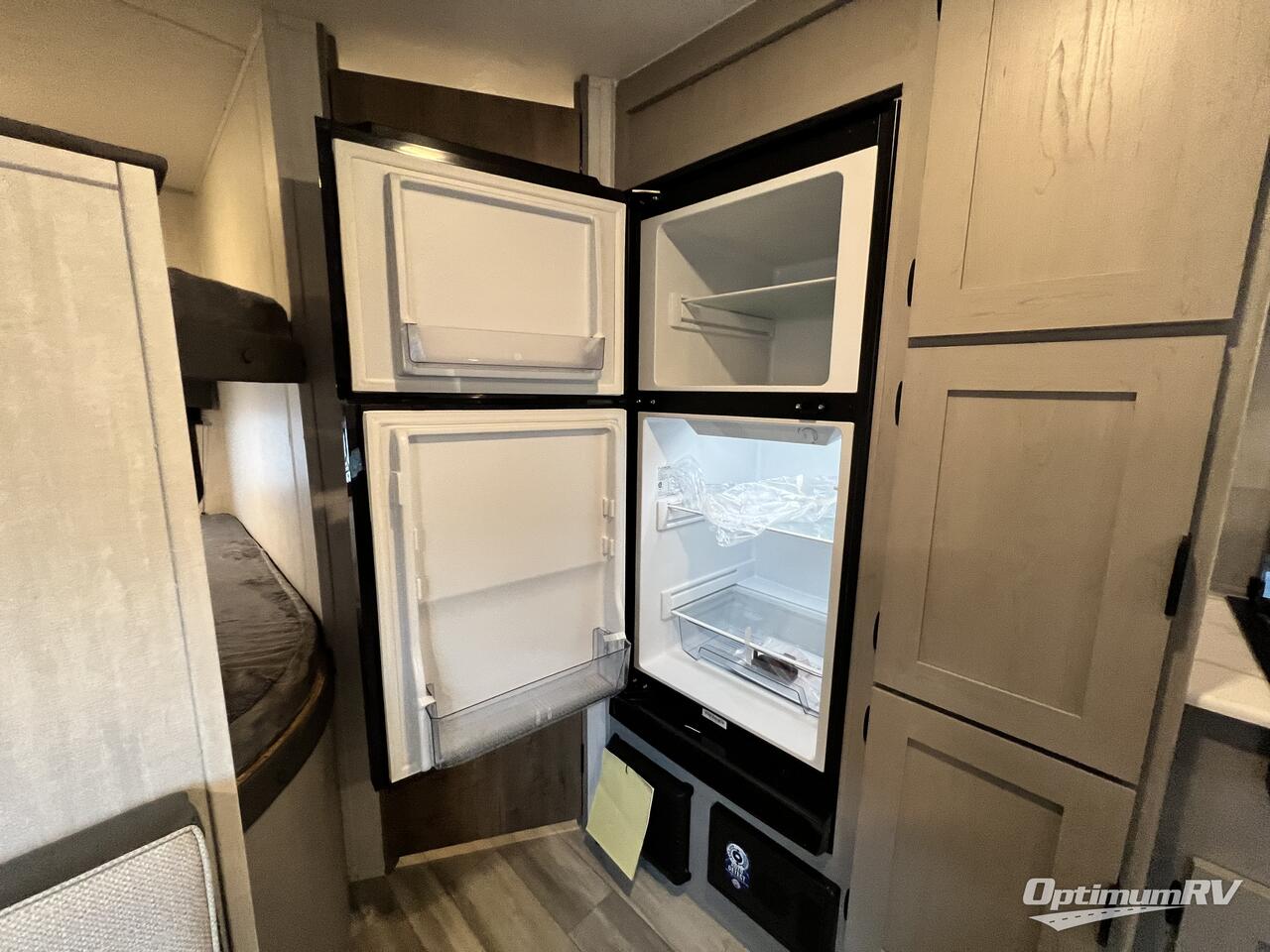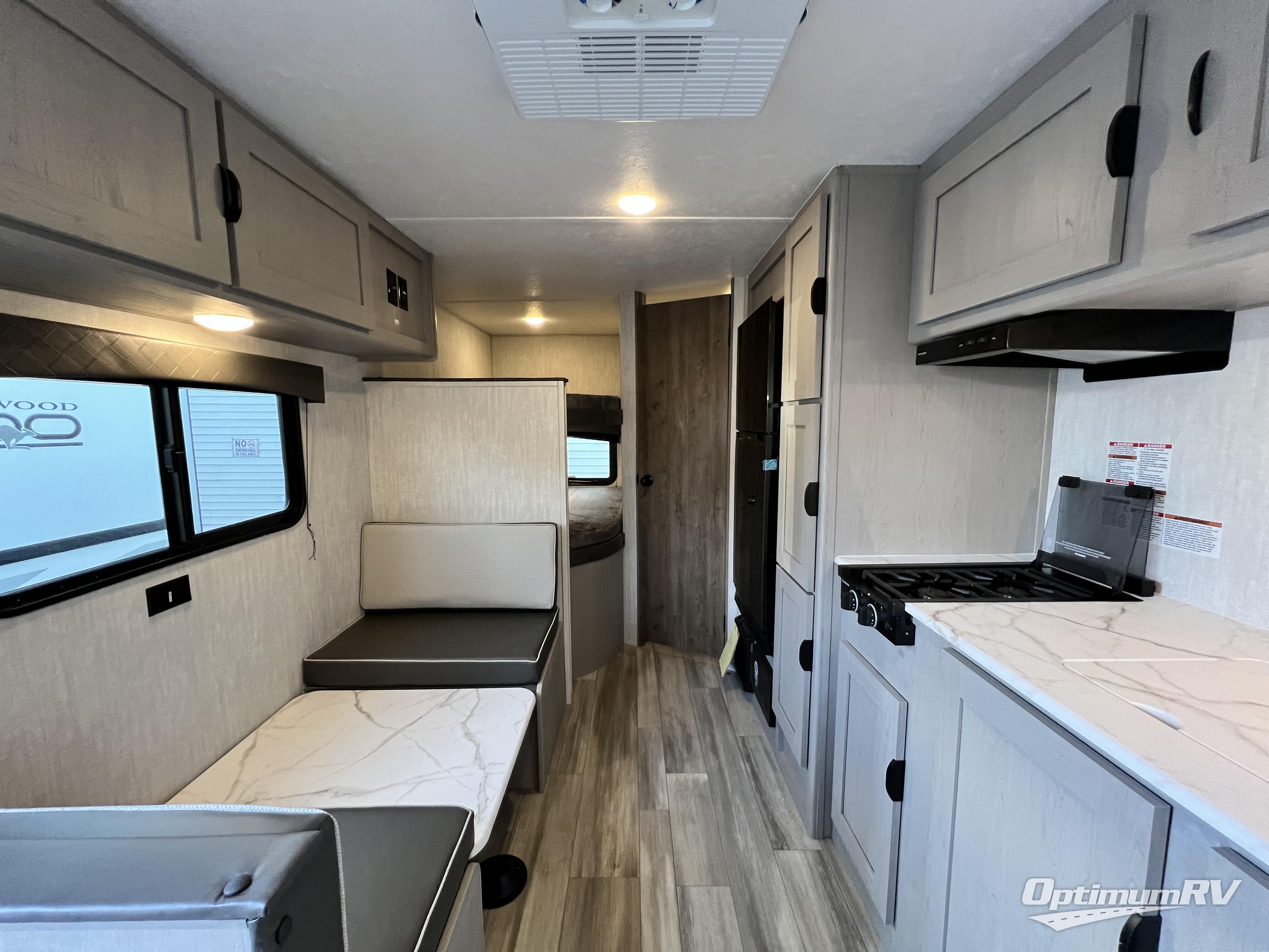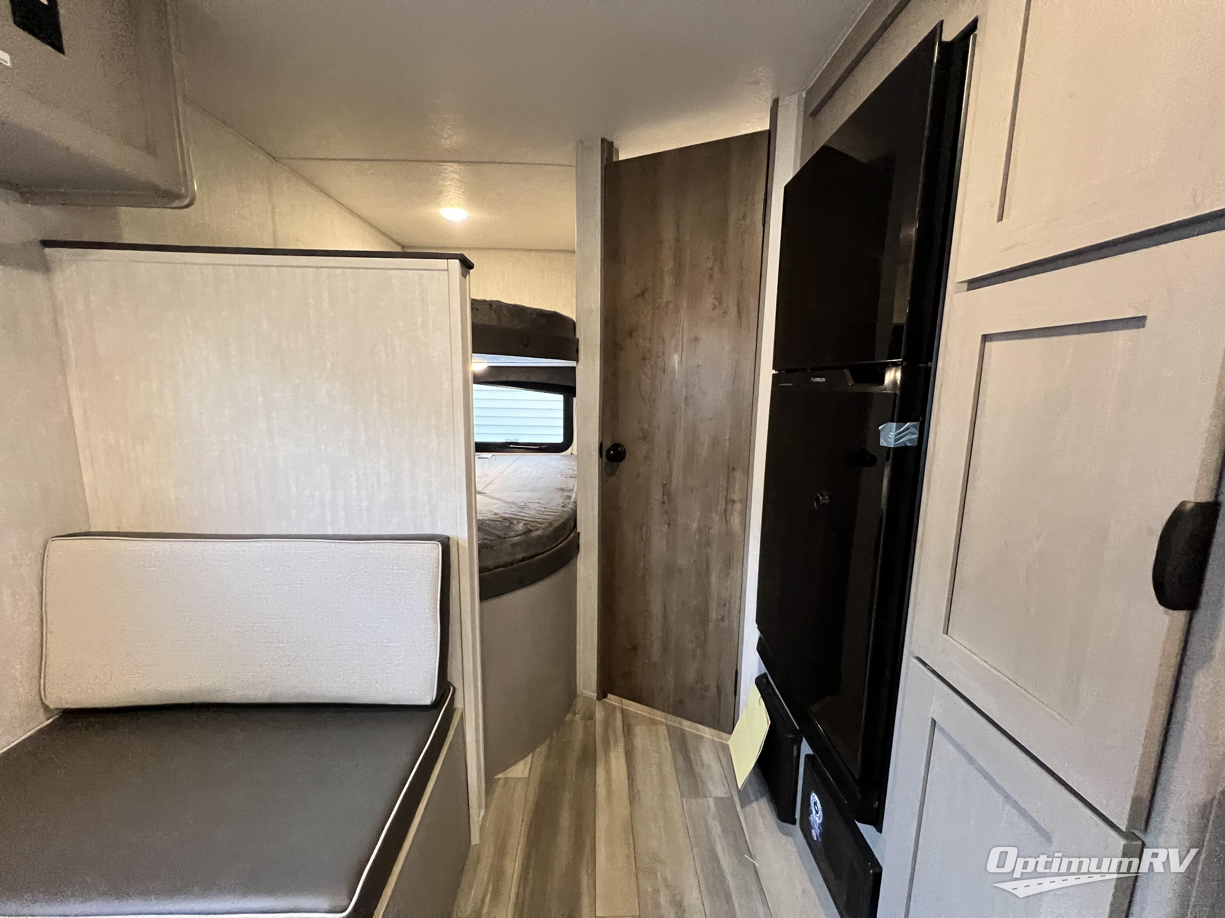 Bring the whole family with you in this travel trailer! The kiddos can sleep on the rear corner set of double bed bunks. The opposite rear corner features a full bath including a 24" x 36" shower, linen cabinet, toilet, and vanity with medicine cabinet overhead. In the main living space, you will find plenty of seating with a booth dinette and jackknife sofa which can also transform into an extra sleeping space if needed. Everyone's bellies will stay full with the two burner cooktop, 11 cu. ft. 12-volt refrigerator, and microwave which you can use to pop a bag of popcorn for movie night. You will enjoy the front bedroom for a bit of privacy including a queen bed and large overhead cabinet for your things. On the outside, a large front pass-through for lawn chairs and camp gear. There is more storage beneath the double bed bunks in back and a nice 10' awning to provide protection from the elements when outdoors.