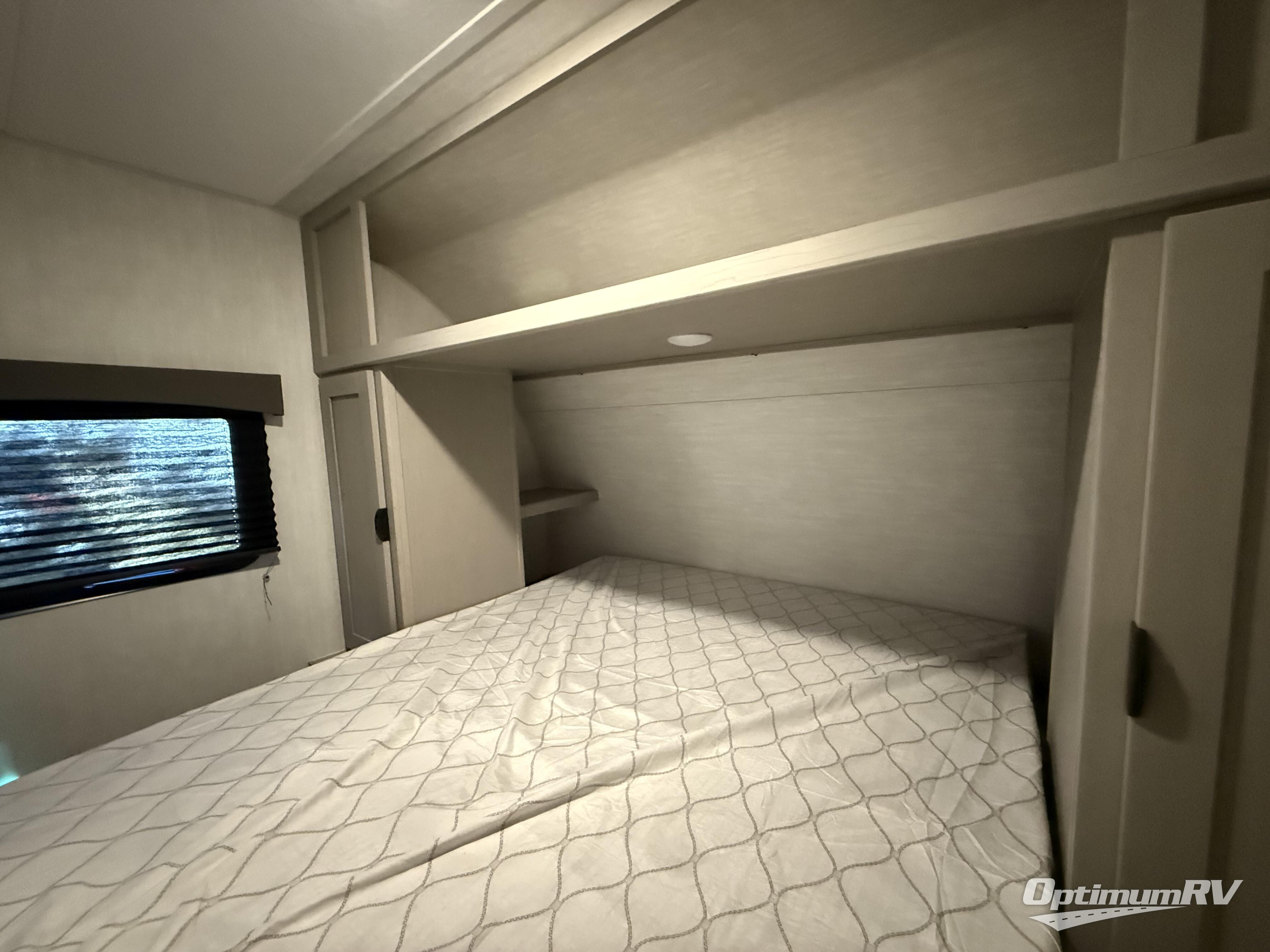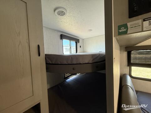 Start planning your trip and loading up your clothes for a fun family or friend get-away with this trailer in tow! The kids or your guests will pack the wardrobe by the double bunk beds in the rear which include steps leading up to them, and you can place your clothes in the wardrobes in the front private bedroom which includes the second entry/exit door for convenience. The main kitchen and living area is spacious with a slide out, and everyone can gather around the U-shaped dinette and sofa to visit, eat, and plan their day.  The outside camp kitchen allows you to make meals easily outdoors, and you'll find a three burner range with an oven indoors to bake a casserole for dinner. The exterior also offers an outside shower to wash off the dirt from the day, and a 16' power awning to relax in the shade!