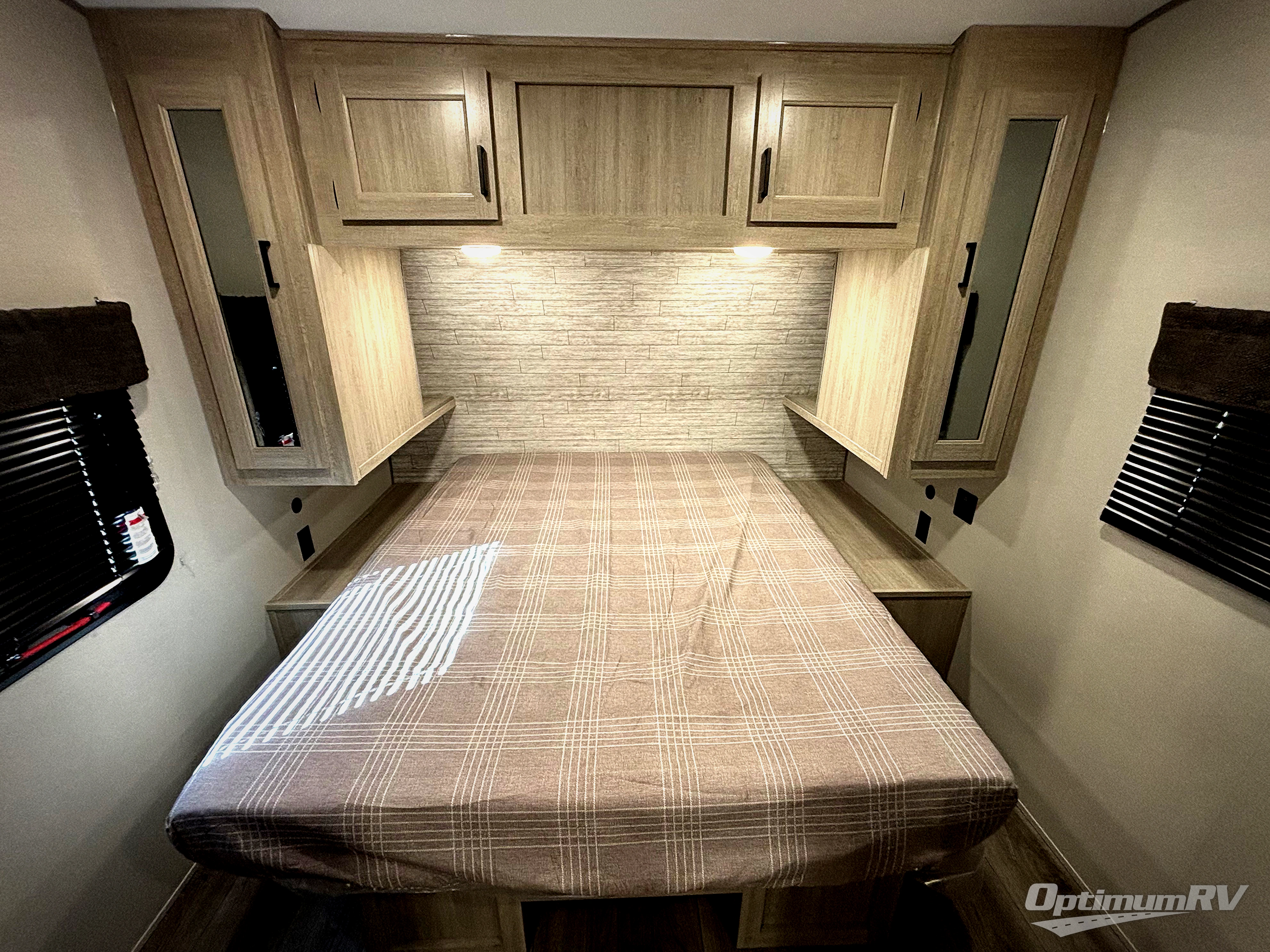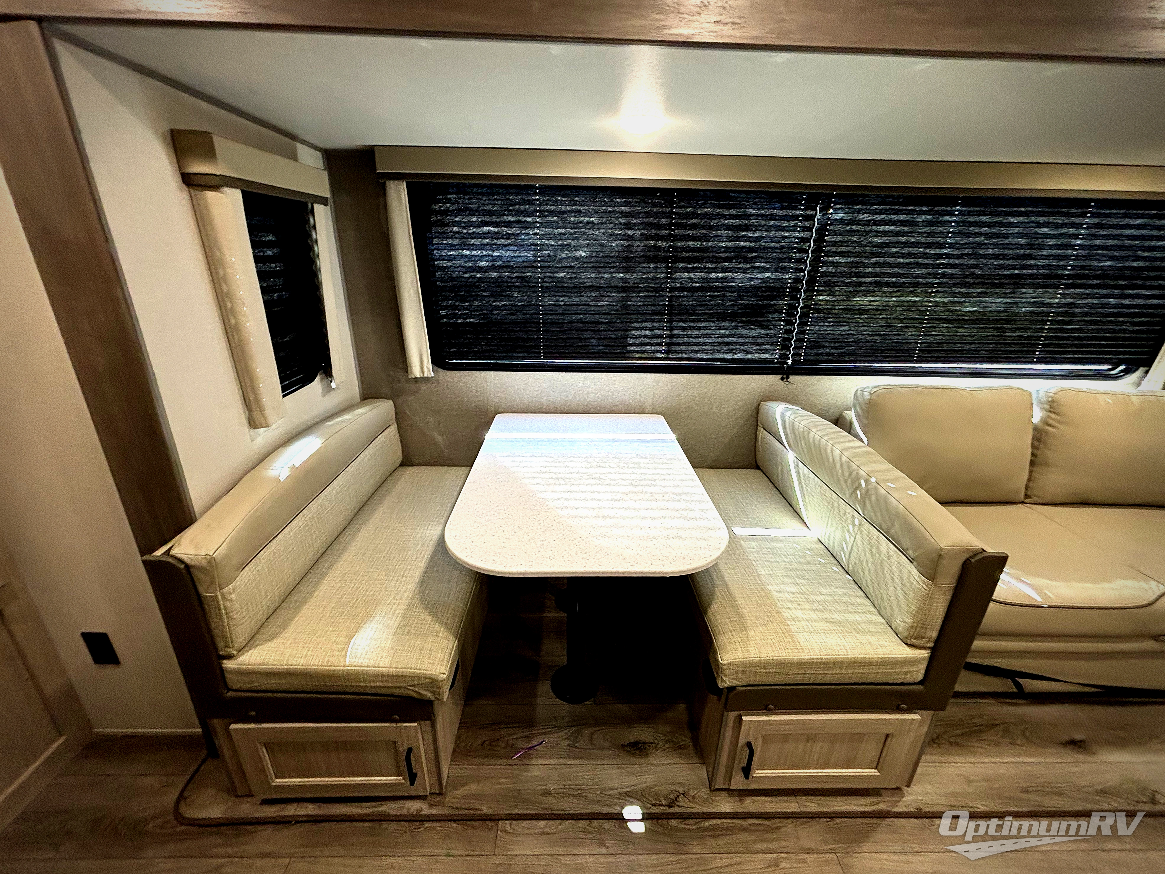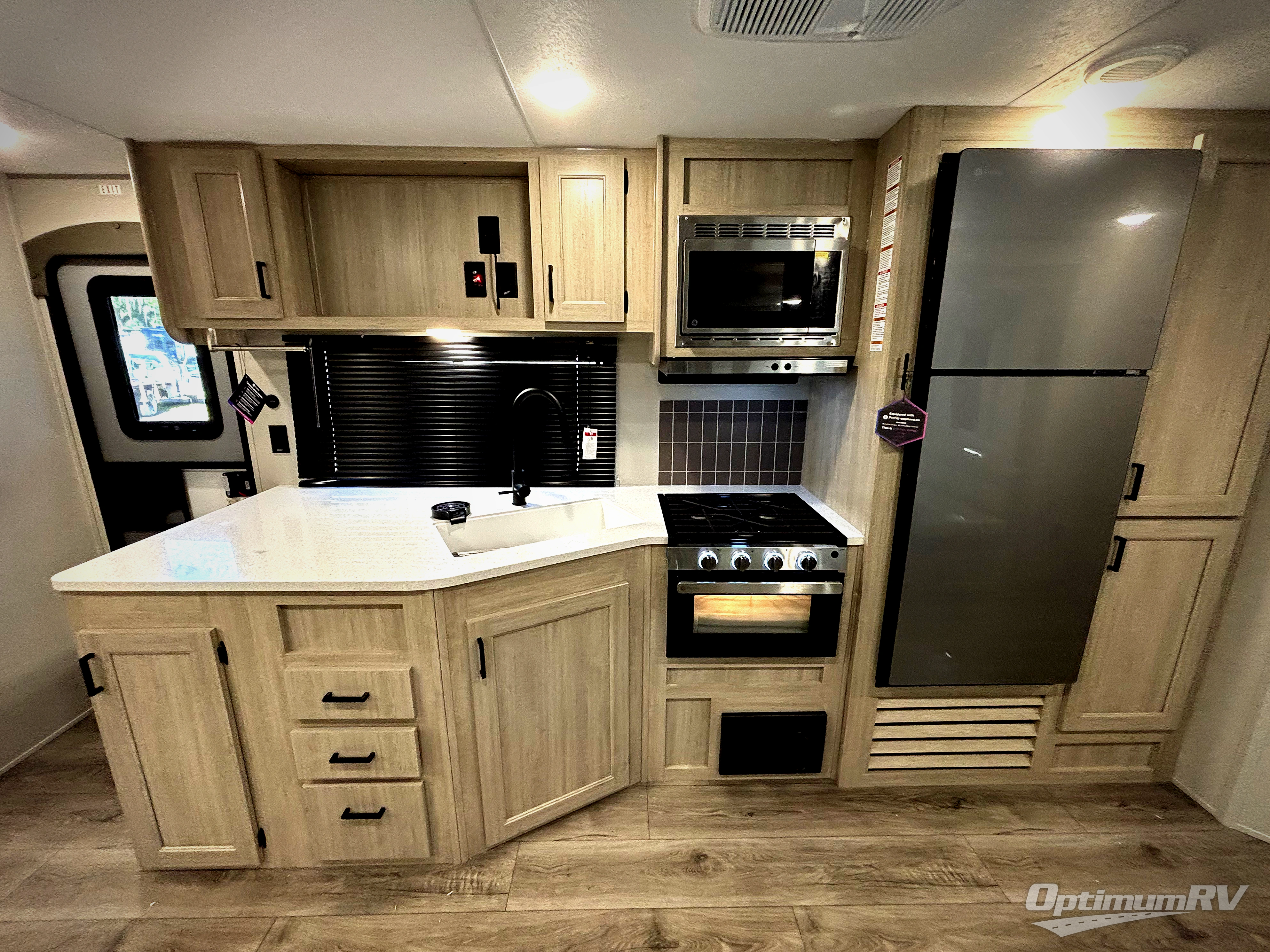 This half-ton friendly trailer is easy to pull and park and is spacious thanks to the large slide out in the main living and kitchen area! You can dine at the booth dinette or choose the free-standing dinette option, and the trundle sofa offers drink holders for your drink when you're relaxing. The rear corner offers a full bathroom and a large wardrobe/pantry for the storage you need. The galley kitchen offers full amenities plus a breakfast bar where you can set out fresh fruit and cereal. And the 15' awning provides protection from the elements plus has the choice of multiple LED colors with the use of the remote.