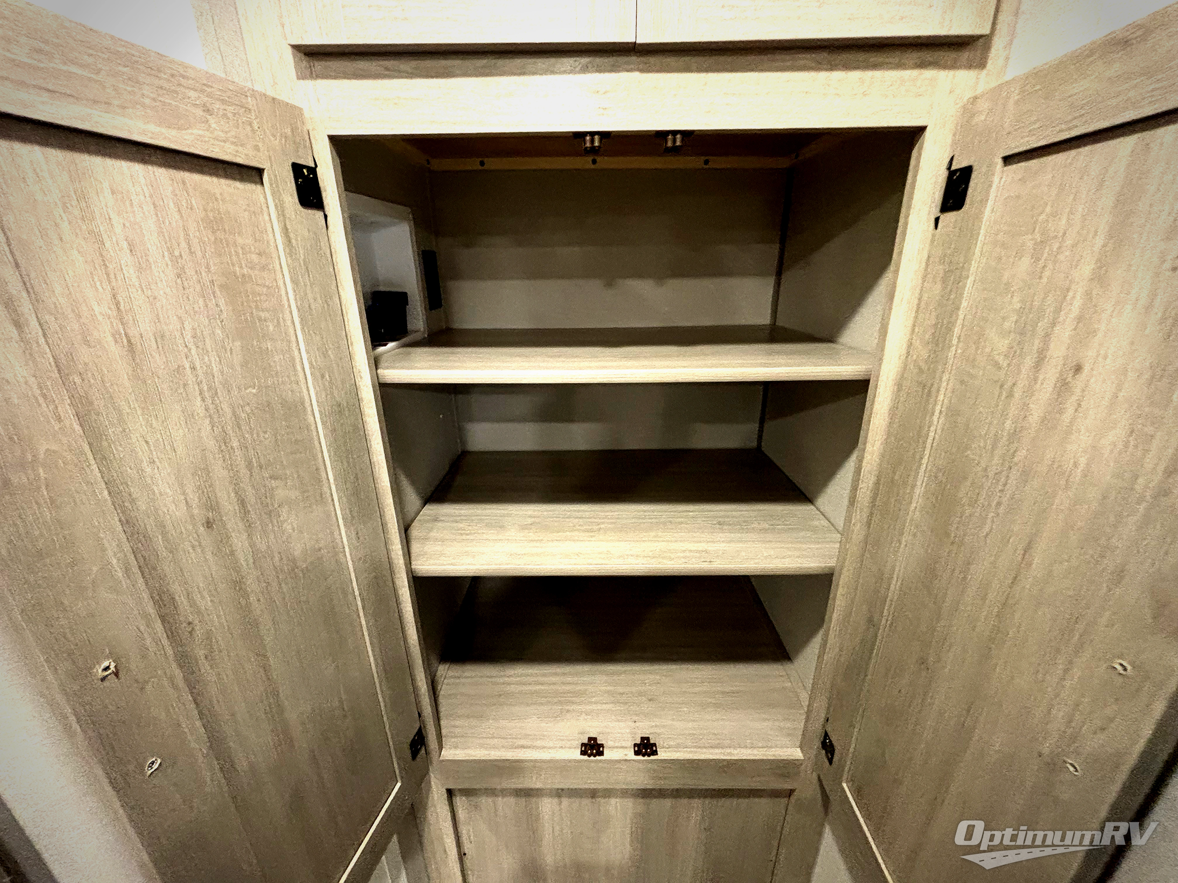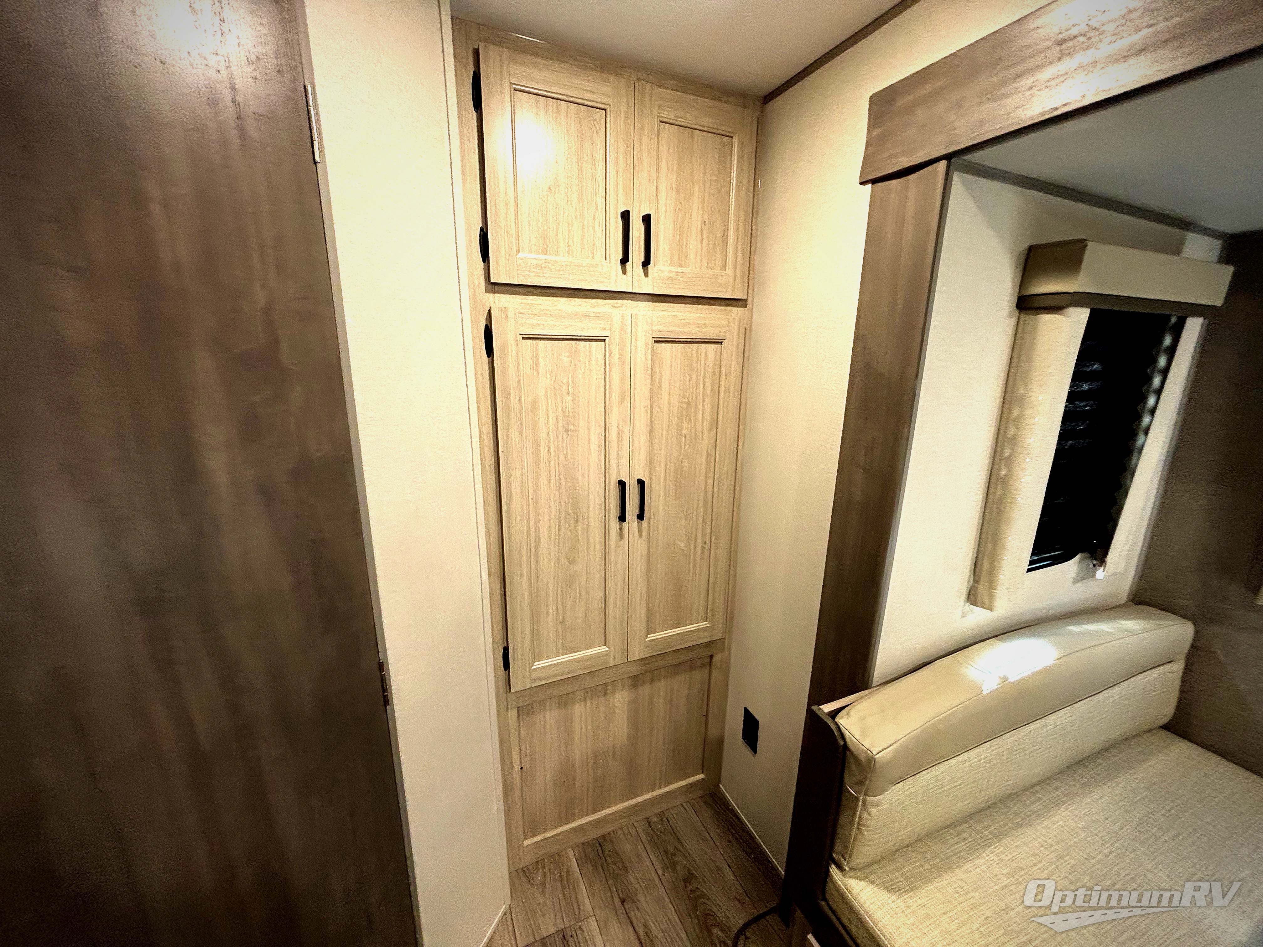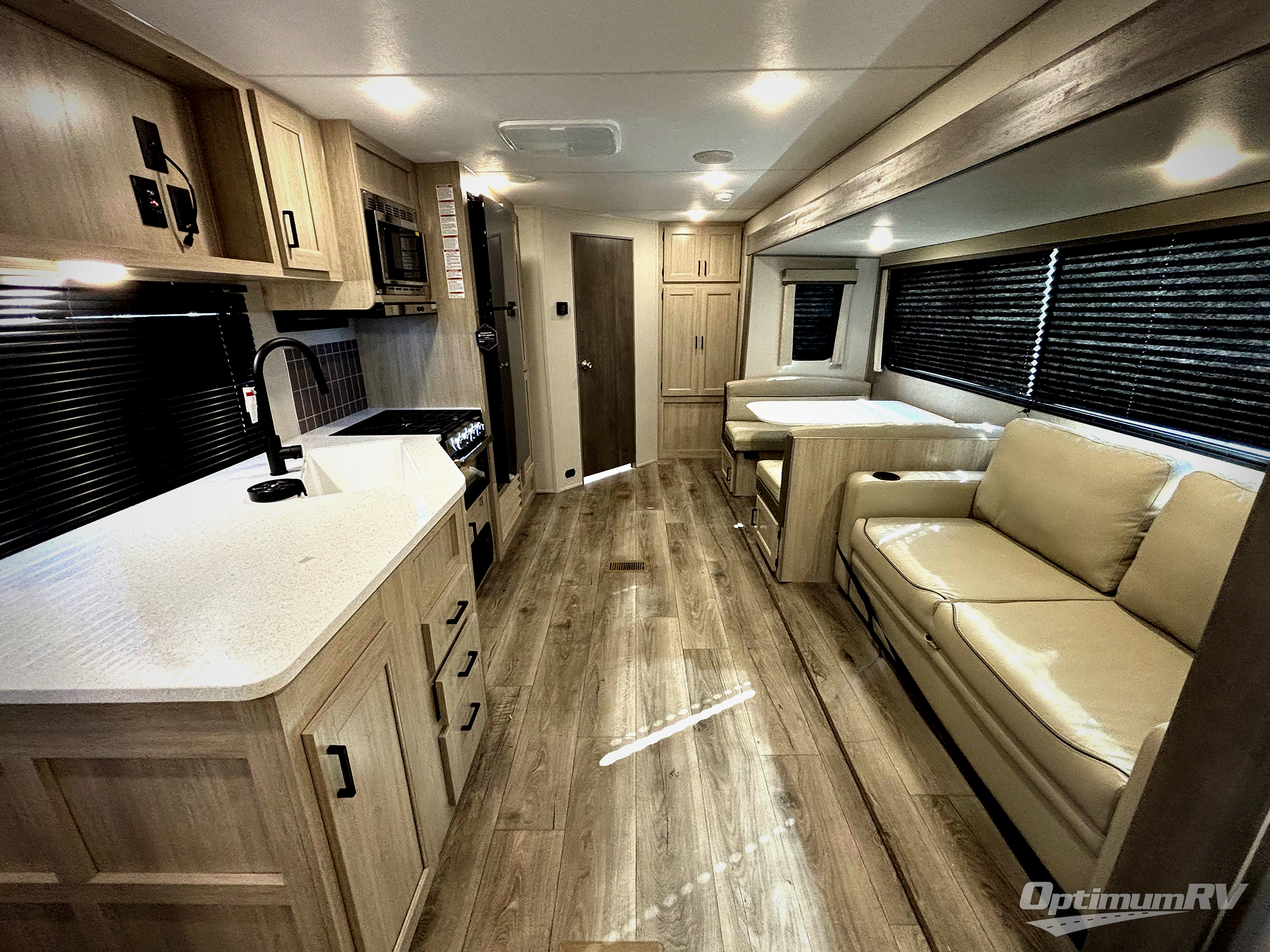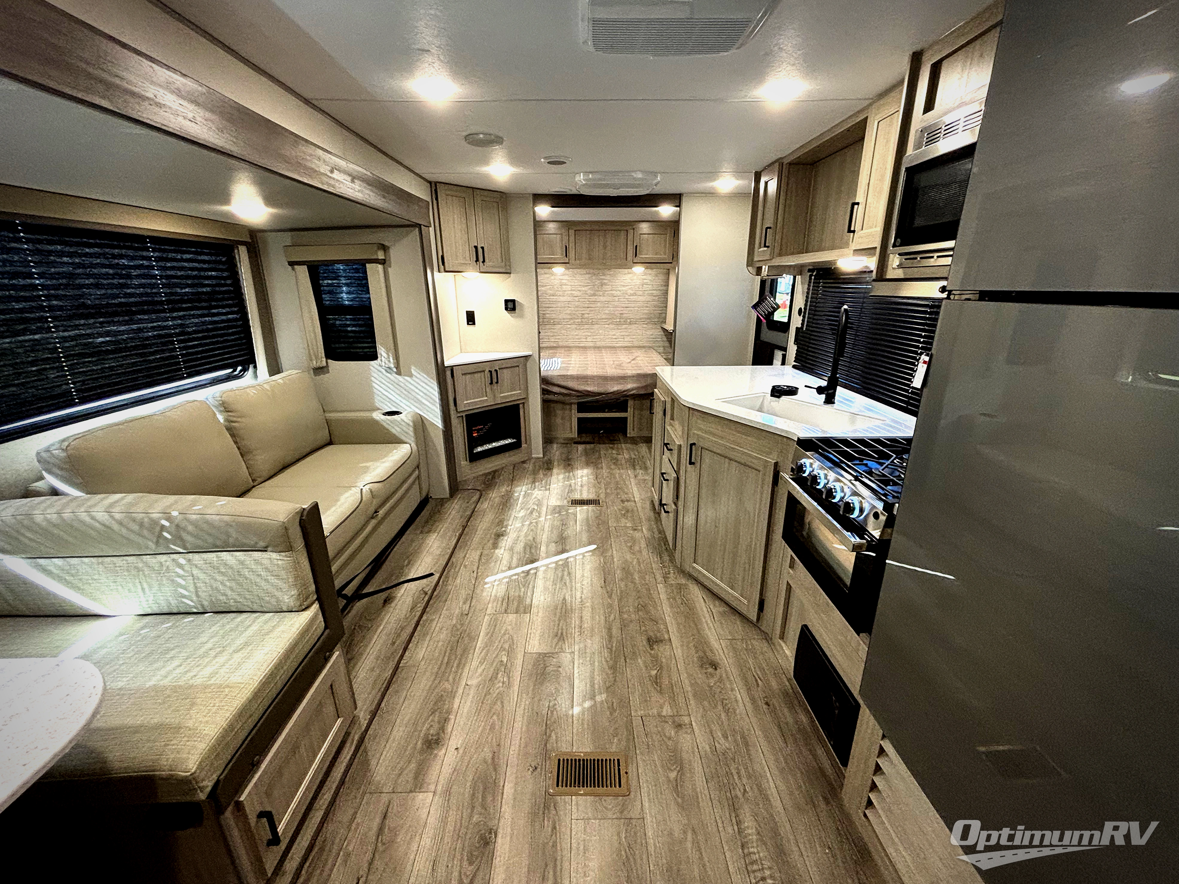 This half-ton friendly trailer is easy to pull and park and is spacious thanks to the large slide out in the main living and kitchen area! You can dine at the booth dinette or choose the free-standing dinette option, and the trundle sofa offers drink holders for your drink when you're relaxing. The rear corner offers a full bathroom and a large wardrobe/pantry for the storage you need. The galley kitchen offers full amenities plus a breakfast bar where you can set out fresh fruit and cereal. And the 15' awning provides protection from the elements plus has the choice of multiple LED colors with the use of the remote.