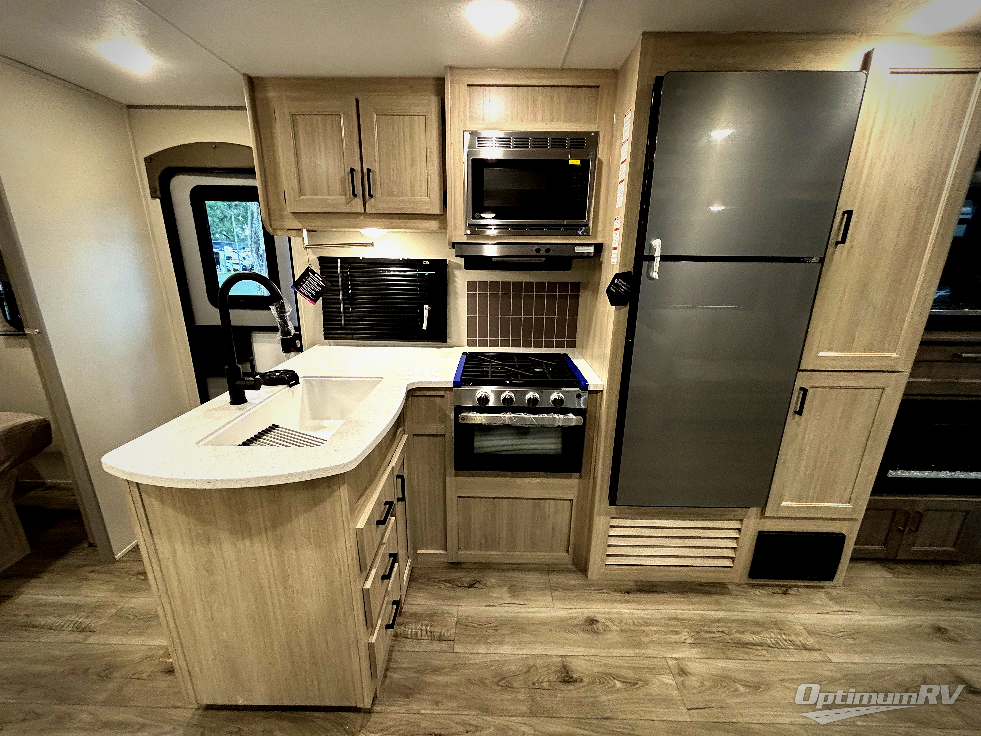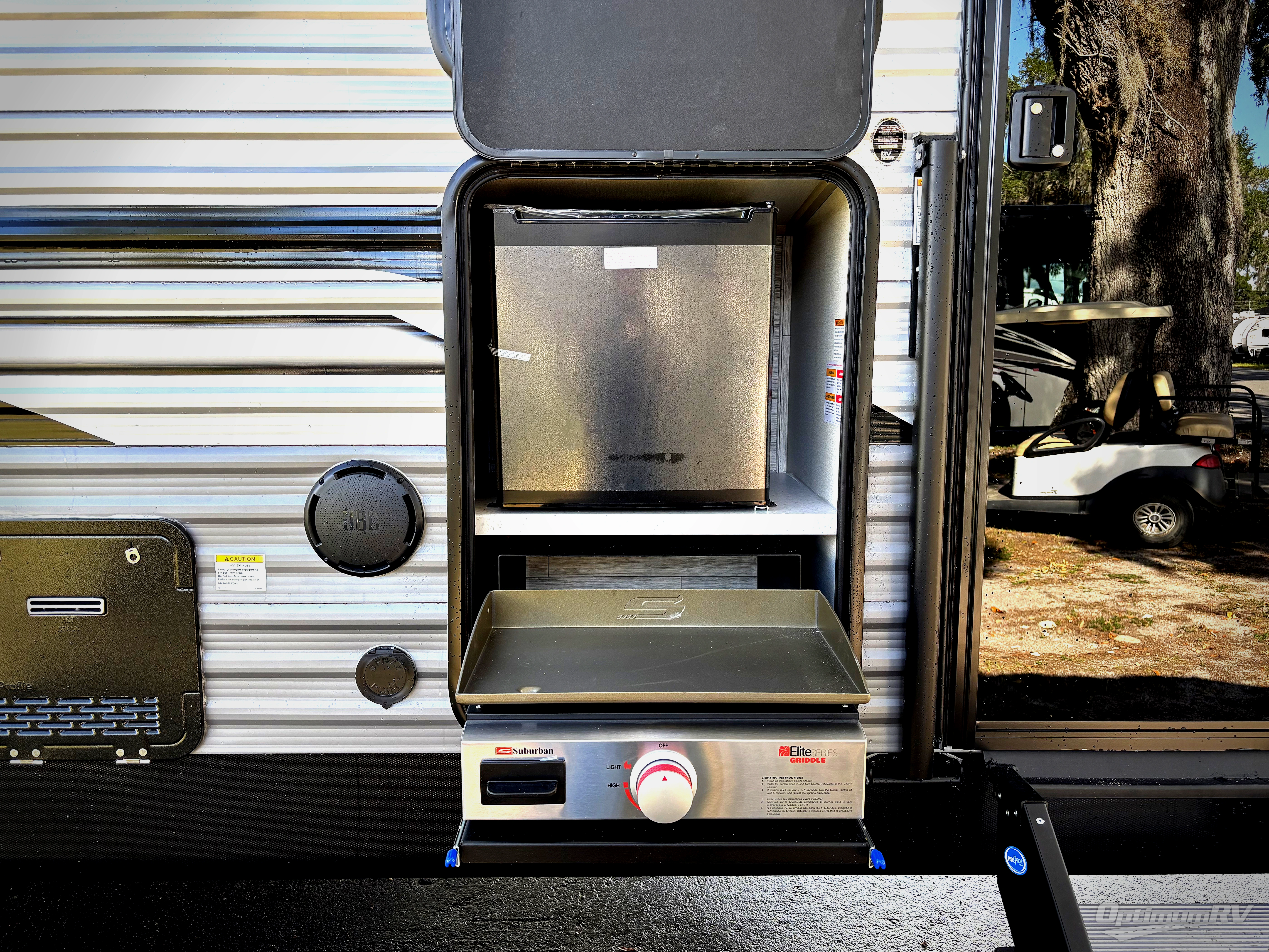 This travel trailer is perfect for your whole crew! Once you arrive at the campground, you can put out the 21' electric awning and start lunch on the exterior camper kitchen with a griddle and mini fridge. There is also a pass-thru storage plus additional exterior storage with a fold-down table and a TV hookup for added convenience. And since there are dual entry doors found on this unit, you can enter in through the full bath in the back, or the main living area towards the front! A large slide provides ample space to move about, and you'll find a trundle sofa and U-shaped dinette here for cozy seating and sleeping space. Speaking of sleeping, there is a front RV queen bed in the bedroom plus double-size bunks in the back for guests!