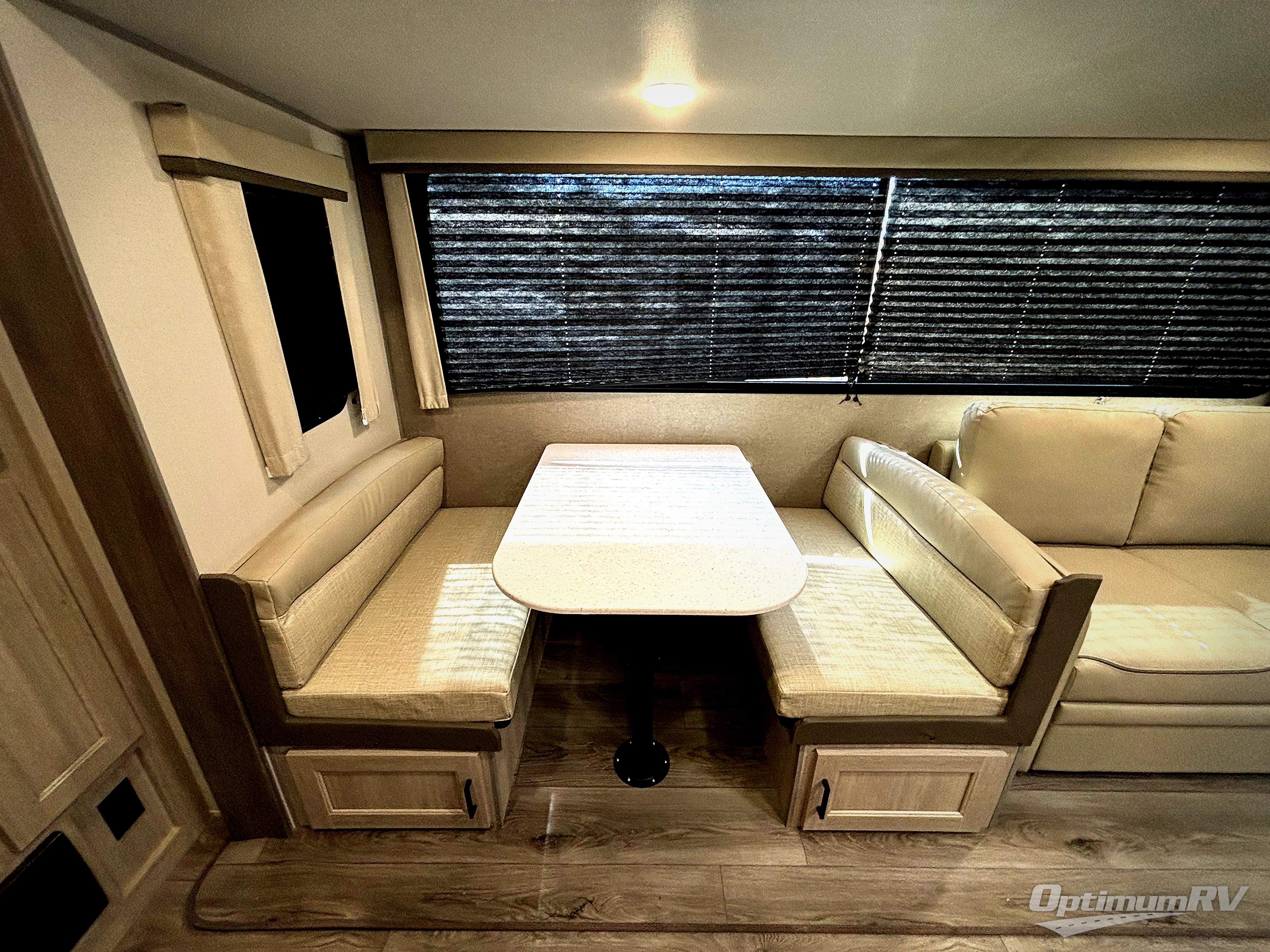 This family-friendly trailer offers lots of floor space thanks to the triple slides throughout! You and your family will love the combined living and kitchen area with a slide out booth dinette and a sofa with drink holders. The L-shaped kitchen counter allows the cook to make meals without moving for anyone trying to get to the full bathroom or the rear bunkhouse. The kids will have their own privacy, two bunk beds, a jack knife sofa with storage totes below plus a TV/wardrobe cabinet. The front private bedroom allows you to sleep like royalty and offers a large closet for your clothing and another closet prepped for a washer/dryer. And don't forget about the full-size camper kitchen and the 21' power awning with multicolor LED lights when you are outside.