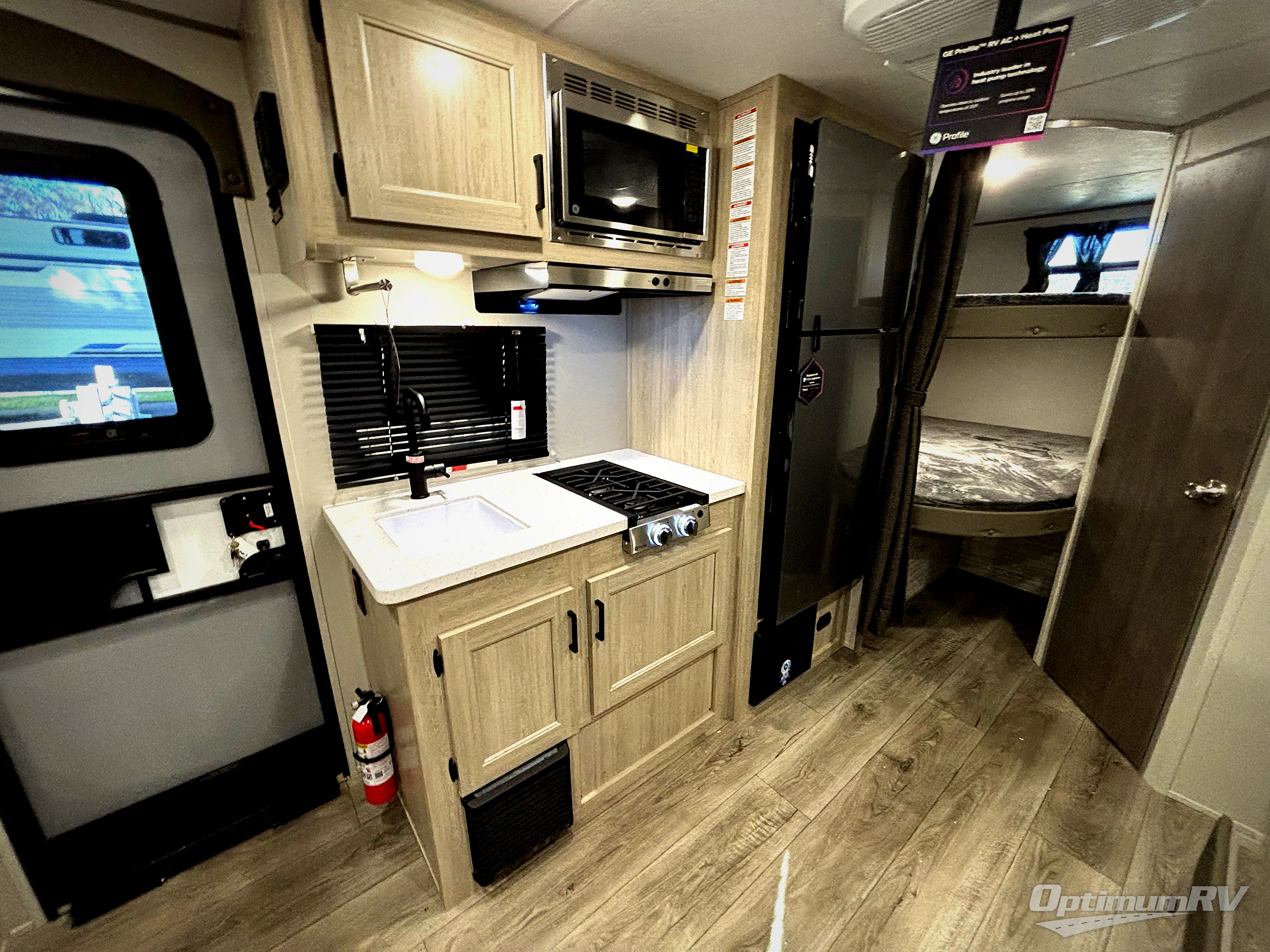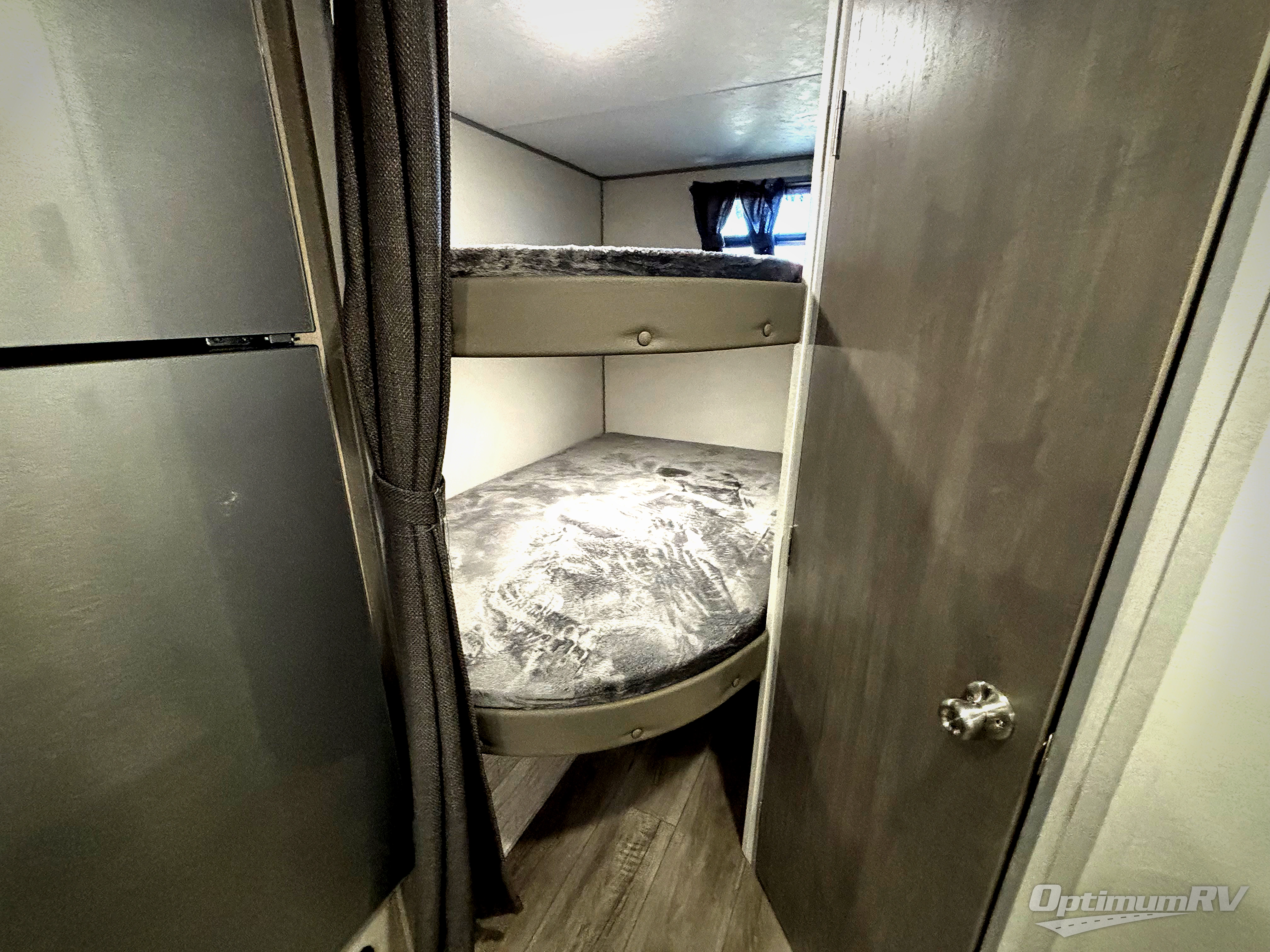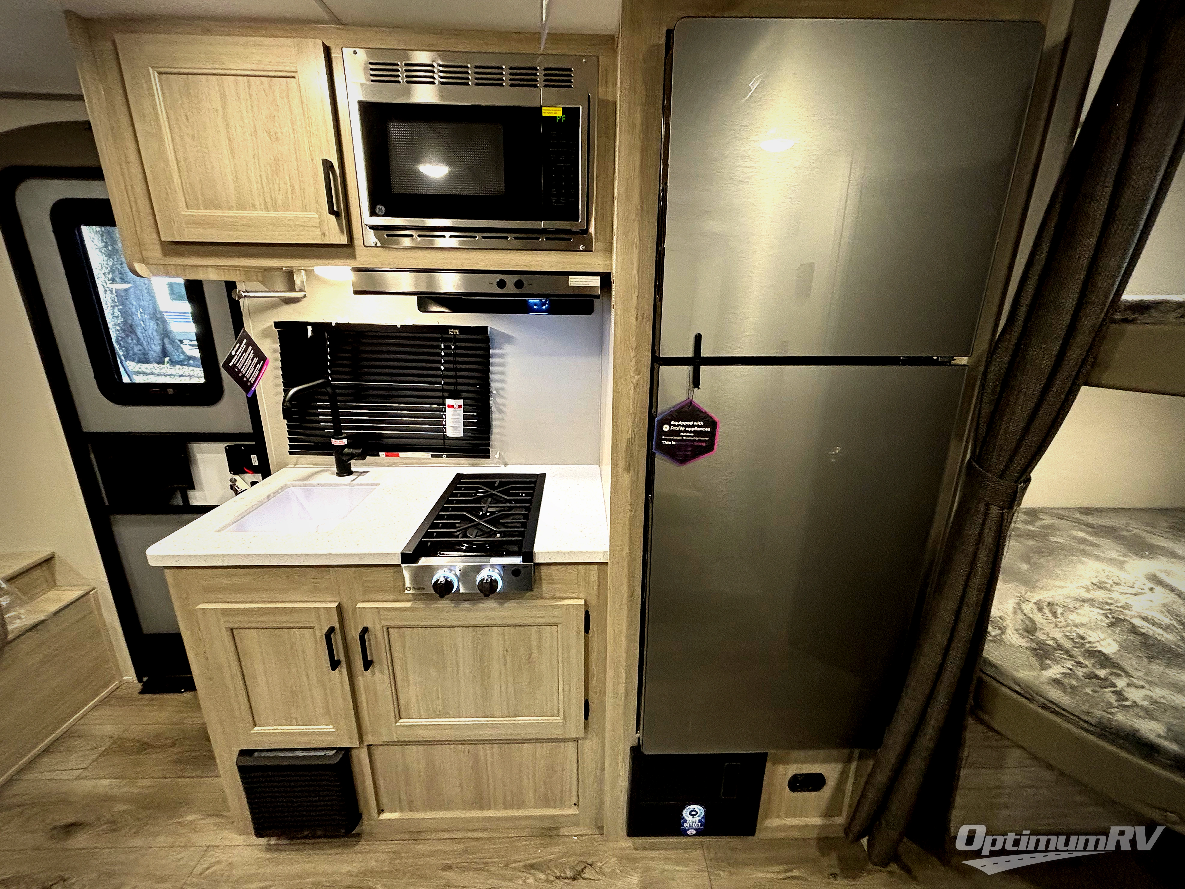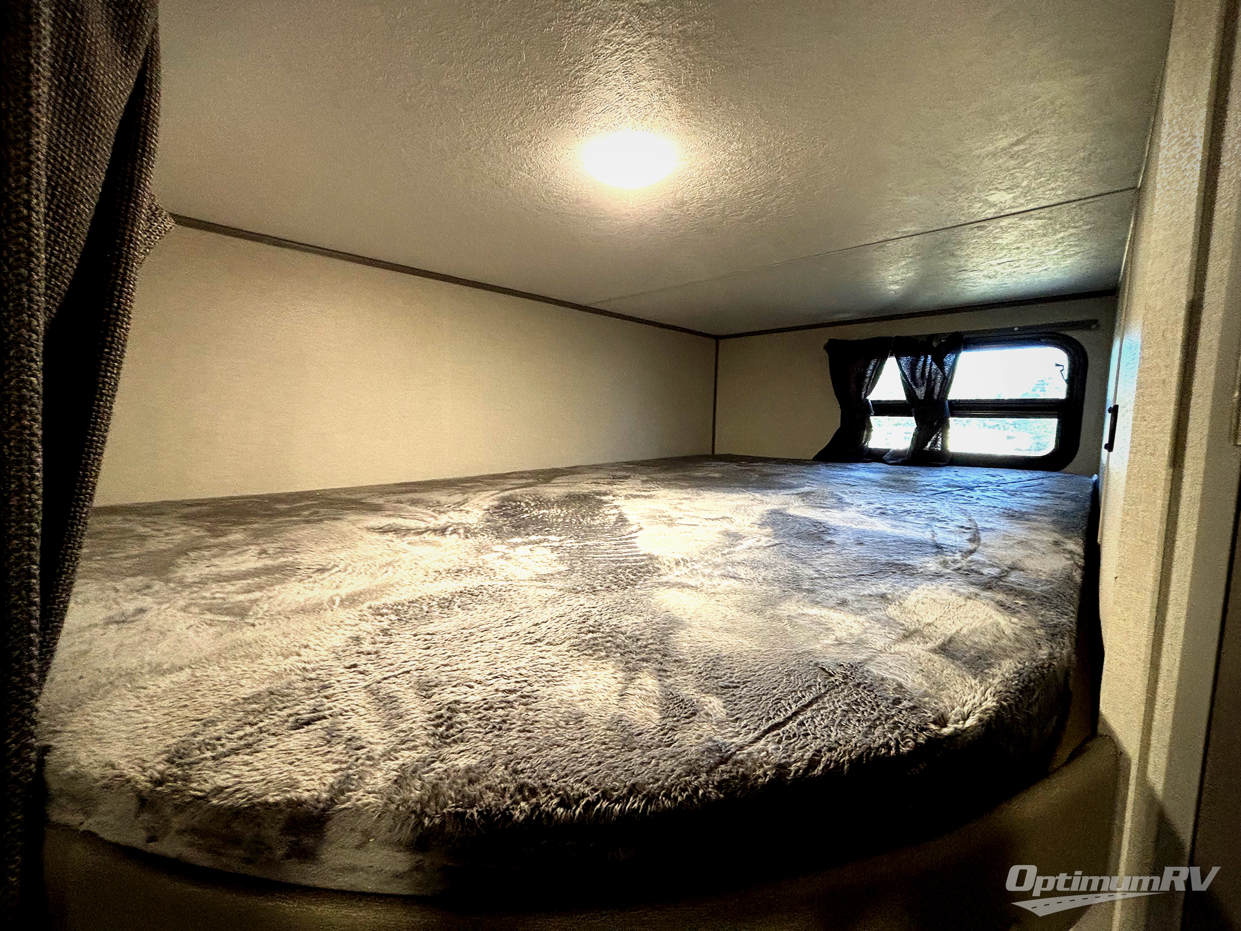 This spacious travel trailer can sleep eight campers each night thanks to the double-size bunks in the back, the U-shaped dinette within the slide out, and the queen bed up front! You can easily make meals for your crew with the two burner cooktop and microwave oven, and leftovers can go in the 10.7 cu. ft. 12V refrigerator! After you've cleaned up in the full bath, head outdoors to relax under the 15' power awning with multicolor LED lights and a remote!
