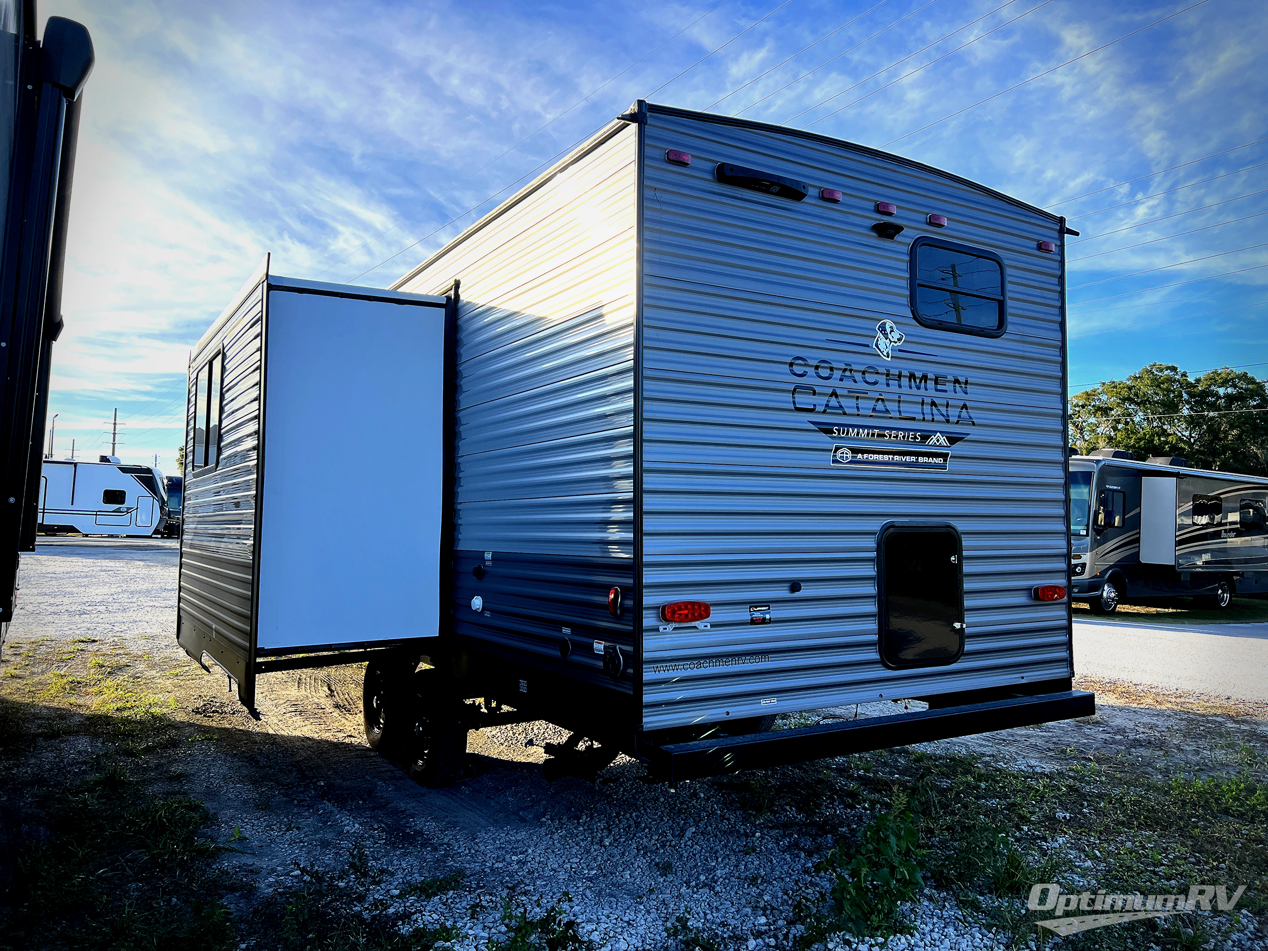 With any Catalina Summit Series 8 by Coachmen you will enjoy an affordable travel trailer packed with at-home comforts! The solid construction includes a Norco electromagnetic powder coated chassis, a seamless Alpha roof membrane, and full length frame outriggers for maximum support and durability. EZ lube axles with leaf spring suspension and self-adjusting brakes provide smooth towing from home to campground, and the premium exterior graphics package is sure to turn heads as you travel down the highway. You will love the features included, such as a JBL Aura Cube media center, magnetic baggage door latches, 4,000 lumen interior touch lighting, and the list goes on!