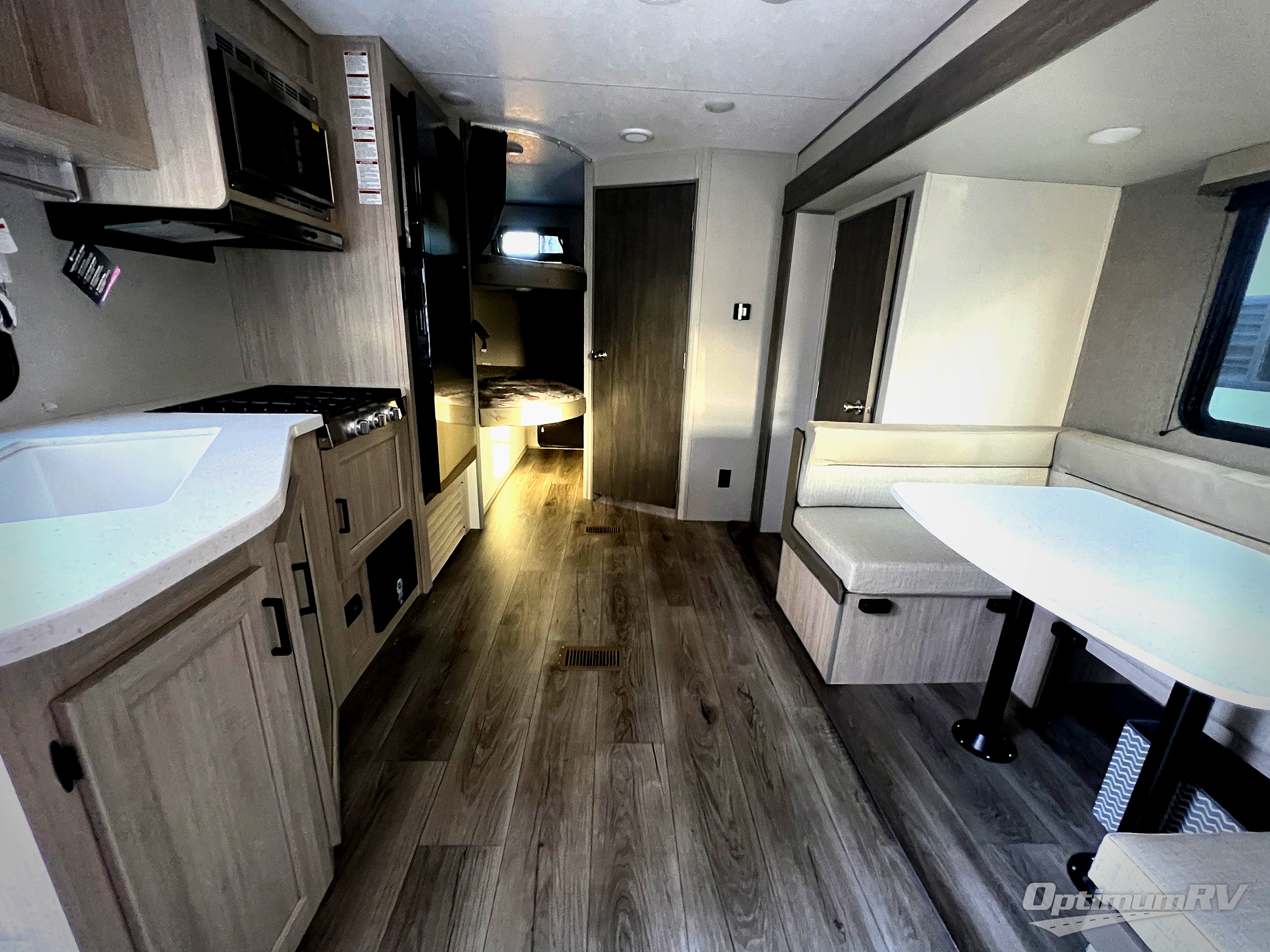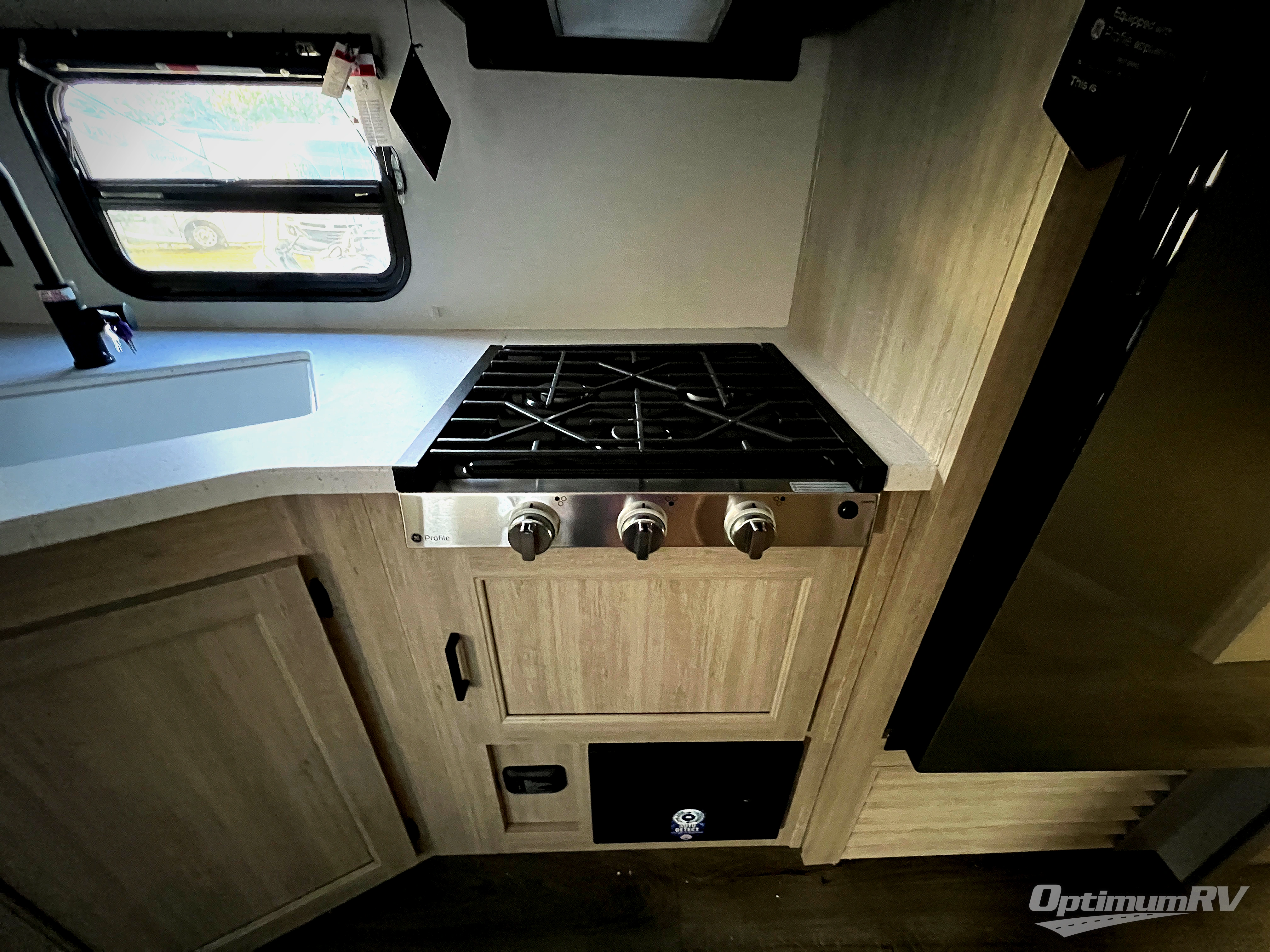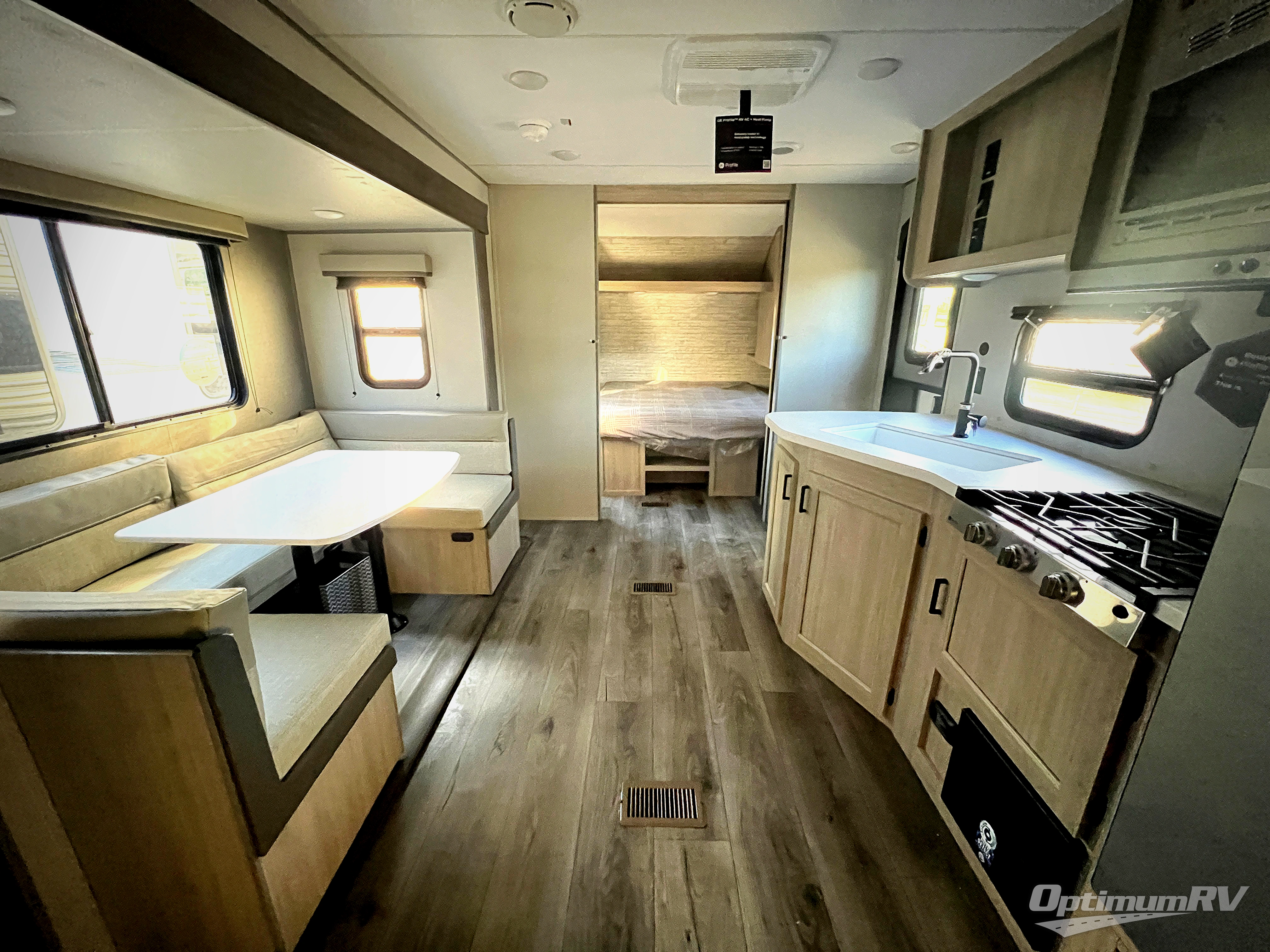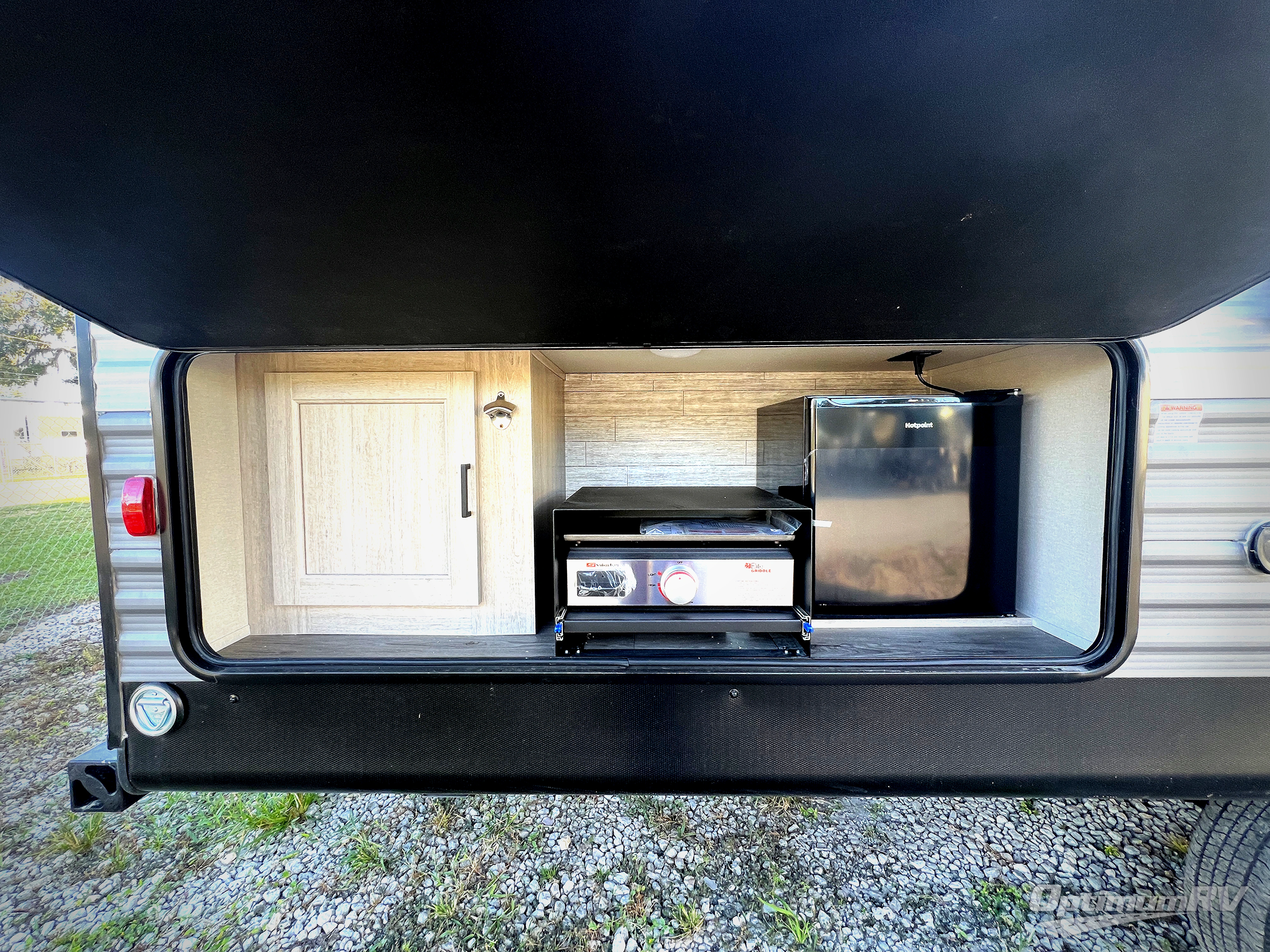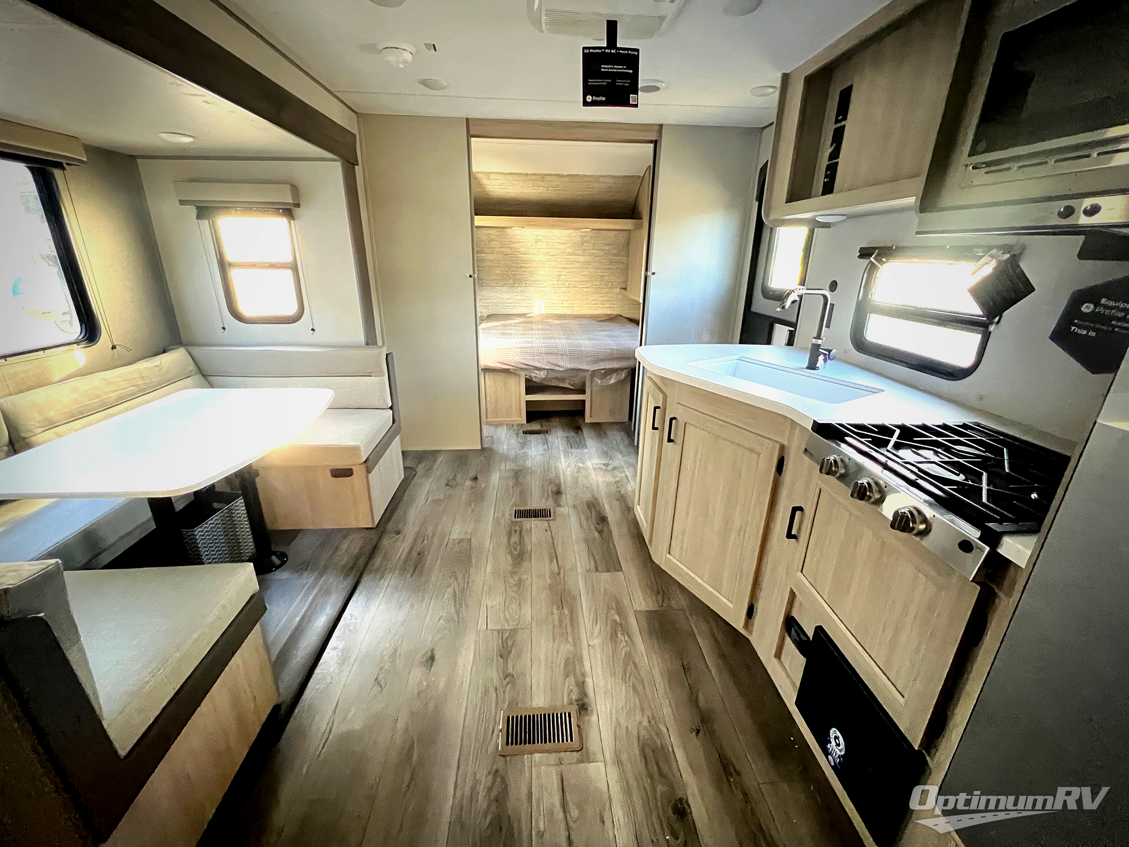 This is the perfect mid-size travel trailer for you and your family! The double-size bunks offer a comfortable sleeping space for the kids and you will have your own private sleeping space with a queen bed in the front bedroom. Freshen up each day in the rear corner bathroom with the tub/shower and a mirror to get ready each morning. You can prepare your best home cooked meals with the GE stainless three burner cooktop and GE stainless 10.7 cu. ft. 12V refrigerator, then enjoy them together at the u-shaped dinette. There is also a large pantry to store all your goods. Don't leave any of your outdoor gear behind either, thanks to the front pass-through storage area and the exterior outside storage area. You could even add the optional outside camper kitchen to grill the catch of the day on the pull out griddle!