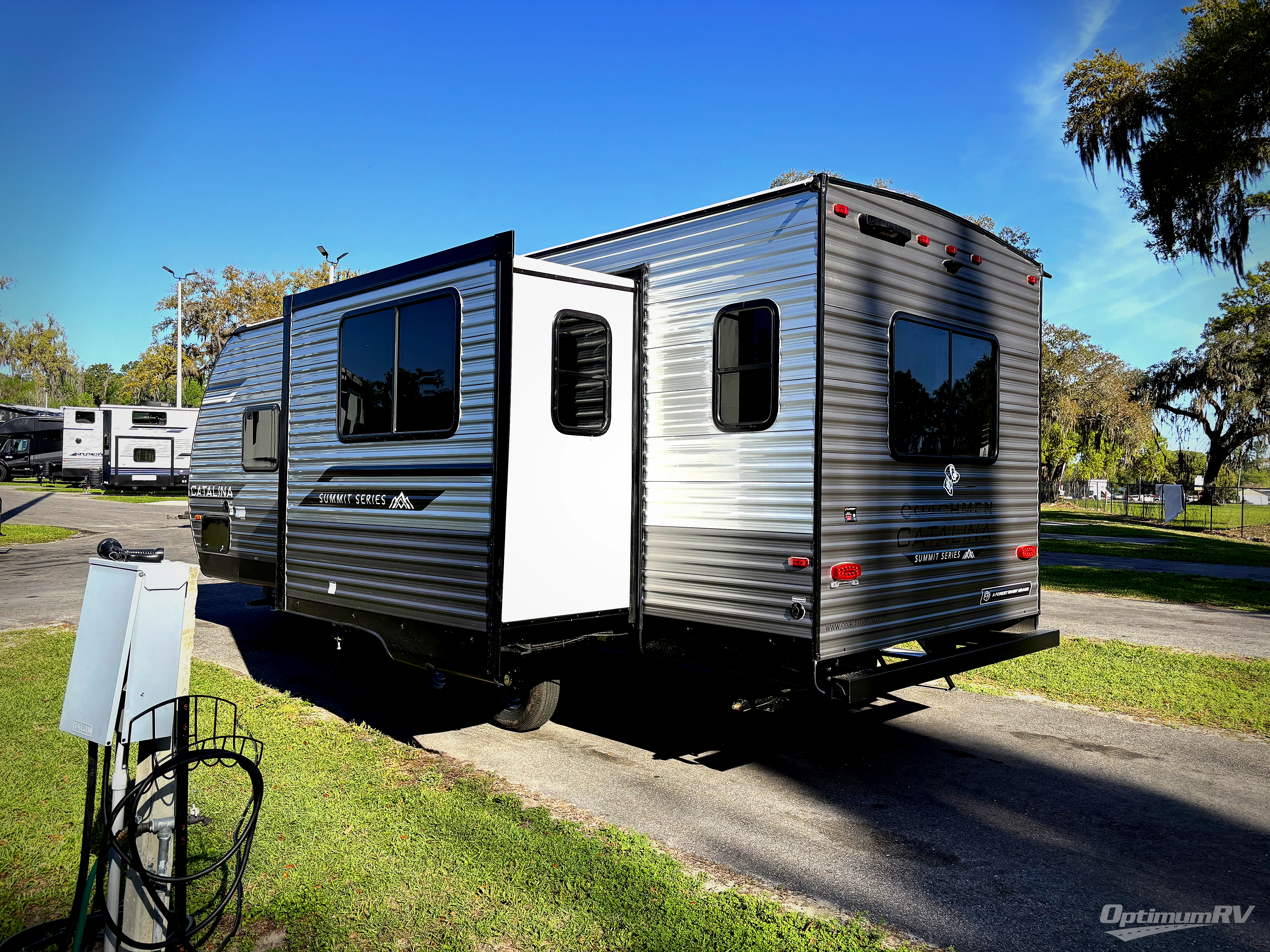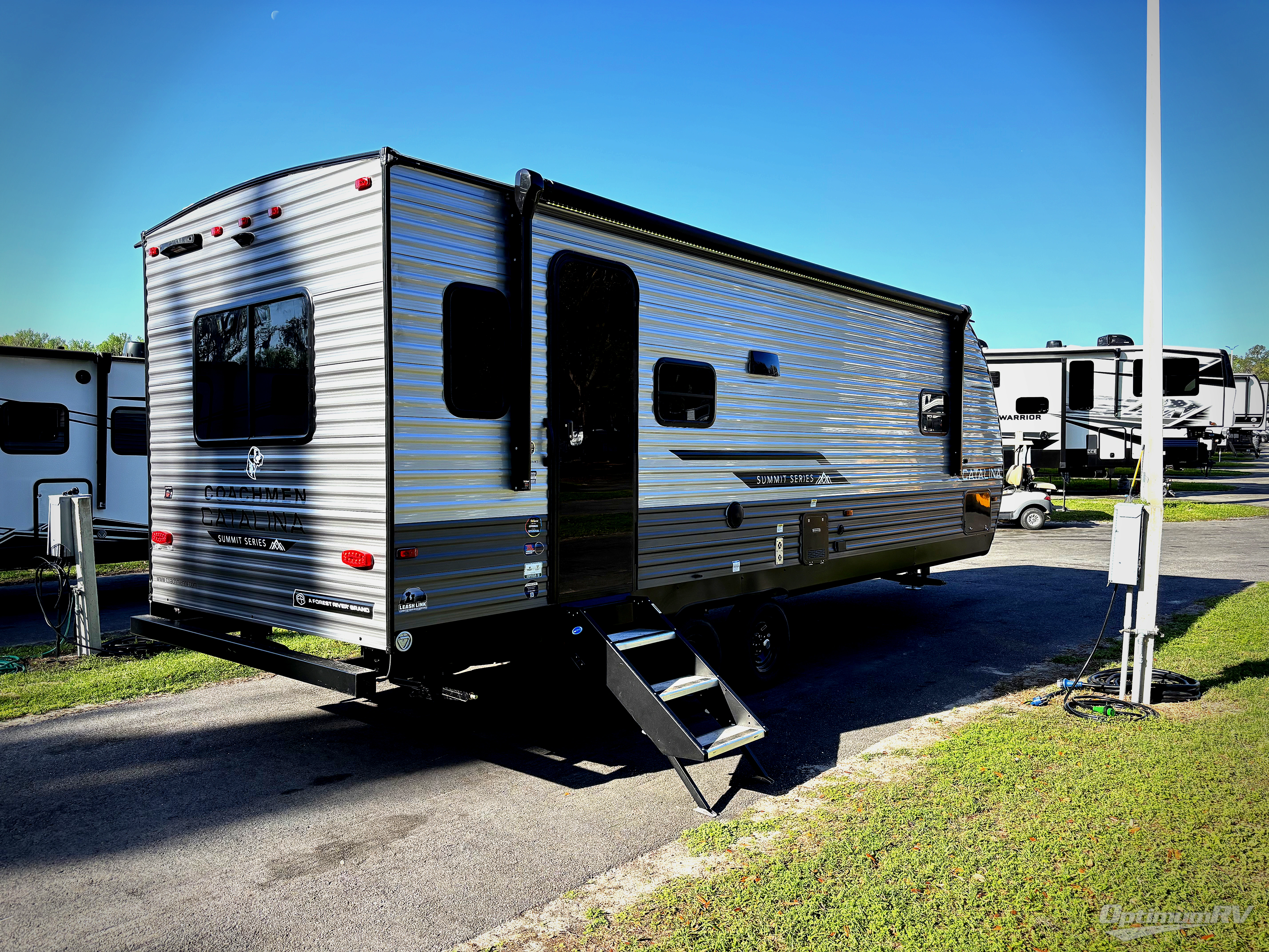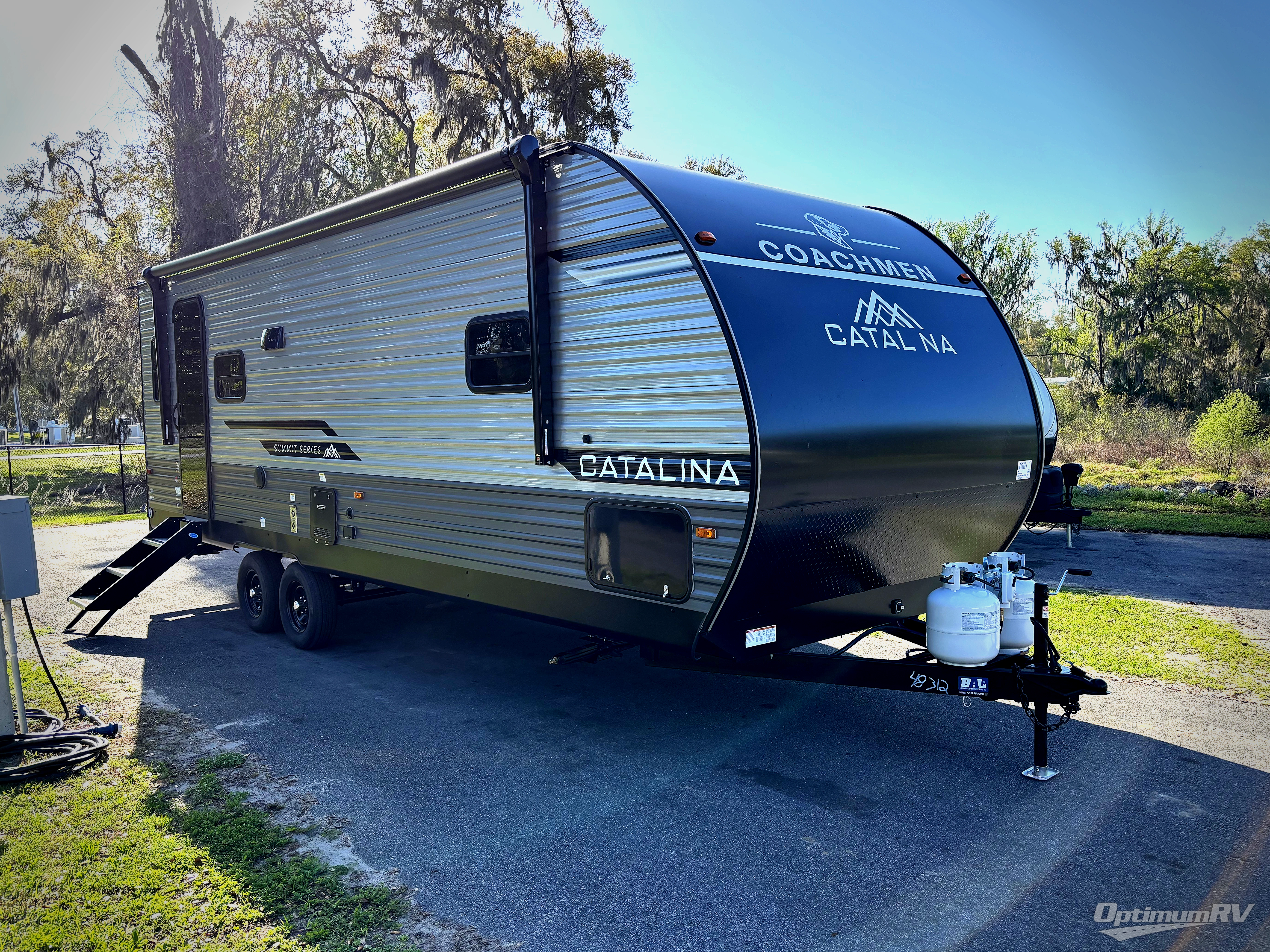 With any Catalina Summit Series 8 by Coachmen you will enjoy an affordable travel trailer packed with at-home comforts! The solid construction includes a Norco electromagnetic powder coated chassis, a seamless Alpha roof membrane, and full length frame outriggers for maximum support and durability. EZ lube axles with leaf spring suspension and self adjusting brakes provide smooth towing from home to campground, and the premium exterior graphics package is sure to turn heads as you travel down the highway. You will love the features included, such as a JBL Aura Cube media center, magnetic baggage door latches, 4,000 lumen interior touch lighting, and the list goes on!