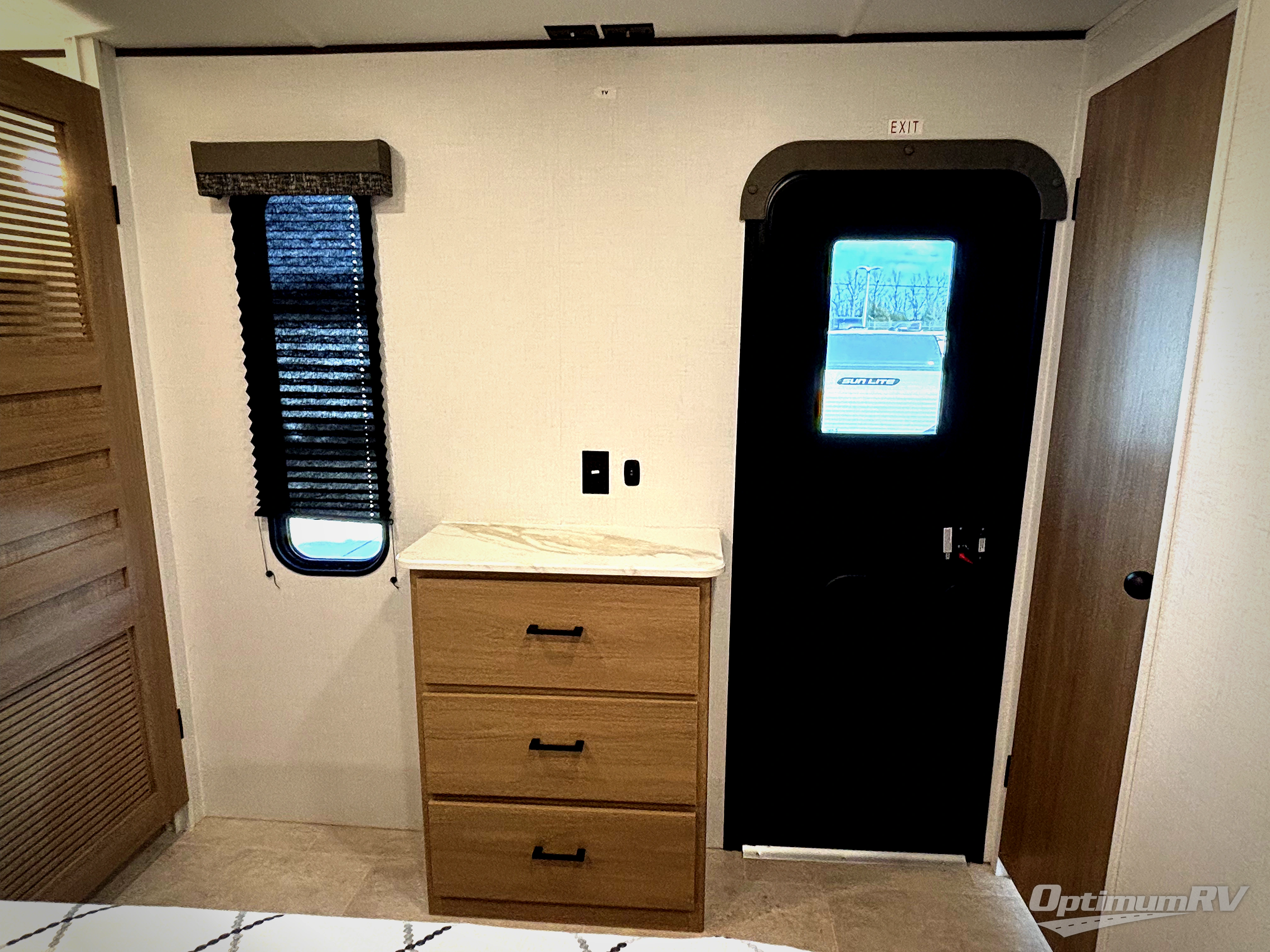 With any Aspen Trail travel trailer by Dutchmen, you will find comfort at every turn! There is a heated and enclosed underbelly outside, along with a power awning with LED lights, fender skirts, and smooth front metal for added protection. There is also a 100-watt roof solar panel with a 30amp charge controller for some off grid power. Head inside to enjoy the 6' 10" interior height, pleated shades throughout, dual shelf nightstands plus seamless thermofoil countertops in the kitchen.