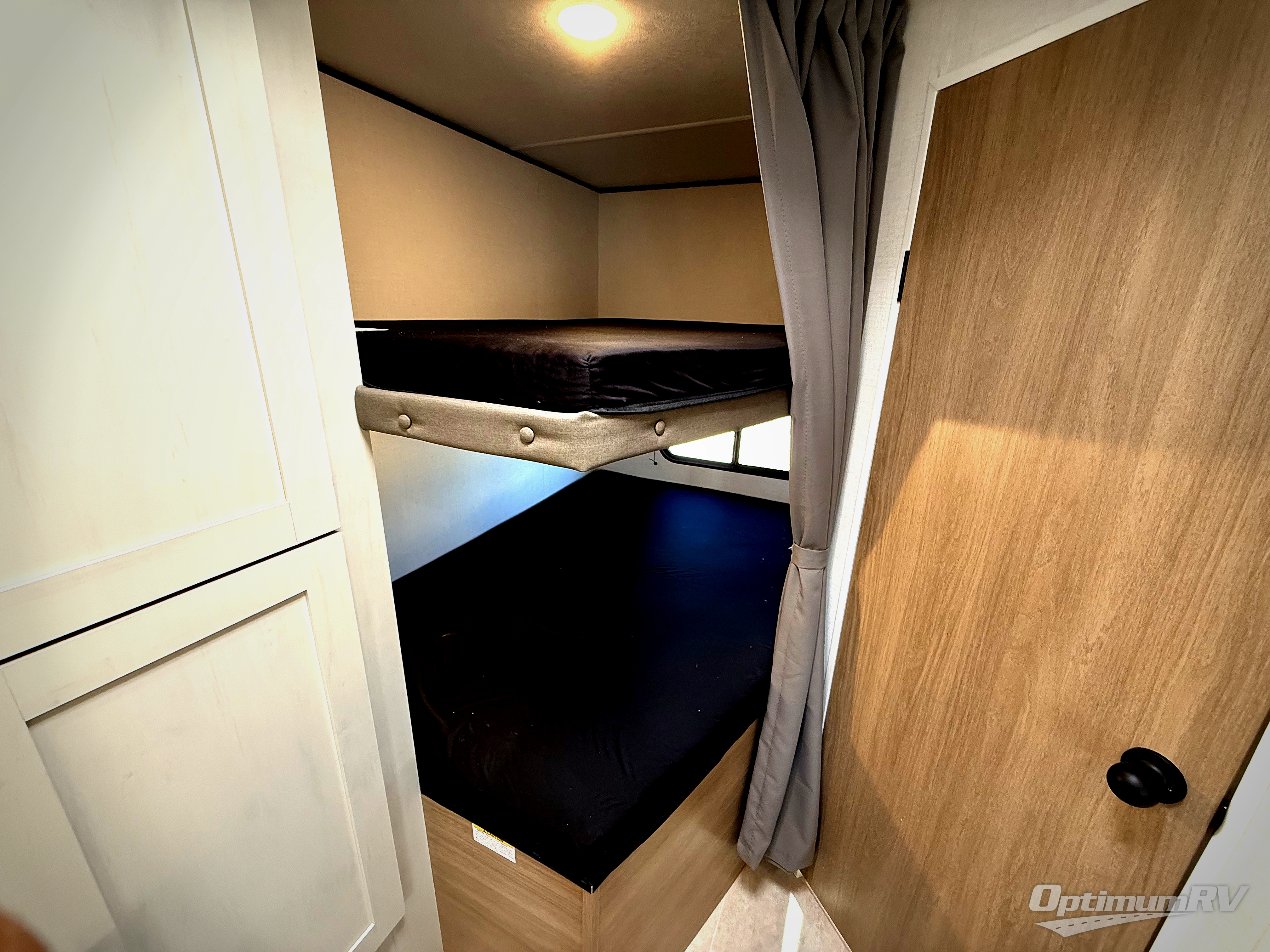 Get ready for fun and relaxation at the campgrounds with this trailer in your campsite. You can fish in the river, hike the trails and relax under the power awning before heading inside to enjoy the comforts of home. You will also enjoy having double access to the private bedroom which offers a residential queen bed and dual closets, plus the full bathroom will keep you refreshed after outdoor fun. The double-size bunks offer sleeping for four, and the furniture doubles as extra sleeping space. The cook will have full amenities including a 10 cu. ft. 12V refrigerator to store lots of cold items. And the large slide gives everyone more floor space.