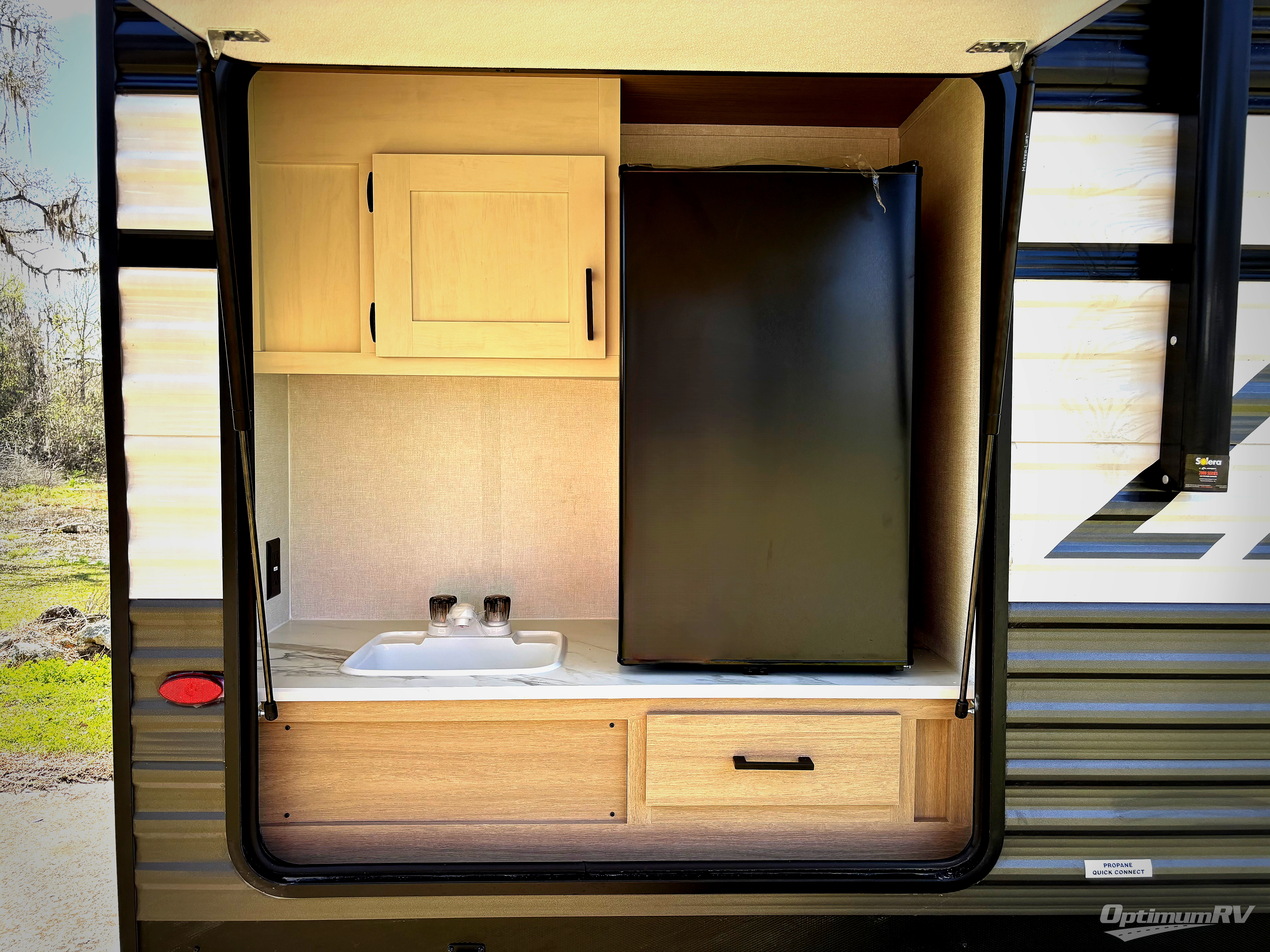 This travel trailer is one your whole crew will love! There is a rear private bunkhouse with double-size bunks for the little ones, a front private bedroom for you, and a booth dinette and jackknife sofa for even more sleeping space! The chef has their choice to cook indoors on the three burner range and microwave oven, or head outdoors to cook on the outdoor kitchen! The full bath will let everyone clean up each day, and the fireplace and large slide out will make your space feel more like home. And don't overlook the pass-through storage and 16' power awning with LED lights!