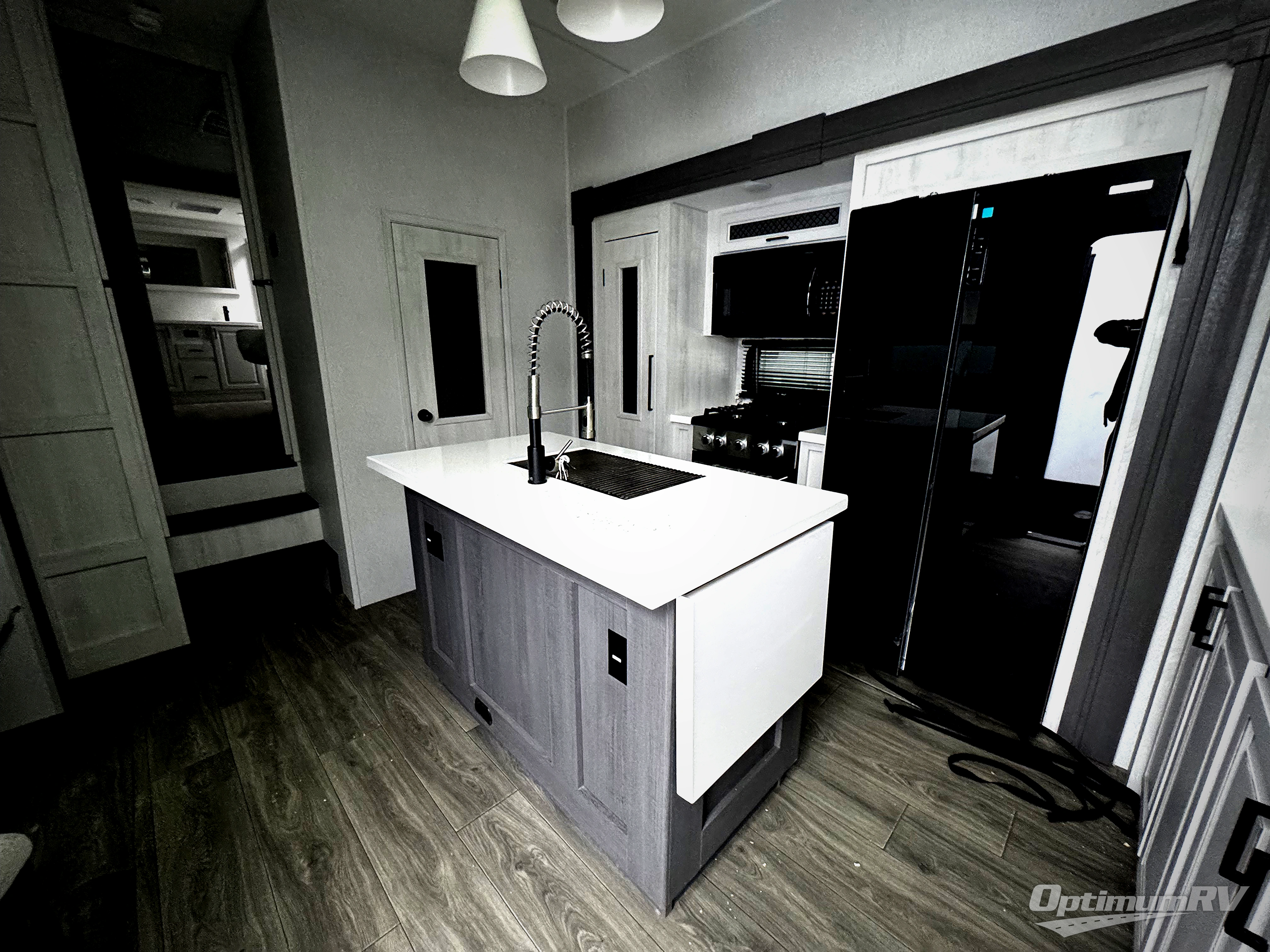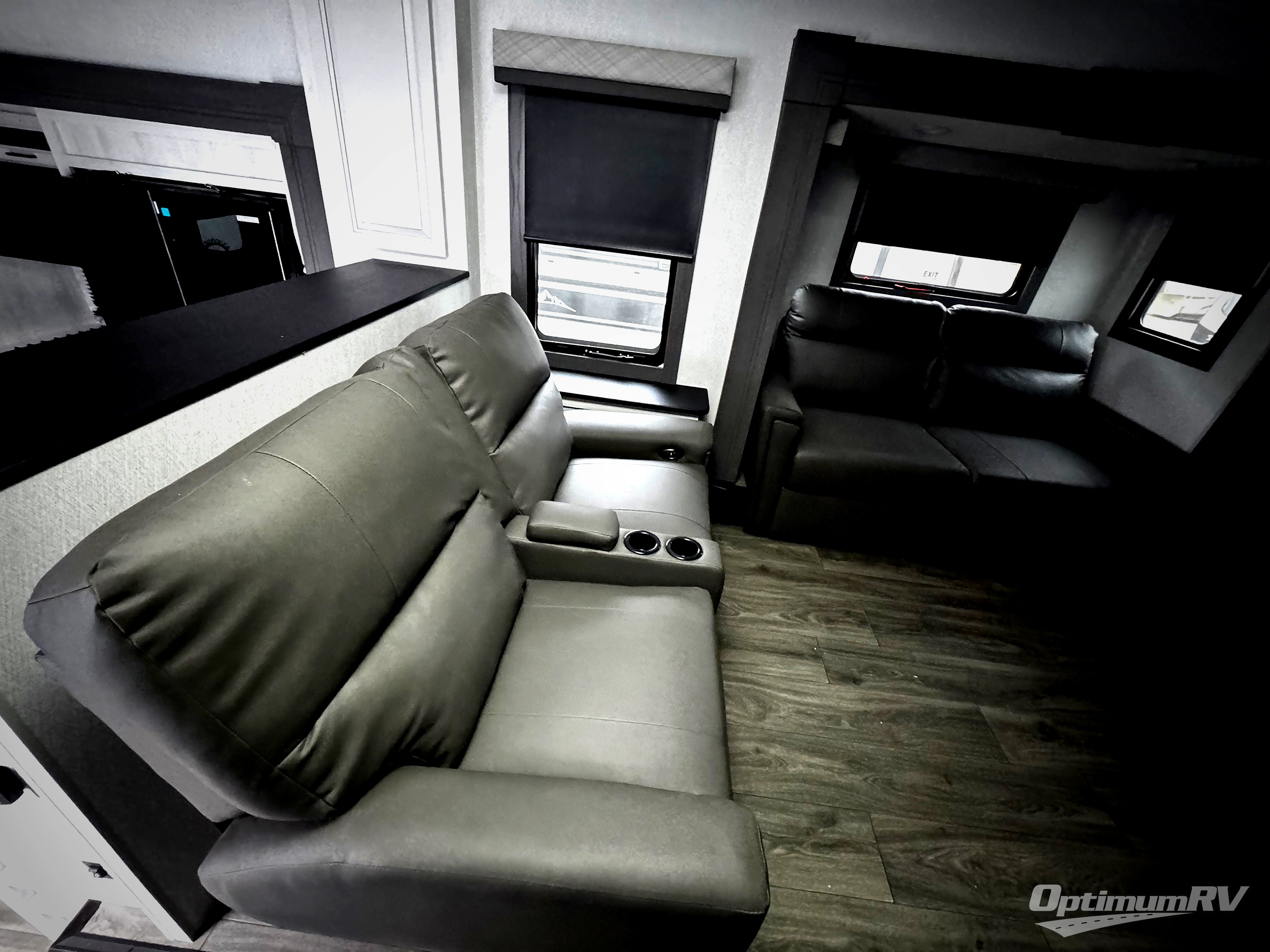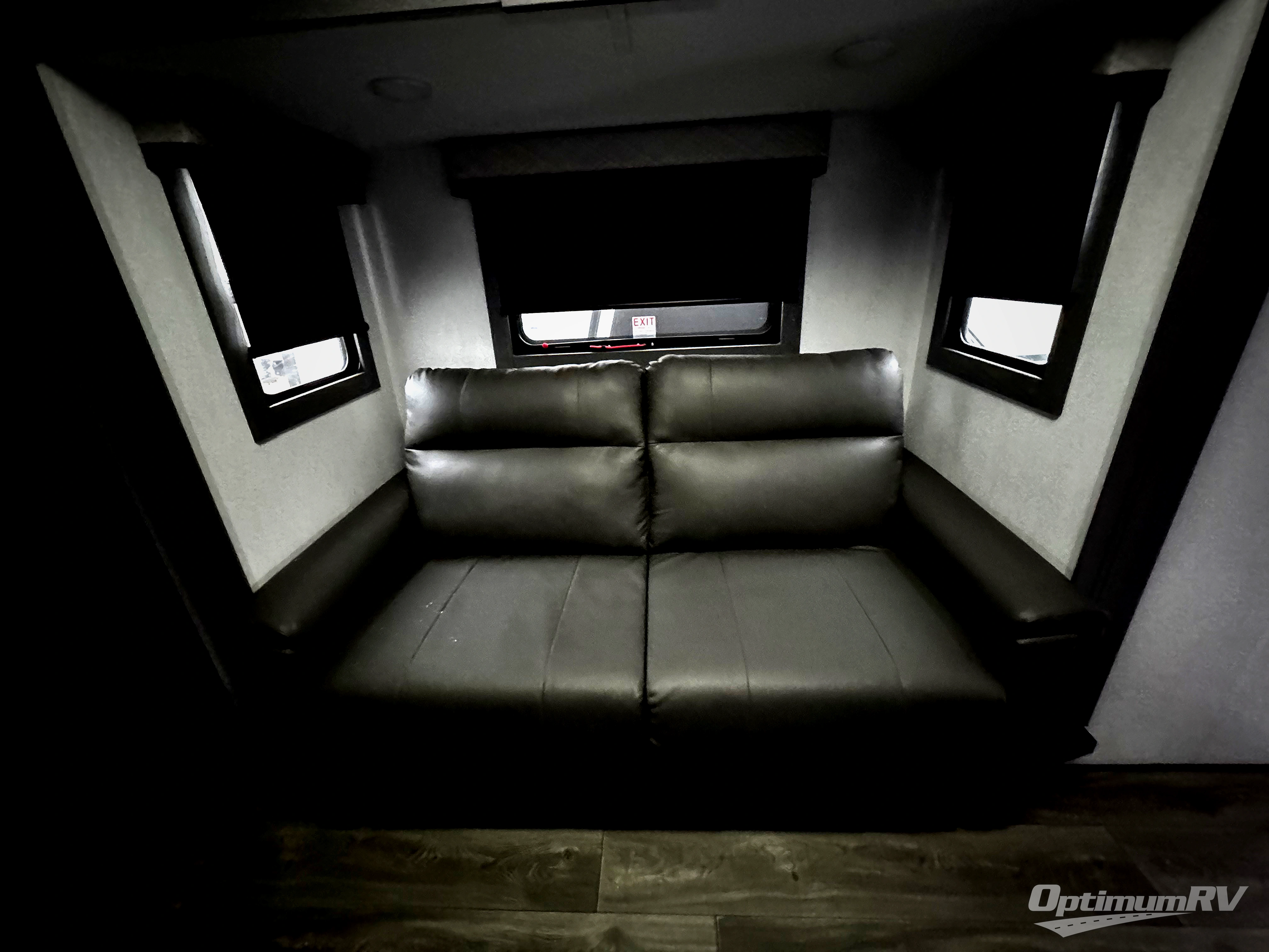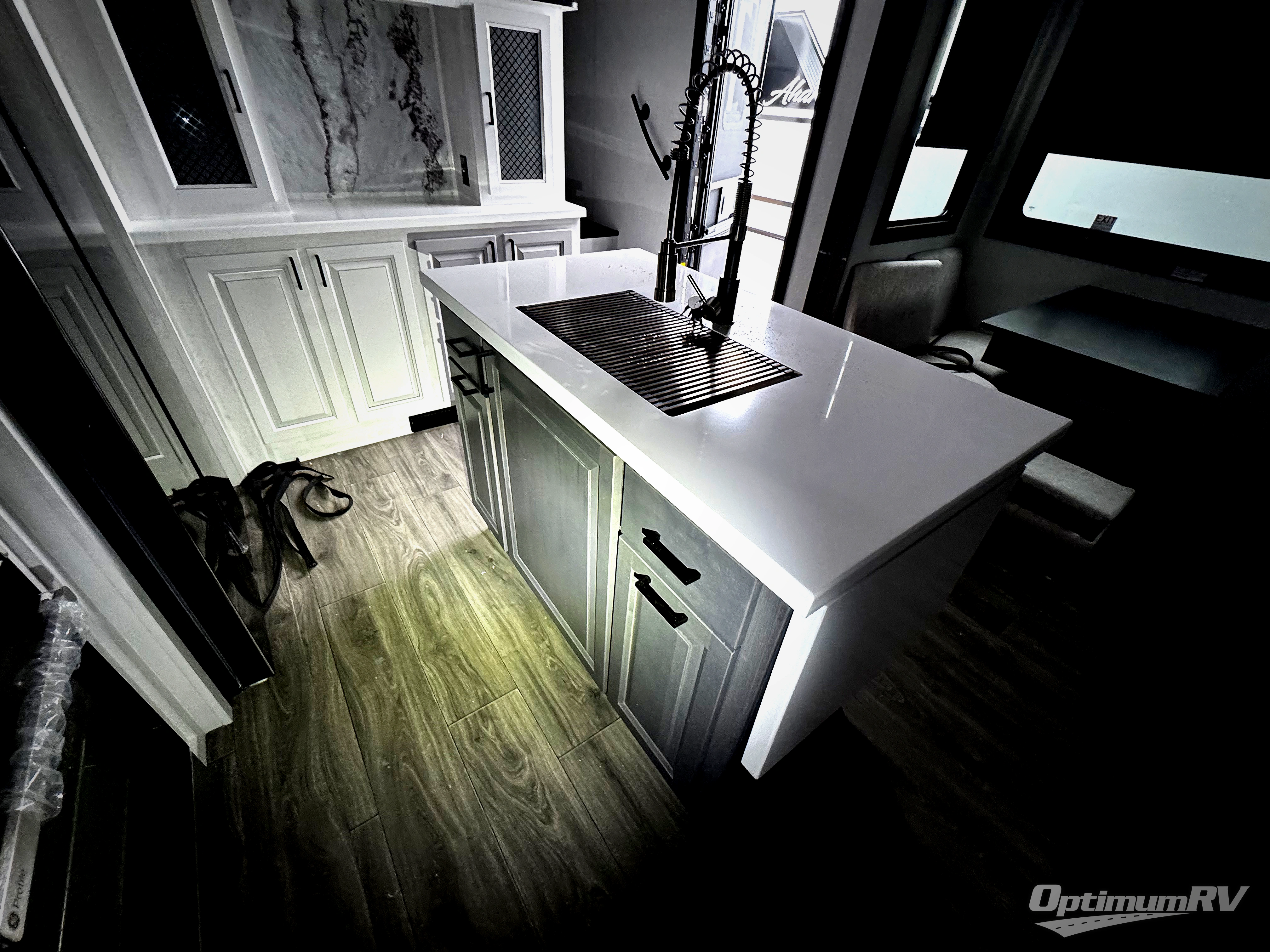 If you've been looking for a luxury fifth wheel to call your new home away from home, take a look at this Ahara! The front living area will be a favorite hangout spot with its dual hide-a-bed sofas, theater seating, and 65" TV with a fireplace. And since there are dual opposing slides here, your guests will have plenty of space to fold down the sofas at night for a great night's rest. If you're looking for your bedroom, head to the back and you'll enjoy a king bed slide out, a dresser, two closets, plus your own full rear bath. The dual bath sinks are sure to come in handy when you're both getting ready for bed, and the spacious shower with a skylight will provide natural light as you clean up in the morning. There is even a closet with washer and dryer prep if you plan to go full-time. In the morning you can prepare breakfast on the four burner cooktop or in the 30" over-the-range residential microwave, and the 16 cu. ft. 12V French door refrigerator includes a double drawer freezer to hold more food. There is a free-standing dinette, a hutch to store nice dishes, and a half bath located off of this room for convenience!