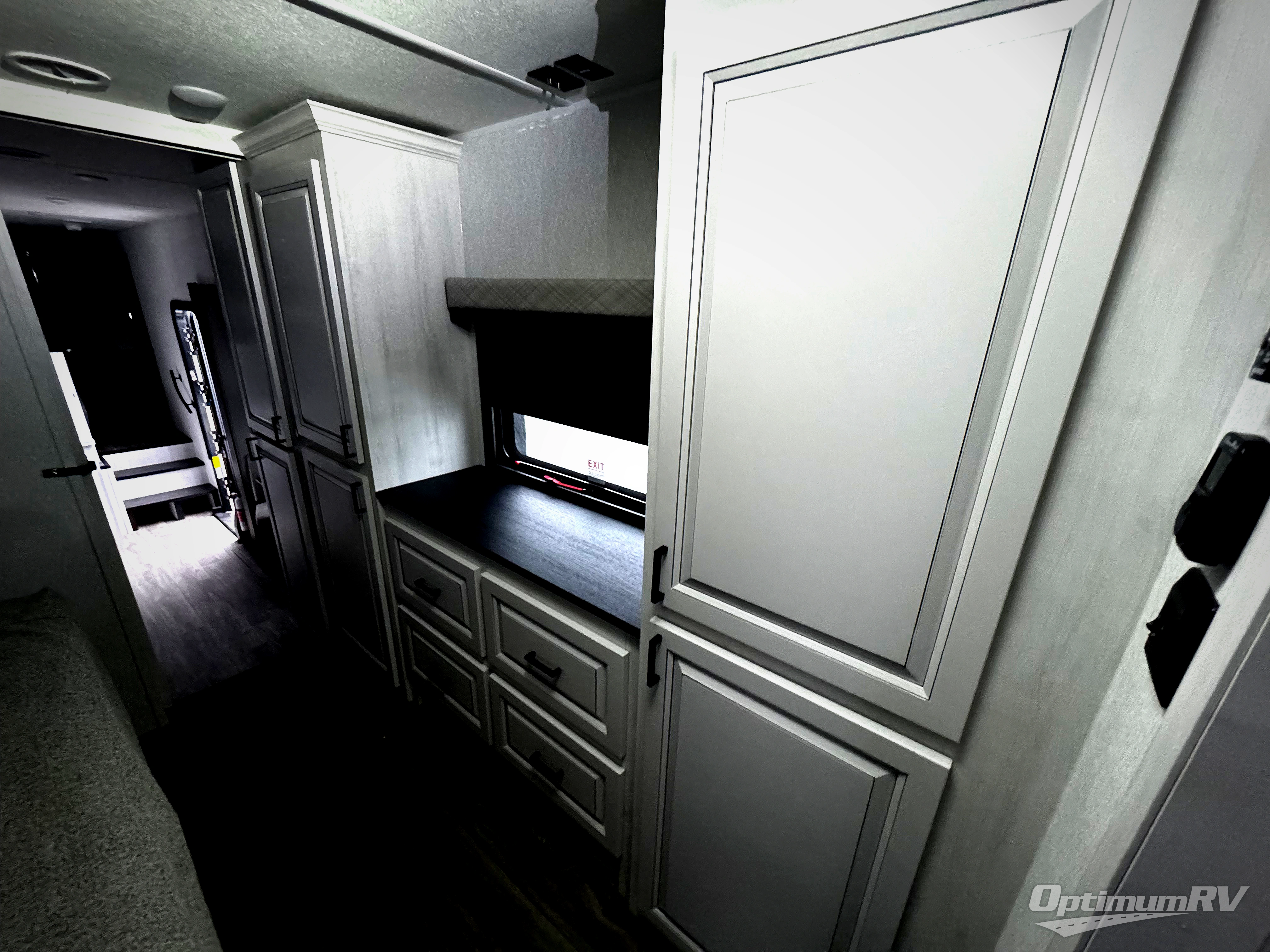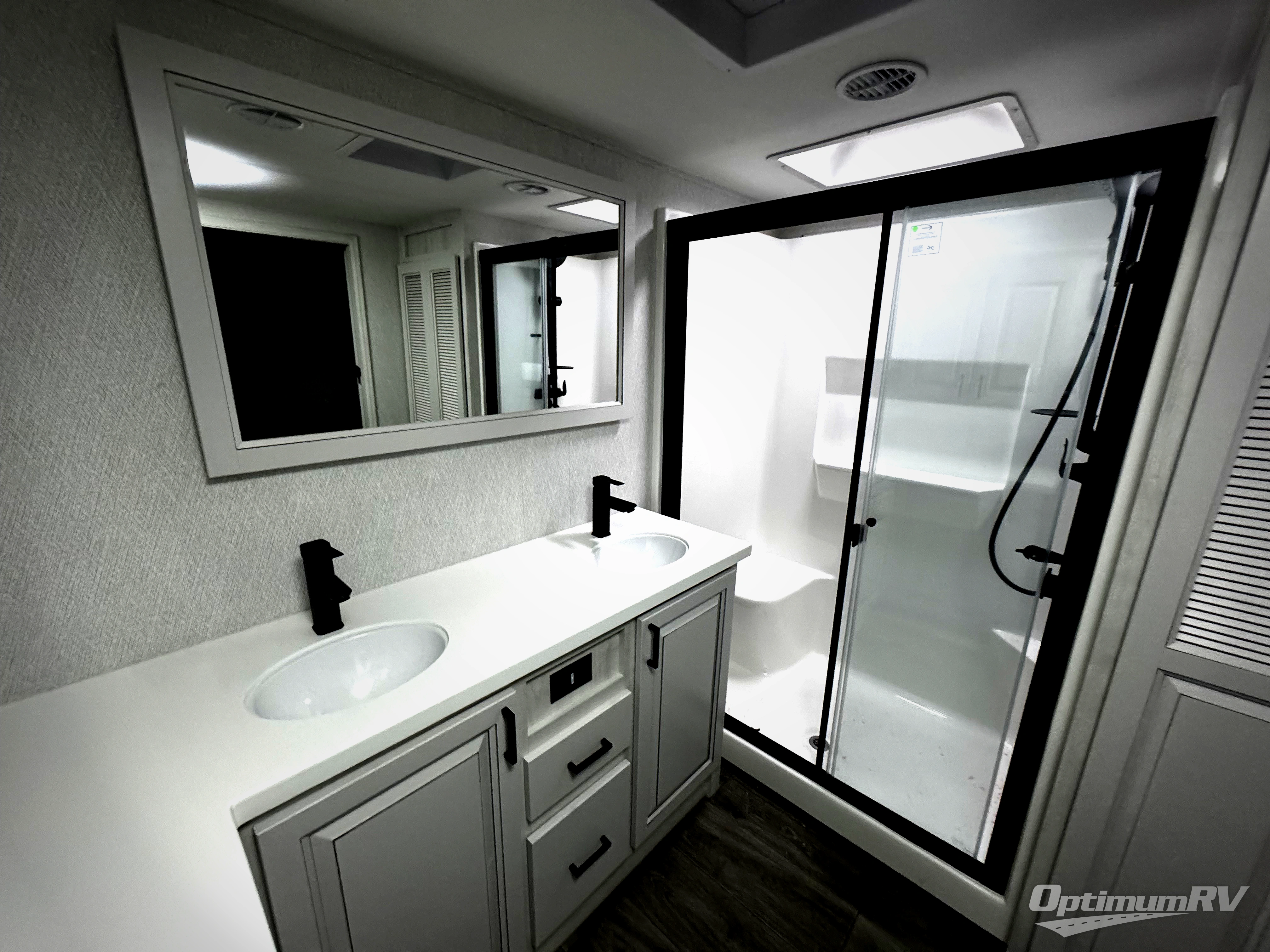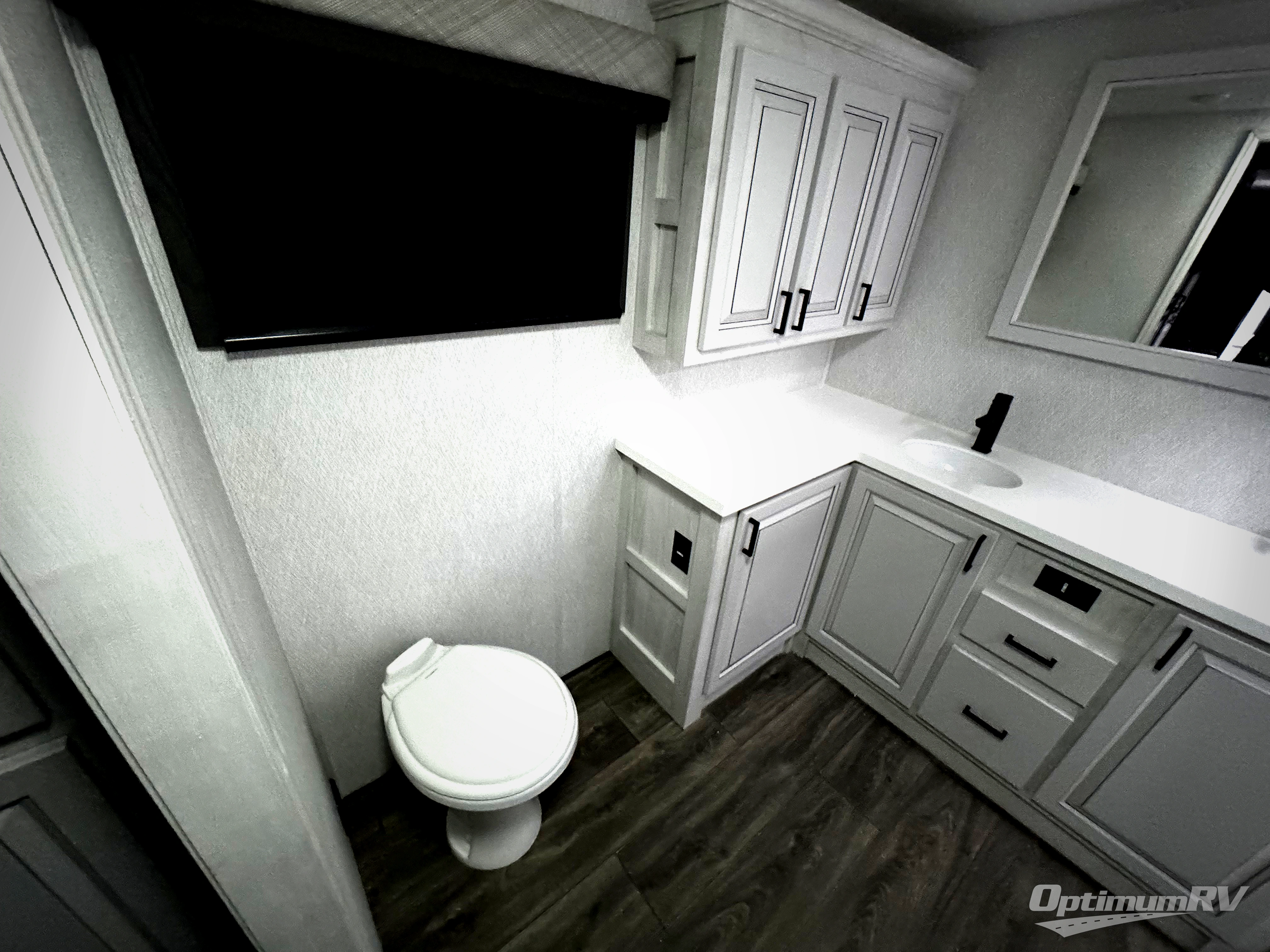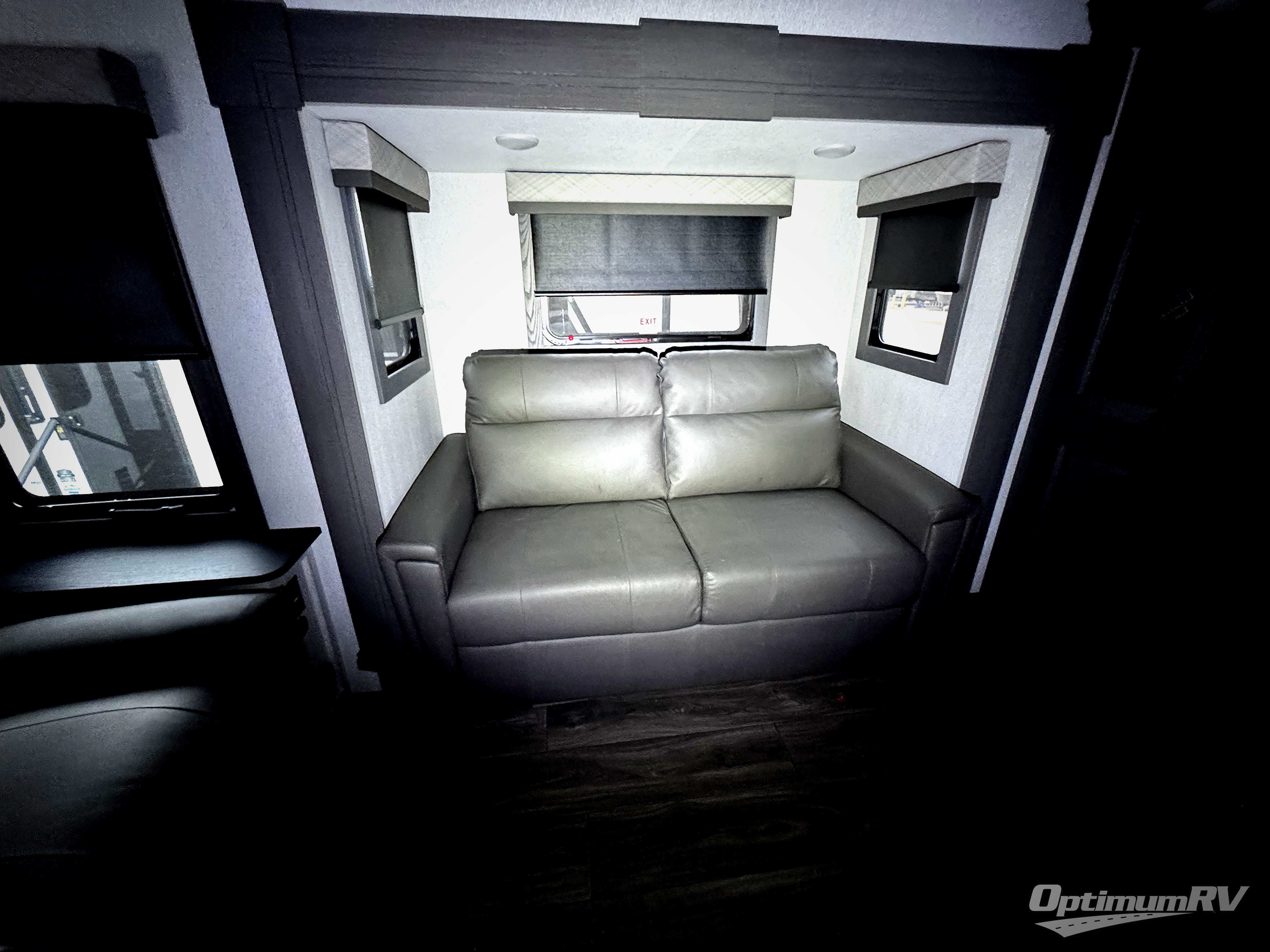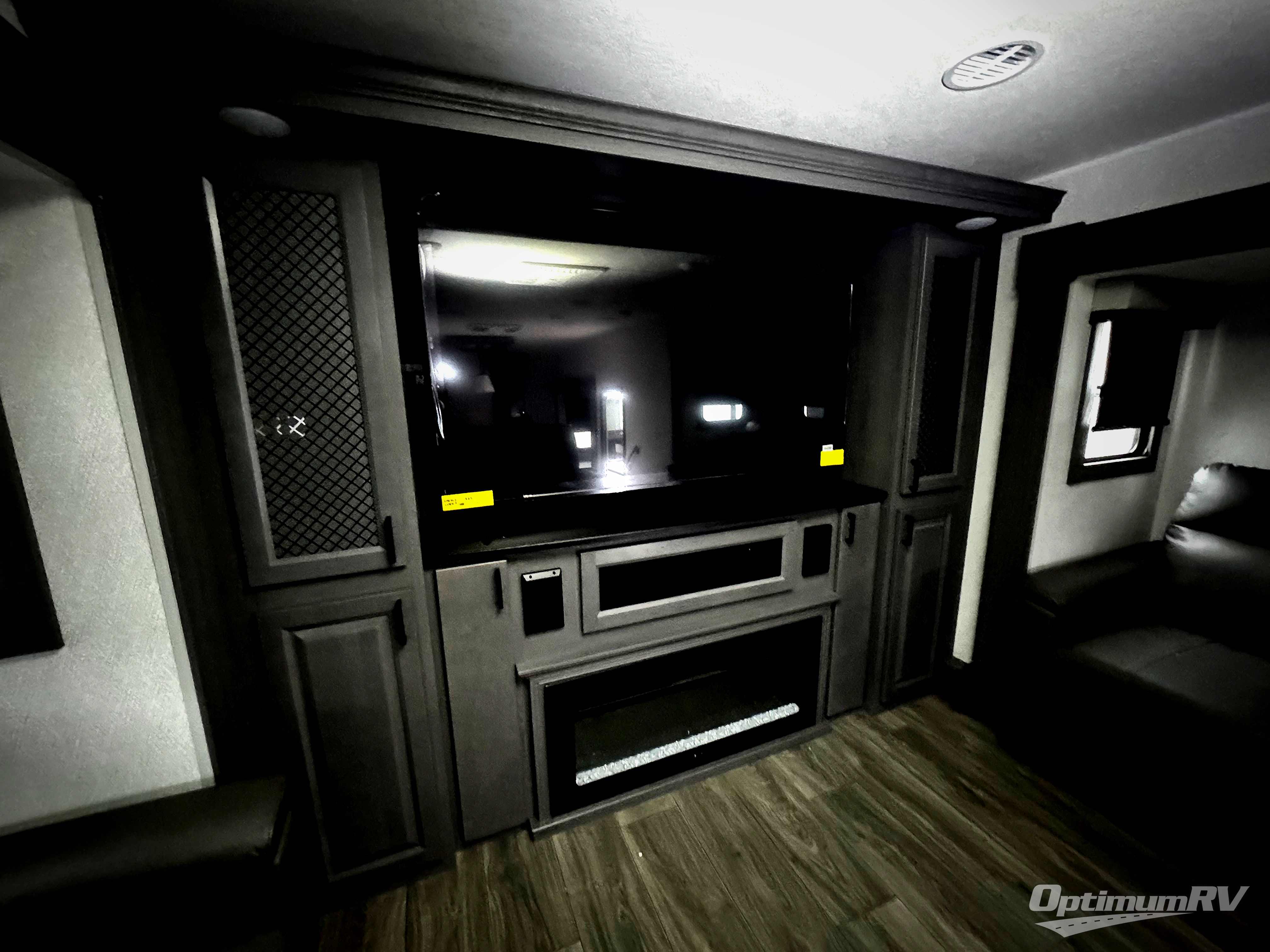 If you've been looking for a luxury fifth wheel to call your new home away from home, take a look at this Ahara! The front living area will be a favorite hangout spot with its dual hide-a-bed sofas, theater seating, and 65" TV with a fireplace. And since there are dual opposing slides here, your guests will have plenty of space to fold down the sofas at night for a great night's rest. If you're looking for your bedroom, head to the back and you'll enjoy a king bed slide out, a dresser, two closets, plus your own full rear bath. The dual bath sinks are sure to come in handy when you're both getting ready for bed, and the spacious shower with a skylight will provide natural light as you clean up in the morning. There is even a closet with washer and dryer prep if you plan to go full-time. In the morning you can prepare breakfast on the four burner cooktop or in the 30" over-the-range residential microwave, and the 16 cu. ft. 12V French door refrigerator includes a double drawer freezer to hold more food. There is a free-standing dinette, a hutch to store nice dishes, and a half bath located off of this room for convenience!