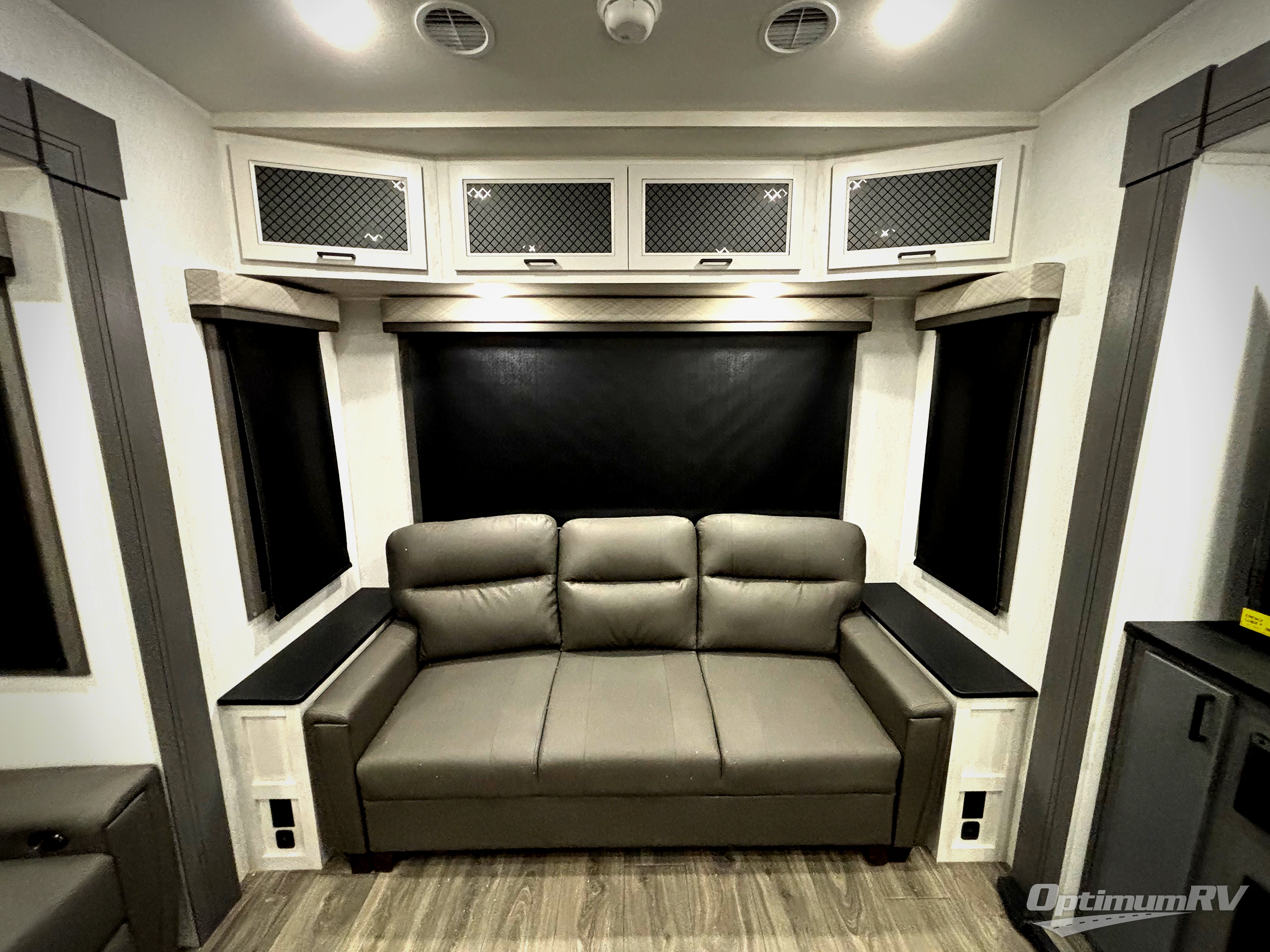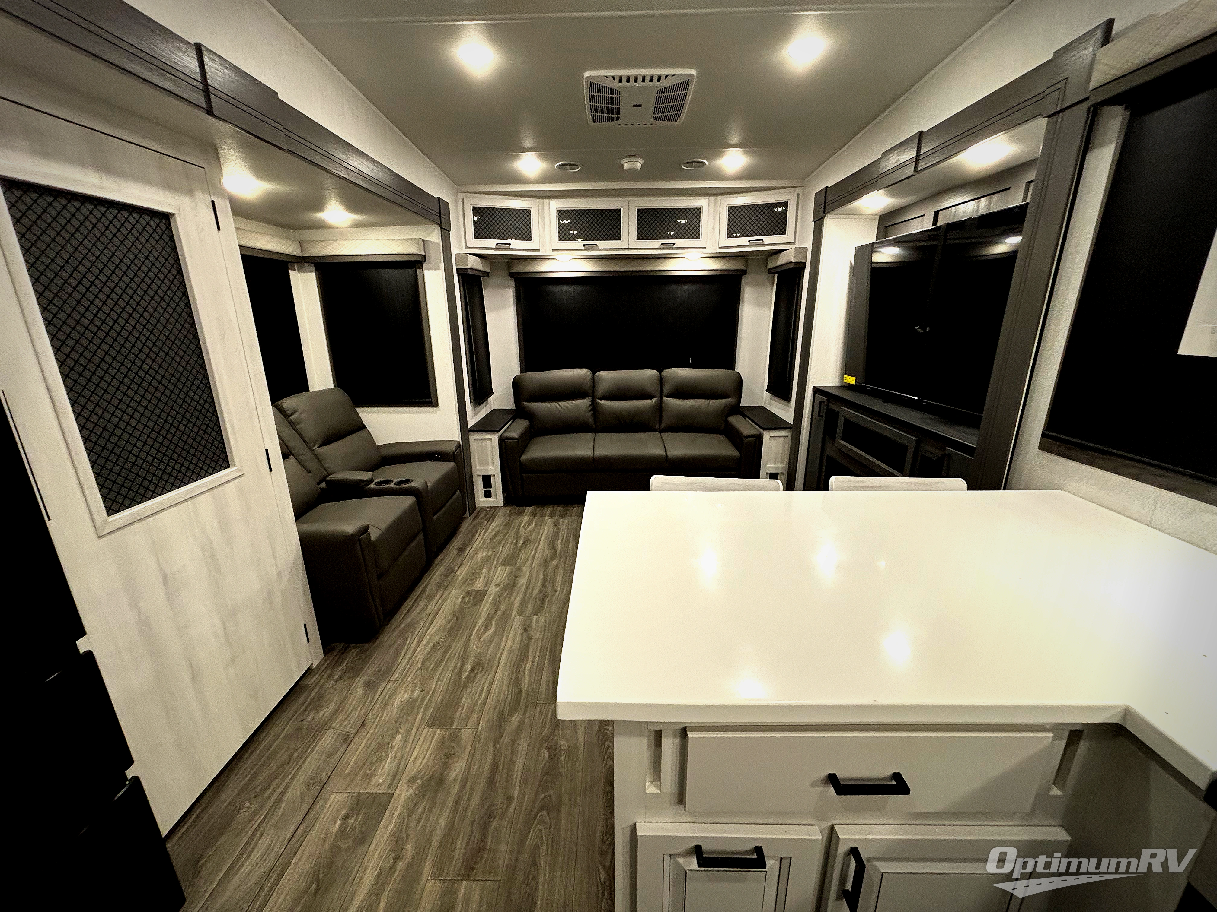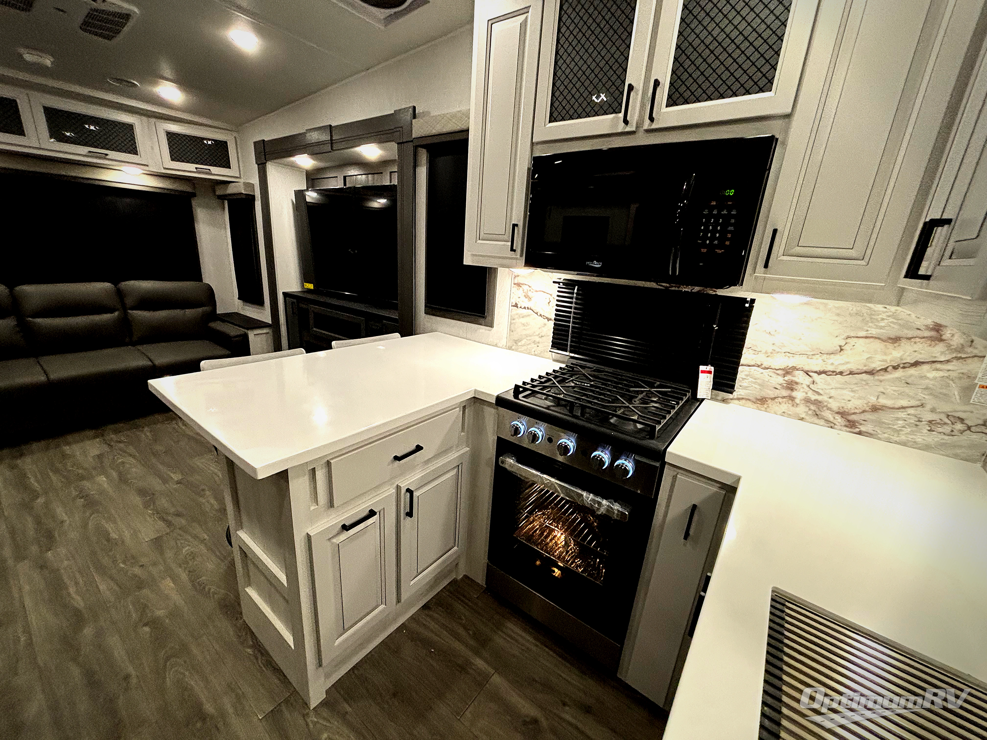 There is just too much luxury to name on the EAST TO WEST Ahara fifth wheel! These units are quite impressive, and once you see them, you'll know what we mean. The Ahara first grabs your attention with its fully painted aerodynamic fiberglass front cap, 102" wide-body chassis, and deep tint square frameless windows. For towing, you'll find a MORryde CRE 3000 suspension, LED marker lights, LED taillights with back-up lights, and rear view camera prep. Traveling in different climates is also made easy with the high-efficiency triple A/C system, 40,000 BTU high-capacity furnace, plus heated, insulated, and enclosed underbelly found within the Climate Package. Head inside to enjoy Slow Rise roller shades, a flush floor kitchen slide to help prevent trips, and solid surface countertops in the kitchen and bath to name a few luxuries!